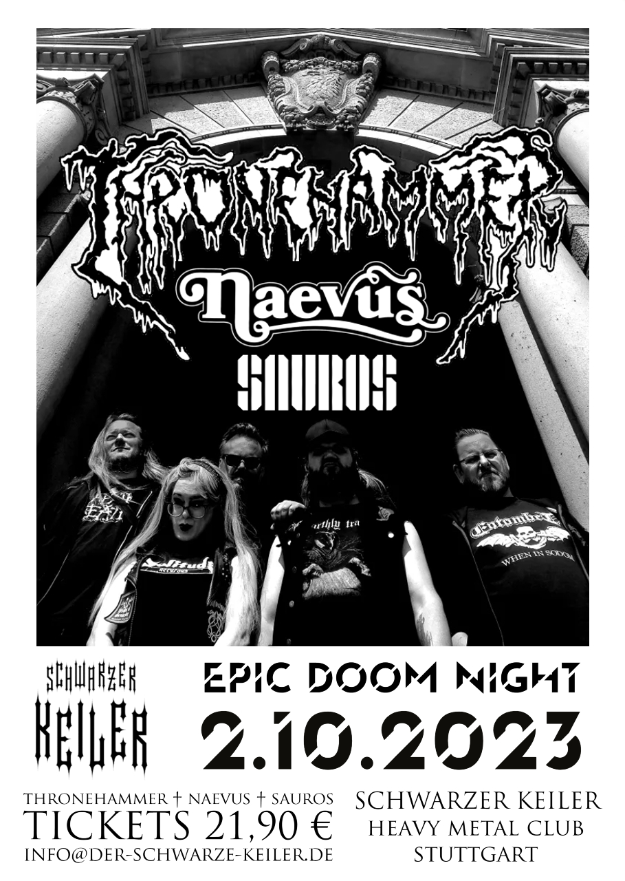 Mit den Nürnbergern SAUROS, den Ludwigsburgern NAEVUS sowie dem englisch-deutschen Gespann THRONEHAMMER, hat das Keiler-Team alles daran gesetzt, jeden Fan langsamer Schwere zu begeistern - zumal der live gerne alles niederwalzende Headliner auf der aktuellen Tour sein neues Album „Kingslayer“ im Gepäck hat, das ab dem 03. November 2023 beim Händler Eures Vertrauens eingesackt werden kann. Die Sludge-Doomer SAUROS werden hingegen ihre noch recht junge EP „Retreat“ präsentieren, und die bereits seit 32 Jahren (!) existenten Traditions-Doomer NAEVUS haben ebenfalls neues Material in Form ihres dritten Albums am Start, das ganz sicher live zum Zuge kommen wird - wir dürfen sehr gespannt sein!