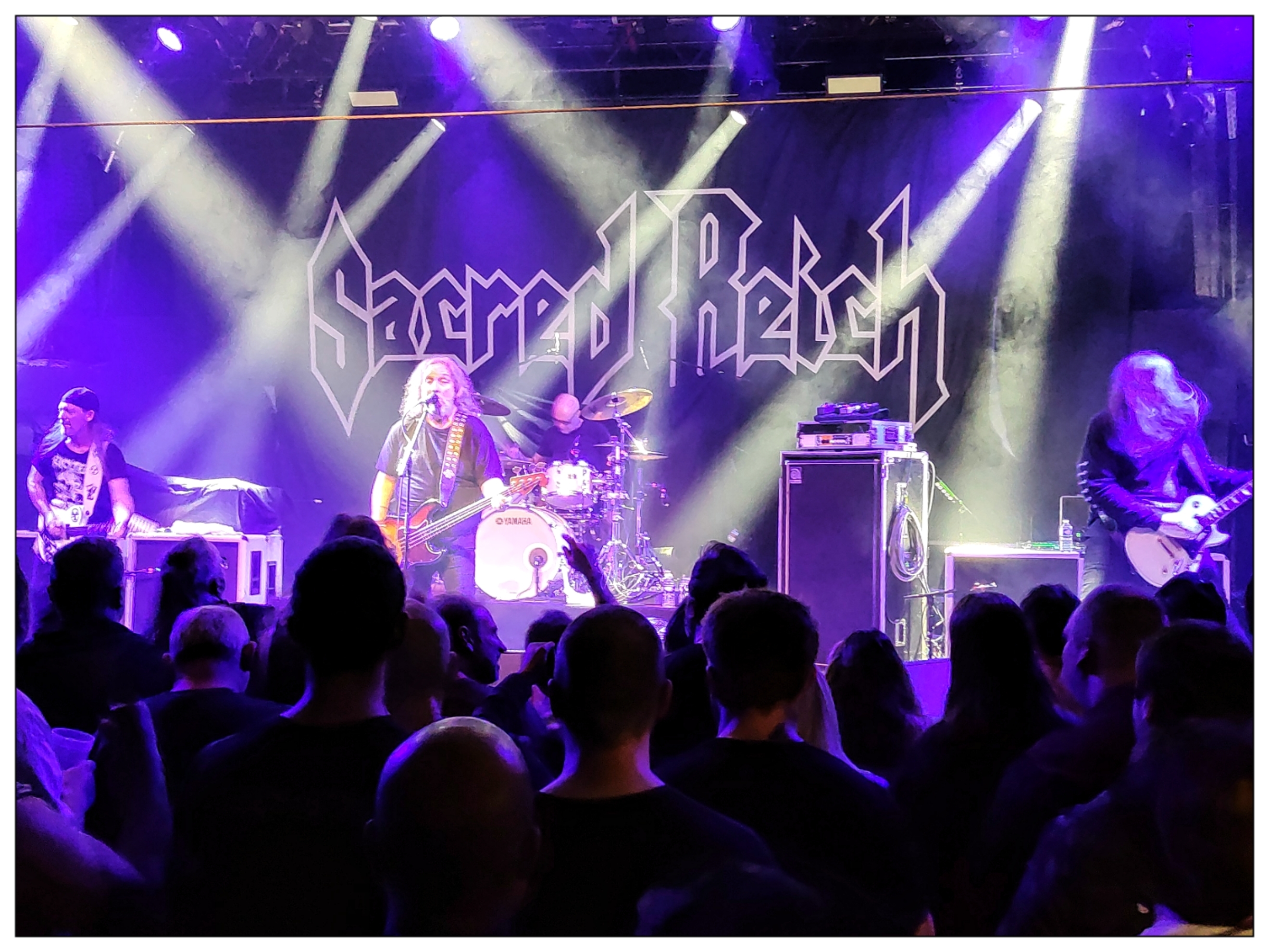 Danach enterten die Recken von SACRED REICH die Bühne und schon wurde der Sound schlechter, bewegte sich aber noch im akzeptablen Rahmen. Als Opener wählten die Texaner mit "Divide & Conquer" einen Song ihres letzten Albums "Awakening". Anhand der Mitgröl-Quote konnte man feststellen, dass auch diese "neuen" Songs mittlerweile voll beim Publikum angekommen sind. Noch intensiver kam das grandiose "Manifest Destiny" später im Set rüber. Darüber hinaus gönnten uns Phil Rind und seine Bande natürlich jede Menge Klassiker von "Ignorance" über "The American Way" und "Surf Nicaragua" bis zu "Independent". Im Publikum war ordentlich Bewegung und der gute Phil hat einfach einen Draht zu den Leuten. Er ist bei seinen Ansagen vielleicht einen Tick zu redselig, aber dafür heben diese sich angenehm von dem 08/15-Bullshit-Bingo anderer Frontleute hab. Die Bewegungsfreude auf der Bühne war zwar bei Weitem nicht so ausgeprägt wie bei ANGELUS APATRIDA, aber SACRED REICH leben einfach von ihren tollen Songs und dem absolut außergewöhnlichen Drumming von Dave McClain. Starker Auftritt.