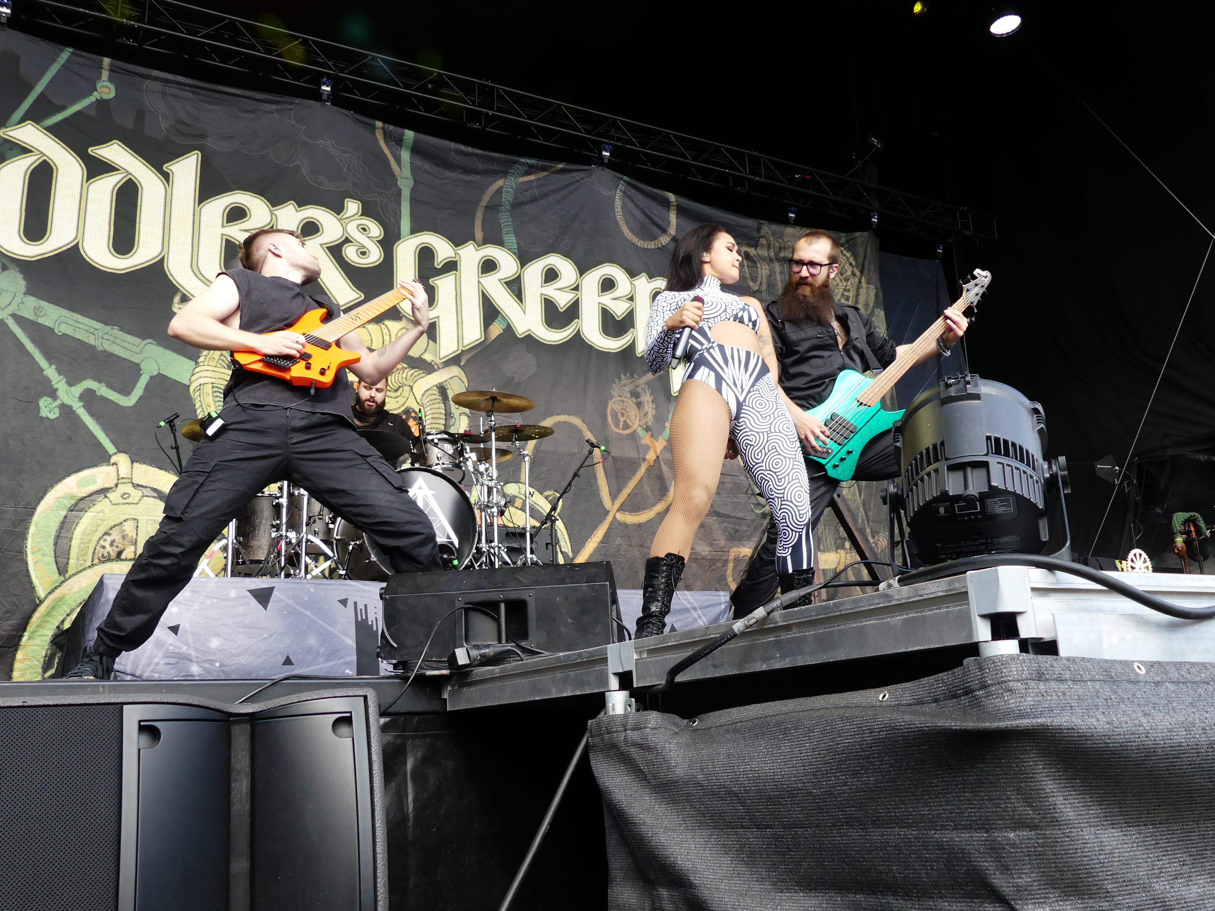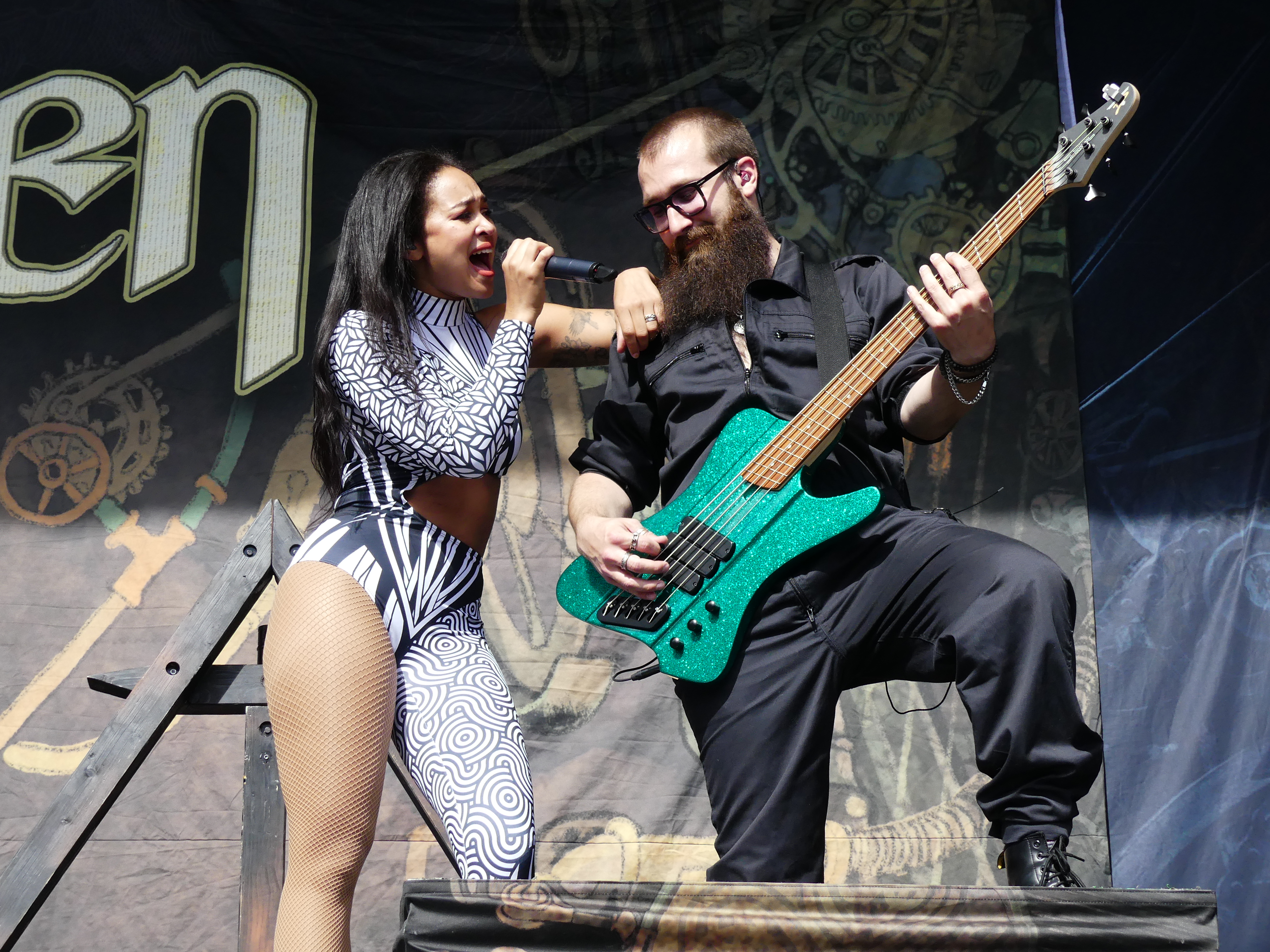 Um 17 Uhr fiel der Startschuss und mit AD INFINITUM begann das Bühnenprogramm. Die Band um die Schweizer Sängerin Melissa Bonny, die neben melodischem Klargesang auch beeindruckende Growls beherrscht, legte mit Symphonic Metal los und riss das Publikum mit ihren ebenso melodiösen wie druckvollen Songs schnell mit. Ob mit „Architect of Paradise“, „Legends“, „Animals“ oder dem äußerst eingängigen „See You In Hell“ – das Quartett wusste zu begeistern und stellte mit „Outer Space“ auch gleich noch eine neue Single vor. Entsprechend gut gelaunt ging es danach in die Umbaupause, um an den Ständen noch einmal schnell den einen oder anderen Einkauf zu tätigen, sich mit Merch einzudecken oder sich neue Energie für die nachfolgenden Acts anzufuttern.