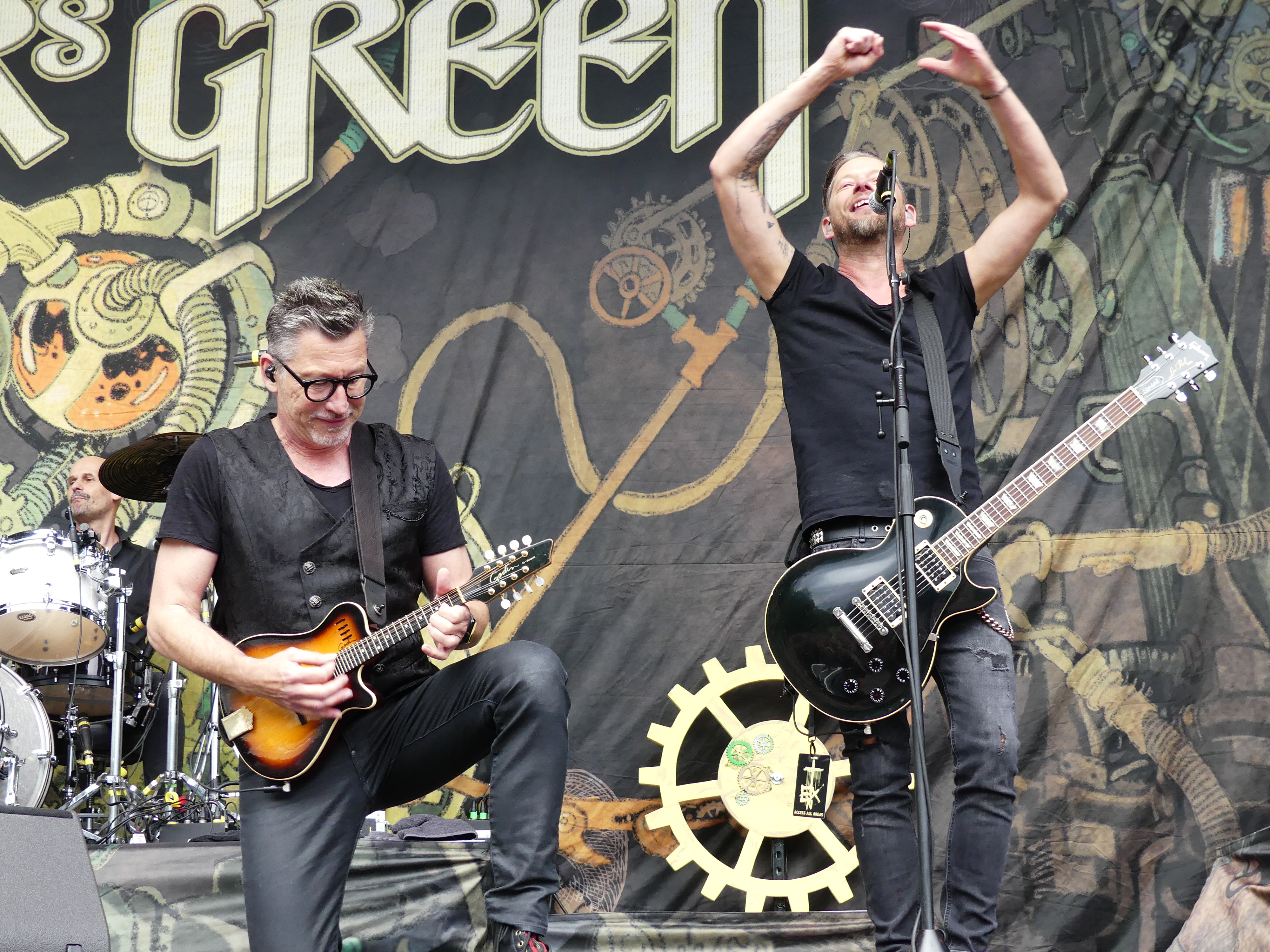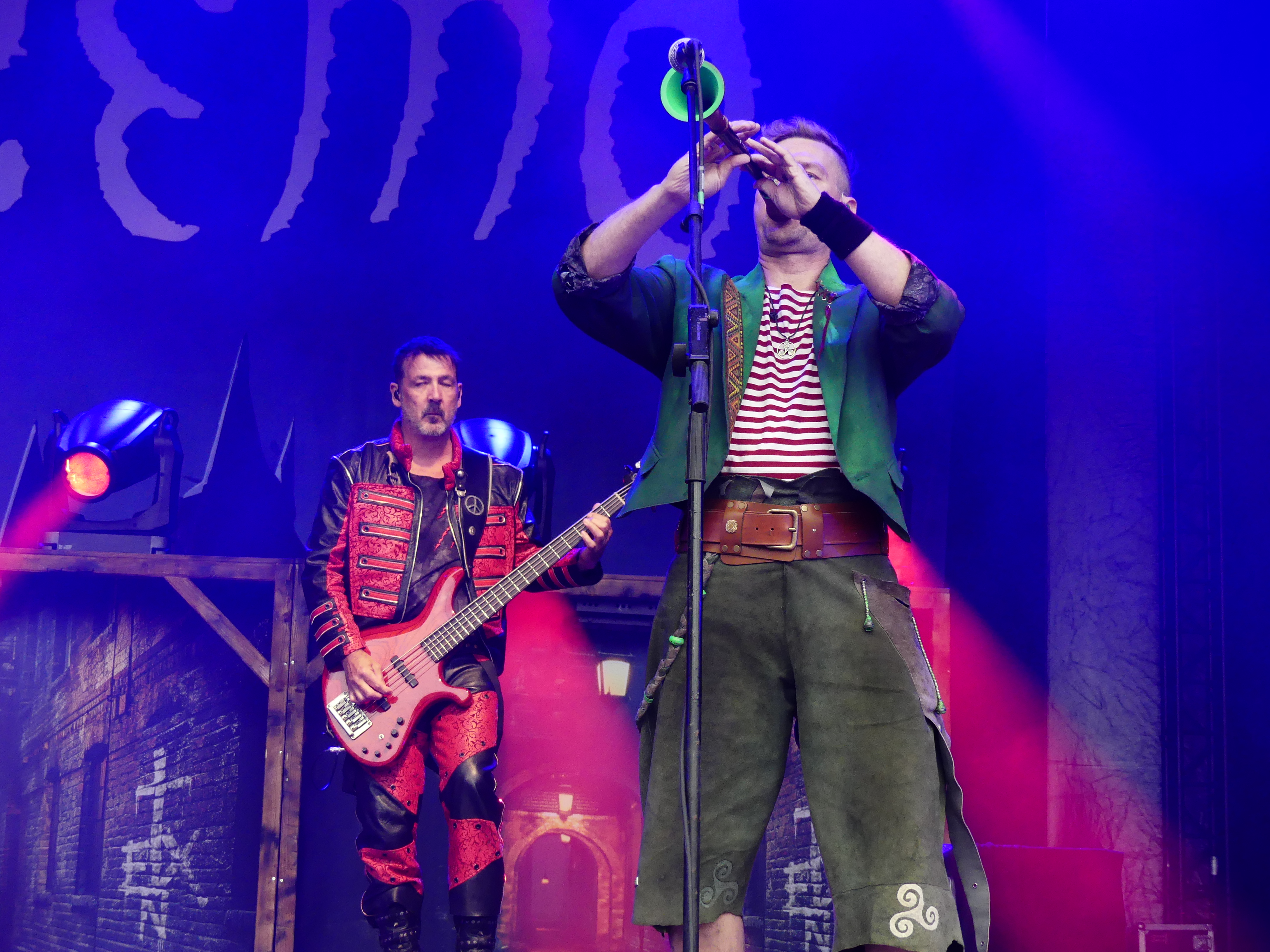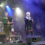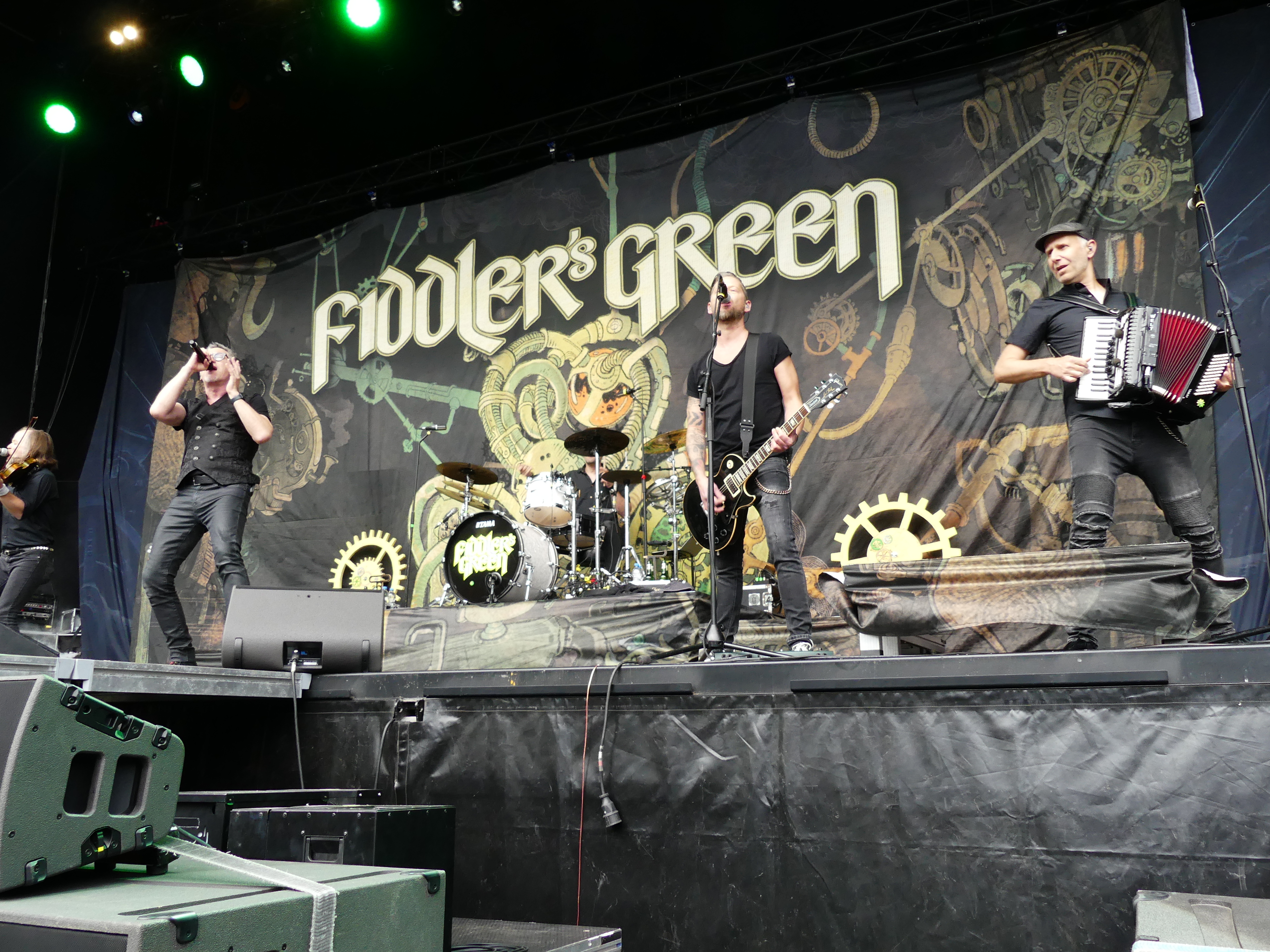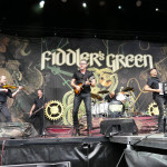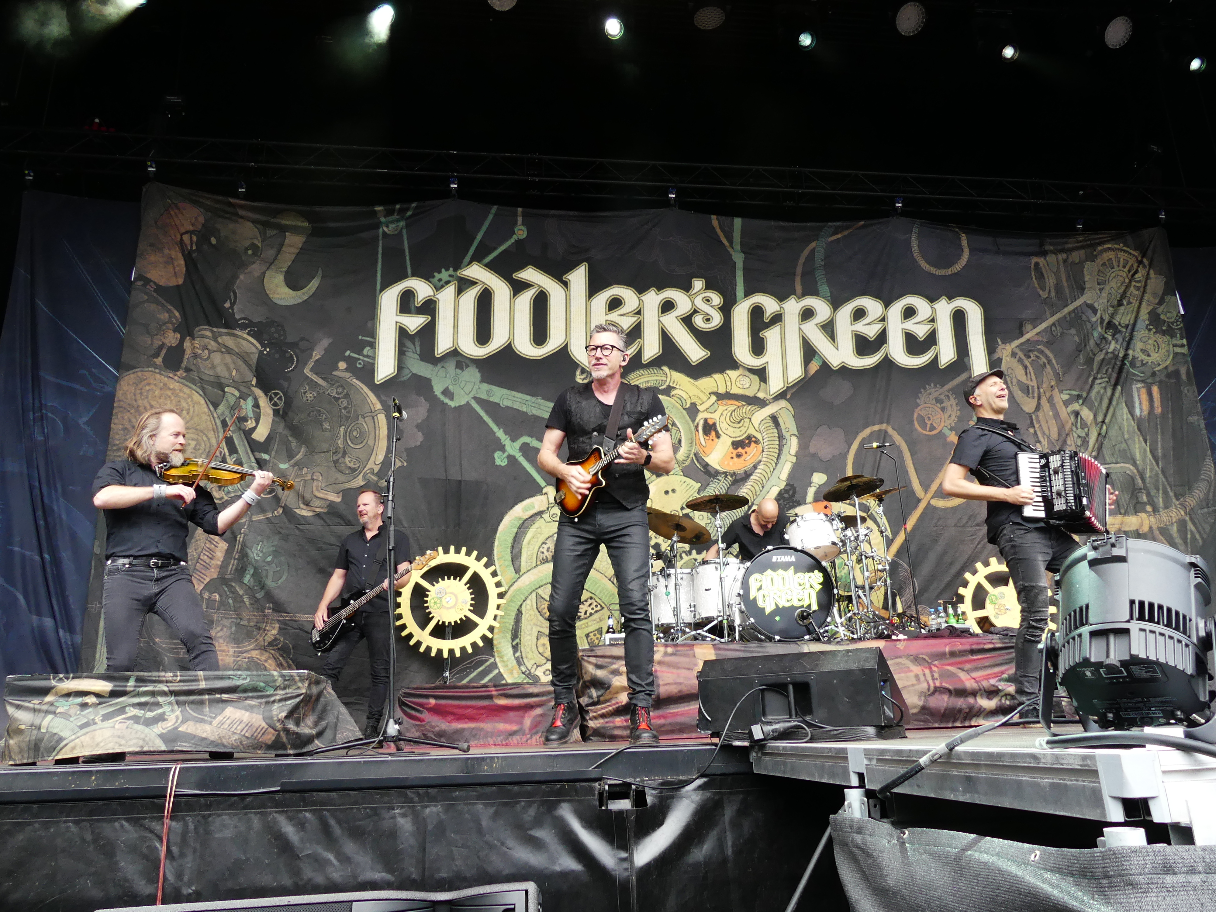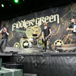 Pünktlich wie die Maurer standen eine halbe Stunde später FIDDLER´S GREEN bereit, um die Menge mit Speed Folk auf Trab zu bringen. Da die Erlangener oft zusammen mit IN EXTREMO unterwegs sind, brauchten sie sich auch keinerlei Sorgen um eine wohlwollende Aufnahme durch das Publikum zu machen – man kennt und mag sich sowieso. Entsprechend feuchtfröhlich wurde sich denn auch durch das Set gefeiert: ob „Perfect Gang“, „A Night In Dublin“ oder „Greens and Fellows“, die Meute vor der Bühne tanzte und sang, von irischen Flaggen und einem grünen FIDDLER´S GREEN-Ballon flankiert, nicht nur eifrig mit, sondern sprang zu „Bottoms Up“ und „Yindy“ auch gutgelaunt durch die Gegend, bis der bunte Reigen dann mit „Victor And His Demons“ nach einer Dreiviertelstunde sein Ende fand.