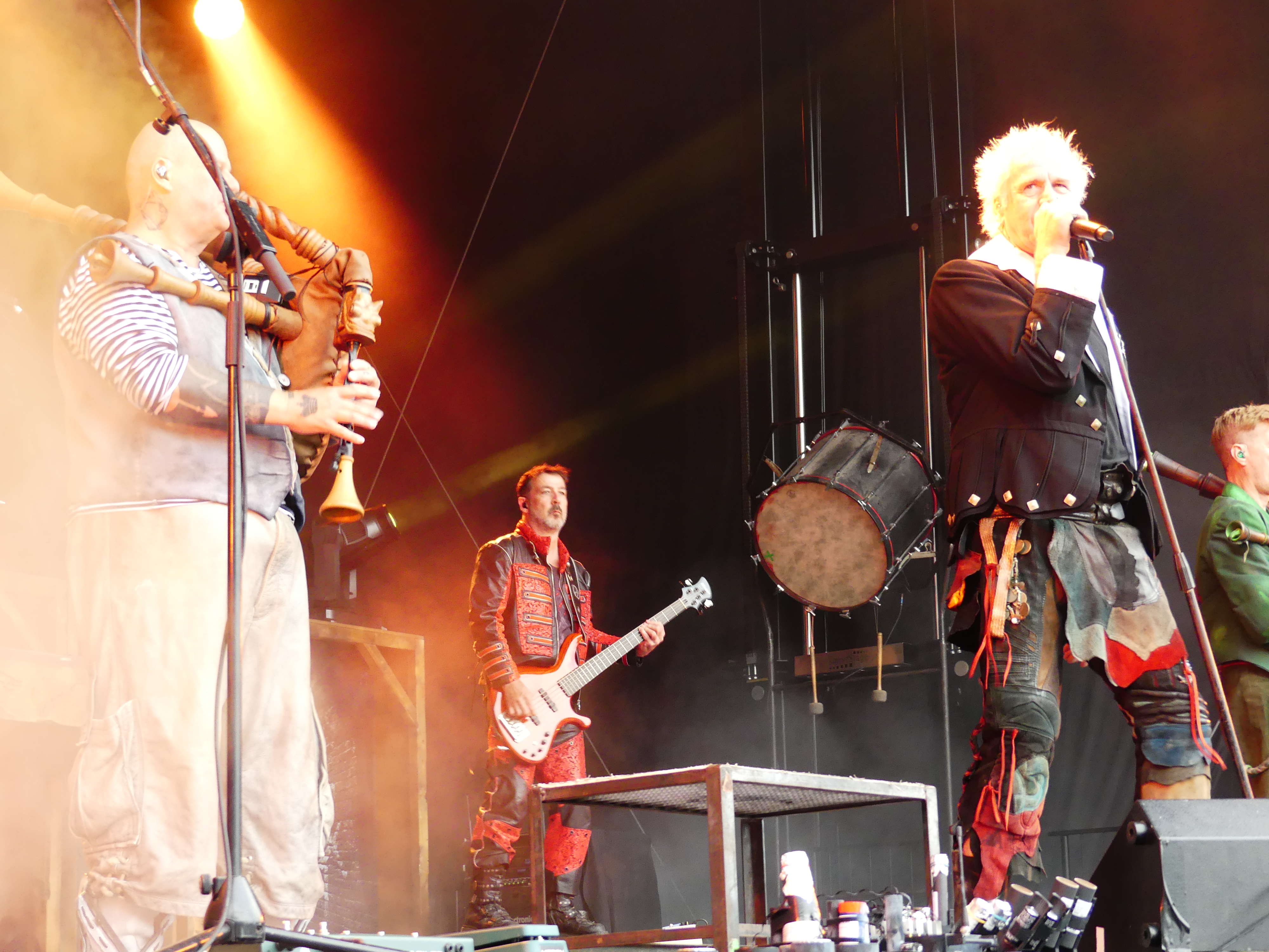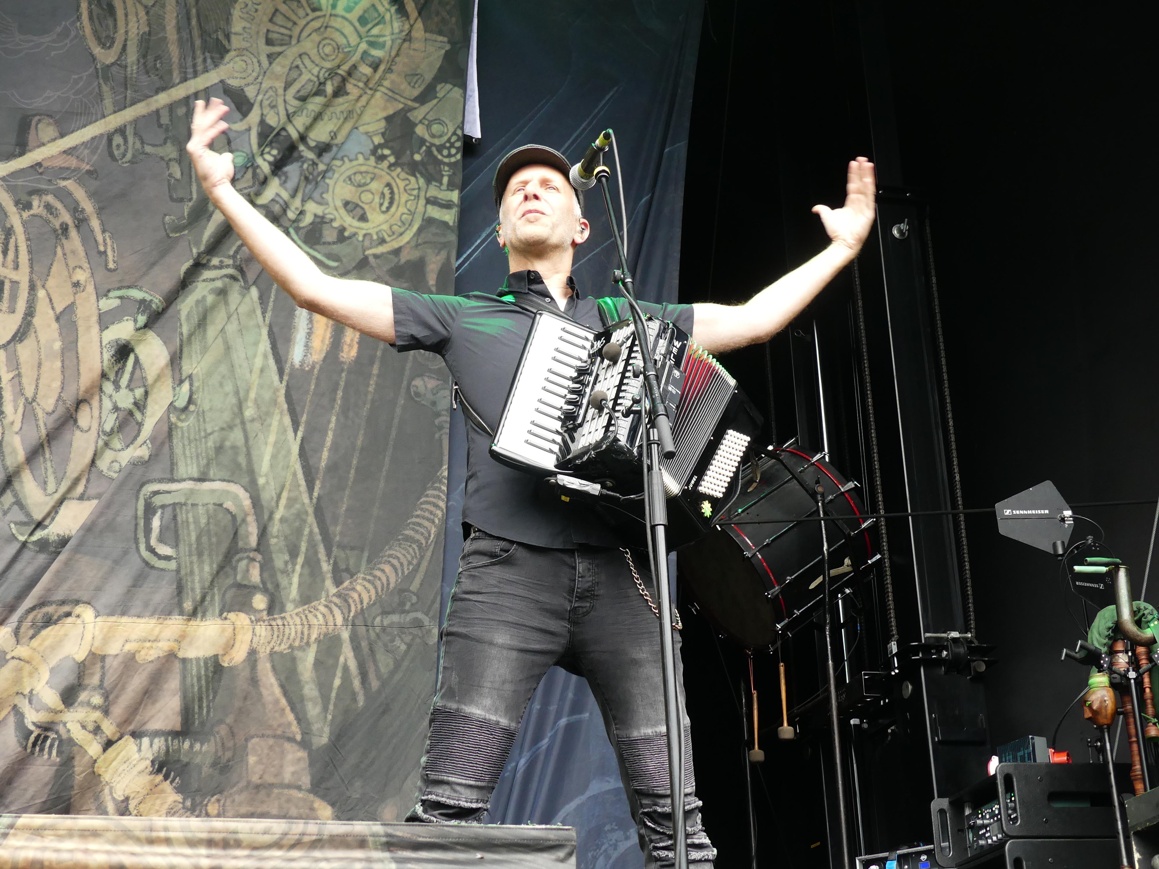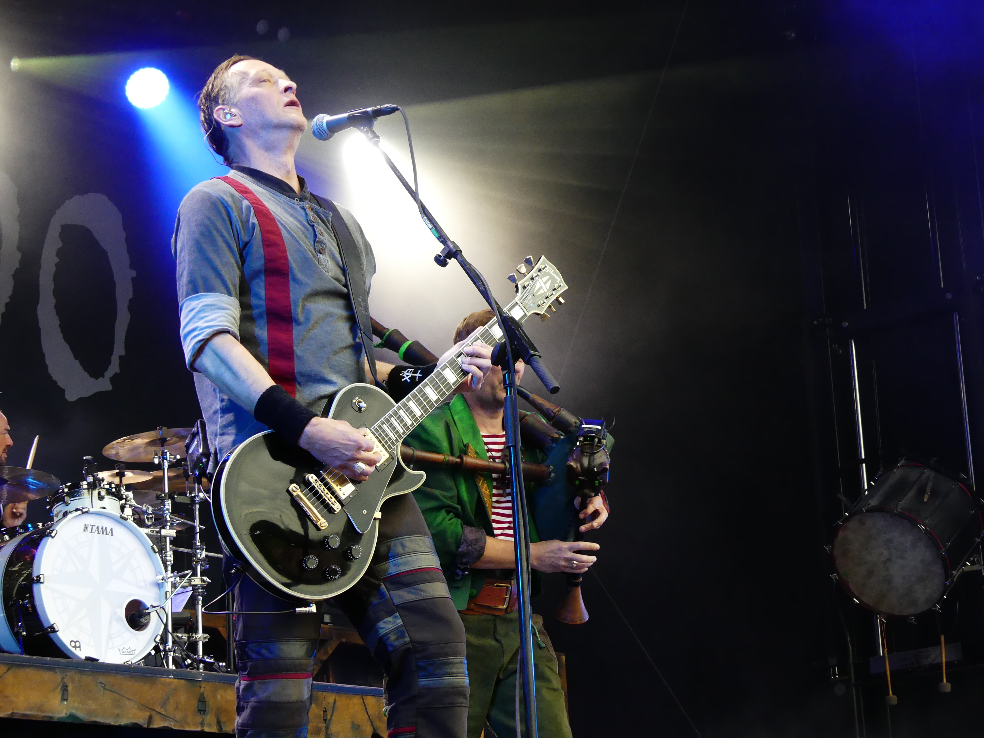 Pünktlich wie die Maurer standen eine halbe Stunde später FIDDLER´S GREEN bereit, um die Menge mit Speed Folk auf Trab zu bringen. Da die Erlangener oft zusammen mit IN EXTREMO unterwegs sind, brauchten sie sich auch keinerlei Sorgen um eine wohlwollende Aufnahme durch das Publikum zu machen – man kennt und mag sich sowieso. Entsprechend feuchtfröhlich wurde sich denn auch durch das Set gefeiert: ob „Perfect Gang“, „A Night In Dublin“ oder „Greens and Fellows“, die Meute vor der Bühne tanzte und sang, von irischen Flaggen und einem grünen FIDDLER´S GREEN-Ballon flankiert, nicht nur eifrig mit, sondern sprang zu „Bottoms Up“ und „Yindy“ auch gutgelaunt durch die Gegend, bis der bunte Reigen dann mit „Victor And His Demons“ nach einer Dreiviertelstunde sein Ende fand.