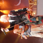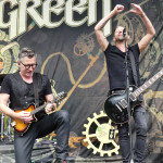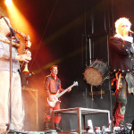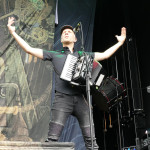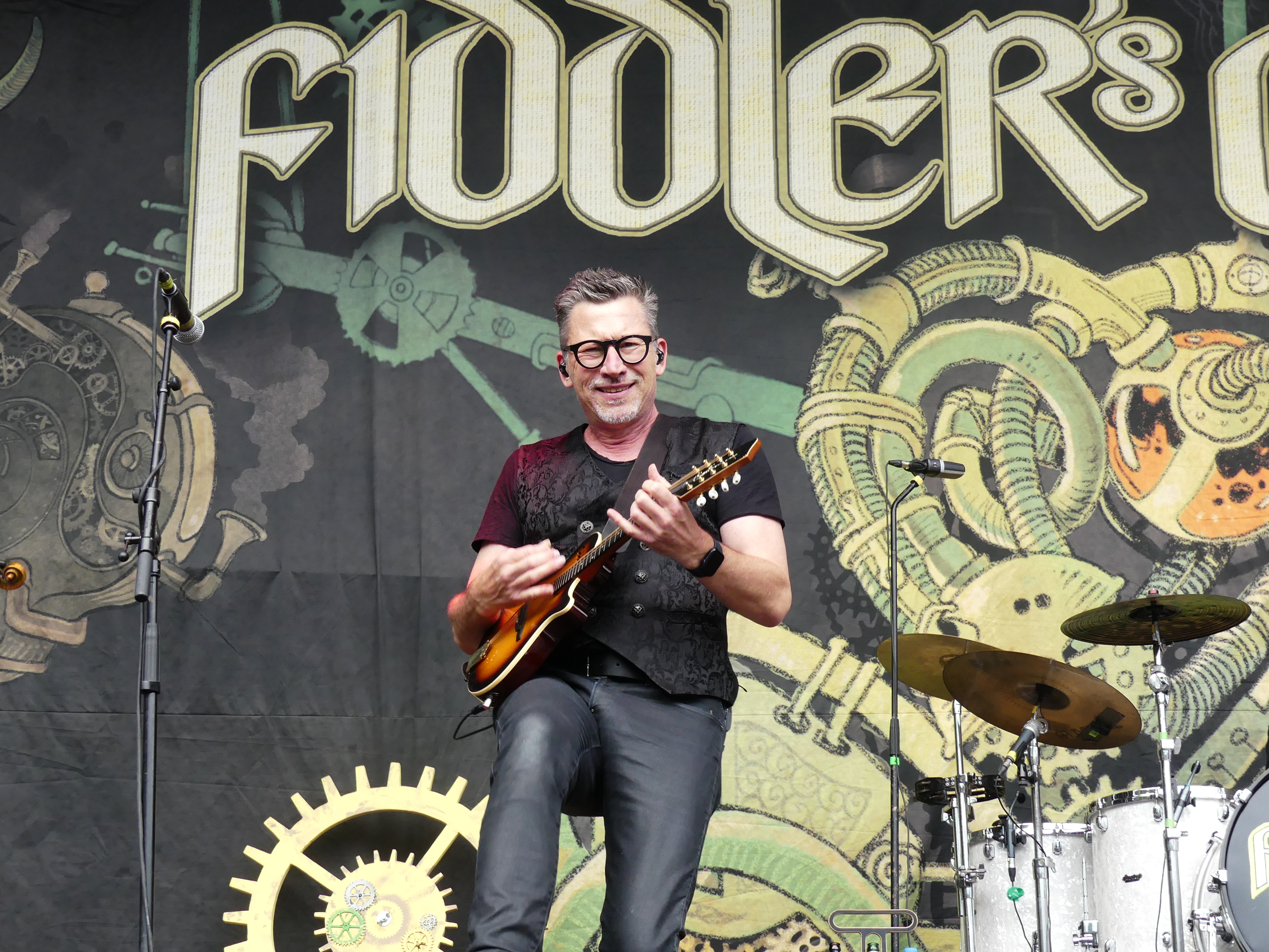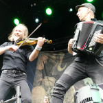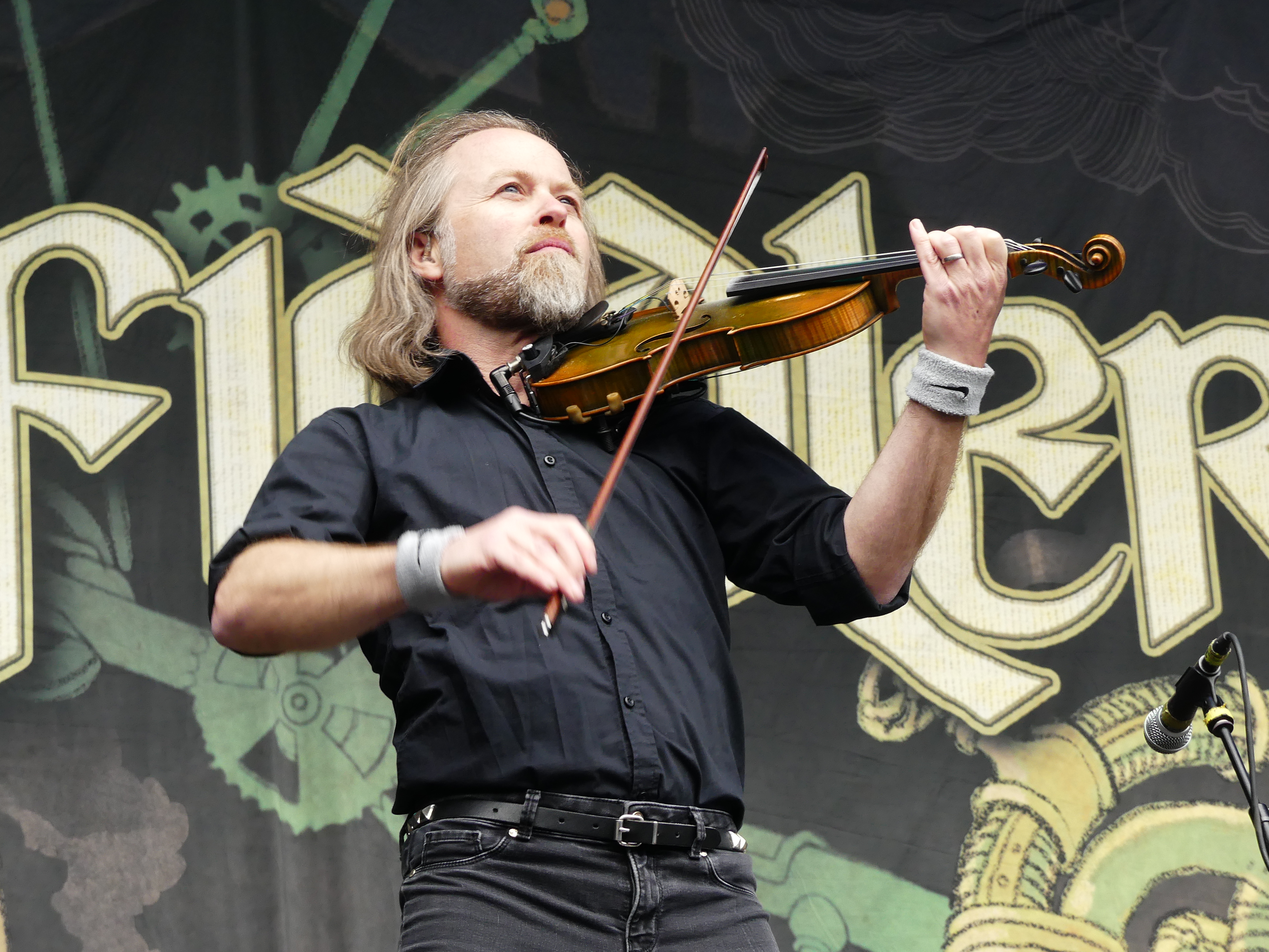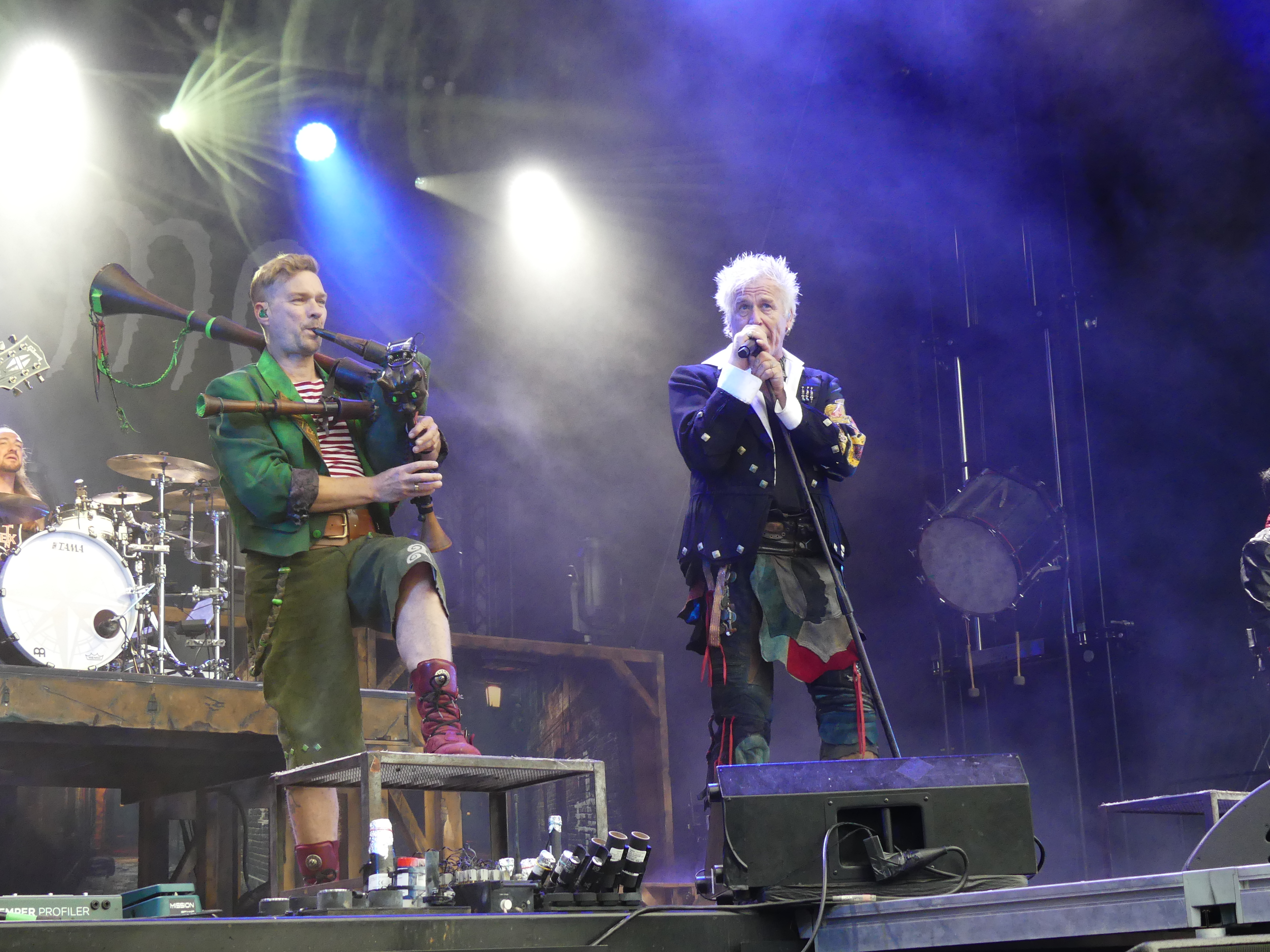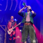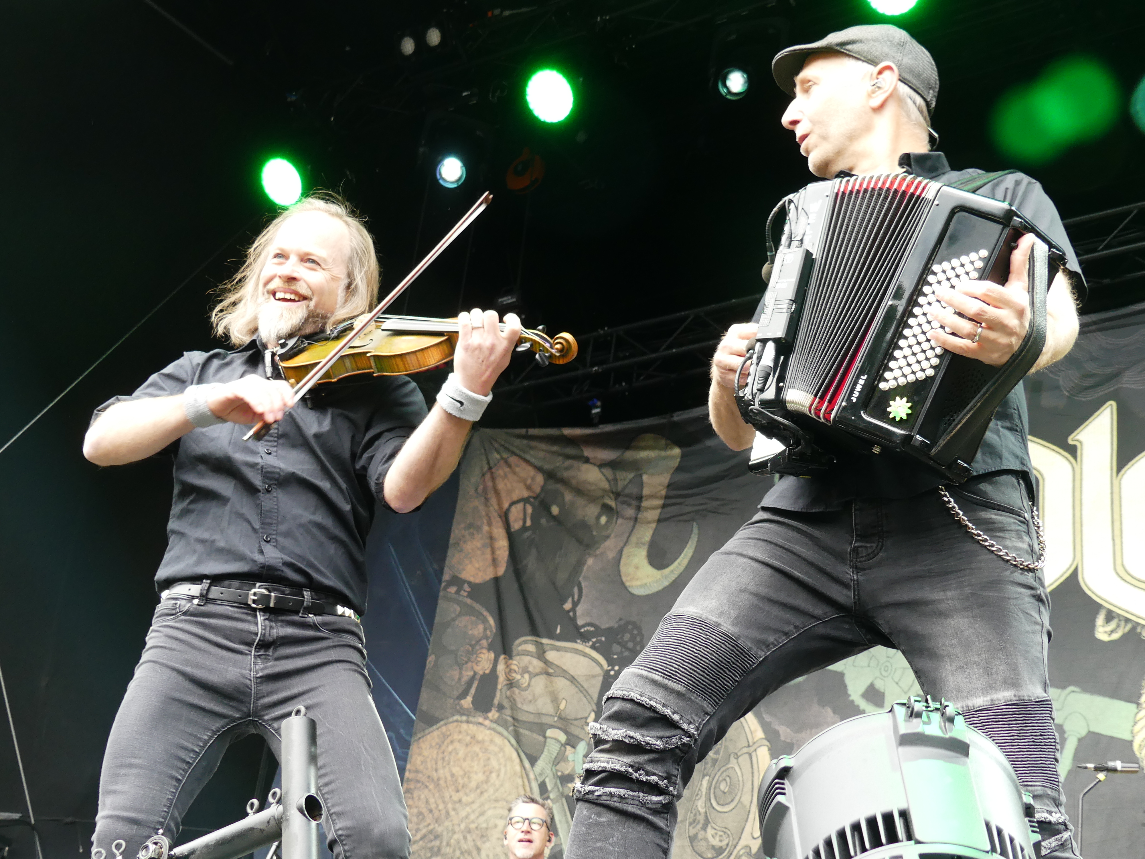 Pünktlich wie die Maurer standen eine halbe Stunde später FIDDLER´S GREEN bereit, um die Menge mit Speed Folk auf Trab zu bringen. Da die Erlangener oft zusammen mit IN EXTREMO unterwegs sind, brauchten sie sich auch keinerlei Sorgen um eine wohlwollende Aufnahme durch das Publikum zu machen – man kennt und mag sich sowieso. Entsprechend feuchtfröhlich wurde sich denn auch durch das Set gefeiert: ob „Perfect Gang“, „A Night In Dublin“ oder „Greens and Fellows“, die Meute vor der Bühne tanzte und sang, von irischen Flaggen und einem grünen FIDDLER´S GREEN-Ballon flankiert, nicht nur eifrig mit, sondern sprang zu „Bottoms Up“ und „Yindy“ auch gutgelaunt durch die Gegend, bis der bunte Reigen dann mit „Victor And His Demons“ nach einer Dreiviertelstunde sein Ende fand.