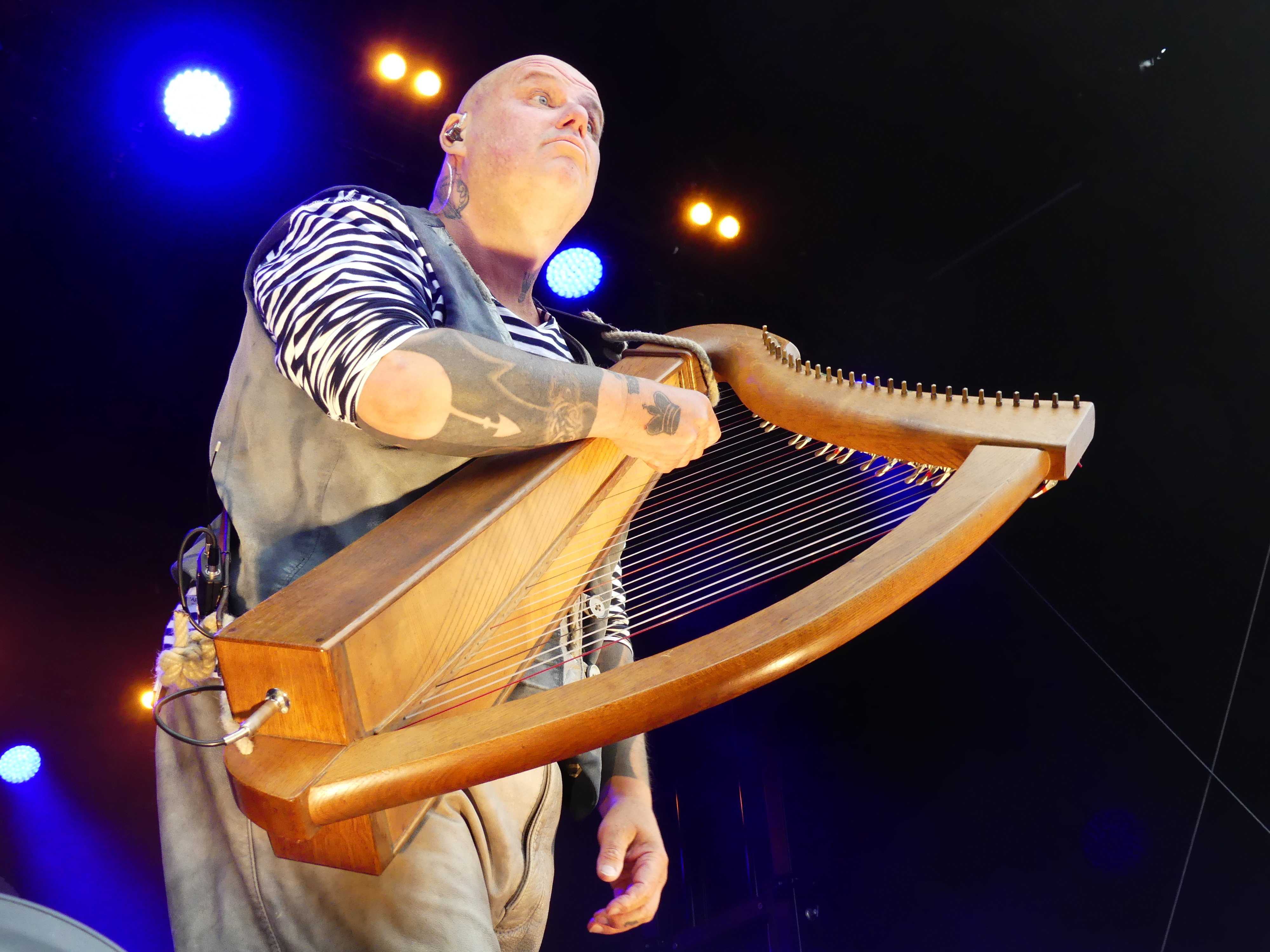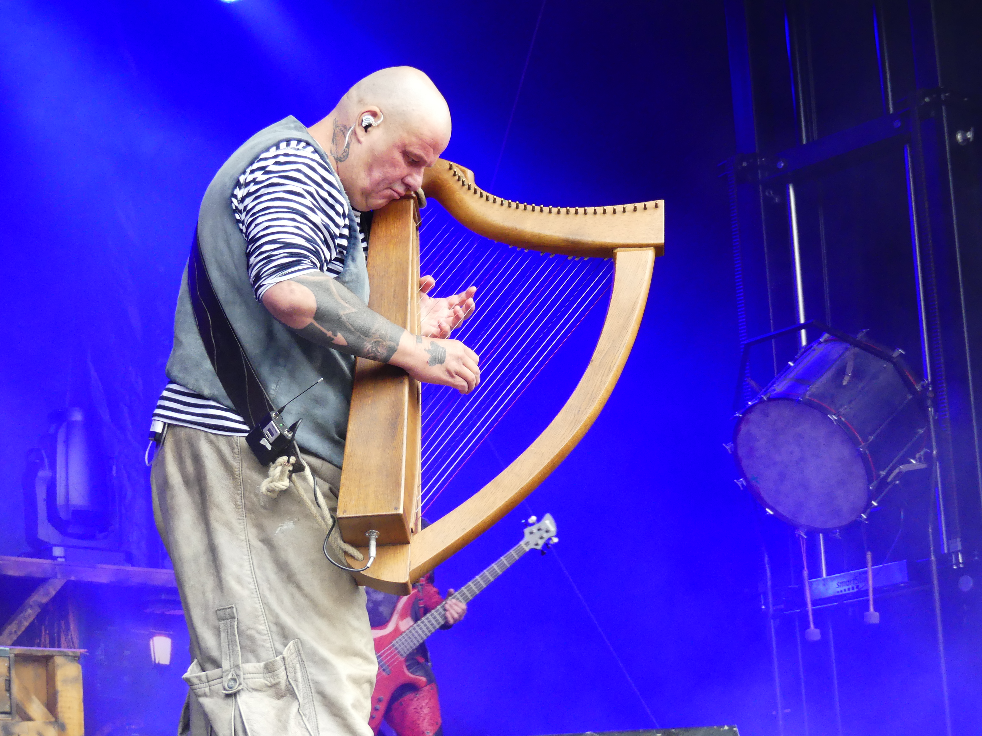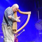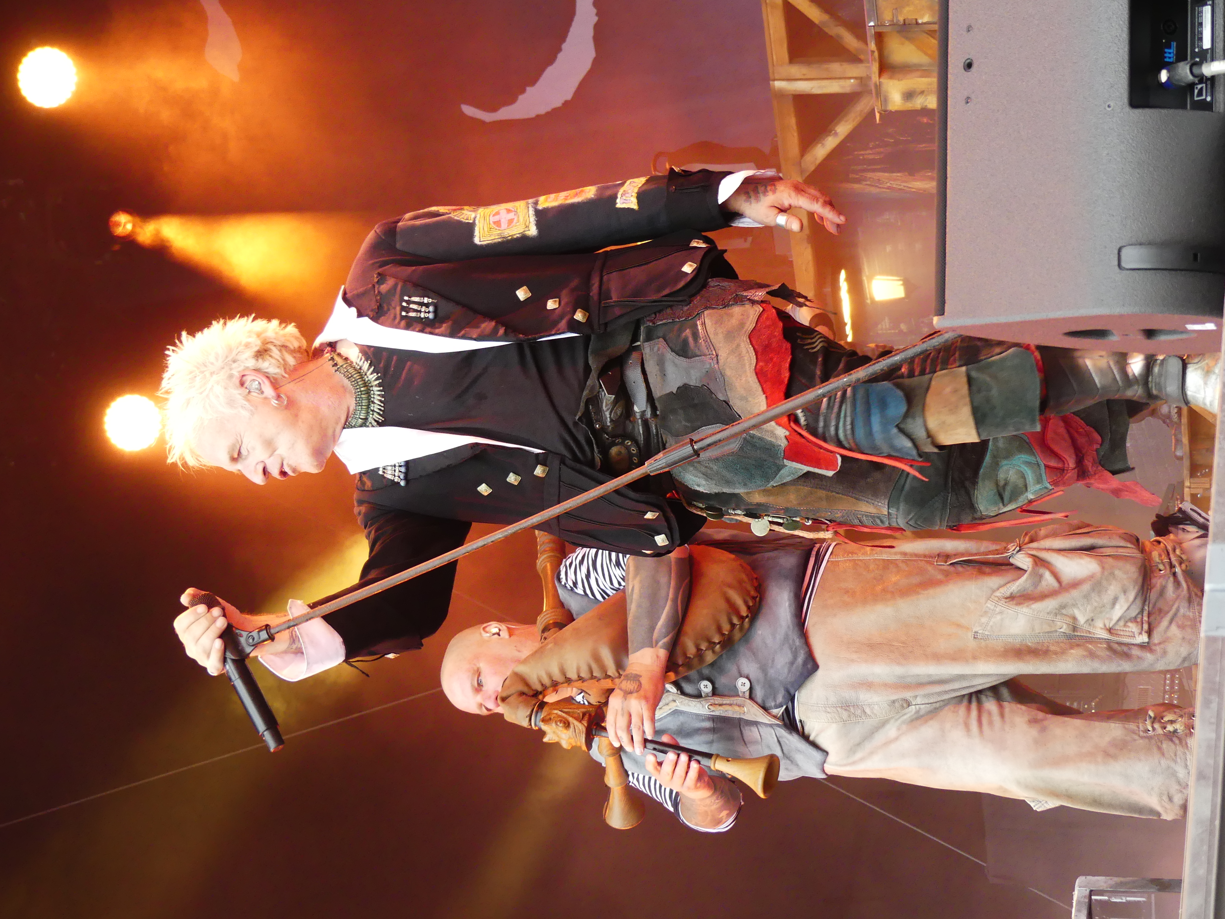 Nun nahte der Höhepunkt des Abends, was nicht zuletzt auch daran zu erkennen war, dass sich die Schlangen an den Marktständen deutlich verkürzten und viele Leute lieber schon vor der Bühne stehen blieben, statt noch einmal eine Runde über das Burggelände zu drehen. Um 19:30 Uhr war es schließlich soweit und der Auftritt von IN EXTREMO begann – buchstäblich – mit einem Knall: man hat ja nicht umsonst ein Faible für Pyrotechnik. Danach waren jedenfalls alle wach und selbst die letzten verstreuten Gestalten, die sich noch in den Burghöfen herumgetrieben hatten, versammelten sich vor der Bühne, während IN EXTREMO mit „Troja“ vom ersten Ton an Vollgas gaben. „Wir sind die Band, die ihre Hits gleich am Anfang spielt“, erklärte Sänger Micha Rhein dann auch grinsend und ließ, unter lautstarkem Jubel des Publikums, den Klassiker „Vollmond“ mit den charakteristischen Harfenklängen von Dr. Pymonte und das ebenso bekannte wie wunderbar archaisch-rockige „Herr Mannelig“ folgen. Auch das gälische „Liam“, „Belladonna“ und „Küss Mich“ wurden frenetisch gefeiert, was Das Letzte Einhorn zum Anlass nahm, sich bei allen Anwesenden aus tiefster Seele zu bedanken: „Wir sind jetzt 29 Jahre unterwegs. Danke für eure Treue die ganze Zeit über – das meine ich wirklich ernst.“ Und selbstverständlich wären IN EXTREMO nicht IN EXTREMO, wenn sie nicht vorhätten, den Anlass des bevorstehenden 30-jährigen Jubiläums mit einer großen Sause zu feiern – es ist zwar noch etwas hin bis dahin, aber eine Einladung an alle Anwesenden kann man ja schon mal aussprechen. Dass sie obendrein aufmerksame und umsichtige Beobachter sind, bewiesen die Spielleute ebenfalls: „Wir finden es übrigens gut, dass hier auch viele Kinder im Publikum sind – das ist in Zukunft gut für unsere Kasse…. Aber jetzt mal im Ernst, Kinder, habt ihr alle Gehörschutz an? Nein? Du, kleines Mädchen da vorne? Nein? Schlechter Vater!“. Sprach´s und ließ während des nachfolgenden Lieds backstage Ohrstöpsel besorgen, die dann im Anschluss von der Bühne ins Publikum weitergereicht wurden. Als guter Spielmann kümmert man sich eben um seine Leute – und auch so gewinnt man Sympathien. Wobei die grundbodenständigen Spielleute die ohnehin schon auf ihrer Seite hatten. „Mein Rasend Herz“ und „Sängerkrieg“ heizten wieder ordentlich ein und brachten noch den Letzten auf Trab. Noch den Letzten? Ja: „So, und jetzt wollen wir alle eure Arme oben sehen! Du da hinten mit der blauen Jacke, du hast die Arme noch unten! Ja, du! Ich sehe dich – ich habe gute Augen!“. Generell brauchte sich die Band über mangelnden Zuspruch aber wirklich nicht zu beklagen, die Menge feierte begeistert mit und spätestens beim unvermeidlichen Trinklied „Sternhagelvoll“ lagen sich selbst völlig Wildfremde bierselig schunkelnd in den Armen, während es von der Bühne her Seifenblasen und Papierschnipsel regnete. Mit „Störtebeker“ und „Feuertaufe“ kamen auch Freunde weniger hochprozentiger Texte noch einmal voll auf ihre Kosten, bevor die Band das erste Mal die Bühne verließ. Allerdings nur kurz, denn selbstverständlich wurden die lautstarken Rufe nach einer Zugabe erhört und der Wunsch des Publikums nach mehr mit „Rotes Haar“, „Spielmannsfluch“ und „Pikse Palve“ als gelungenem Abschluss erfüllt. Und einen kleinen Trost für alle, in deren Wahrnehmung der Abend viel zu schnell verging, gab es auch noch: die Spielleute kommen wieder, die entsprechende Vereinbarung mit den Veranstaltern von Burg Satzvey scheint schon in trockenen Tüchern zu sein. Aber alles andere wäre ja auch wirklich ein Jammer, denn wie lässt sich Mittelalterrock schöner kredenzen als auf dem Gelände einer Burg wie Burg Satzvey? In diesem Sinne: nach der Burgentour ist vor der Burgentour – auf die nächste Runde mit IN EXTREMO!