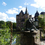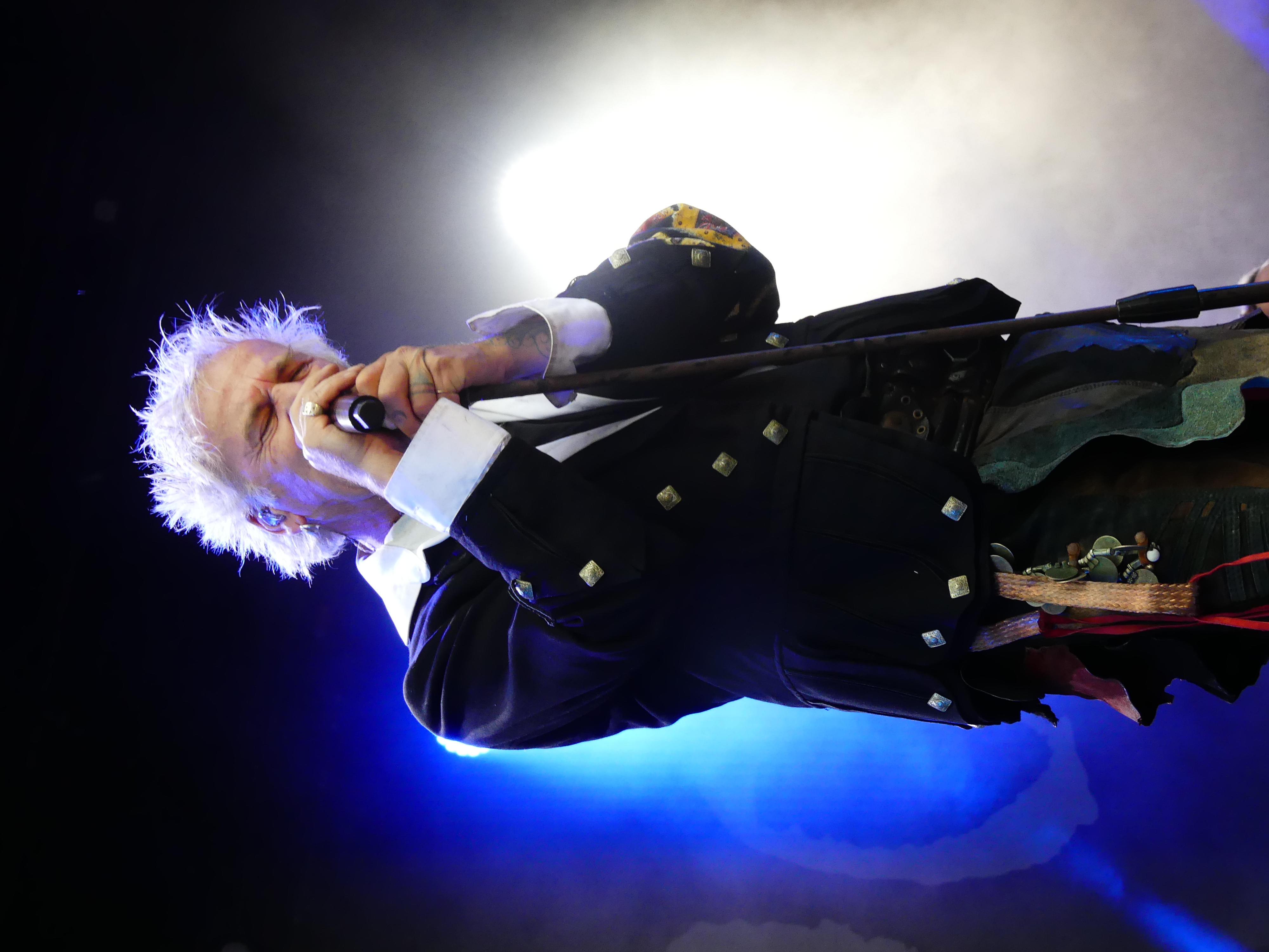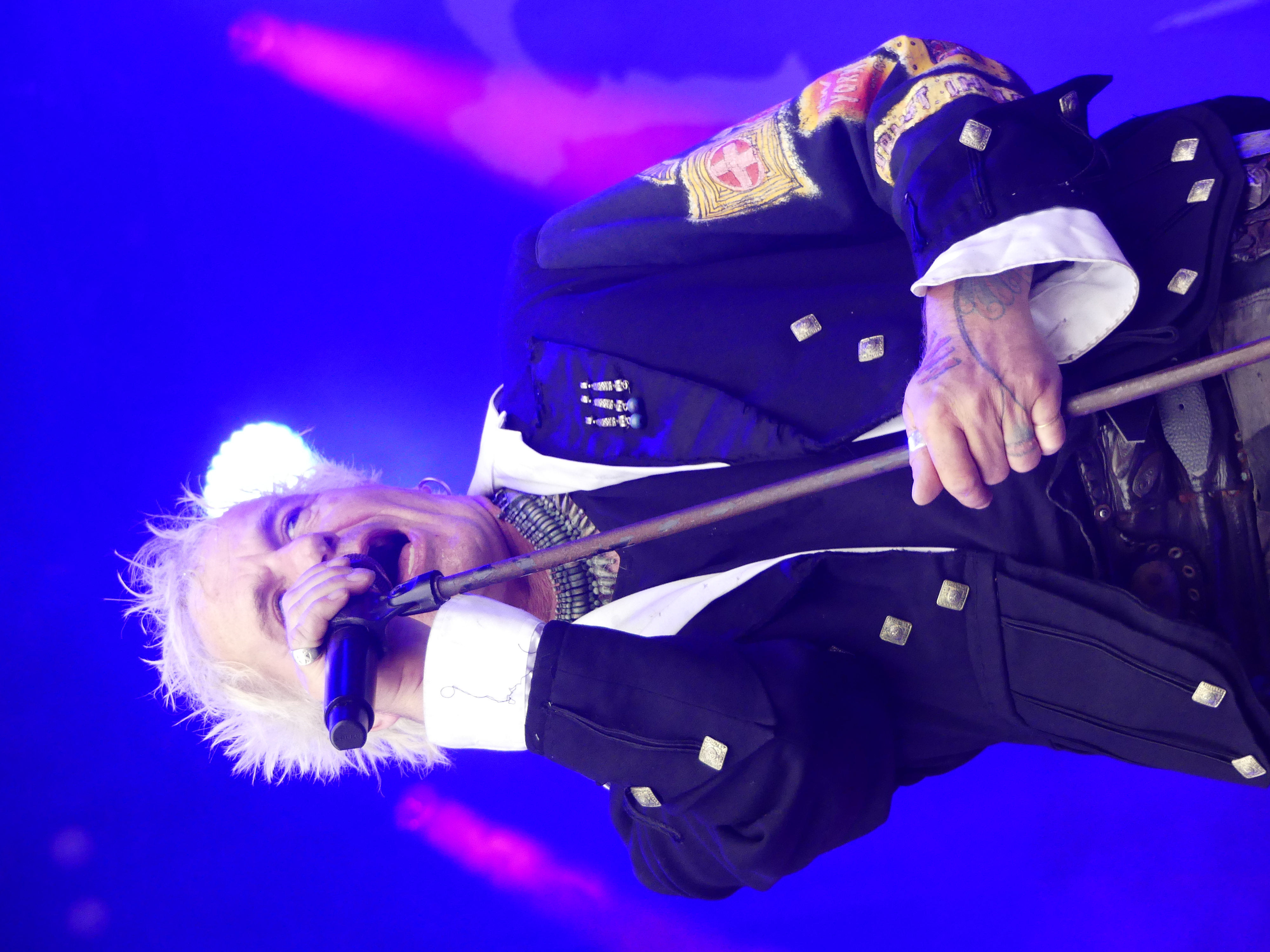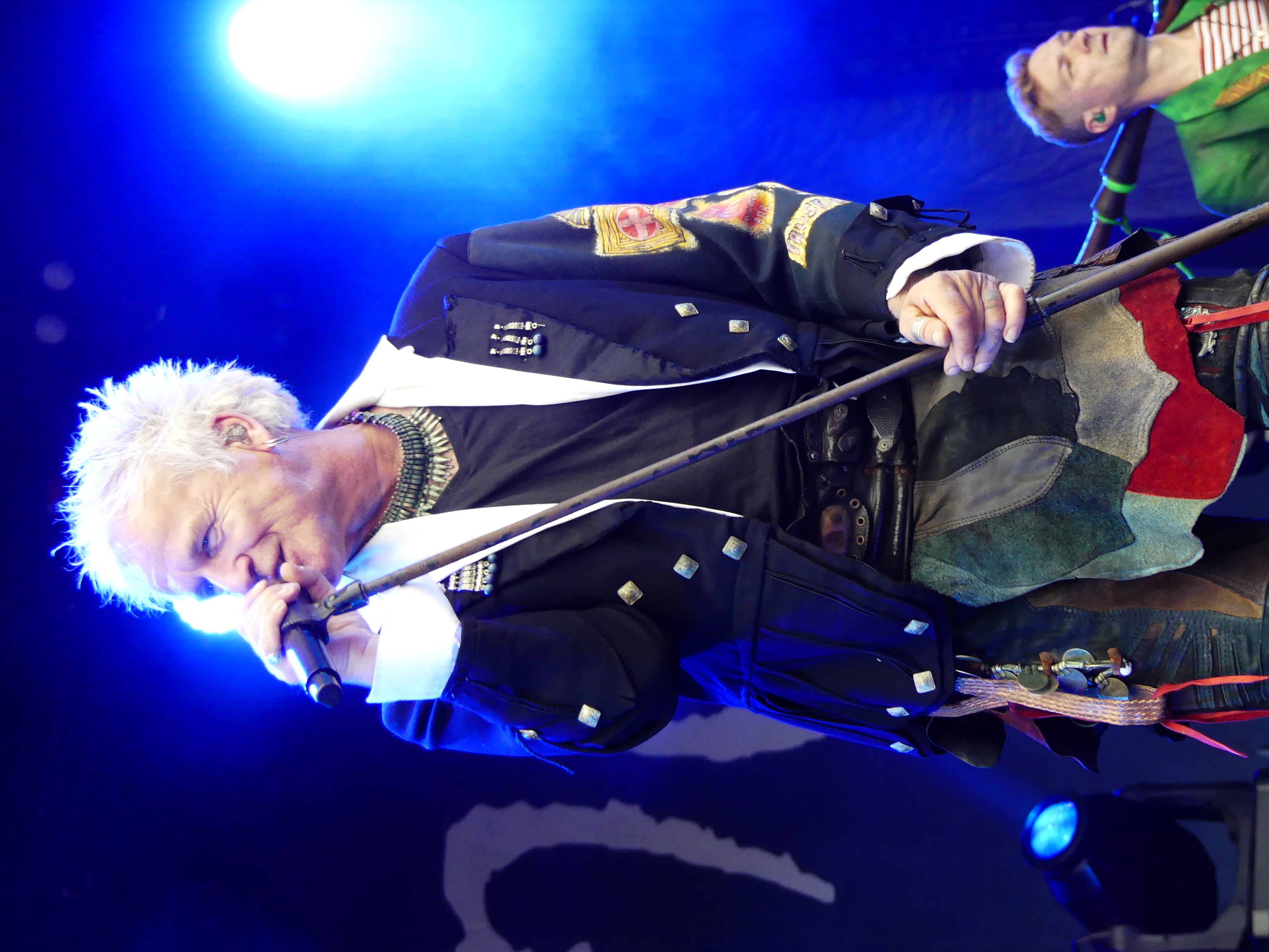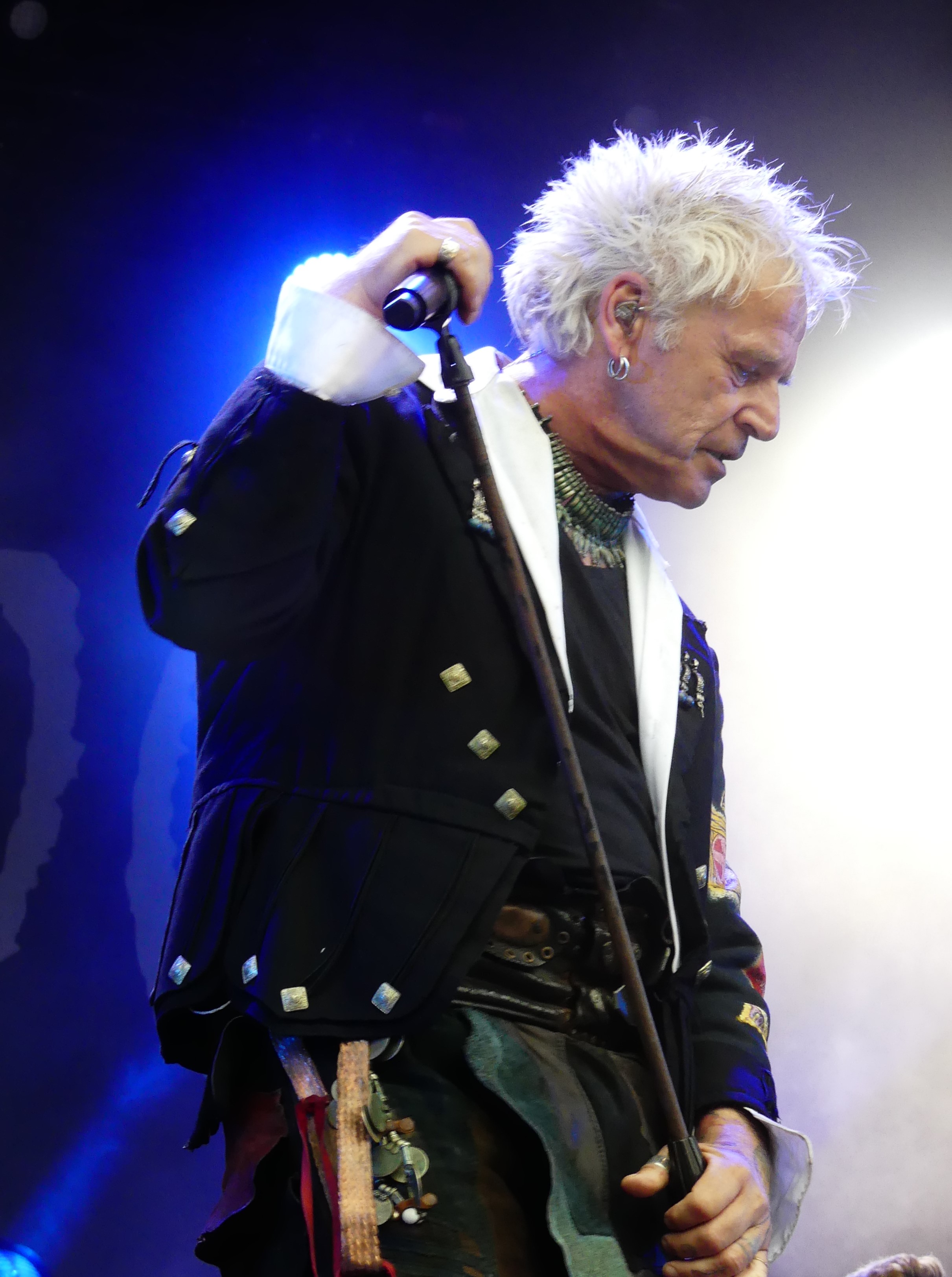 Nun nahte der Höhepunkt des Abends, was nicht zuletzt auch daran zu erkennen war, dass sich die Schlangen an den Marktständen deutlich verkürzten und viele Leute lieber schon vor der Bühne stehen blieben, statt noch einmal eine Runde über das Burggelände zu drehen. Um 19:30 Uhr war es schließlich soweit und der Auftritt von IN EXTREMO begann – buchstäblich – mit einem Knall: man hat ja nicht umsonst ein Faible für Pyrotechnik. Danach waren jedenfalls alle wach und selbst die letzten verstreuten Gestalten, die sich noch in den Burghöfen herumgetrieben hatten, versammelten sich vor der Bühne, während IN EXTREMO mit „Troja“ vom ersten Ton an Vollgas gaben. „Wir sind die Band, die ihre Hits gleich am Anfang spielt“, erklärte Sänger Micha Rhein dann auch grinsend und ließ, unter lautstarkem Jubel des Publikums, den Klassiker „Vollmond“ mit den charakteristischen Harfenklängen von Dr. Pymonte und das ebenso bekannte wie wunderbar archaisch-rockige „Herr Mannelig“ folgen. Auch das gälische „Liam“, „Belladonna“ und „Küss Mich“ wurden frenetisch gefeiert, was Das Letzte Einhorn zum Anlass nahm, sich bei allen Anwesenden aus tiefster Seele zu bedanken: „Wir sind jetzt 29 Jahre unterwegs. Danke für eure Treue die ganze Zeit über – das meine ich wirklich ernst.“ Und selbstverständlich wären IN EXTREMO nicht IN EXTREMO, wenn sie nicht vorhätten, den Anlass des bevorstehenden 30-jährigen Jubiläums mit einer großen Sause zu feiern – es ist zwar noch etwas hin bis dahin, aber eine Einladung an alle Anwesenden kann man ja schon mal aussprechen. Dass sie obendrein aufmerksame und umsichtige Beobachter sind, bewiesen die Spielleute ebenfalls: „Wir finden es übrigens gut, dass hier auch viele Kinder im Publikum sind – das ist in Zukunft gut für unsere Kasse…. Aber jetzt mal im Ernst, Kinder, habt ihr alle Gehörschutz an? Nein? Du, kleines Mädchen da vorne? Nein? Schlechter Vater!“. Sprach´s und ließ während des nachfolgenden Lieds backstage Ohrstöpsel besorgen, die dann im Anschluss von der Bühne ins Publikum weitergereicht wurden. Als guter Spielmann kümmert man sich eben um seine Leute – und auch so gewinnt man Sympathien. Wobei die grundbodenständigen Spielleute die ohnehin schon auf ihrer Seite hatten. „Mein Rasend Herz“ und „Sängerkrieg“ heizten wieder ordentlich ein und brachten noch den Letzten auf Trab. Noch den Letzten? Ja: „So, und jetzt wollen wir alle eure Arme oben sehen! Du da hinten mit der blauen Jacke, du hast die Arme noch unten! Ja, du! Ich sehe dich – ich habe gute Augen!“. Generell brauchte sich die Band über mangelnden Zuspruch aber wirklich nicht zu beklagen, die Menge feierte begeistert mit und spätestens beim unvermeidlichen Trinklied „Sternhagelvoll“ lagen sich selbst völlig Wildfremde bierselig schunkelnd in den Armen, während es von der Bühne her Seifenblasen und Papierschnipsel regnete. Mit „Störtebeker“ und „Feuertaufe“ kamen auch Freunde weniger hochprozentiger Texte noch einmal voll auf ihre Kosten, bevor die Band das erste Mal die Bühne verließ. Allerdings nur kurz, denn selbstverständlich wurden die lautstarken Rufe nach einer Zugabe erhört und der Wunsch des Publikums nach mehr mit „Rotes Haar“, „Spielmannsfluch“ und „Pikse Palve“ als gelungenem Abschluss erfüllt. Und einen kleinen Trost für alle, in deren Wahrnehmung der Abend viel zu schnell verging, gab es auch noch: die Spielleute kommen wieder, die entsprechende Vereinbarung mit den Veranstaltern von Burg Satzvey scheint schon in trockenen Tüchern zu sein. Aber alles andere wäre ja auch wirklich ein Jammer, denn wie lässt sich Mittelalterrock schöner kredenzen als auf dem Gelände einer Burg wie Burg Satzvey? In diesem Sinne: nach der Burgentour ist vor der Burgentour – auf die nächste Runde mit IN EXTREMO!