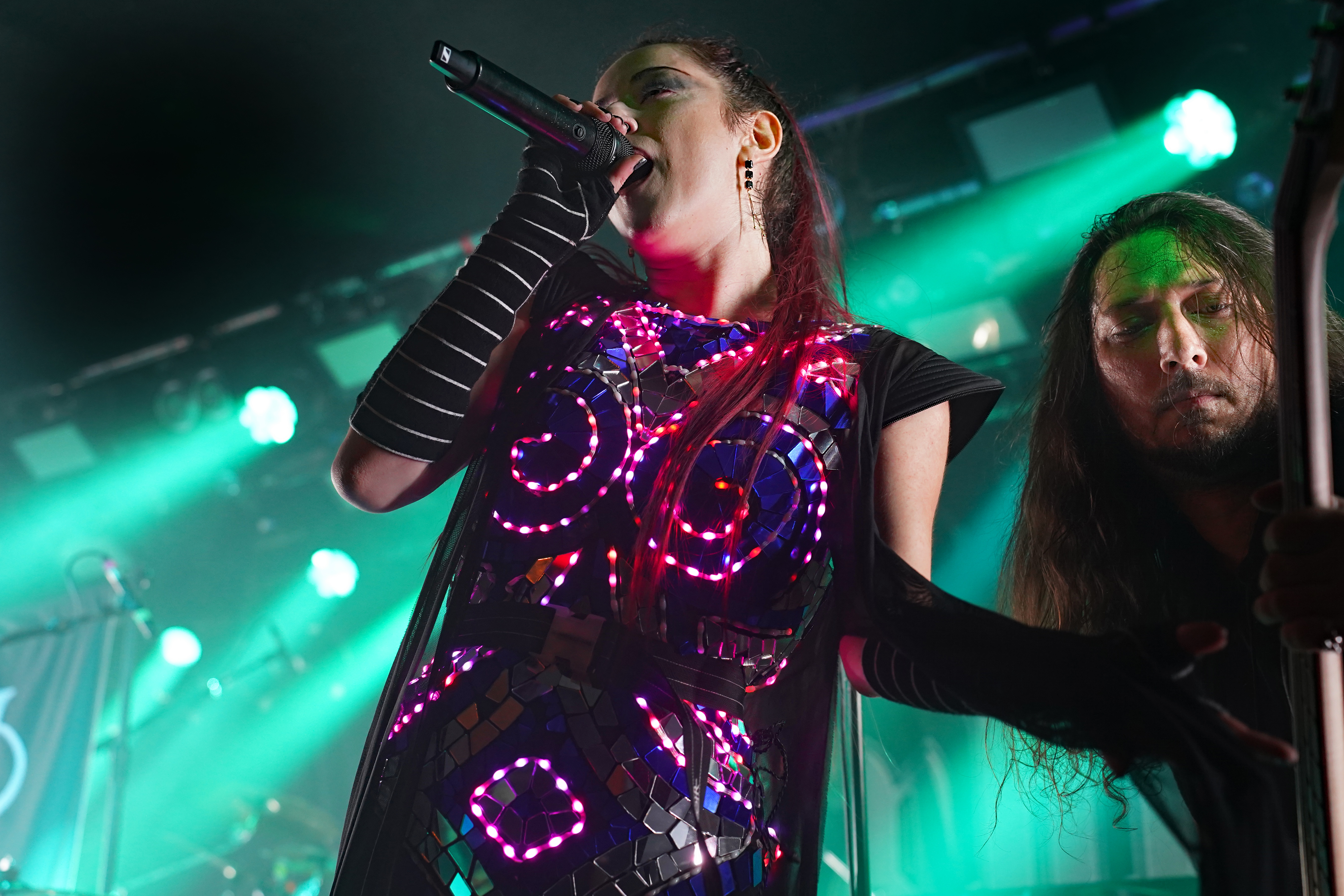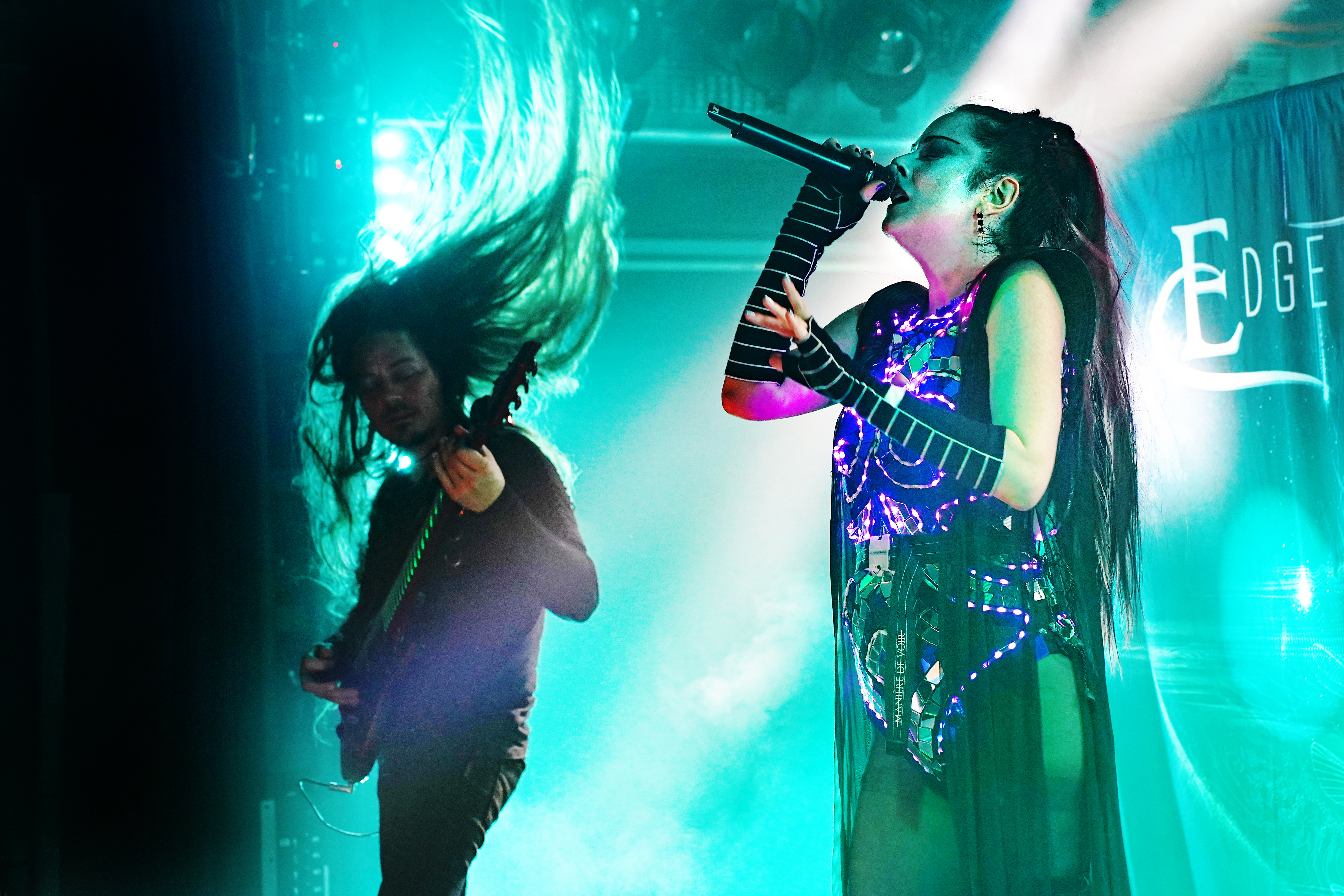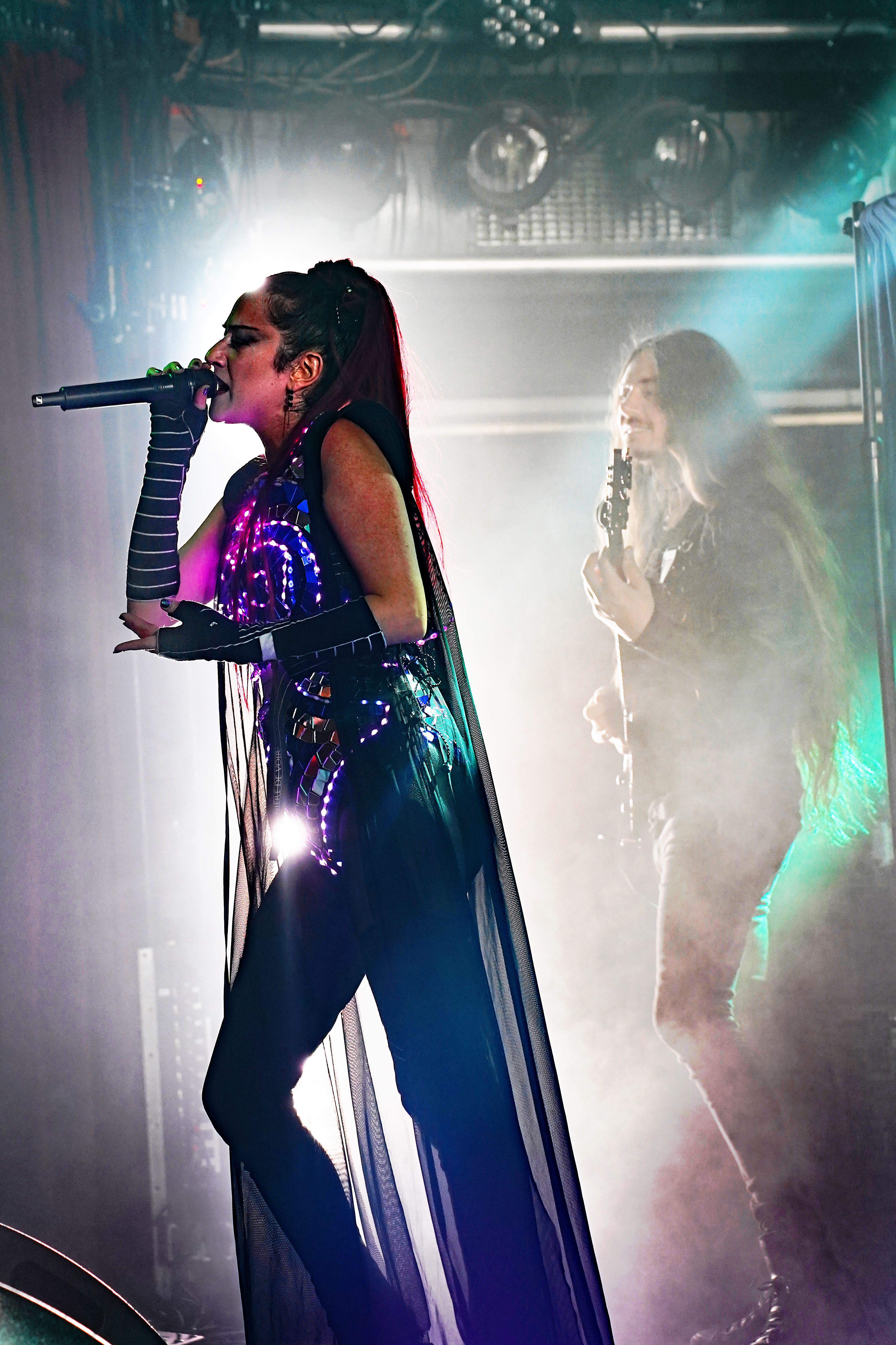 Nach 5 langen Jahren der Abstinenz beehren die Prog Metal Titanen SYHMPHONY X endlich wieder europäische Bühnen und das sollte und darf man sich nicht entgehen lassen. Bevor es so weit ist, dürfen aber erst einmal EDGE OF PARADISE ran. Die Herren um Frontfrau Margarita Monet polarisieren und der effektbeladene, poppige und sehr futuristische Melodic Metal ist sicherlich nicht jedermanns Sache aber gerade das macht es für mich interessant. Dass man seit 48 Stunden ohne Schlaf auf den Beinen ist, macht es für EDGE OF PARADISE natürlich nicht einfacher und trotzdem gibt man alles und hat große Teile des Publikums auch schnell auf seine Seite gebracht. Großer Blickfang ist dabei das mit Leuchtdioden versehene Outfit von Margerita. Die Show ist natürlich auf sie zugeschnitten und die Herren halten sich eher im Verborgenen, was auf der dunklen, wenig ausgeleuchteten und mit relativ viel Nebel versehenen Bühne gar nicht mal so schwer ist. Natürlich kommt so ihr Outfit gut zur Geltung aber ein bisschen mehr hätte es schon sein dürfen. Dies ändert sich komischerweise auch beim Headliner nicht und man nutzt nur ein Bruchteil, des in der Halle zu Verfügung stehenden Lichts. EDGE OF PARADISE spielen hauptsächlich Songs vom noch aktuellen Album „Hologram“, mit „Rogue“ gibt es aber auch eine ganz neue Nummer zu hören. Alles in allem ein schöner Start in den Abend.