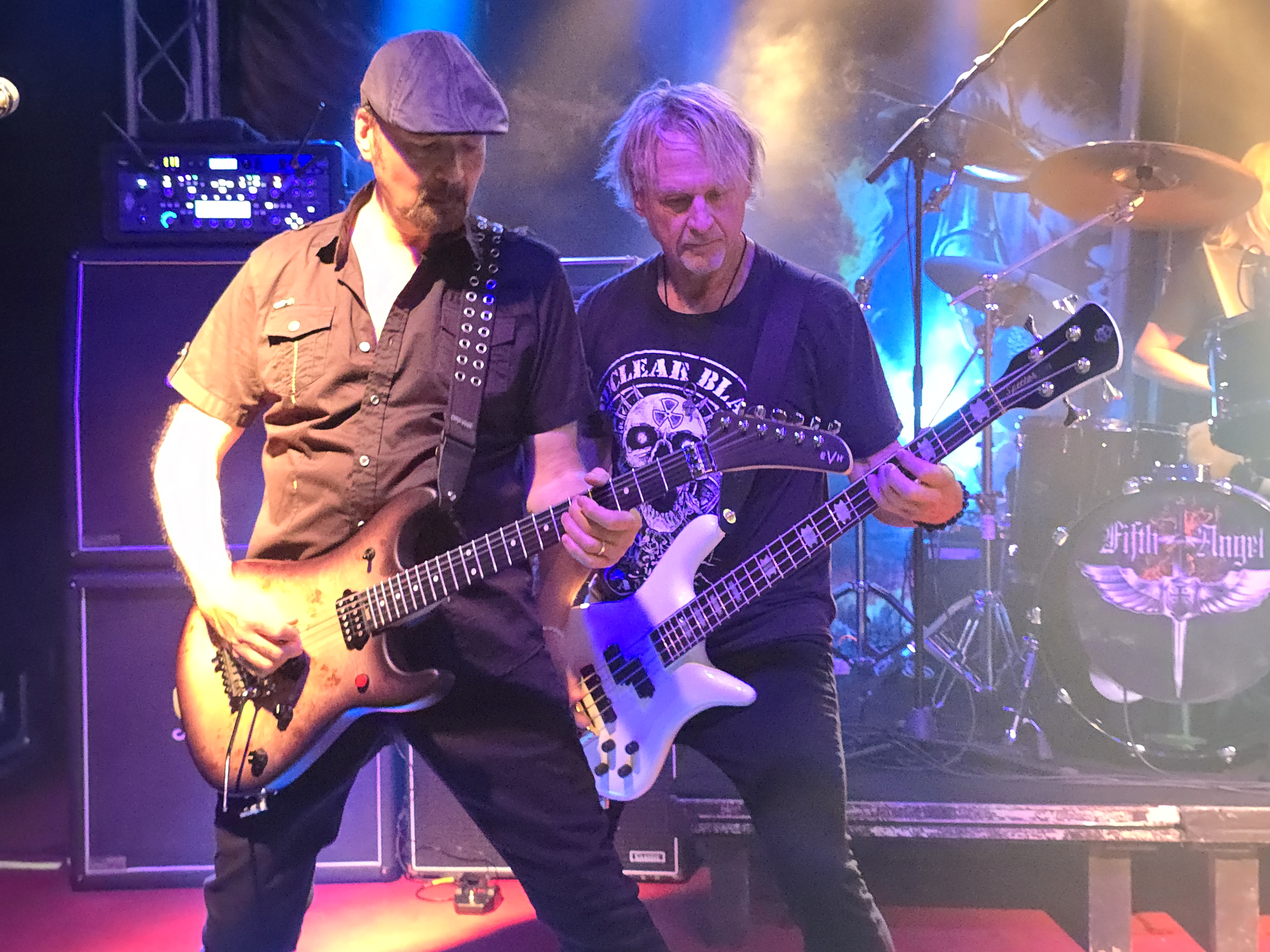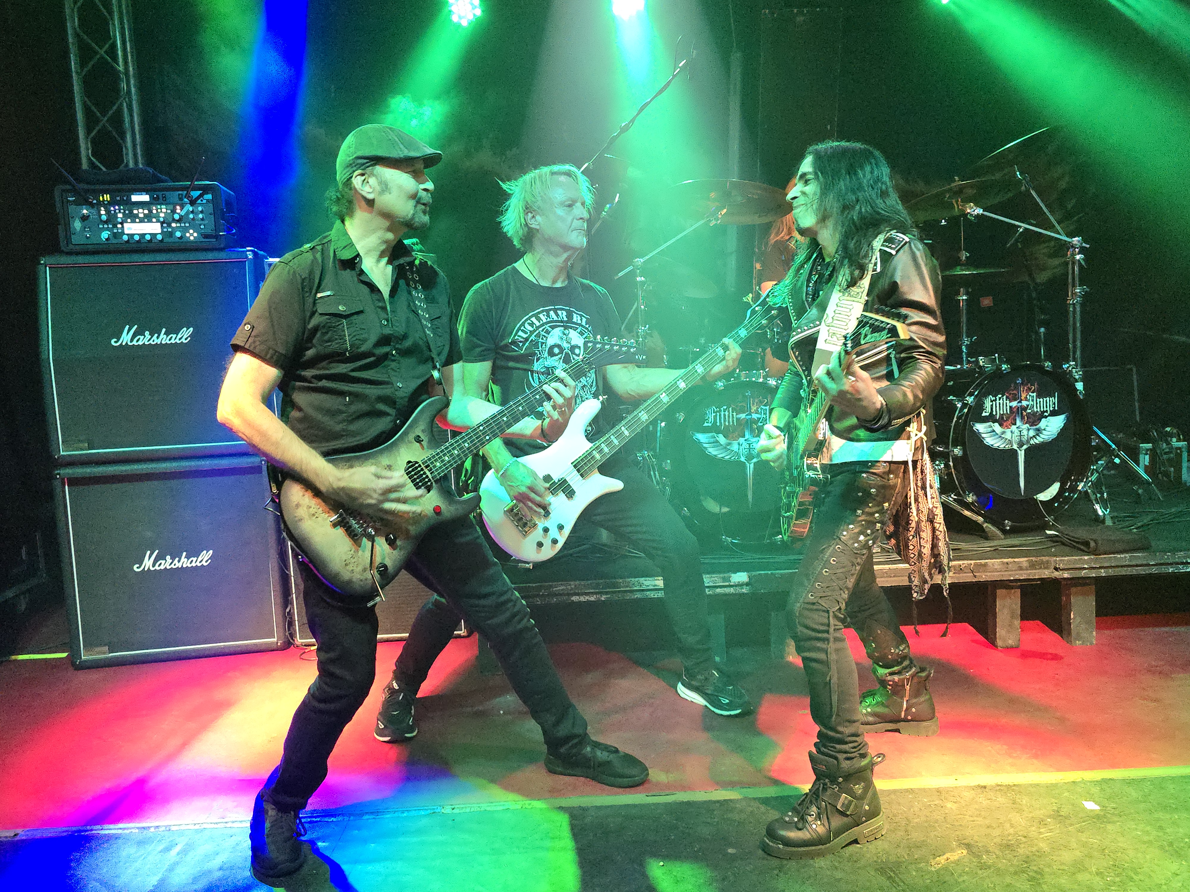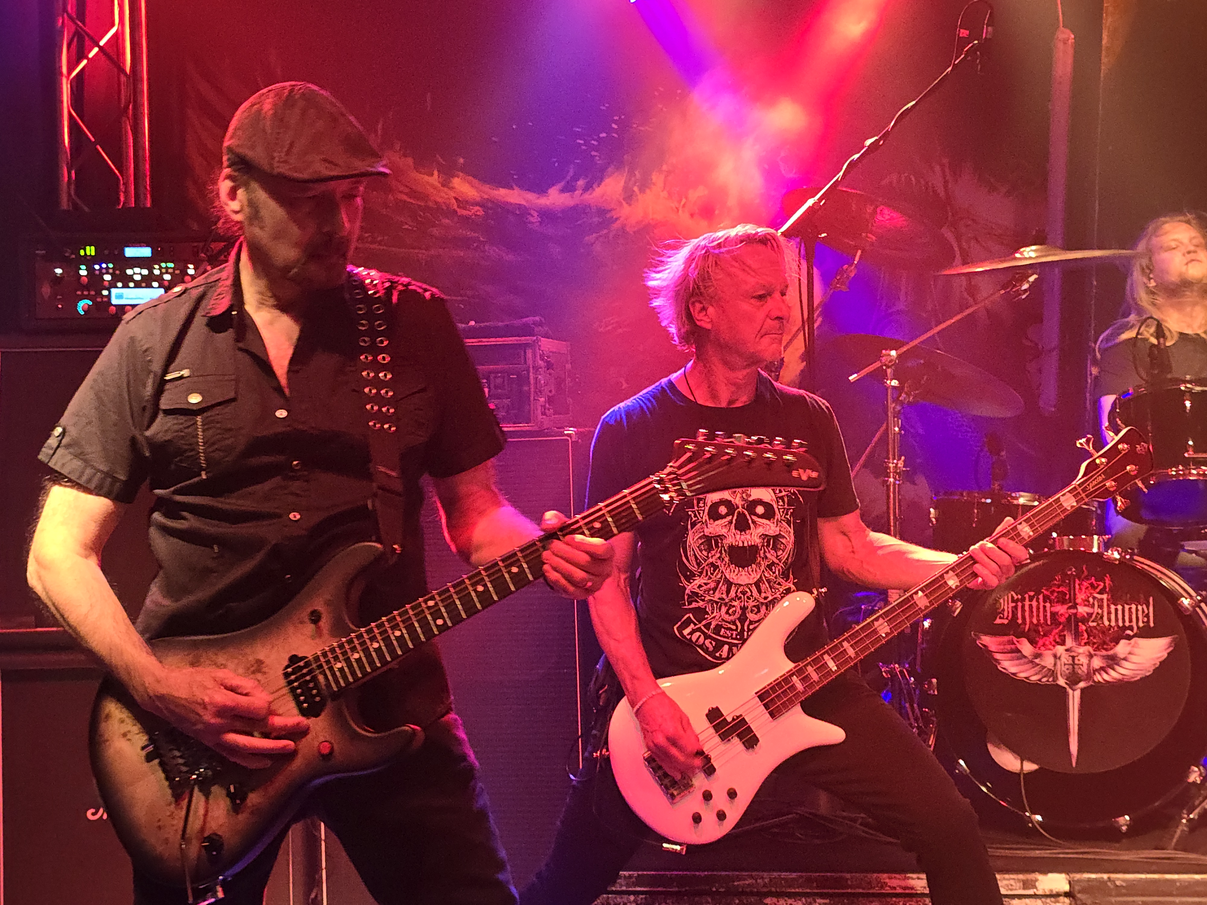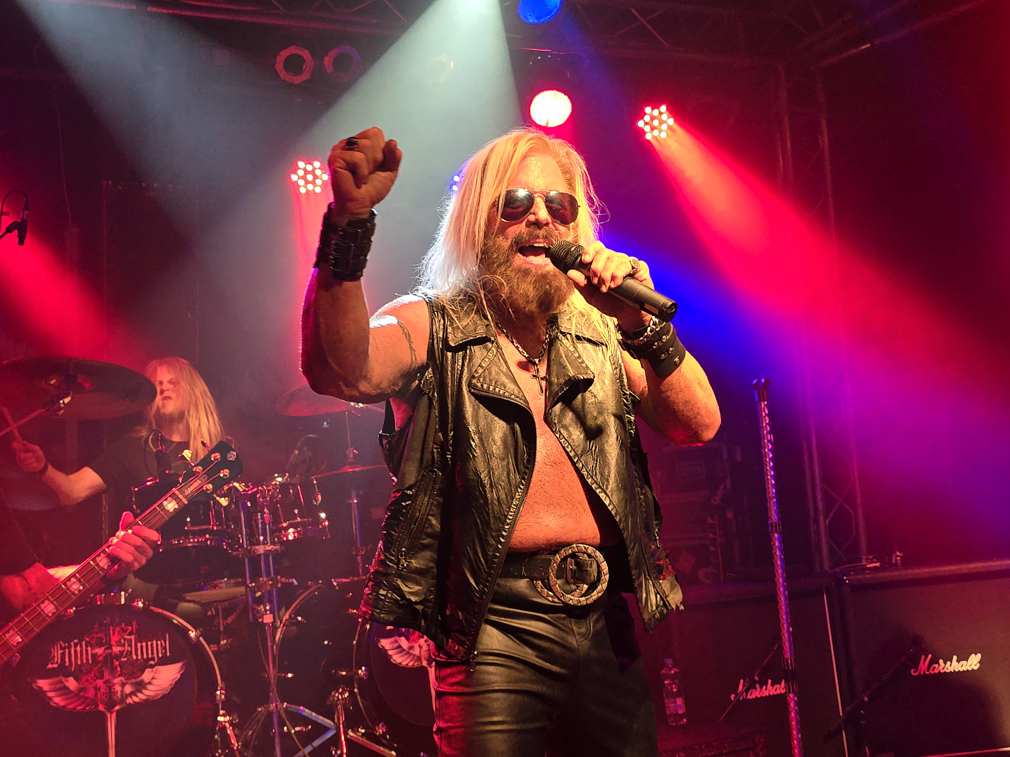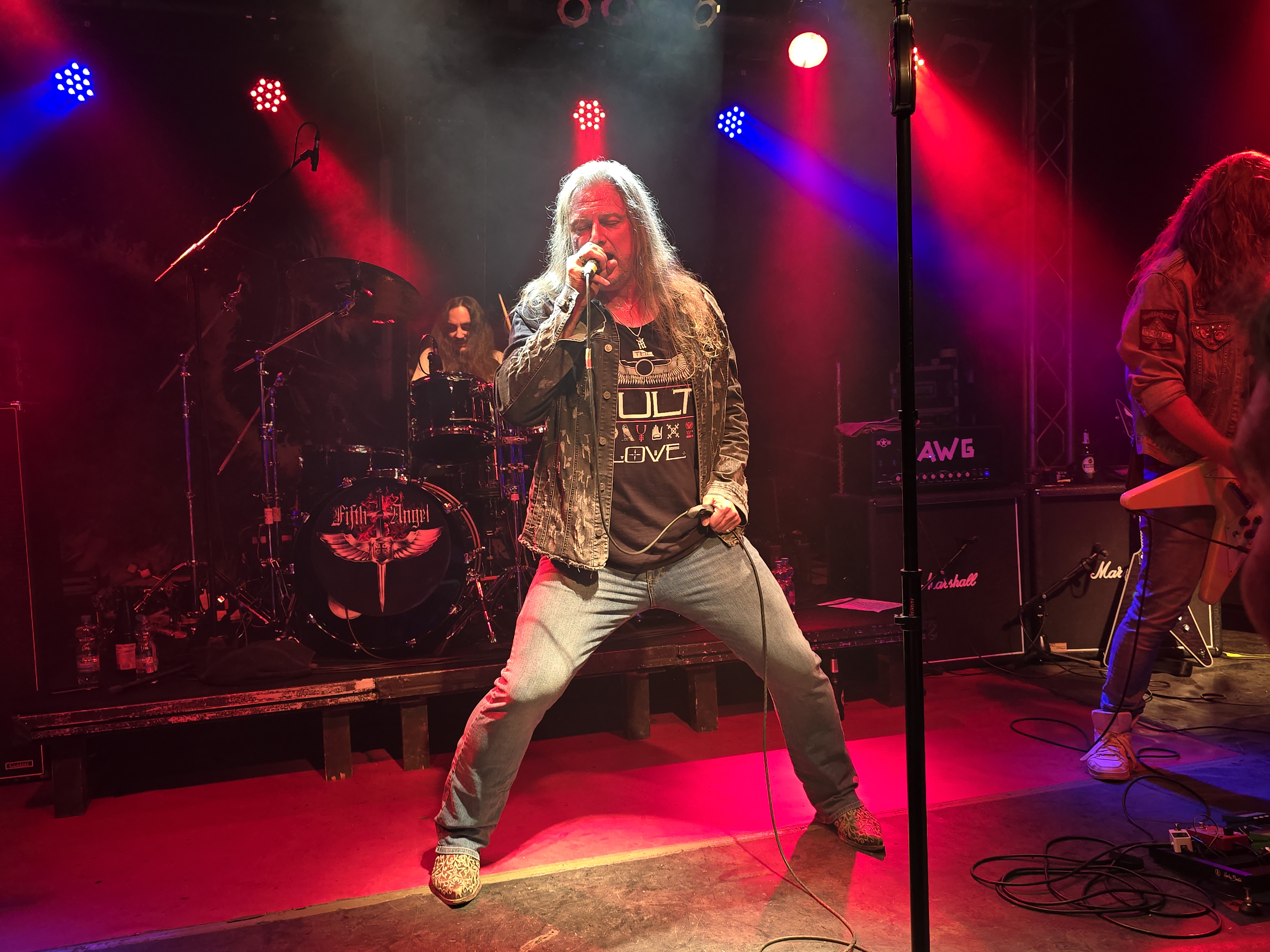 Nach einer weiteren Einlage des 7er Unikums Fisch stürmt die Hauptattraktion FIFTH ANGEL mit dem Debüt Klassiker „The Night“ die Bühne und geben von Sekunde Eins an Vollgas. A propos „Debüt“: diese wurde beinahe auf den Tag genau vor 38 Jahren veröffentlicht und bildet am heutigen Abend mit 7 Stücken den Schwerpunkt im Set der Amerikaner. Ein wenig Schade ist, dass Wunderdrummer Ken Mary aus privaten Gründen nicht mit von der Partie sein kann. Seinen Part übernimmt aber ebenso stark der junge Marco Prij, welcher Ken auch schon bei FLOTSAM & JETSAM temporär ersetzt hatte und so mit dessen Drumming bestens vertraut ist. Die restliche Band bestehend aus den Gitarristen Ed Archer und Ethan Brosh, Basser John Macko und Sänger Steven Carlson haben richtig Bock und sind sowohl virtuos, als auch agil. Der Spaß, denn die Jungs auf der Bühne haben überträgt sich auch sofort aufs Publikum und die Augen aller beginnen zu leuchten, als Großtaten wie „Shout It Out“, „Midnhight Love“, „Cry Out The Fools“ oder „Wings Of Destiny“ ertönen. Aber ich im Block mit drei Stücken des aktuellen und nicht unumstrittenen Albums „When Angels Kill“ ist kein Stimmungsabfall bemerkbar. Steven Carlson gelingt es die alten Stücke ziemlich originalgetreu rüber zu bringen und ihnen dennoch seinen eigenen Stempel aufzudrücken. Von der Saitenfraktion fällt besonders Bassist John Macko auf, welcher unermüdlich ackert und das Publikum als quasi zweiter Frontmann immer wieder animiert und anstachelt. Mit „Cathedral“ biegt man ins Schlussviertel ein bevor „Fifth Angel“, „We Rule“ und „Stars Are Falling“ den offiziellen Teil beenden. Nach einer kurzen Pause legen FIFTH ANGEL mit dem UFO-Cover „Lights Out“ nochmal nach. FIFTH ANGEL gehören immer noch zu absoluten Speerspitze des melodischen US Metal und wurden ihrem Ruf auch heute Abend mehr als gerecht. Hoffen wir, dass es keine weiteren 38 Jahre bis zur nächsten Tour dauern wird.