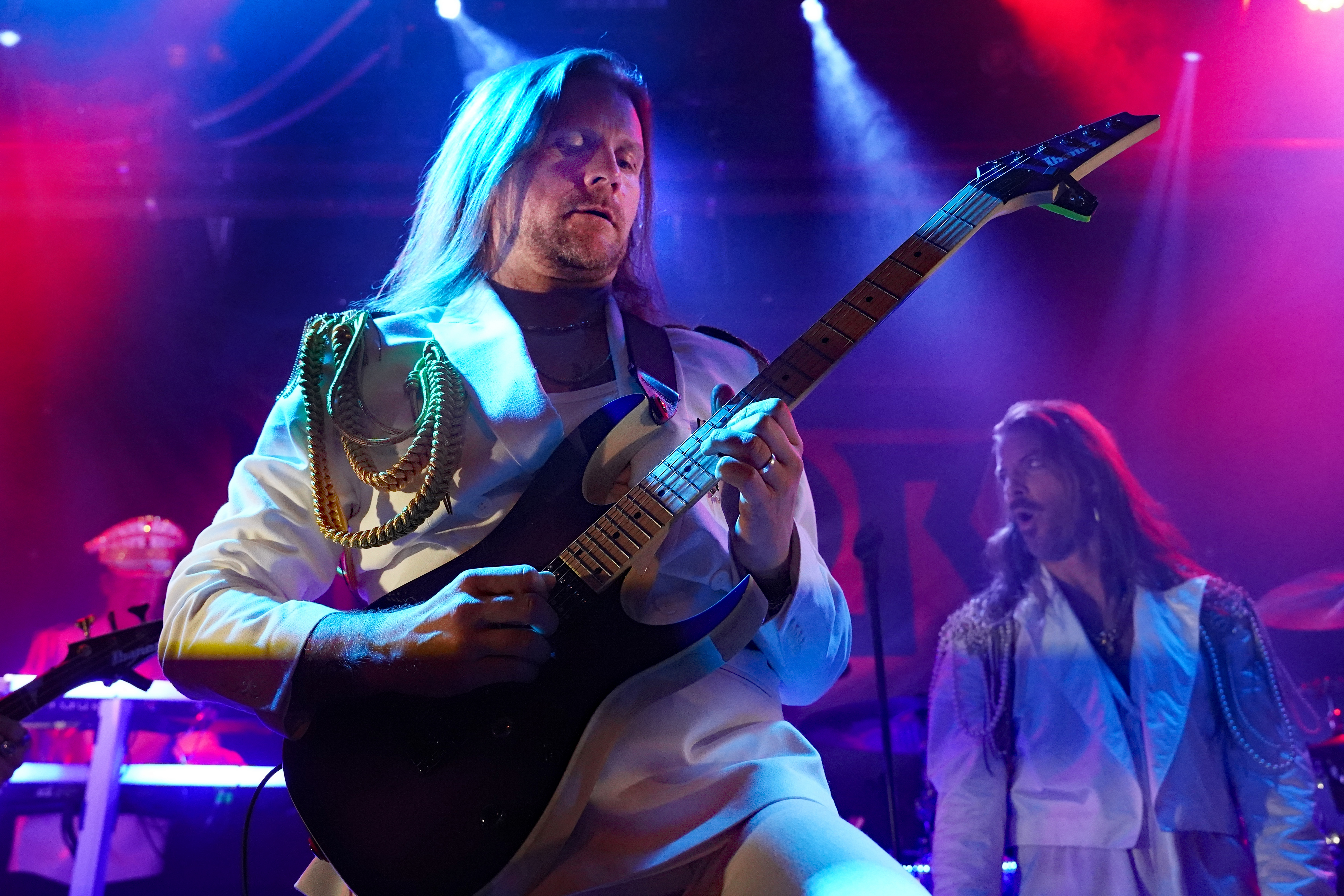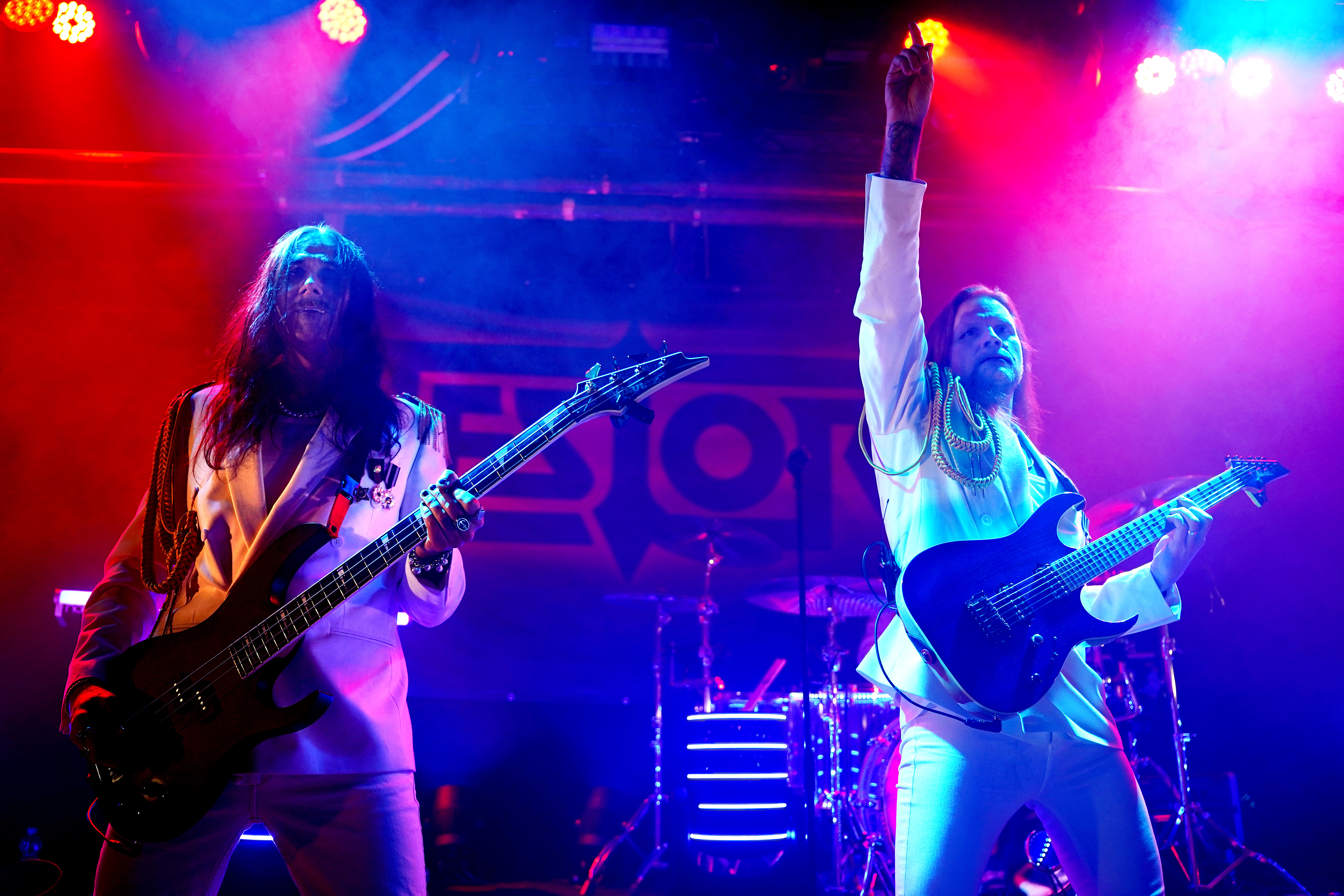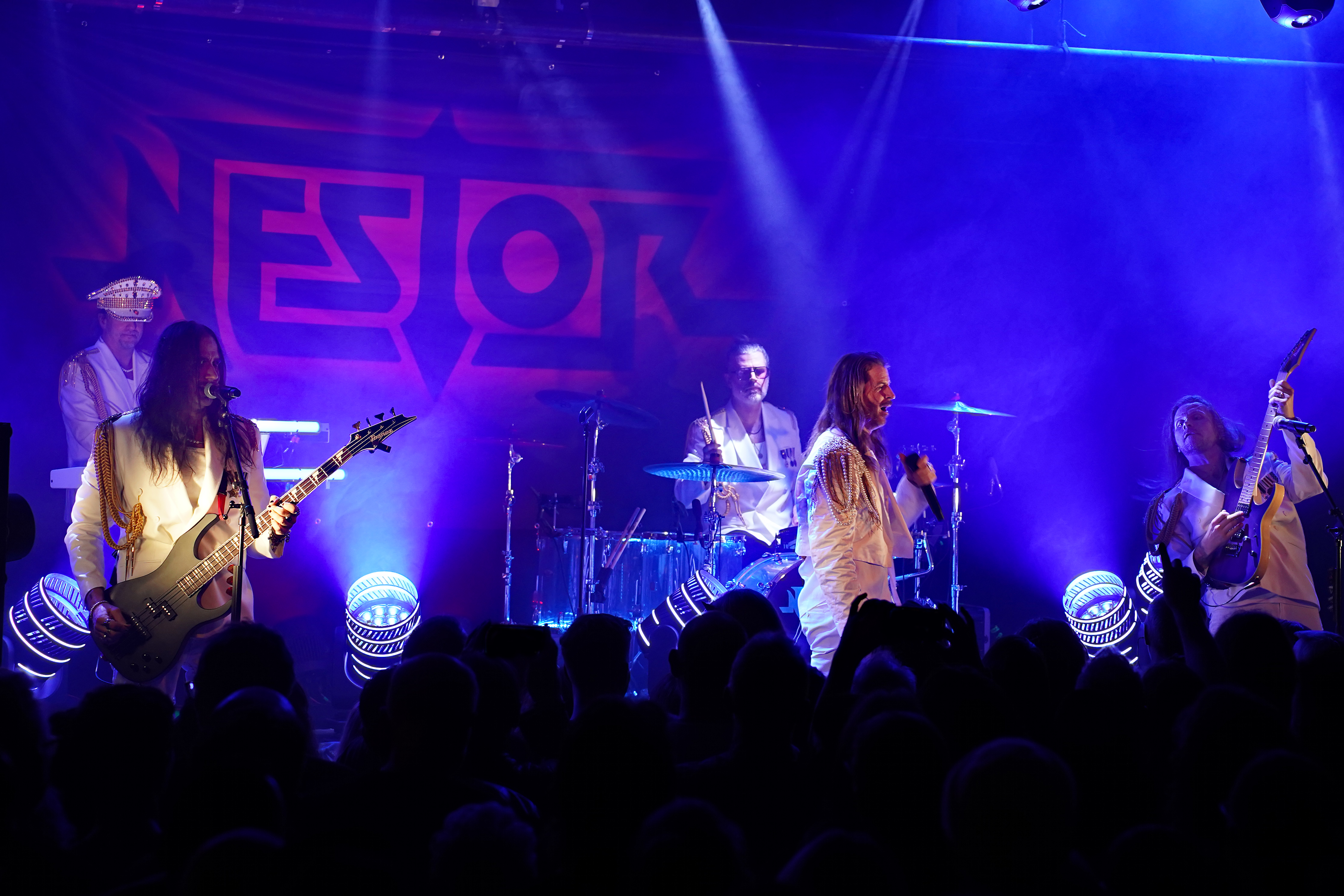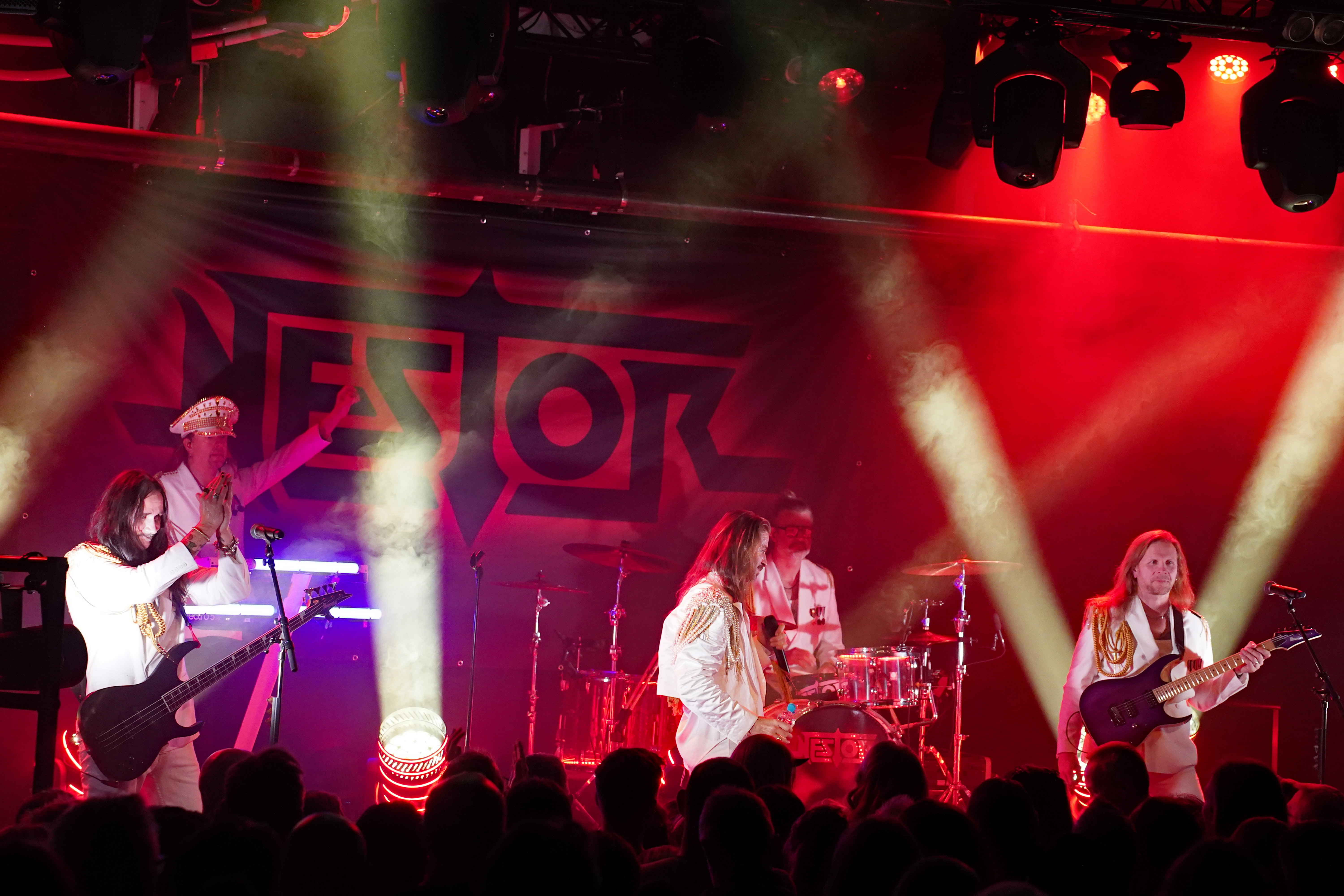 NESTOR starten mit "We Come Alive" ihren Gig. Der Sound ist transparent und druckvoll. Der Schweden-Fünfer ist komplett in weißer "Uniform" gekleidet, was mich ein wenig an ihre Kollegen vom NIGHT FLIGHT ORCHESTER erinnert und was ich ganz ehrlich etwas affig finde. Das verhindert aber nicht im geringsten die Freude, die im Auditorium entfacht wird. Zwei Alben haben NESTOR im Gepäck, und davon werden insgesamt 15 Nummern geboten, darunter die fast schon AOR Evergreens "Kids in a Ghost Town", "Victorious", "Caroline" und "1989". Die Bühnenshow ist visuell atmosphärisch und ansprechend, aber ein Headliner, der auch größere Hallen bespielen will, darf doch noch ein bis zwei Birnchen mehr einschrauben.