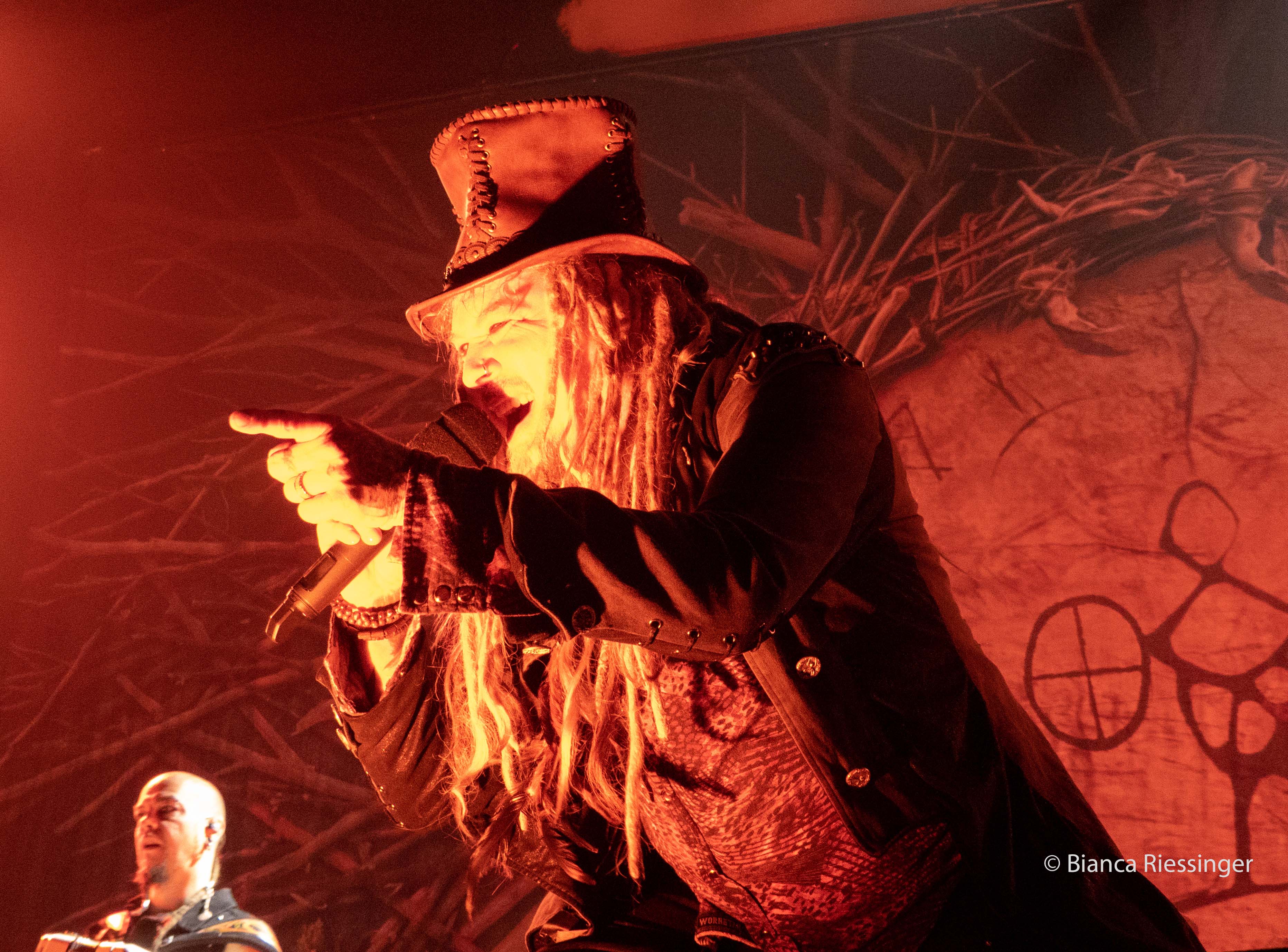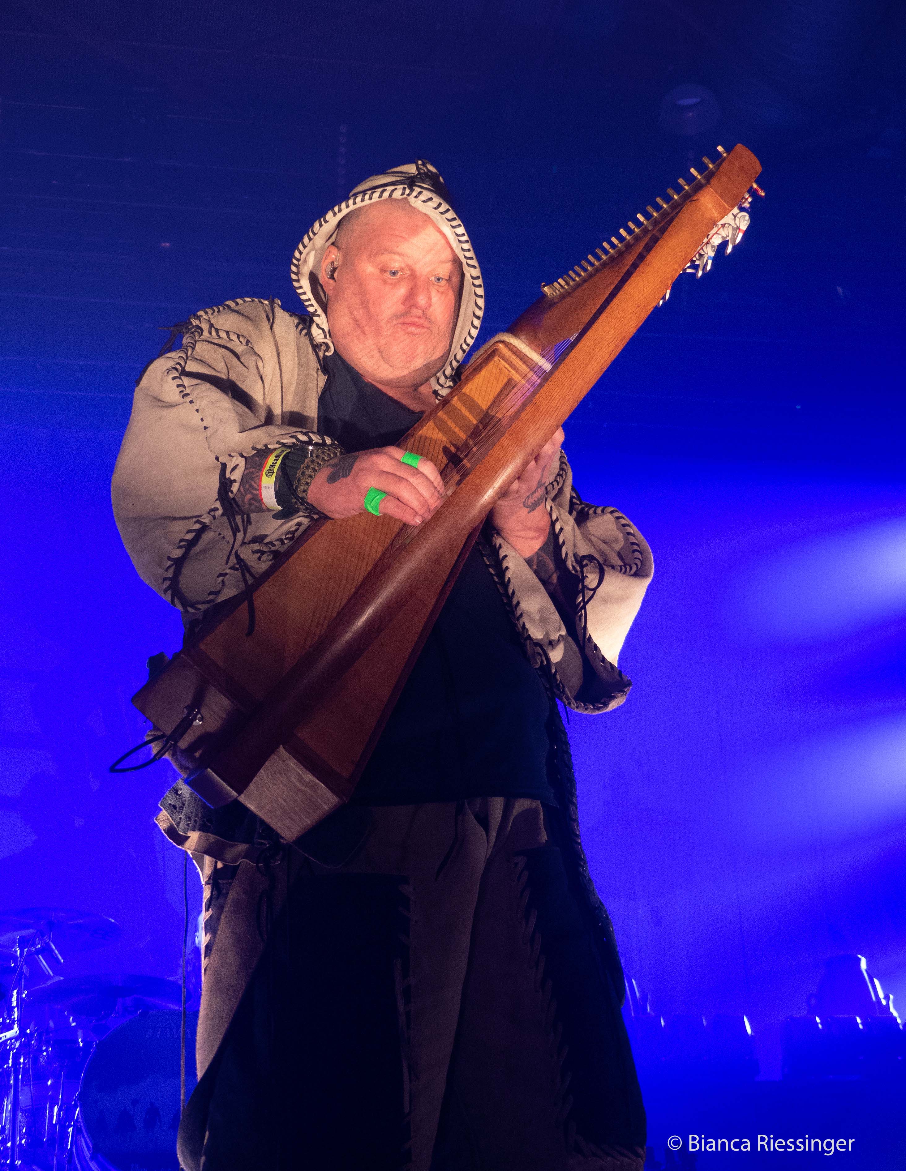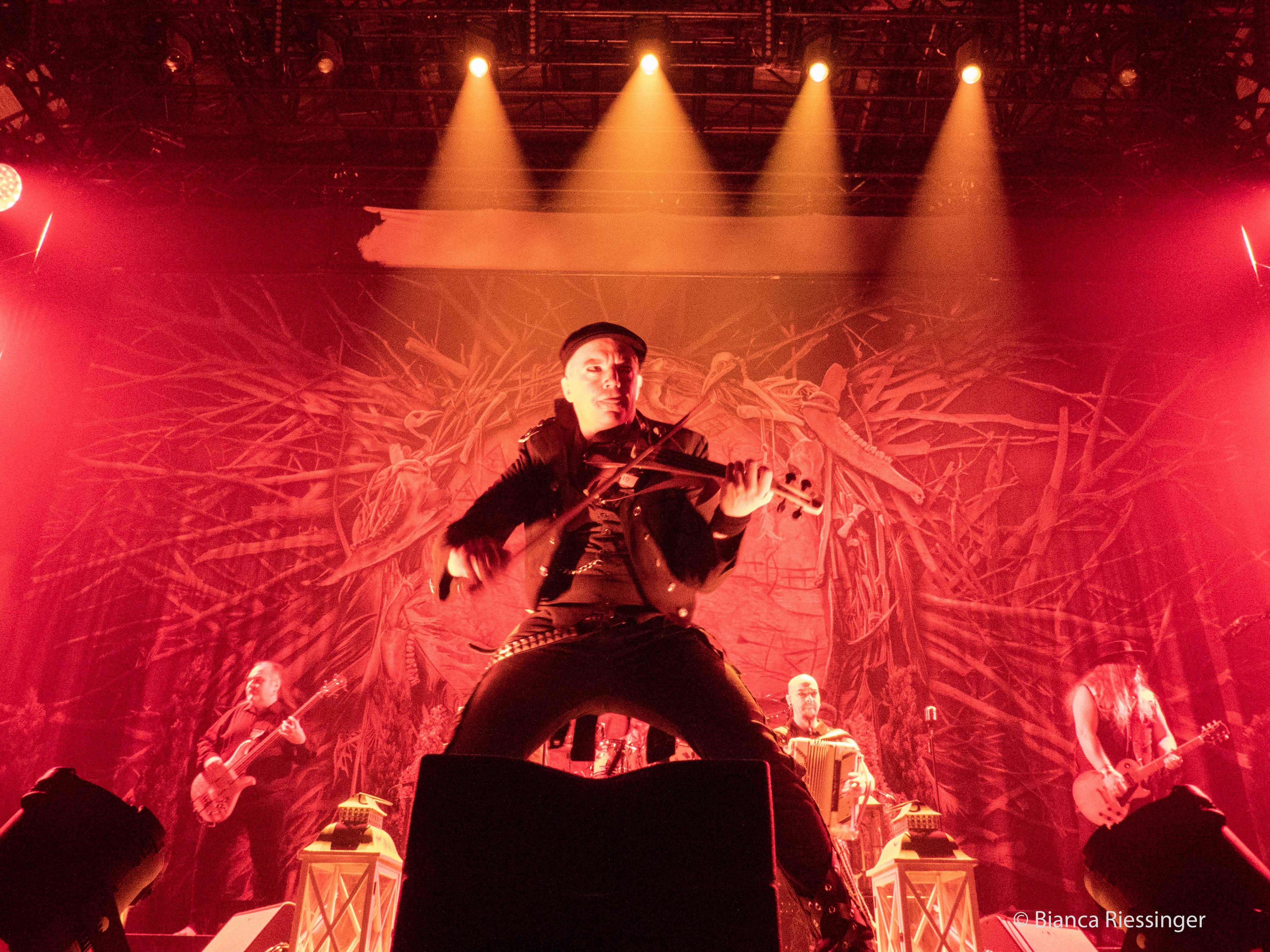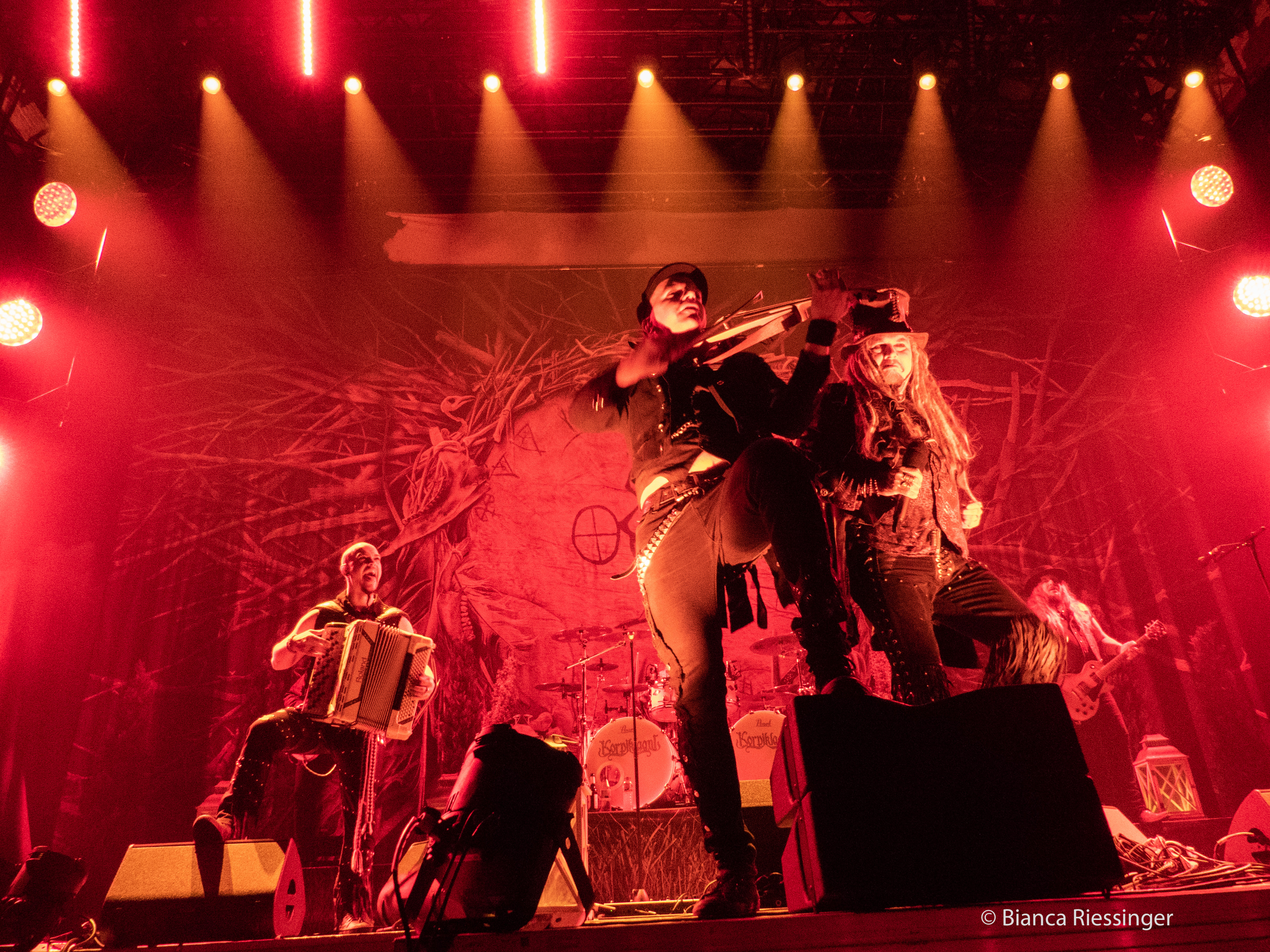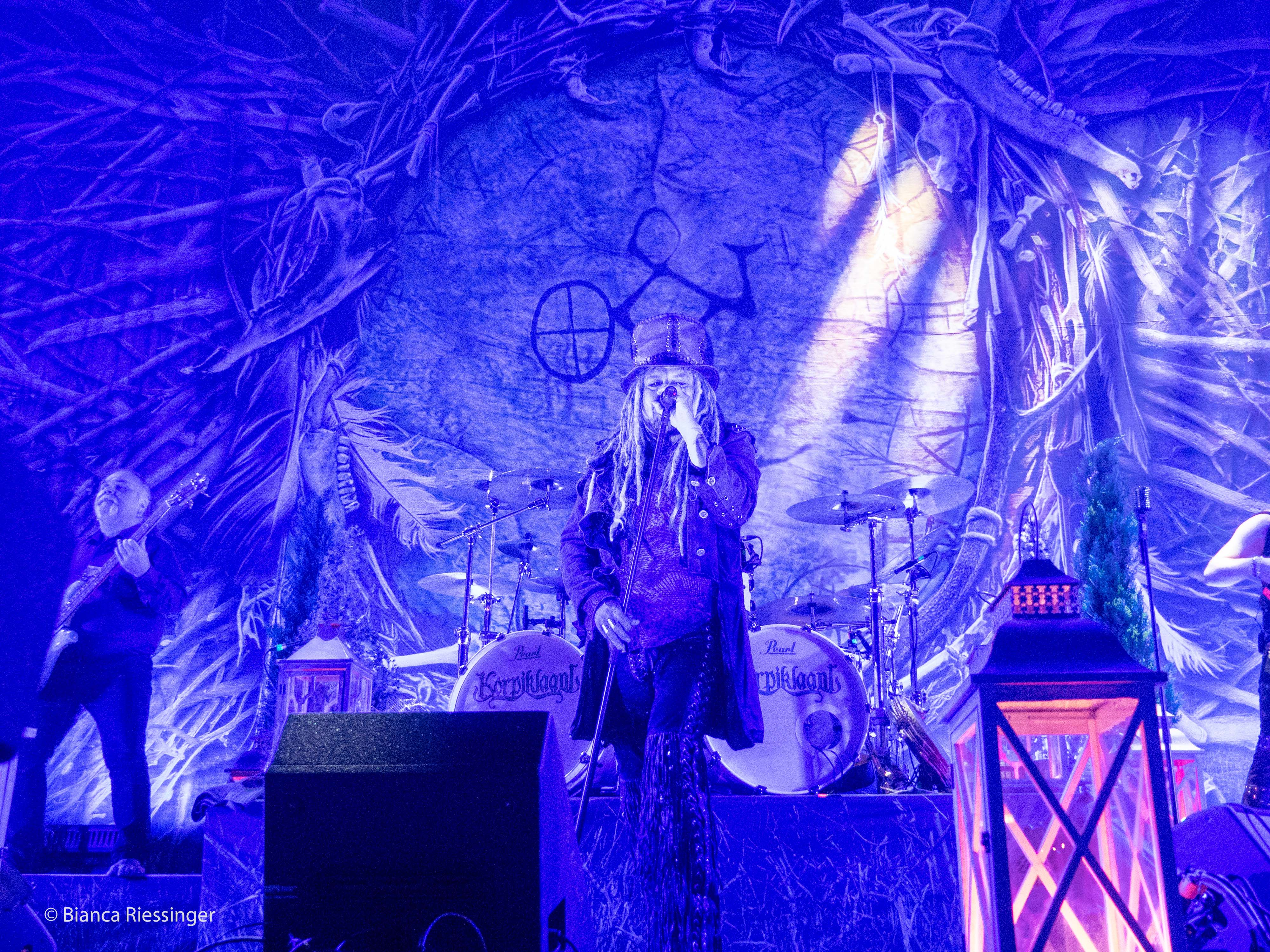 Eine etwa zwanzigminütige Umbaupause später, in der die Bühne mit Bäumen und Laternen stimmungsvoll in einen winterlichen finnischen Wald verwandelt worden war, ging es weiter mit Besuch aus dem hohen Norden: KORPIKLAANI gaben sich die Ehre. Das Sextett aus Lahti trat mit seiner einzigartigen Mischung aus teils schamanisch inspiriertem Folk Metal und finnischem Humppa direkt aufs Gas und verbreitete mit Songs wie „Man With A Plan“ und „Saunaan“ schnell Partystimmung. Sänger Jonne Järvelä, der wie eine Mischung aus Kobold, verrücktem Hutmacher und Jack Sparrow über die Bühne fegte, hatte das Publikum fest im Griff, auch wenn seine Ansagen über weite Teile eher unverständlich blieben. Das tat der Sache jedoch keinen Abbruch und sogar für unerwartete Lacher wurde gesorgt, als die Band „Barbra Streisand“ von DUCK SAUCE anspielte. Nach dem Bandklassiker „Vodka“ und einer knappen Stunde Spielzeit war dann Schluss und die Finnen räumten das Feld – aber nicht, ohne noch einmal einen großen Vorschussapplaus für IN EXTREMO einzufordern. Der wurde gerne gegeben, und Järvelä, der zuvor noch die Rampensau gegeben hatte, klang plötzlich erstaunlich schüchtern, als er sich am Ende bedankte und dem Publikum versicherte: „You are the best!“