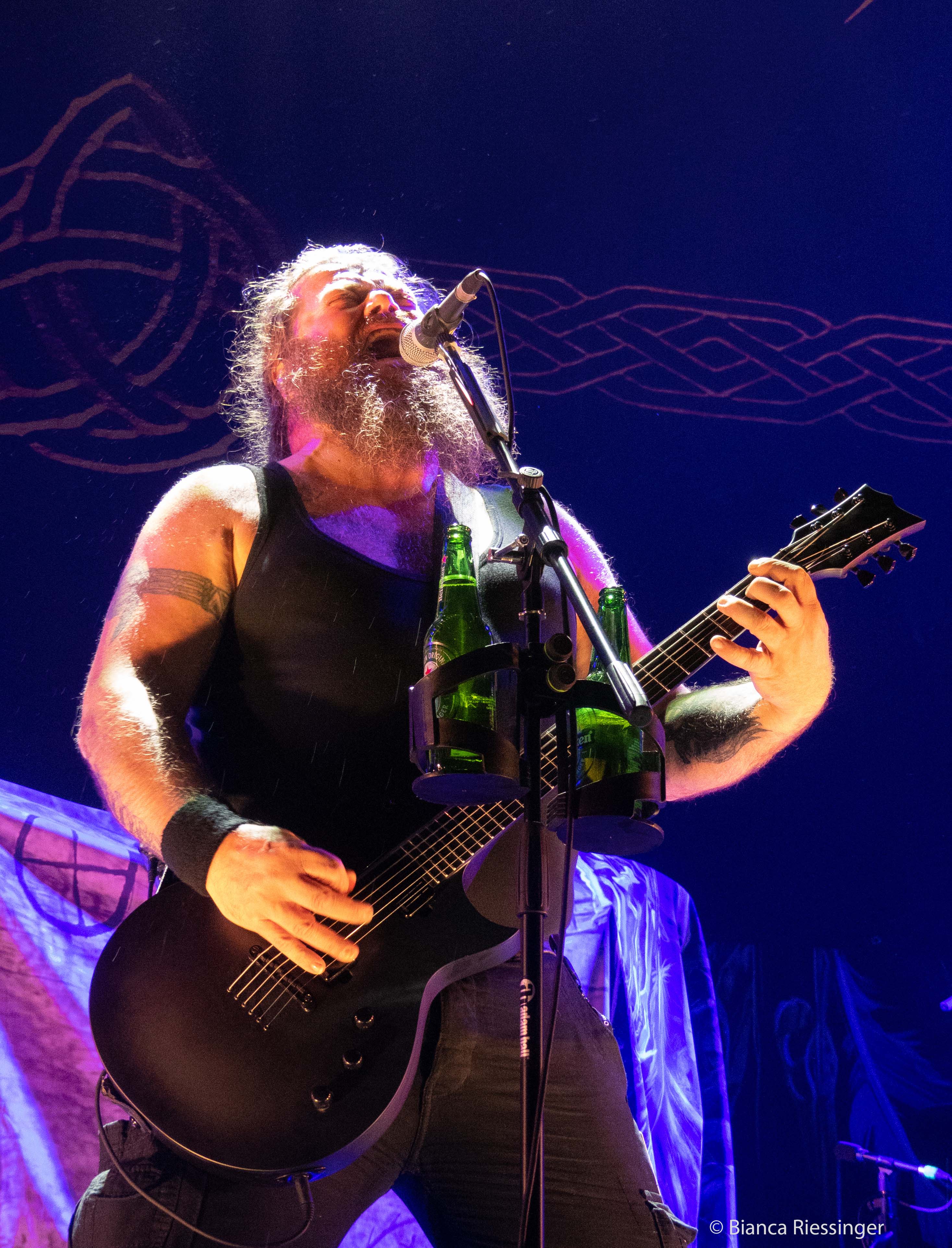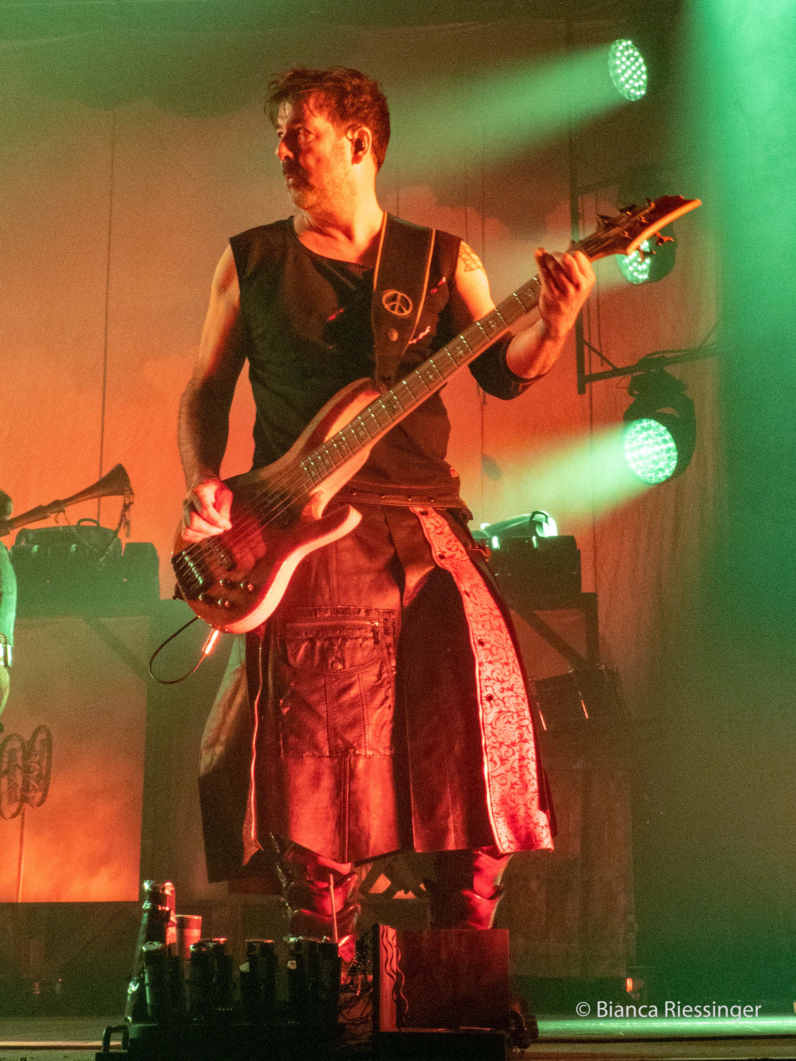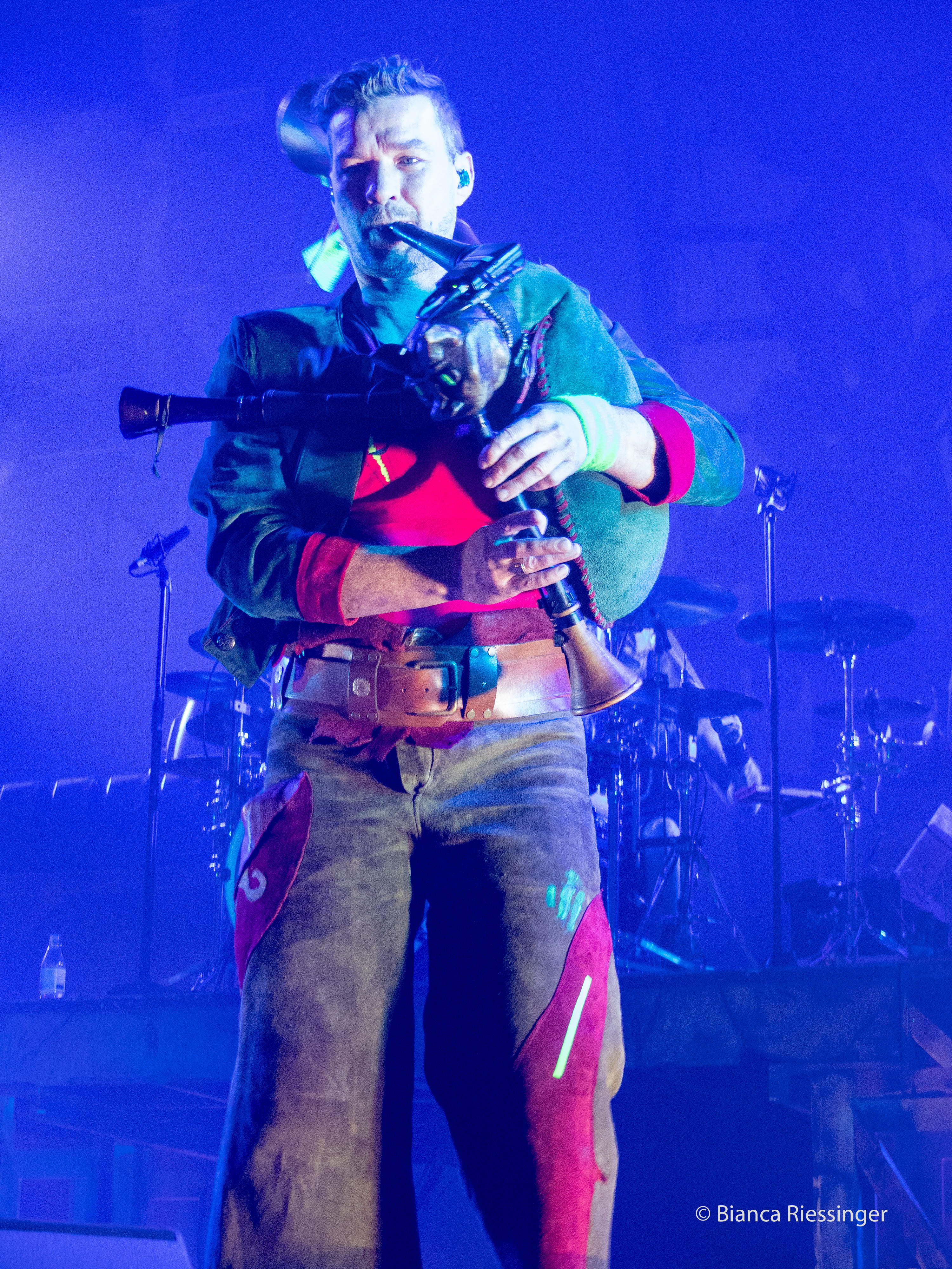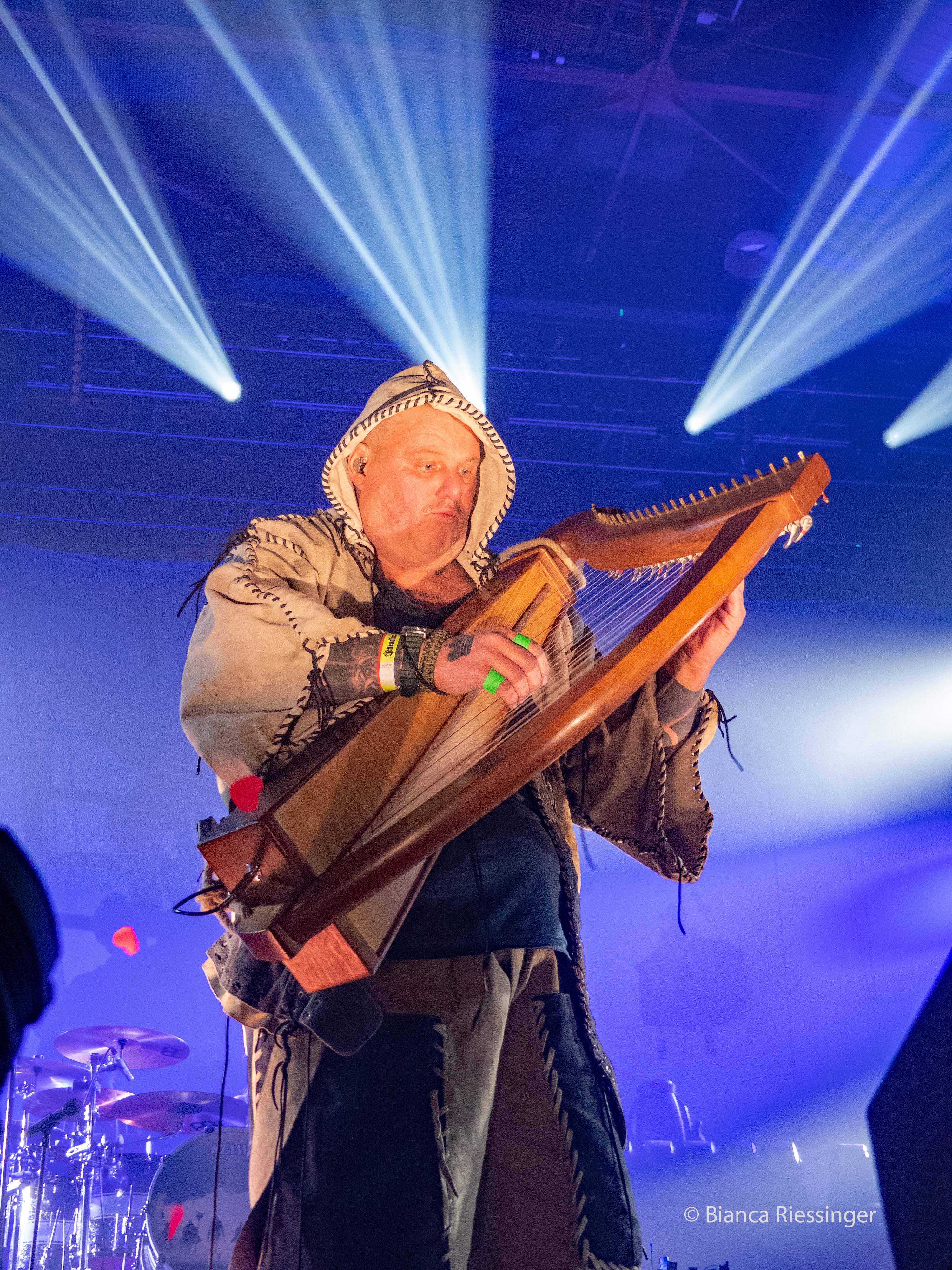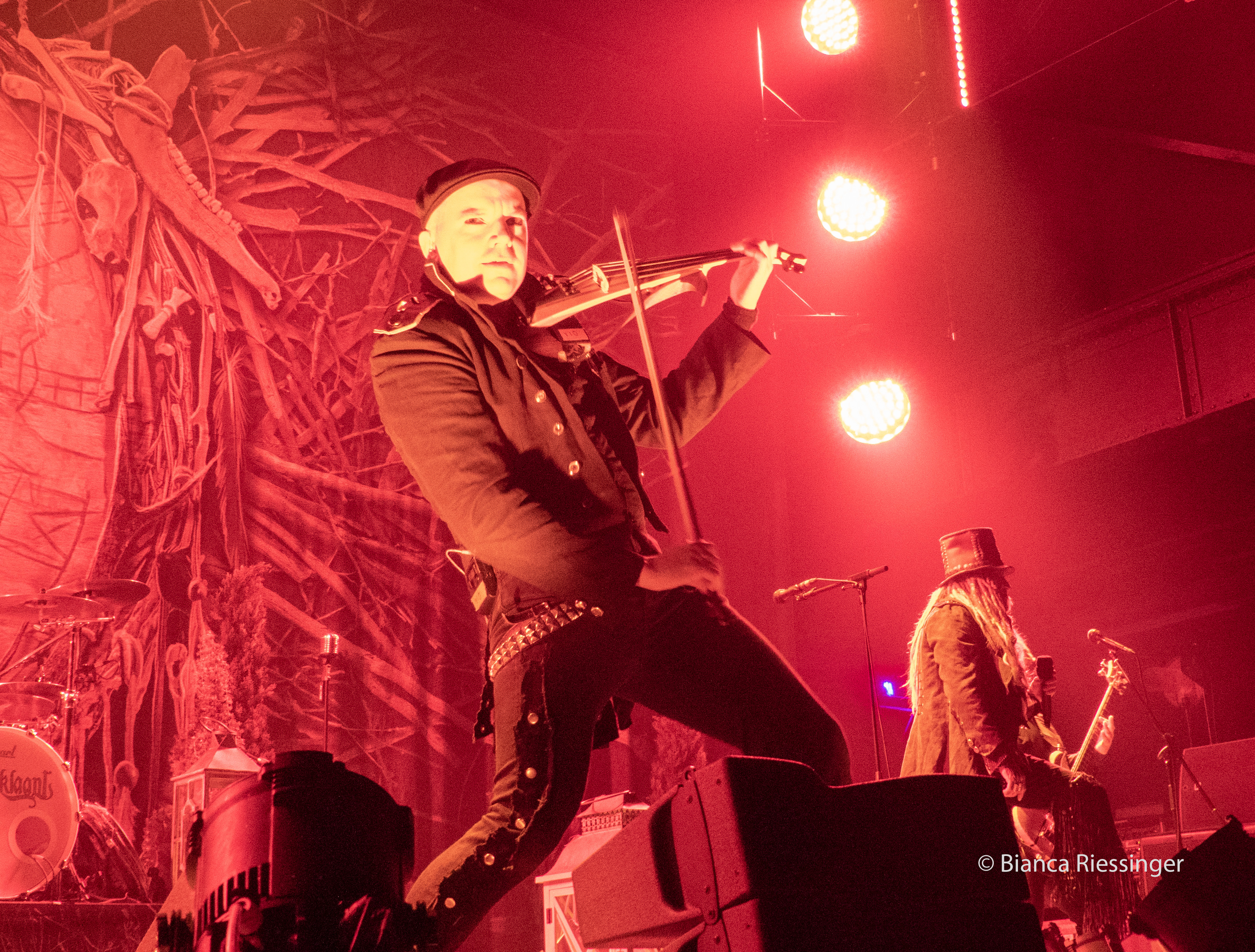 Eine etwa zwanzigminütige Umbaupause später, in der die Bühne mit Bäumen und Laternen stimmungsvoll in einen winterlichen finnischen Wald verwandelt worden war, ging es weiter mit Besuch aus dem hohen Norden: KORPIKLAANI gaben sich die Ehre. Das Sextett aus Lahti trat mit seiner einzigartigen Mischung aus teils schamanisch inspiriertem Folk Metal und finnischem Humppa direkt aufs Gas und verbreitete mit Songs wie „Man With A Plan“ und „Saunaan“ schnell Partystimmung. Sänger Jonne Järvelä, der wie eine Mischung aus Kobold, verrücktem Hutmacher und Jack Sparrow über die Bühne fegte, hatte das Publikum fest im Griff, auch wenn seine Ansagen über weite Teile eher unverständlich blieben. Das tat der Sache jedoch keinen Abbruch und sogar für unerwartete Lacher wurde gesorgt, als die Band „Barbra Streisand“ von DUCK SAUCE anspielte. Nach dem Bandklassiker „Vodka“ und einer knappen Stunde Spielzeit war dann Schluss und die Finnen räumten das Feld – aber nicht, ohne noch einmal einen großen Vorschussapplaus für IN EXTREMO einzufordern. Der wurde gerne gegeben, und Järvelä, der zuvor noch die Rampensau gegeben hatte, klang plötzlich erstaunlich schüchtern, als er sich am Ende bedankte und dem Publikum versicherte: „You are the best!“