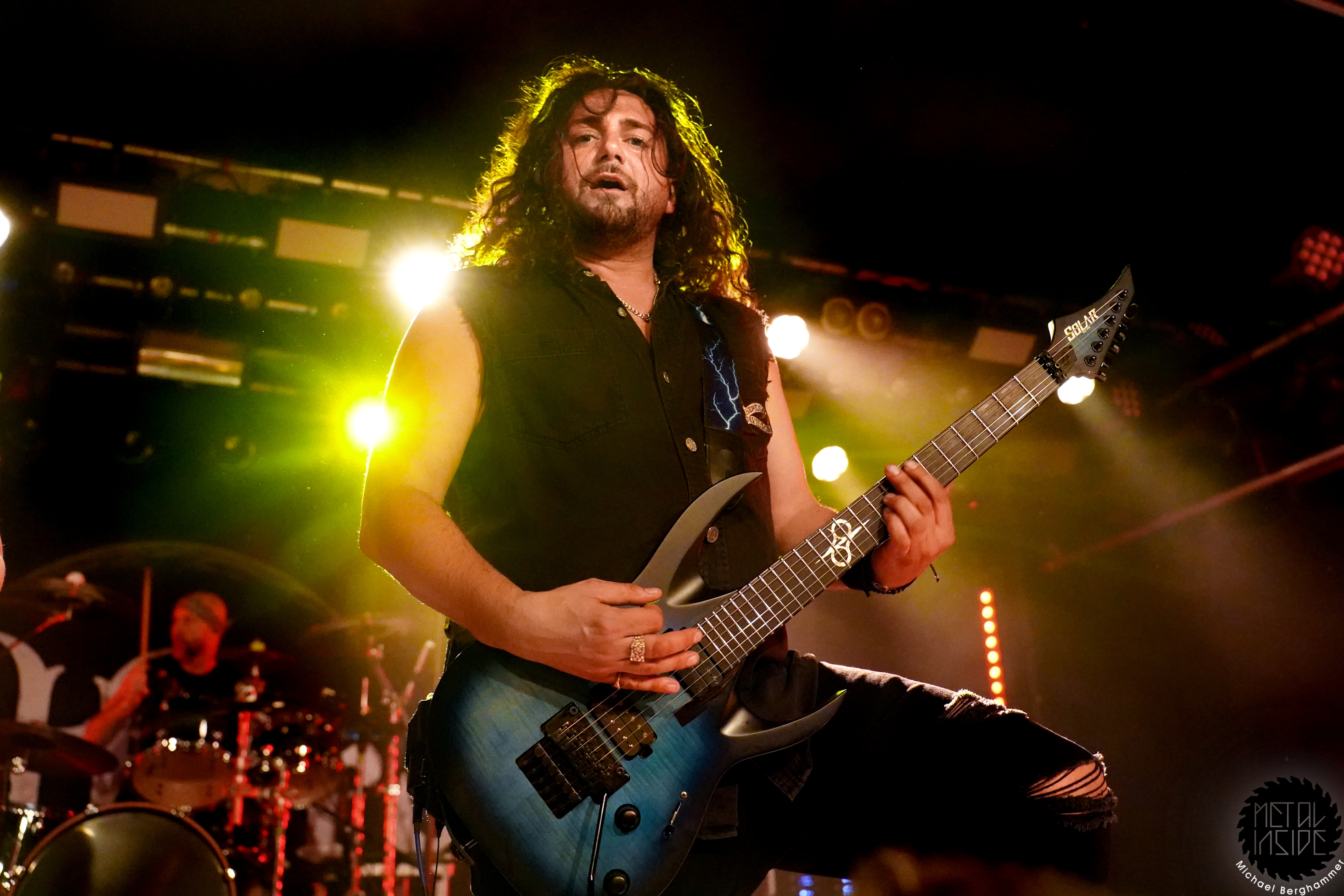 Dann betritt FROZEN CROWN Gitarrist Federico Mondelli die Bühne und erzählt von den Aufregungen der letzten Stunden und dass es bis eben noch nicht klar war, ob Jade es rechtzeitig zur Show schaffen würde. Man merkt ihm die Aufregung, aber auch die Sorge an, denn er verhaspelt sich öfters, was aber nur allzu verständlich ist, denn Jade ist nicht „nur“ die Sängerin seiner Band, sondern vor allem auch seine Ehefrau. Er wird das Thema im weiteren Verlauf des Abends noch mehrfach ansprechen, doch jetzt gibt es erstmal Entwarnung: Jade ist soeben eingetroffen und einer vollen FROZEN CROWN steht nichts mehr im Wege.