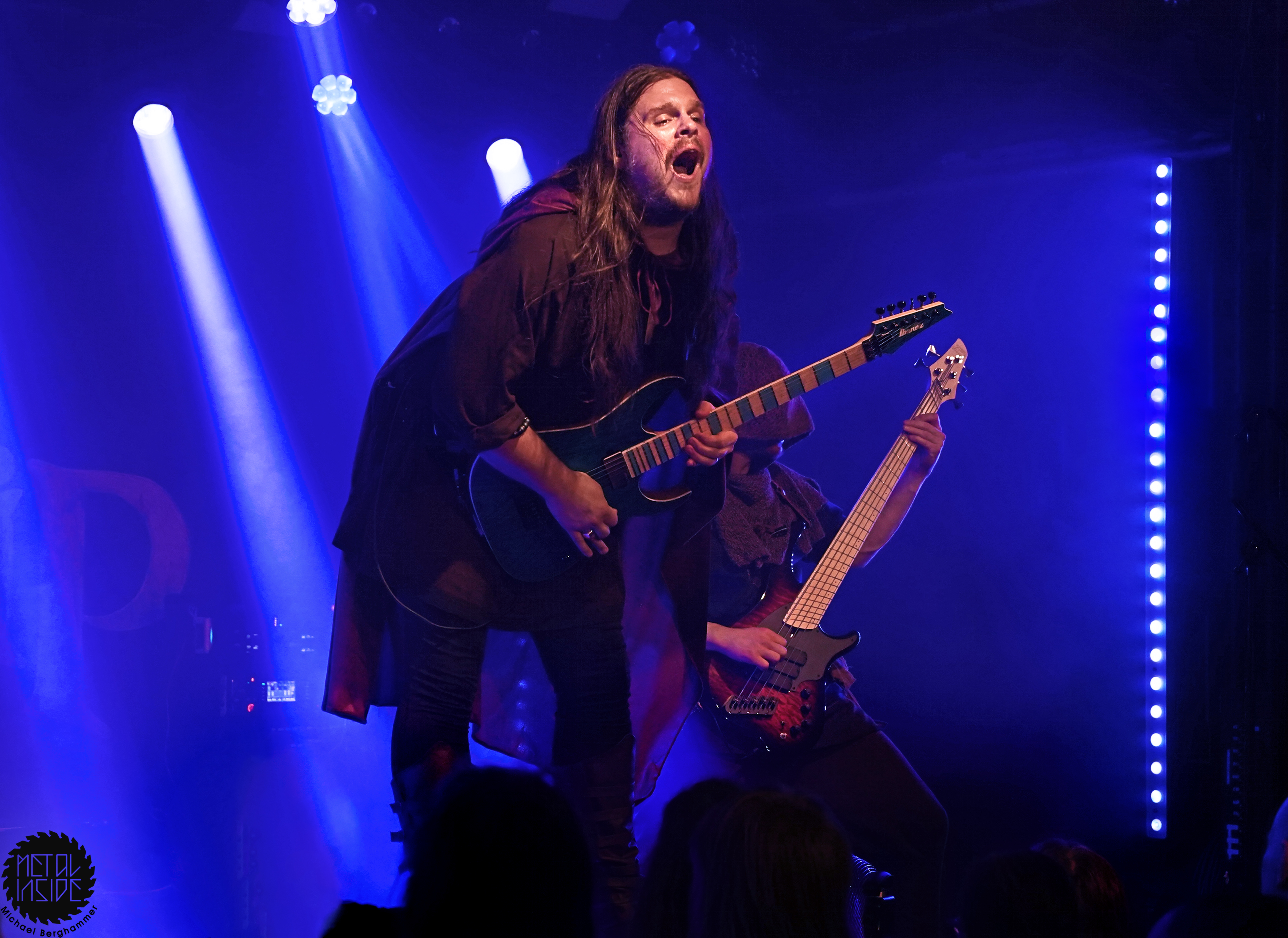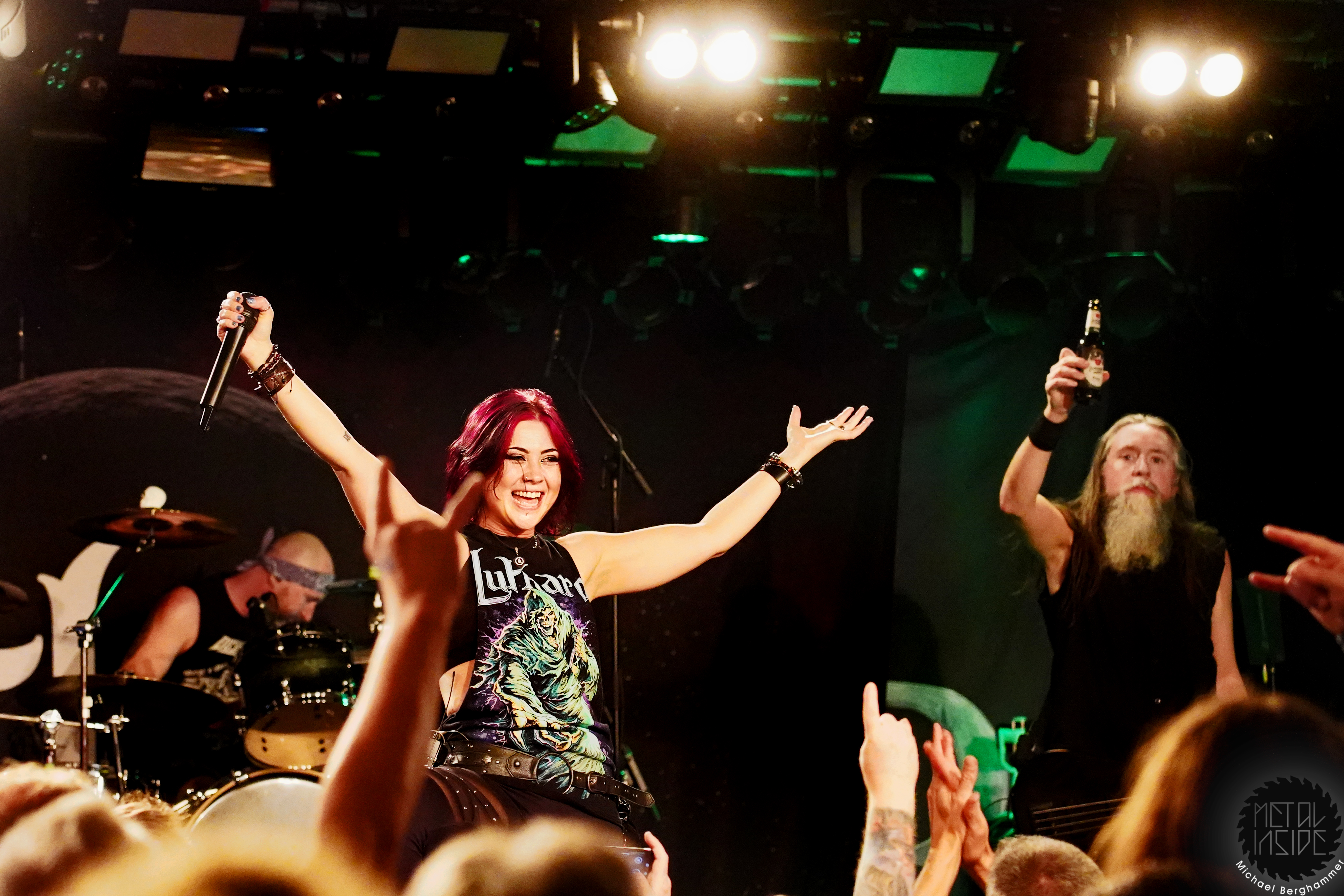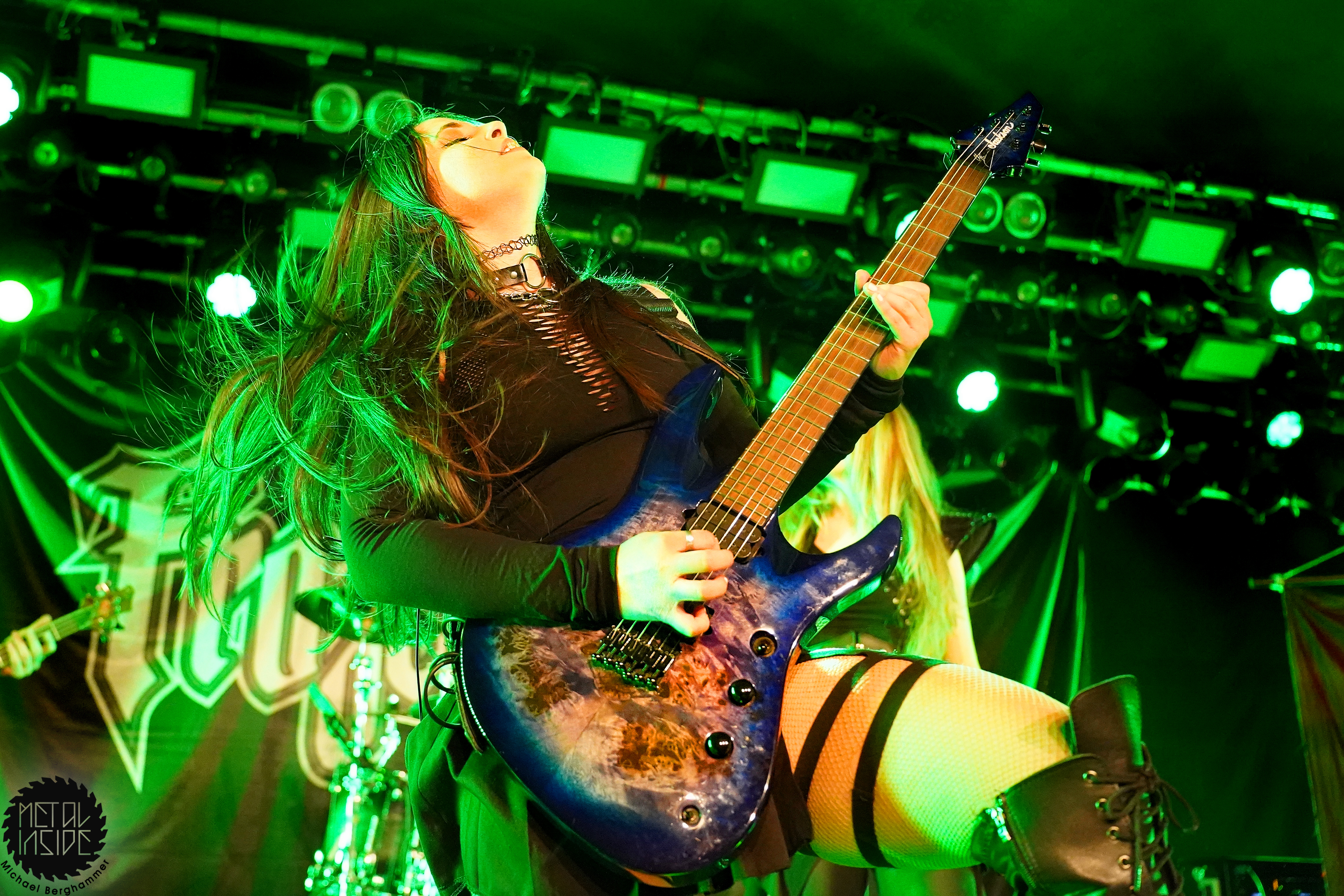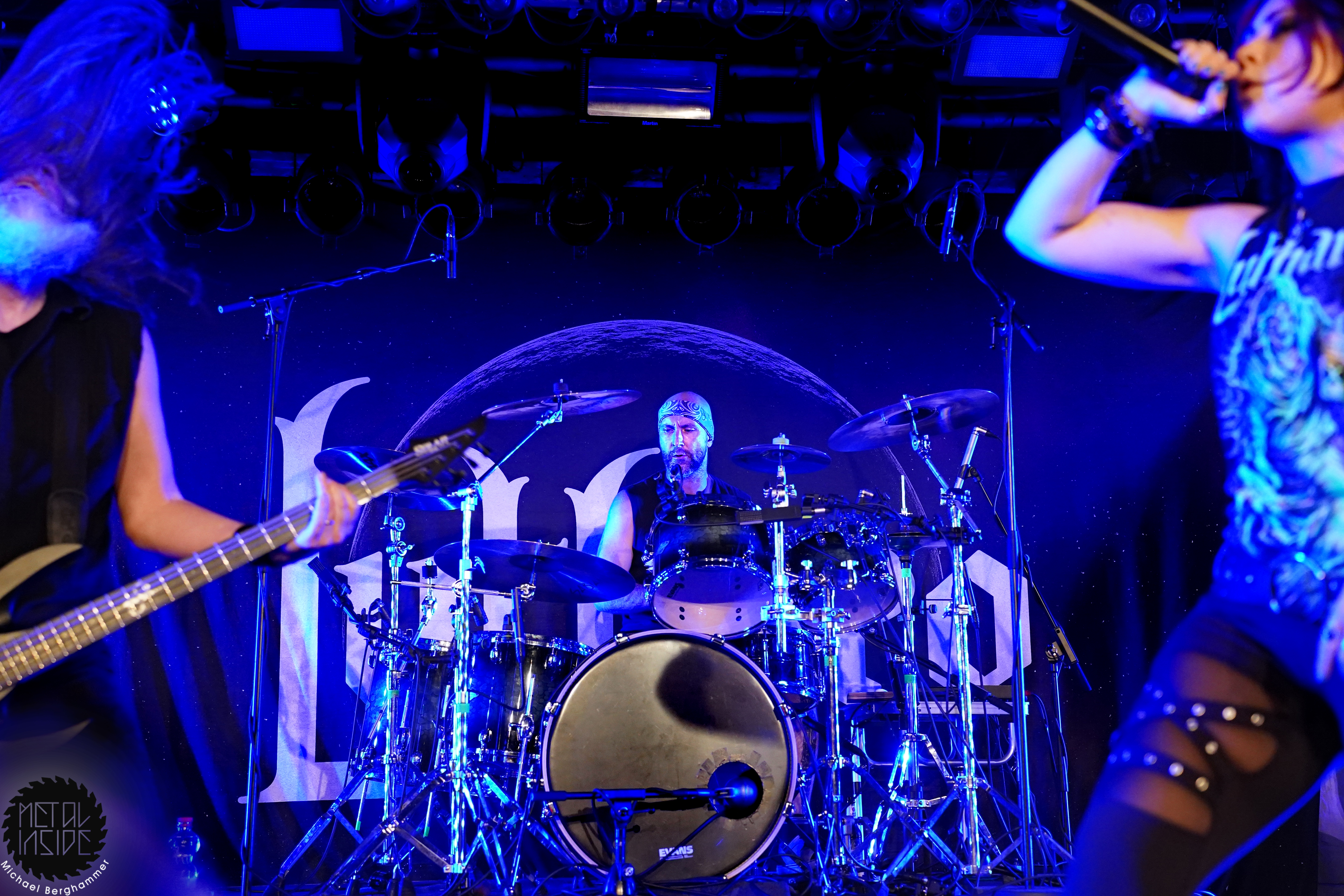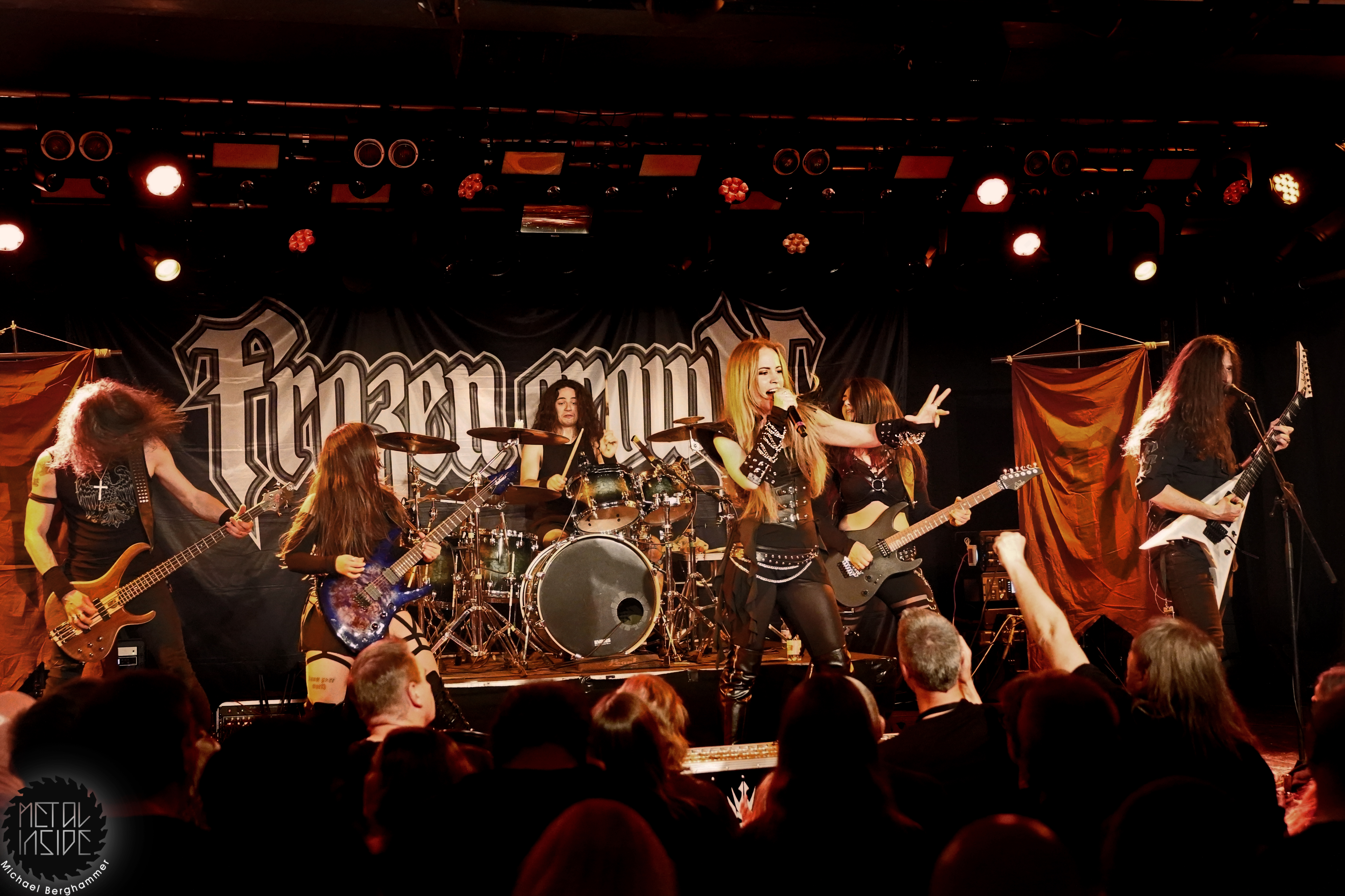 Mit dem Titelstück des aktuellen Albums „War Hearts“ geht’s auch gleich in die Vollen und das zum Sextett angewachsene Ensemble fühlt die Bühne nicht nur physisch aus. Die erst 19jährige neue Gitarristin Alessia Lanzone hat sich schon gut in die Band eingefügt und teilt sich das Rampenlicht fair mit den etablierten Sixtringern Federico Mondelli und Fabiola Bellomo. FROZEN CROWN nutzen den Vorteil ihrer Gitarrenarmee und füllen ihre Songs mit feinen und oft mehrstimmigen Harmonien und Soli. Aber über allem thront Sängerin Jade, die sehr authentisch und sympathisch erzählt, was ihr diese Tour und speziell dieser Auftritt bedeutet und gerade weil die Situation sie sichtlich mitnimmt, glaubt man ihr jedes Wort. Und die meisten anderen Bands hätten zumindest diese eine Show schlicht gecancelled. Meinen tiefsten Respekt dafür, dass sie es trotzdem durchgezogen hat. Weiter Höhepunkte stellen für mich die speedige Hymne „Steel And Gold“ (mit einer weiteren wunderbar chaotischen Ansage über „Metalle und Mineralien“; dieses Mal von Bassist Francesco Zof) und das emotionale „Ice Dragon“ dar. Letzteres wird einem verstorbenen Superfan gewidmet.