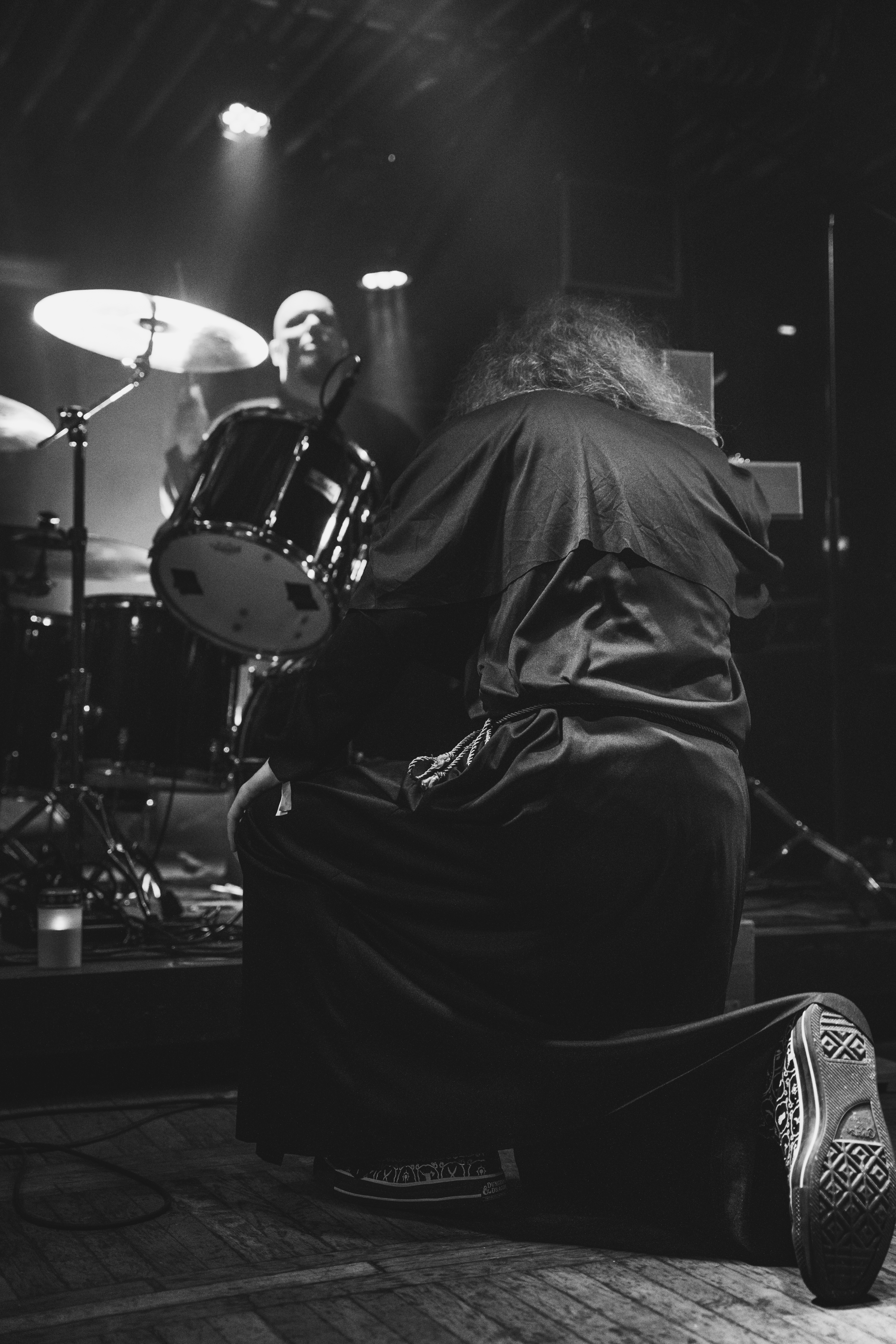 Nach dieser Demonstration der Düsternis lässt die kurze Umbaupause nur wenig Lust zum Atmen. Denn die Hamburger Kirchenkritiker FVNERAL FVKK bitten zum Gottesdienst. Nicht wie Non Deus Est mit stilechten Sandalen, aber in Mönchskutten gekleidet, hat Sänger Cantor Cinaedicus am Kreuz schwer zu tragen. Sonst nicht, denn federleicht dirigiert er die Menge mit ausladenden Gesten und einer tollen Stimme durch die geharnischte Kritik an abgrundtief verabscheuungswürdigen klerikalen Missständen. Da mit Vicarius Vespillo und dem stinkend-verkatertem Frater Flagellum zwei Ophisten die Rhythmus-Sektion befehligen, ist guter Drive selbstverständlich. FVNERAL FVKK sind wahrscheinlich am nächsten dran am traditionellen Doom der Marke Candlemass, bewiesen aber eindrucksvoll, dass Doom Death auch mit klaren Vocals sehr gut funktionieren kann. Amen.