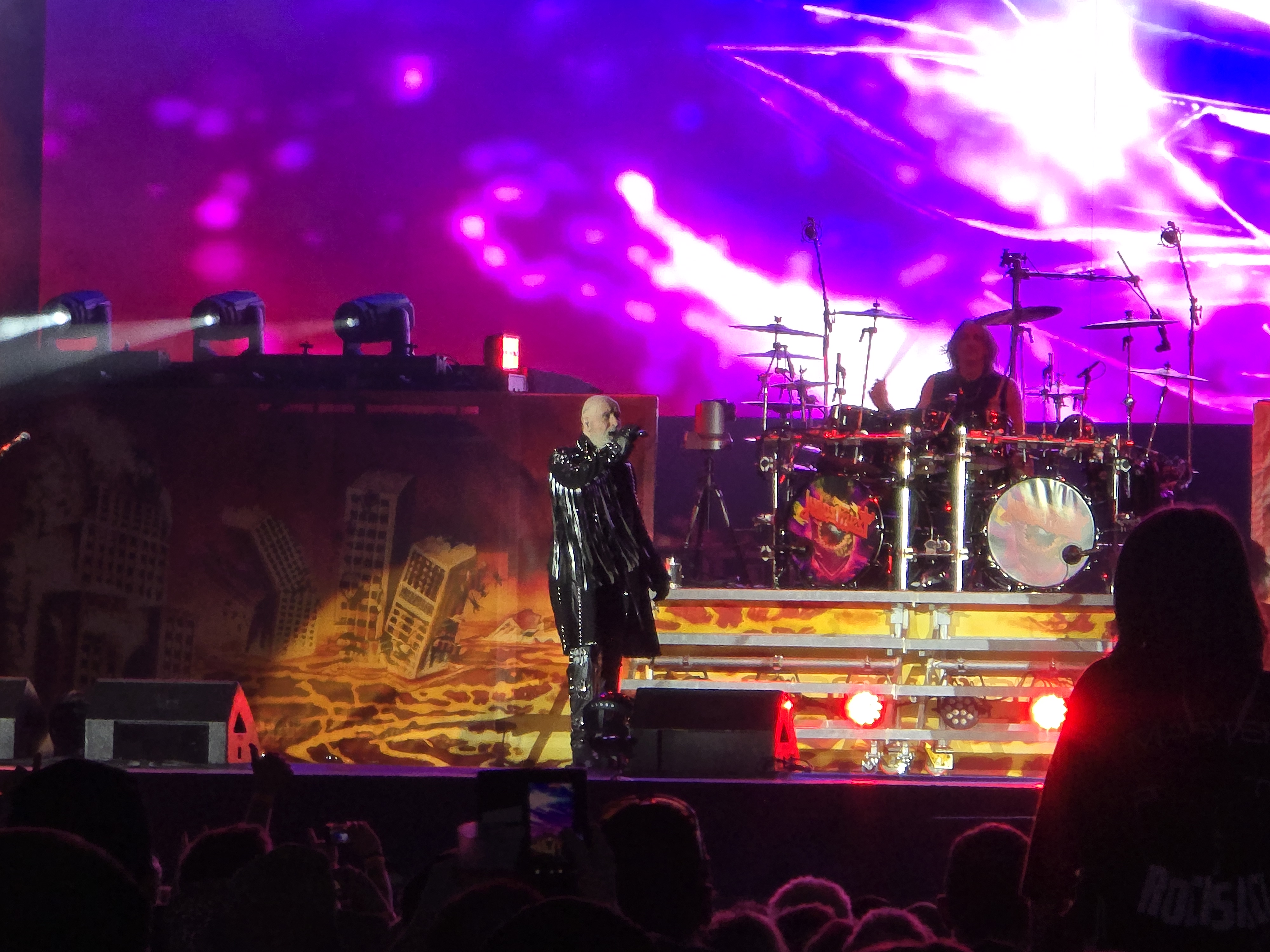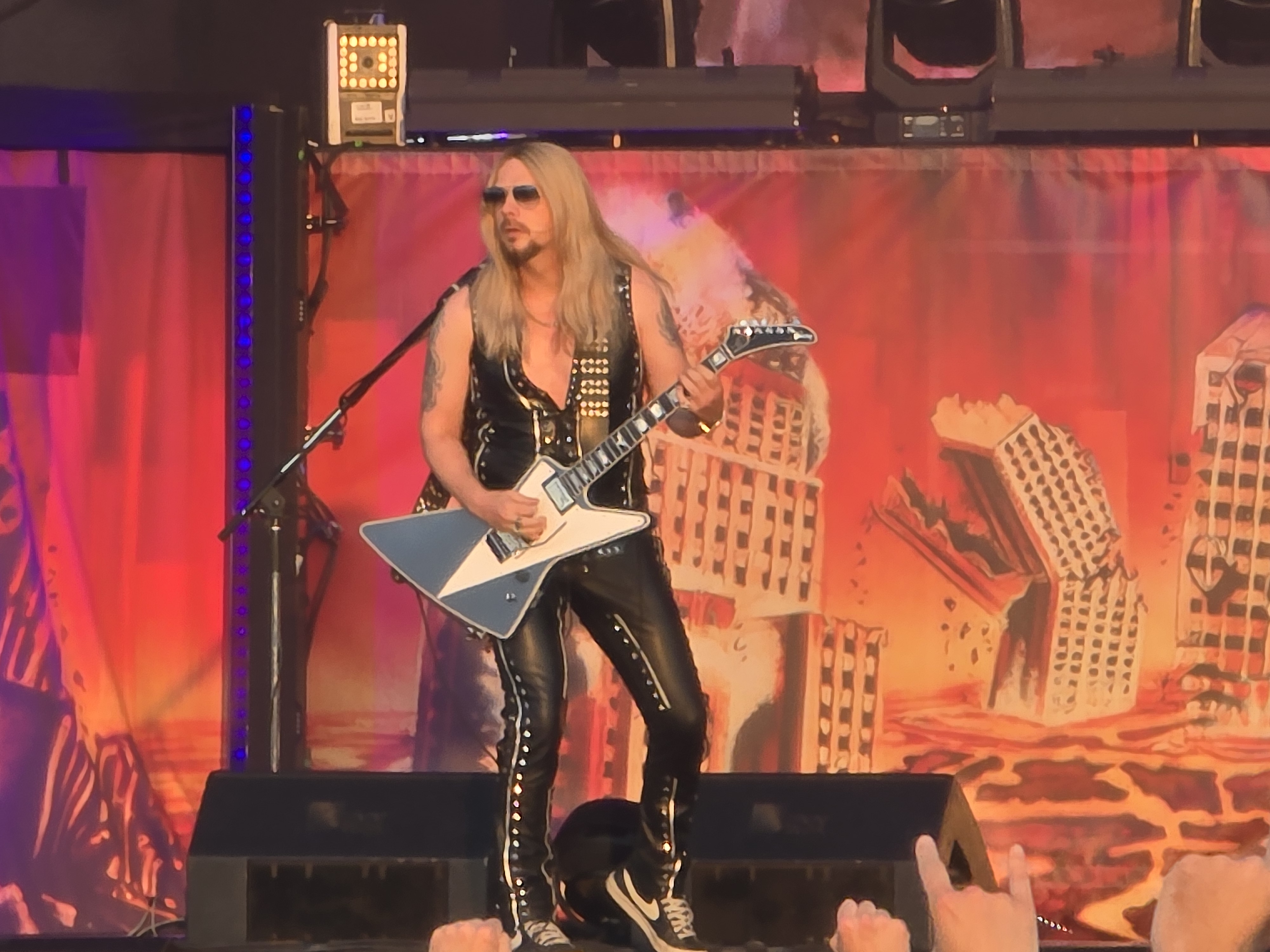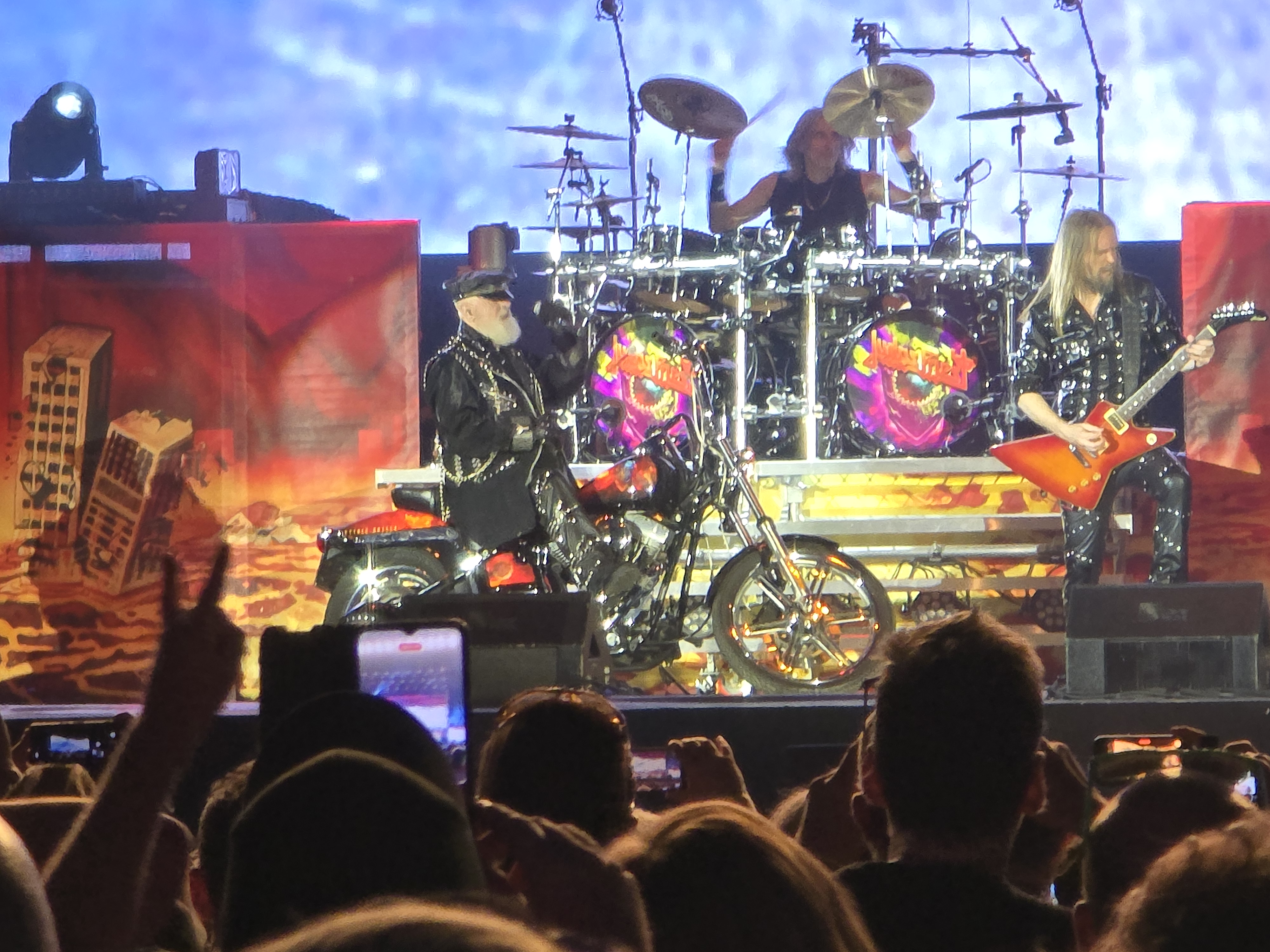 Mit „All Guns Blazing“ starten JUDAS PRIEST fulminant in ihren sehr „Painkiller“ lastigen Set und lassen von Beginn an keinen Zweifel aufkommen, auf wessen breiten Schultern sich die Musik, die wir alle so lieben, begründet. Der fast 74-jährige Frontmann Rob Halford scheint in einen Jungbrunnen gefallen zu sein. Er ist agiler, klebt nicht mehr so sehr am Teleprompter und überzeugt mit der besten Gesangsleistung seit Jahrzehnten. Ich habe Rob in den letzten 25 Jahren doch einige Male gesehen und durchaus auch tolle Auftritte erlebt, aber hier und heute ist es wirklich next Level. Faulkner und der wieder behaarte Andy Sneap haben sich zu einem tollen Gitarren-Duo gemausert und können die übergroßen Fußstapfen von Tipton/ Downing zwar nicht ganz, aber doch in beeindruckendem Maße ausfüllen. Im Gegensatz zu vielen anderen altgedienten Herrschaften ruhen sich JUDAS PRIEST nicht aus und überraschen auch immer wieder mit Songs, die keiner auf dem Zettel hatte. Neben diversen „Painkiller“ Songs wie zum Beispiel „Between The Hammer And The Anvil“, „One Shot At Glory“ oder „Hell Patrol“ überraschen mich vor allem „Solar Angels“ oder „Judas Rising“. Da darf dann auch gerne mal ein „Victim Of Changes“ oder ein „Green Manalishi (With The Two Pronged Crown)“ fehlen. Der Sound ist fett und Robs Gesang erfreulich effektfrei. Neben der makellosen musikalischen Darbietung überzeugen auch das Bühnenbild und die großen, teils mobilen bzw. teilbaren Leinwände, auf denen entweder die Musiker oder zu den Songs passende Animationen zu sehen sind. Volle 20 Songs hauen uns JUDAS PRIEST um die Ohren, und zwar im Dauerfeuermodus. Es gibt nur einige kurze Ansagen, keine überflüssigen Soli, sondern einfach nur Song auf Song und die Menge liebt es. Der Zugabeblock besteht aus „Hellion/Electric Eye“, „Hell Bent For Leather“ (natürlich mit Motorrad) und dem unverwüstlichen „Living After Midnight“. Auch wenn es danach für heute zu Ende ist, flimmert eine wichtige Botschaft weithin sichtbar über die Leinwände: „The PRIEST will be back“. Man kann es nur hoffen, denn dieser Form sind Rob Halford und Co. nach wie vor eine Macht.