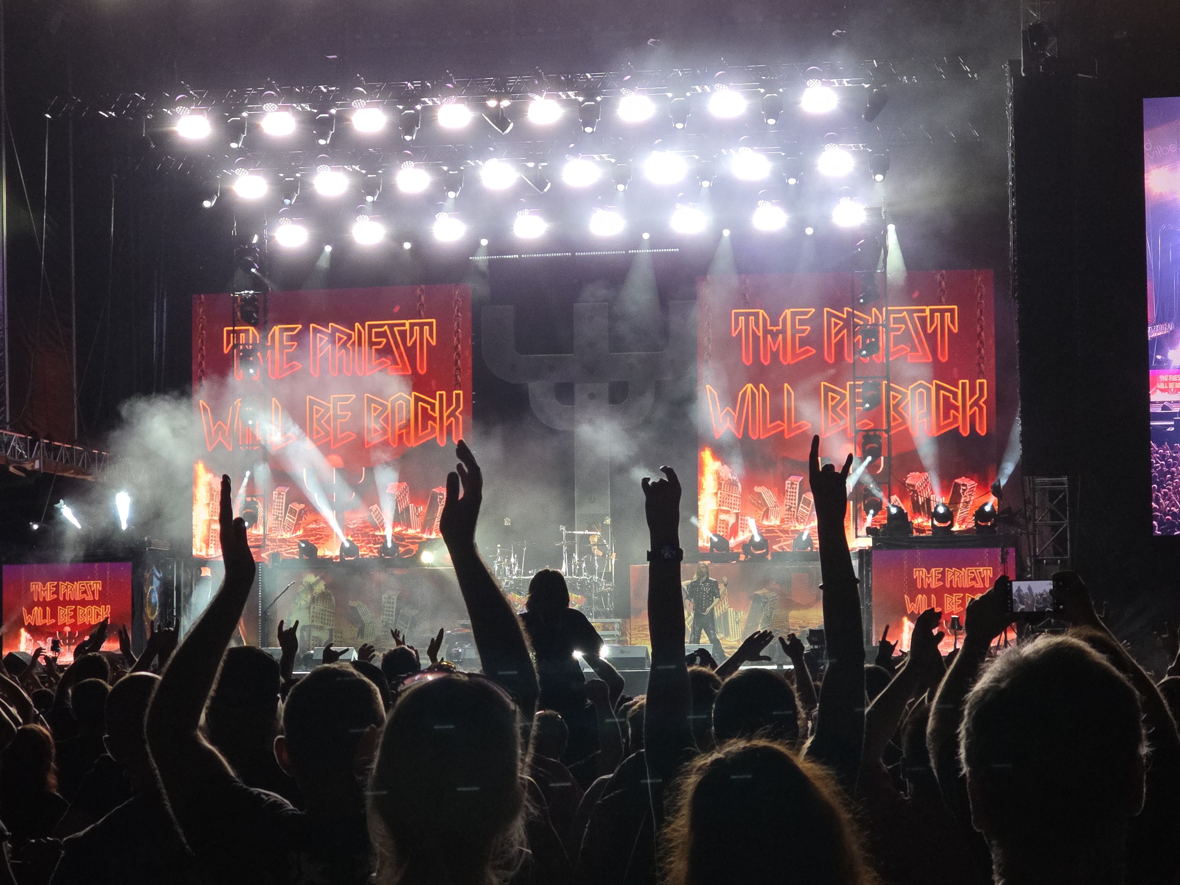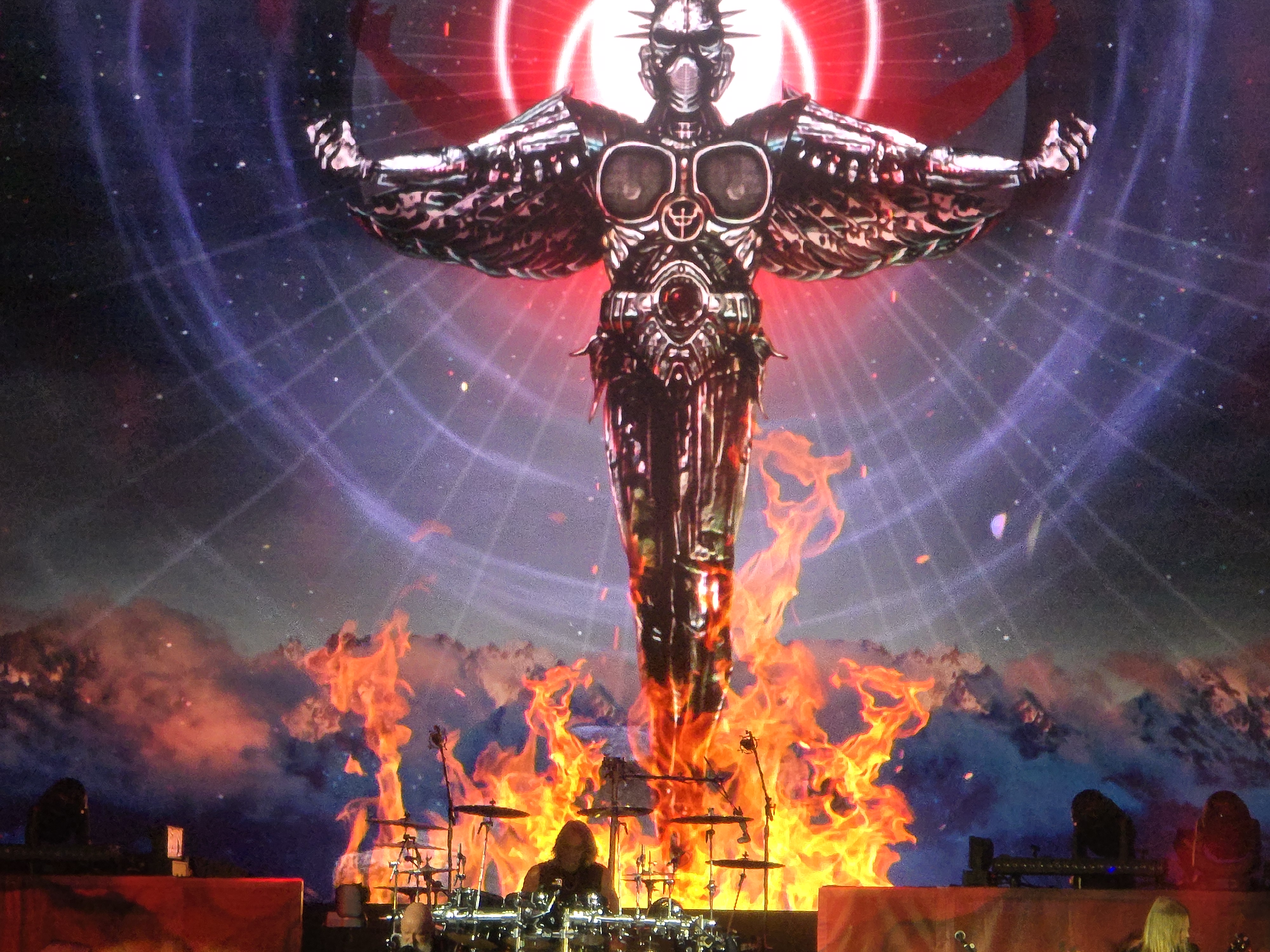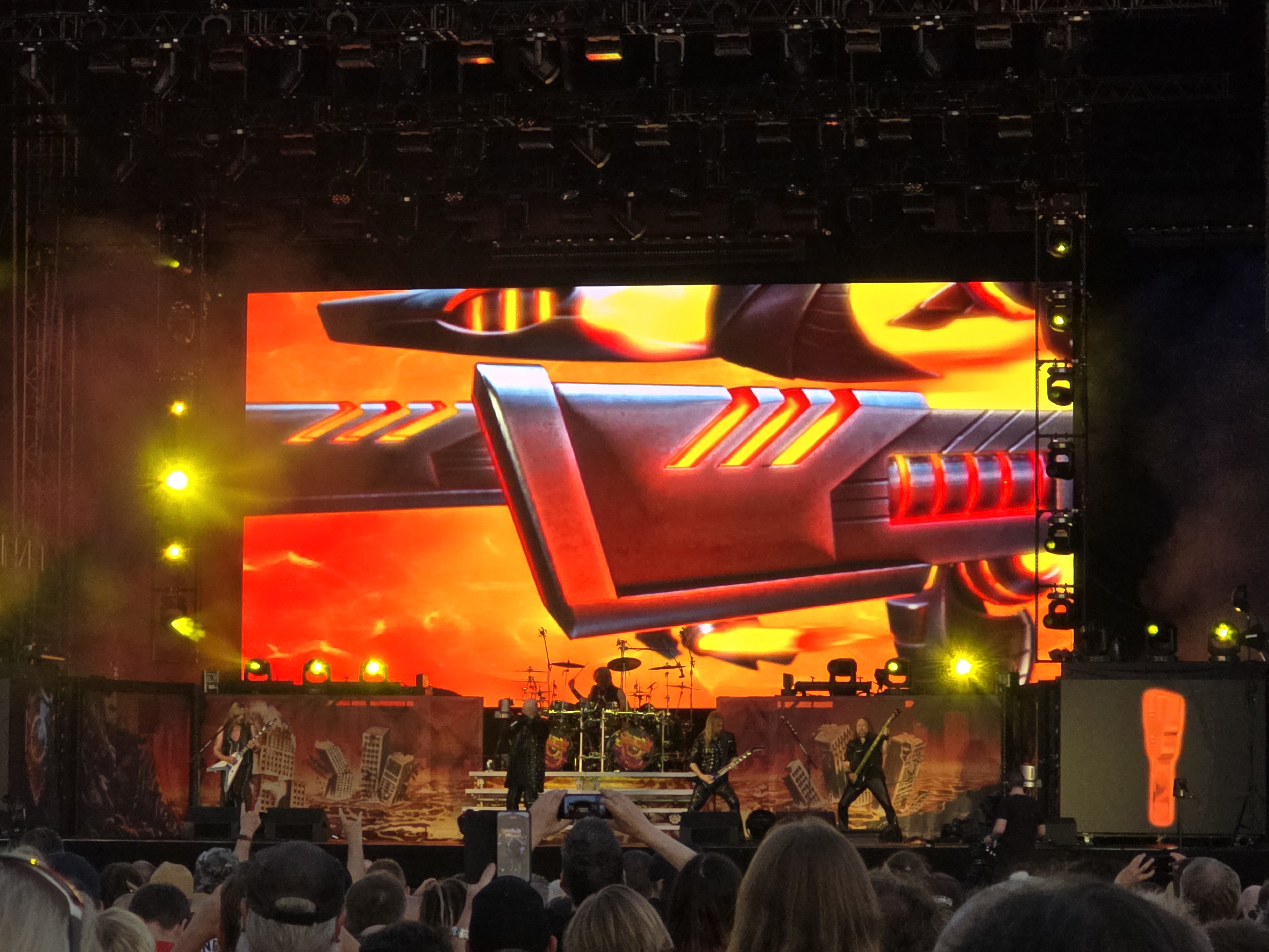 Mit „All Guns Blazing“ starten JUDAS PRIEST fulminant in ihren sehr „Painkiller“ lastigen Set und lassen von Beginn an keinen Zweifel aufkommen, auf wessen breiten Schultern sich die Musik, die wir alle so lieben, begründet. Der fast 74-jährige Frontmann Rob Halford scheint in einen Jungbrunnen gefallen zu sein. Er ist agiler, klebt nicht mehr so sehr am Teleprompter und überzeugt mit der besten Gesangsleistung seit Jahrzehnten. Ich habe Rob in den letzten 25 Jahren doch einige Male gesehen und durchaus auch tolle Auftritte erlebt, aber hier und heute ist es wirklich next Level. Faulkner und der wieder behaarte Andy Sneap haben sich zu einem tollen Gitarren-Duo gemausert und können die übergroßen Fußstapfen von Tipton/ Downing zwar nicht ganz, aber doch in beeindruckendem Maße ausfüllen. Im Gegensatz zu vielen anderen altgedienten Herrschaften ruhen sich JUDAS PRIEST nicht aus und überraschen auch immer wieder mit Songs, die keiner auf dem Zettel hatte. Neben diversen „Painkiller“ Songs wie zum Beispiel „Between The Hammer And The Anvil“, „One Shot At Glory“ oder „Hell Patrol“ überraschen mich vor allem „Solar Angels“ oder „Judas Rising“. Da darf dann auch gerne mal ein „Victim Of Changes“ oder ein „Green Manalishi (With The Two Pronged Crown)“ fehlen. Der Sound ist fett und Robs Gesang erfreulich effektfrei. Neben der makellosen musikalischen Darbietung überzeugen auch das Bühnenbild und die großen, teils mobilen bzw. teilbaren Leinwände, auf denen entweder die Musiker oder zu den Songs passende Animationen zu sehen sind. Volle 20 Songs hauen uns JUDAS PRIEST um die Ohren, und zwar im Dauerfeuermodus. Es gibt nur einige kurze Ansagen, keine überflüssigen Soli, sondern einfach nur Song auf Song und die Menge liebt es. Der Zugabeblock besteht aus „Hellion/Electric Eye“, „Hell Bent For Leather“ (natürlich mit Motorrad) und dem unverwüstlichen „Living After Midnight“. Auch wenn es danach für heute zu Ende ist, flimmert eine wichtige Botschaft weithin sichtbar über die Leinwände: „The PRIEST will be back“. Man kann es nur hoffen, denn dieser Form sind Rob Halford und Co. nach wie vor eine Macht.