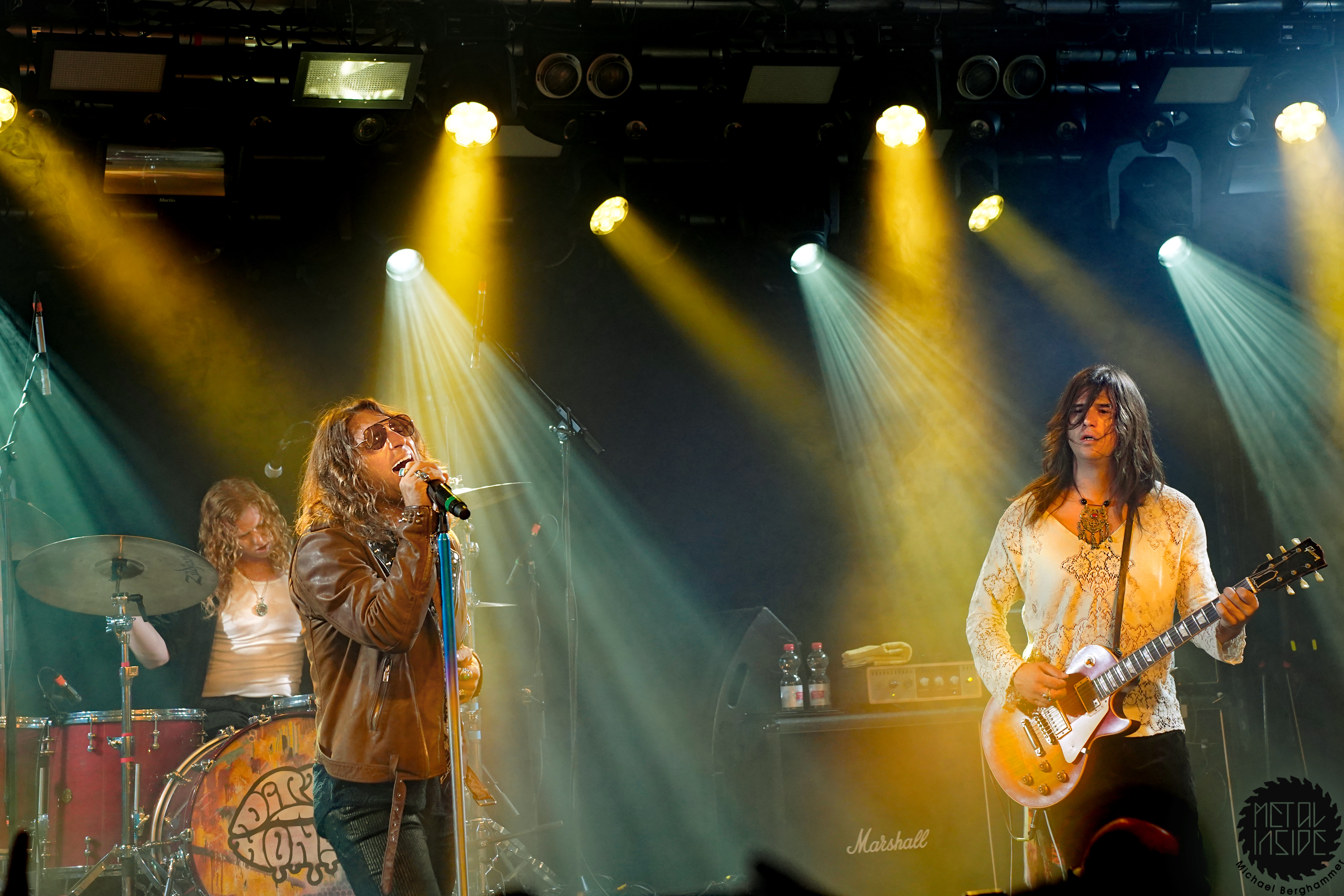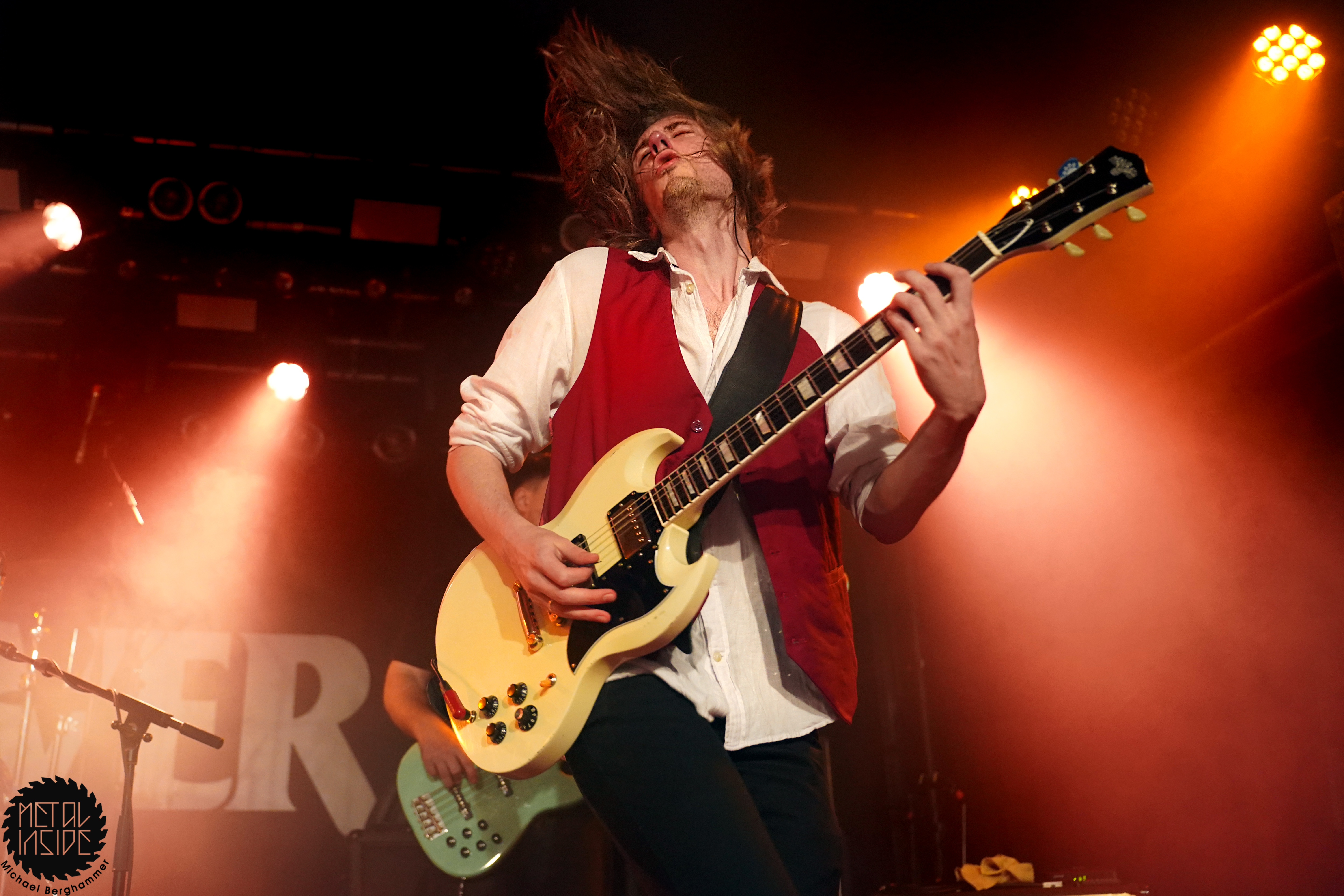 Das Colos-Saal füllt sich zusehens, und das Publikum ist im Schnitt eher jüngeres Semester. QUIVER eröffnen pünktlich um 20h mit ihrer Nummer "My Kinda Woman" den Gig. Dynamisch und quirlig bieten die Briten, die erst eine EP veröffentlicht haben, eine stimmige Melange aus Boogie Rock'n'Roll der Marke AC/DC und Hard Rock mit Blues Flavour. Der zappelige Lead-Gitarrist erinnert nicht nur mit seiner Performance an Angus Young, nein, auch sein Äußeres zeigt in diese Richtung. Der einnehmende Sänger hätte optisch auch zu einer Hard Core Combo gepasst, bietet aber top motiviert und sympatisch feine Hard Rock Kunst. Und ja, QUIVER heben die Stimmung im Colos-Saal auf Top-Niveau. Der Gig begeistert, die Idee, dass der Gitarrist ins Publikum abtaucht und dort seine Runden zieht, ist nicht neu, funktioniert aber immer. Alles an QUIVER unterhält, versprüht Freude und motiviert mitzurocken. Der tolle Sound und die ausreichende Zeit sprechen hier auch für DIRTY HONEY, denn der Supporter hat großartig performt und dazu bockstarke Songs im Angebot. An QUIVER bleibe ich dran, sehr geile Band.