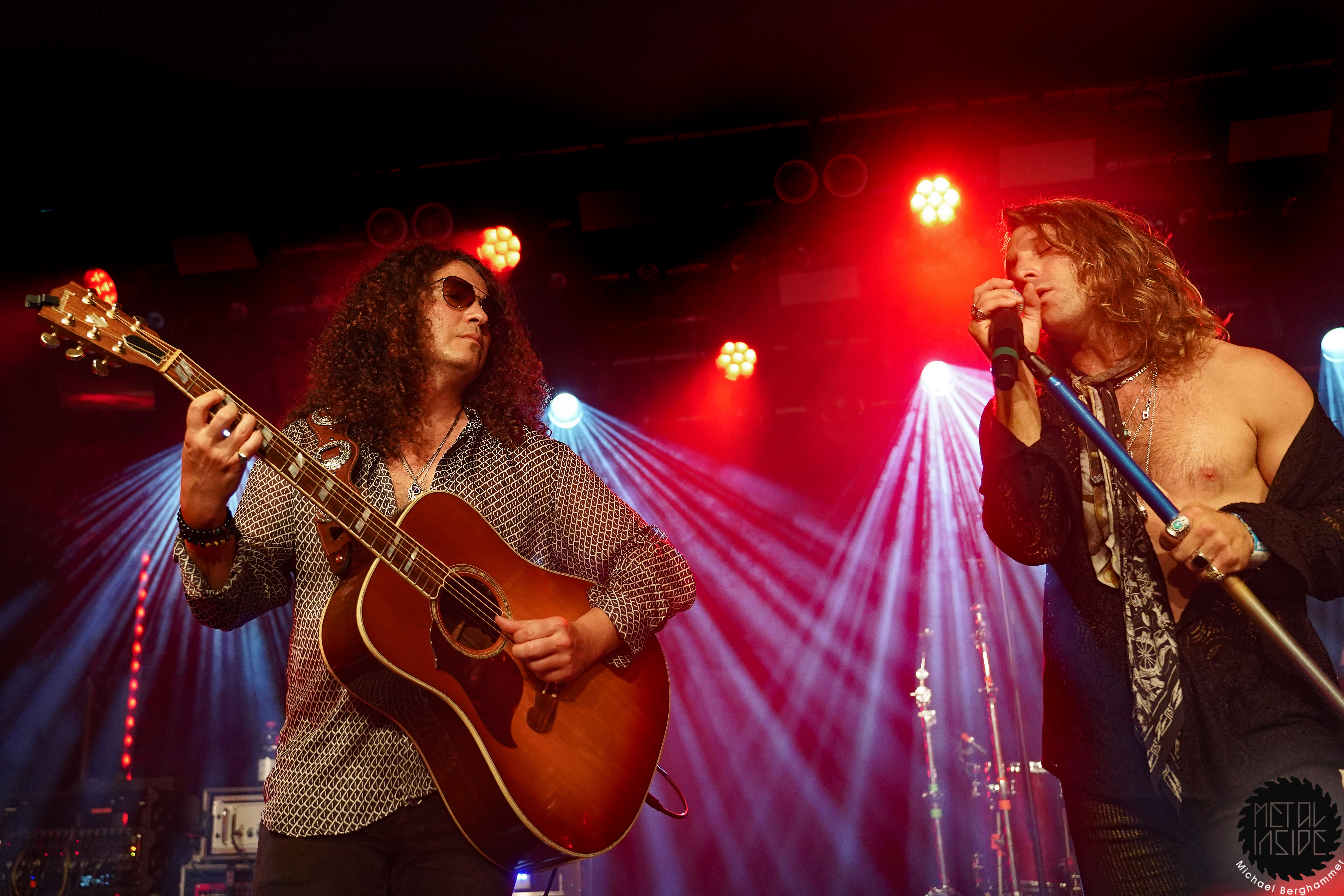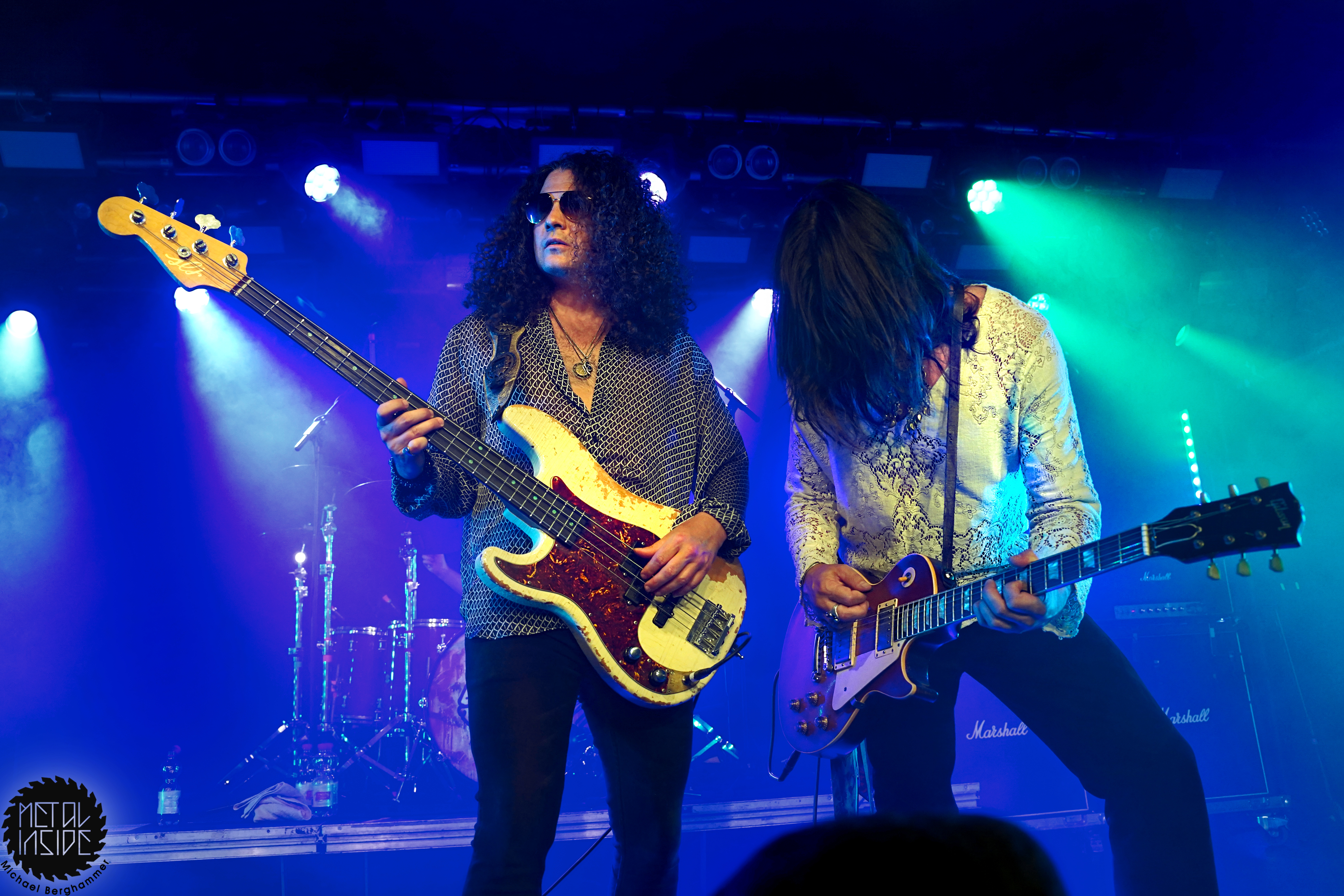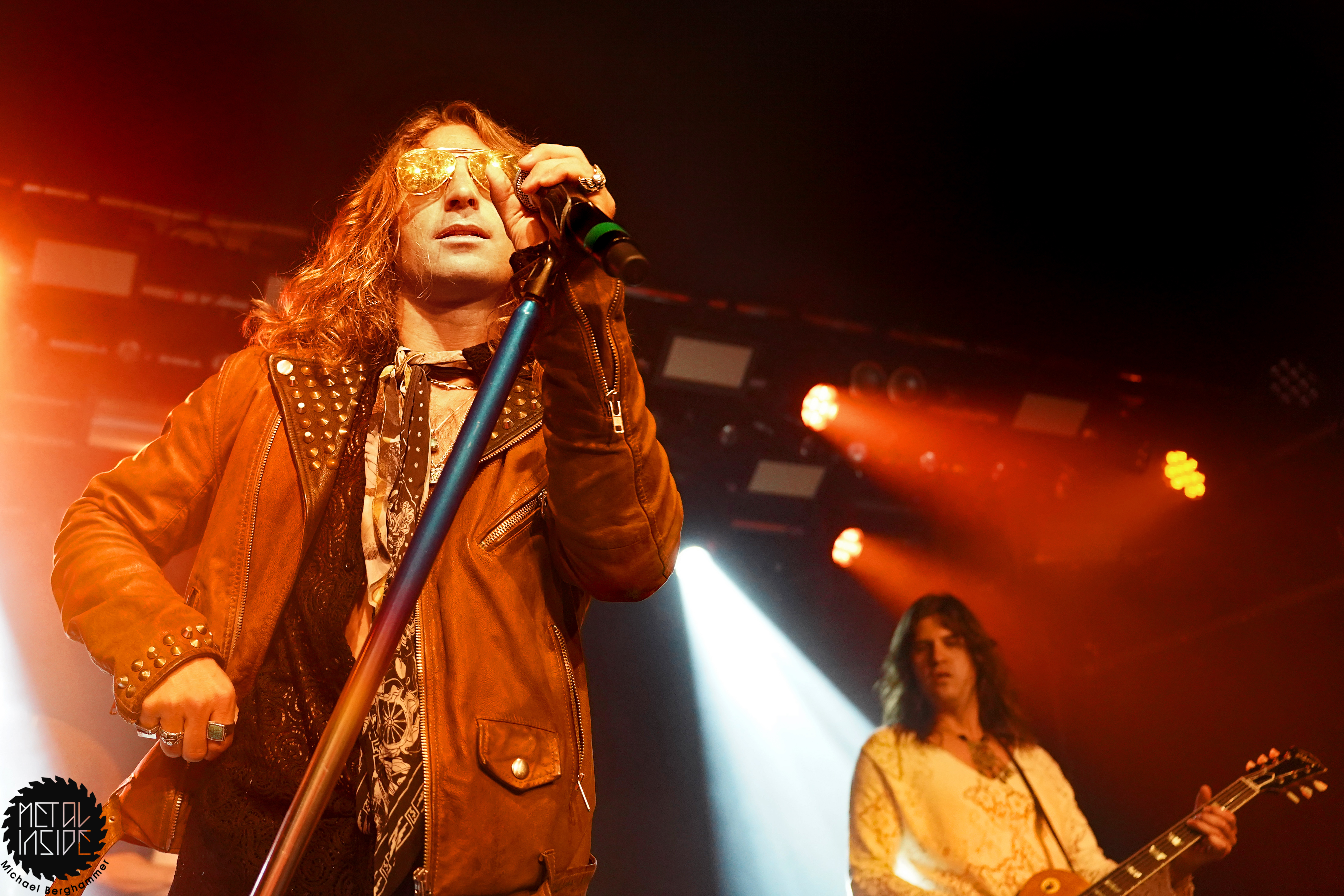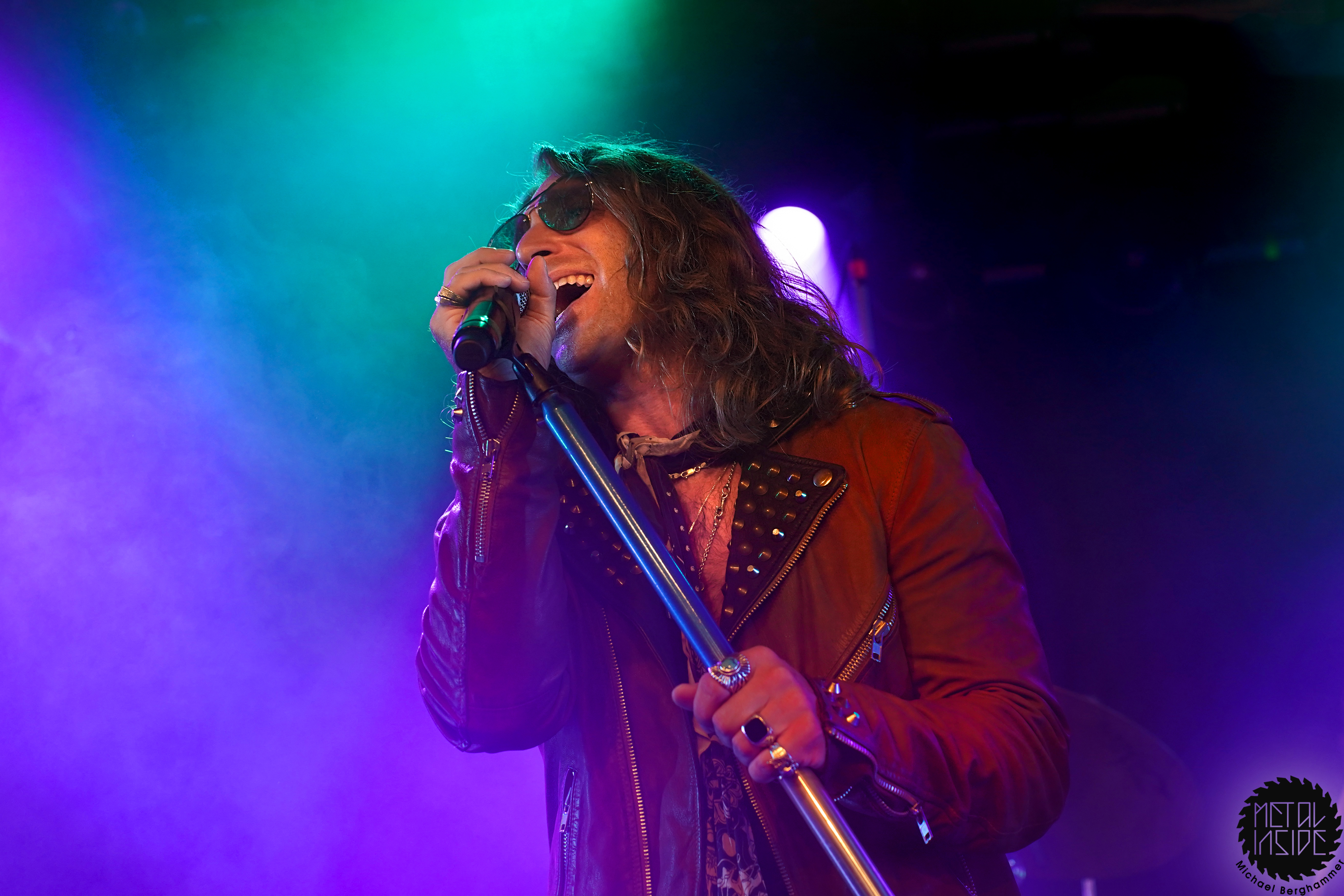 DIRTY HONEY starten nach kurzer Umbaupause. Die Band ist pur amerikanisch, optisch ein Hybrid aus VAN HALEN und TESLA in Vierer-Besetzung. Die Musik bewegt sich zwischen GREAT WHITE, THE BLACK CROWES und wohlempfundenen Country und Südstaaten-Moves. Mir scheinen die Musiker ein wenig zu cool, gerade am Anfang. Das löst sich aber im Laufe des Gigs. Auch die sympatischen und nahbaren QUIVER verstärken hier den Kontrast. Sänger Marc Labelle macht einen auf Schwerenöter, inklusive Nippelblitzer und freier Schulter. Gesanglich punktet der Hübsche aber durchaus mit Können und Stimme. Die Band ist selbstbewusst und siegessicher. Der Erfolg in Amerika zeigt Wirkung. Hier heißt es, kleinere Brötchen backen beziehungsweise kleinere Location beackern, aber die Show der vier Kalifonier kommt super in Aschaffenburg an. Das Publikum weiß zum Großteil, was es bekommt, und ist kundig in Text und Strophe. Die Songs funktionieren und haben neben dem Groove ordentlich Wiederhaken. Die Band zeigt sich als Einheit, Gitarrist John Notto spielt eine wilde und blitzsaubere Klampfe und die Rythmus-Fraktion ist präzise und druckvoll. Sänger und Gitarrist sind im Zentrum der Perfomance und bilden, unterstelle ich mal, wohl auch den Bandkern. Nach gut 90 Minuten ist Schicht im Schacht.