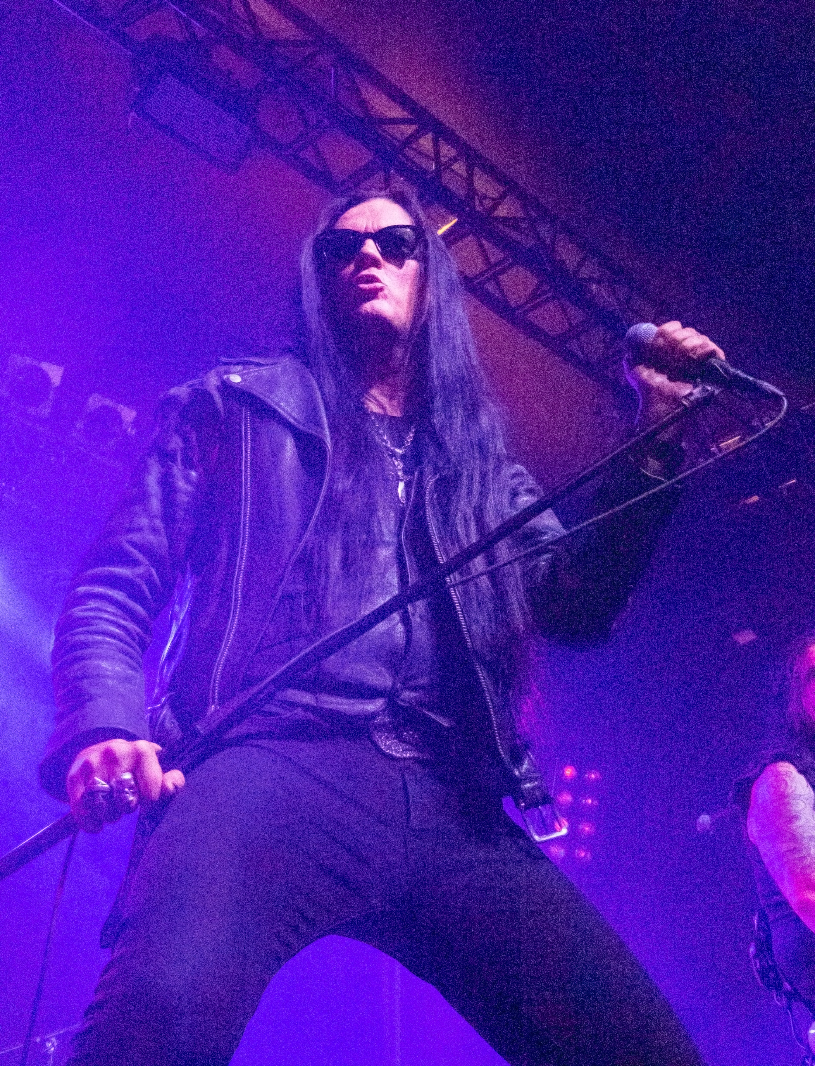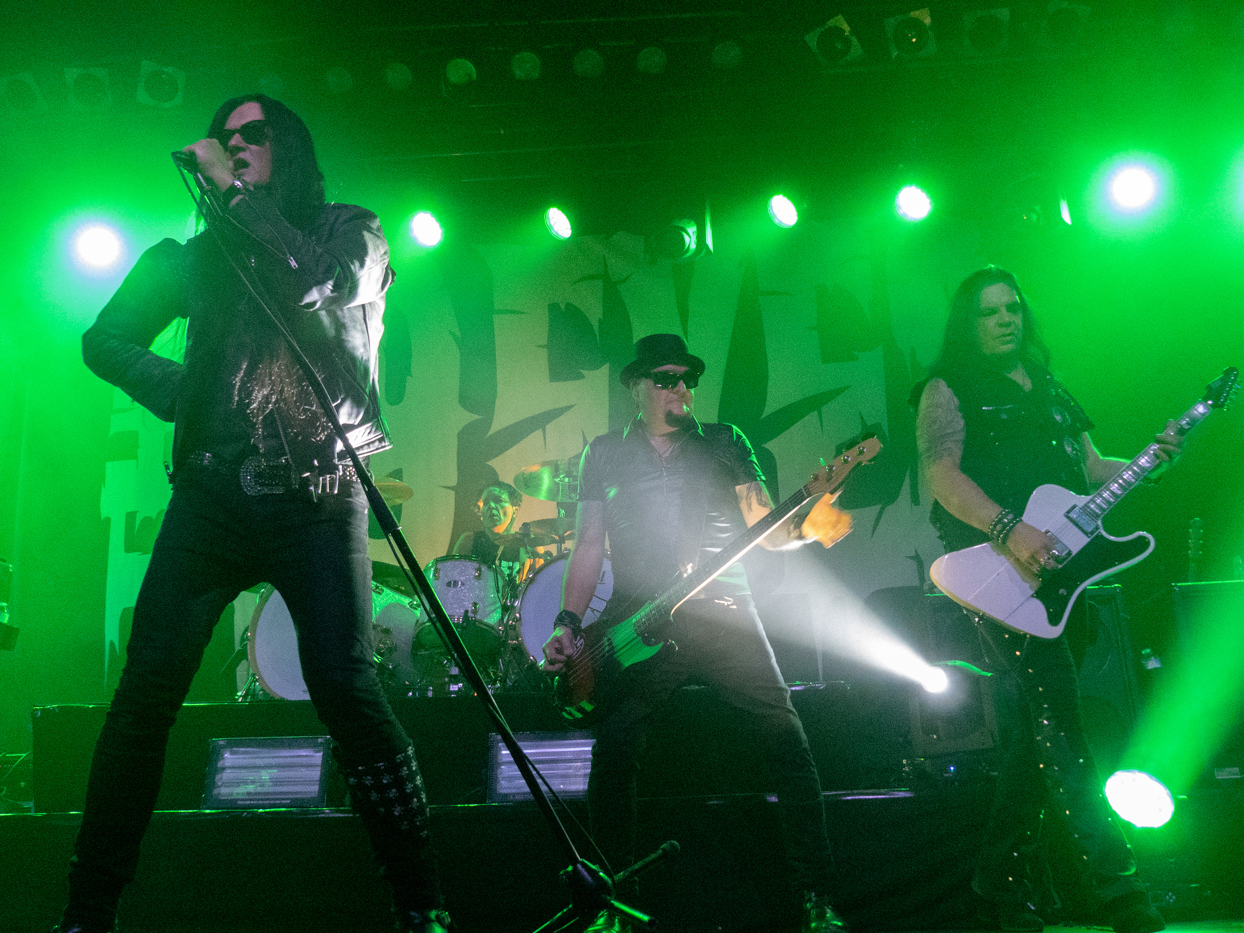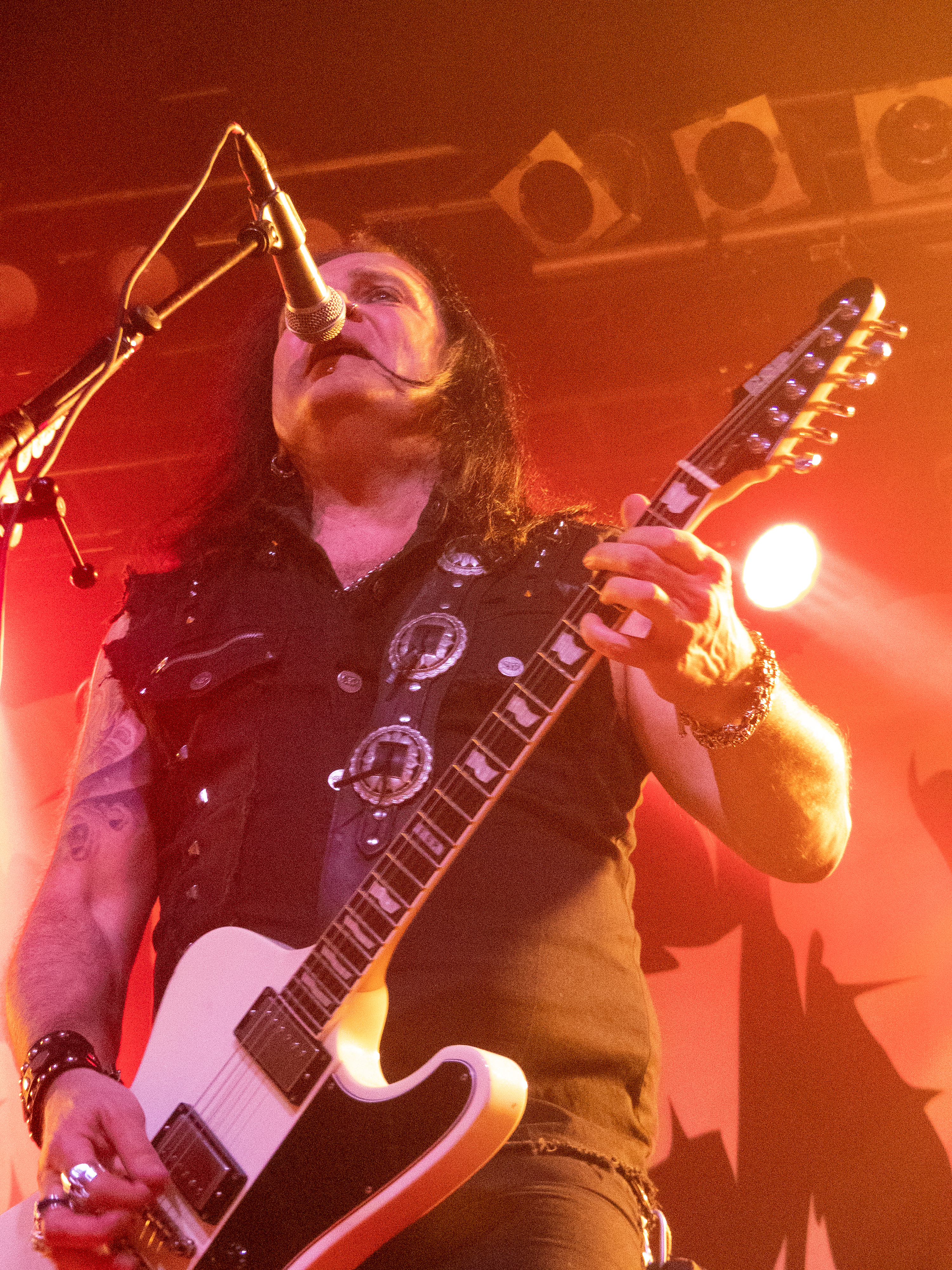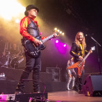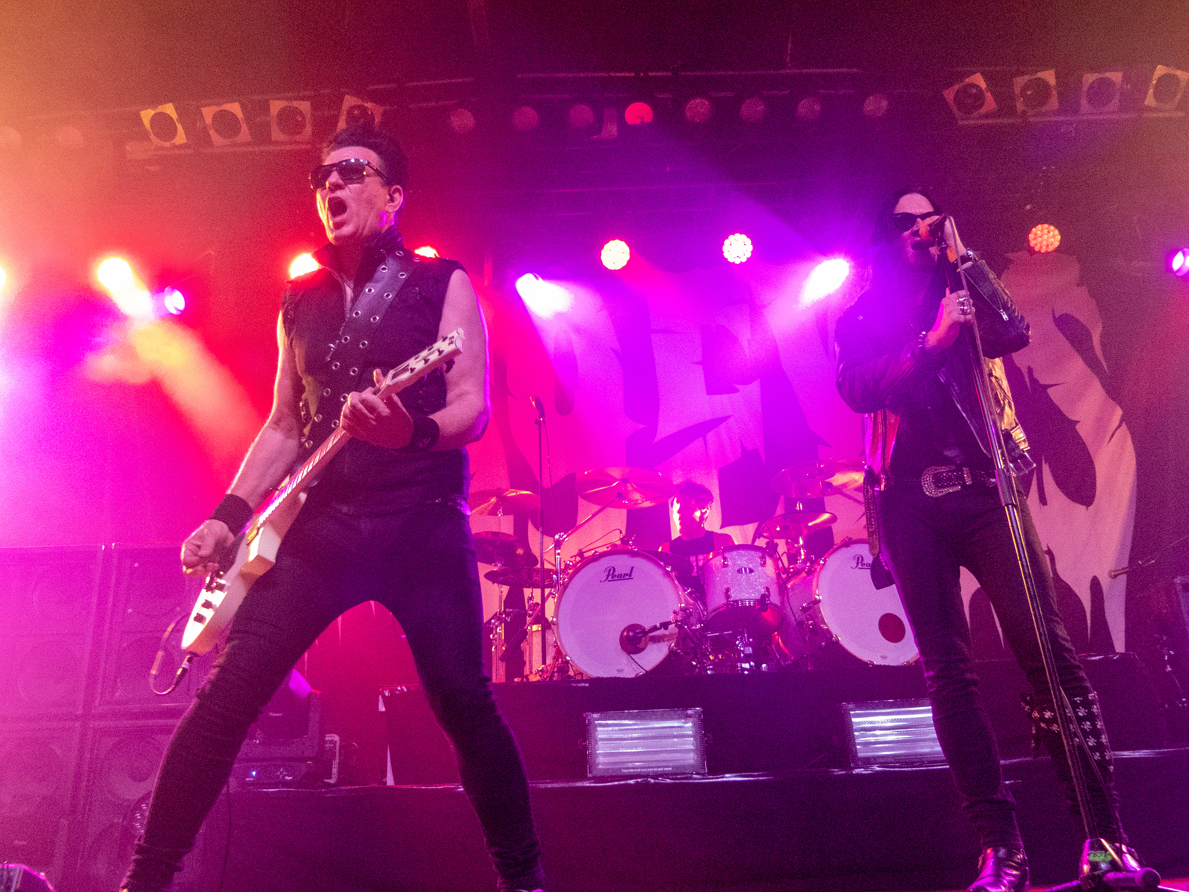 Um 20 Uhr war es schließlich soweit: pünktlich wie die Maurer betraten die Helsinki Vampires die Bühne und gaben mit „Devils“ als Opener direkt ordentlich Gas. Es folgten „Don´t Turn Your Back On Fear“, „Feel Berlin“ und das BOYCOTT-Cover „Gotta Rock“, bevor Sänger Jyrki sich das erste Mal ans Publikum wandte und die Menge begrüßte. Offenbar stand die Band im Rahmen der Doppel-Headliner-Tour etwas unter Zeitdruck was ihr Set anging, denn die Ansagen und Überleitungen waren diesmal ungewohnt spärlich und kurz gehalten – vermutlich, um die zur Verfügung stehende Zeit maximal musikalisch ausnutzen zu können. Dessen ungeachtet strotzte die Band vor Energie, das Set war garniert mit Klassikern wie „The Chair“, „Betty Blue“, „Never Say Die“ und „Gothic Girl“ und der Schwerpunkt lag eindeutig auf ebenso bewährten wie beliebten Live-Hits, was das Publikum sichtlich zu schätzen wusste. Ausflüge in jüngere musikalische Gefilde waren eher die Ausnahme, einzig „Death of Darkness“ und „Drive“ waren jüngeren Datums und stammten vom aktuellen, gleichnamigen Album „Death Of Darkness“. Die Stimmung bei Publikum und Band war gut und aufgrund der Auswahl der Setlist wehte ein Hauch von Nostalgie durch die Live Music Hall, der auch Jyrki 69 nicht verborgen blieb: „Wow, feels like it´s 2009 again!“ Zwar waren die Finnen seitdem durchaus in Köln zu Gast gewesen, allerdings, wie Jyrki hervorhob, sicher gute 15 Jahre lang nicht mehr in der Live Music Hall. „This city means a lot to us. Thank you all for coming, there´s so many old friends here. And if you´re here to see us for the first time: thank you, too, welcome! Maybe I´ll buy you a drink later on!” Ob diese Ankündigung später auch in die Tat umgesetzt wurde, bleibt offen, aber auch ohne Bestechung überzeugte die Band mit Spielfreude und guter Laune. Leider war der Sound nicht ganz rund und die Keyboards blieben im Gesamtklang etwas auf der Strecke, was aber nicht so gravierend war, dass es das Gesamterlebnis ernsthaft belastet hätte. Der eine oder andere keyboardgetragene Melodiebogen, beispielsweise beim Ur-Klassiker „Wasting The Dawn“ (Jyrki: „Please don´t cry now, this is such a sad song!“), ging dadurch jedoch leider ein wenig unter. Spaß machte das Lied trotzdem, kleine geistige Zeitreise inklusive. Drummer Jussi 69 spielte sich wie üblich einen Wolf -- der Mann trommelt wahrscheinlich auch noch im Schlaf – und bekam seinen traditionellen Kurzauftritt am Mikrofon bei „Brandon Lee“, mit dem das reguläre Set schloss und das vom Publikum standesgemäß gefeiert wurde. Die Zugabe ließ nicht lange auf sich warten, flugs standen die Goth´n´Roller wieder auf der Bühne und legten mit „Framed In Blood“ vom damals hocherfolgreichen Album „Blessed Be“ nach, gefolgt von „Dance D´Amour“, ebenfalls ein inzwischen unsterblicher Bandklassiker. Apropos unsterblich: man könne beruhigt auch weiterhin auf die 69 Eyes bauen, „because Vampires never die!“, so Jyrki 69. Und um diesen Anspruch zu untermauern folgte der inzwischen traditionelle Rausschmeißer in Form von „Lost Boys“, der dem Publikum nochmal ordentlich einheizte, bevor die Finnen unter reichlich Dankesbekundungen und in die Menge geworfenen Plektren zu den Klängen von „Paint It Black“ von den Rolling Stones nach einer Spielzeit von 75 Minuten endgültig abgingen. Sie hätten durchaus gerne noch etwas länger bleiben dürfen, zumal sich die Umbaupause bis zu D-A-D eine Dreiviertelstunde hinziehen sollte.
