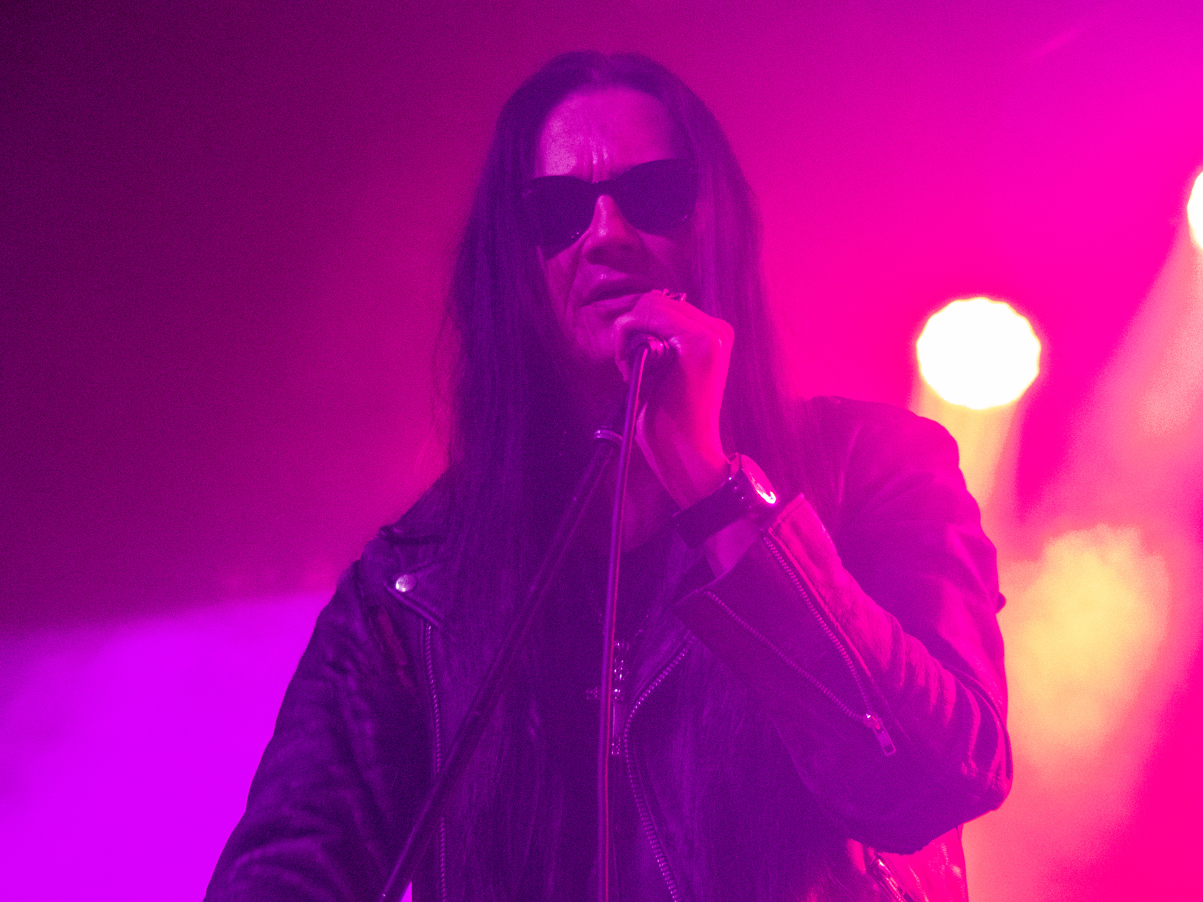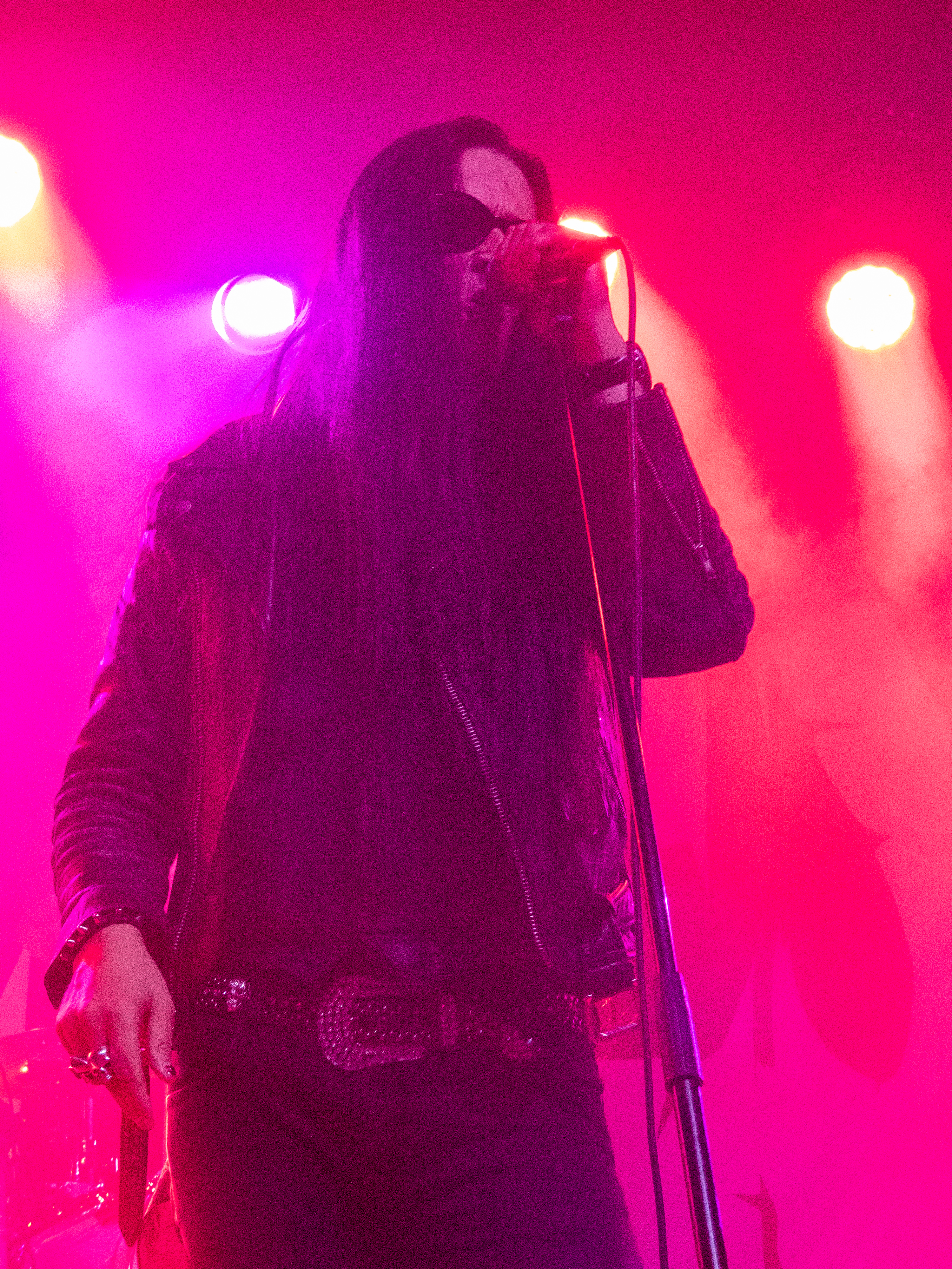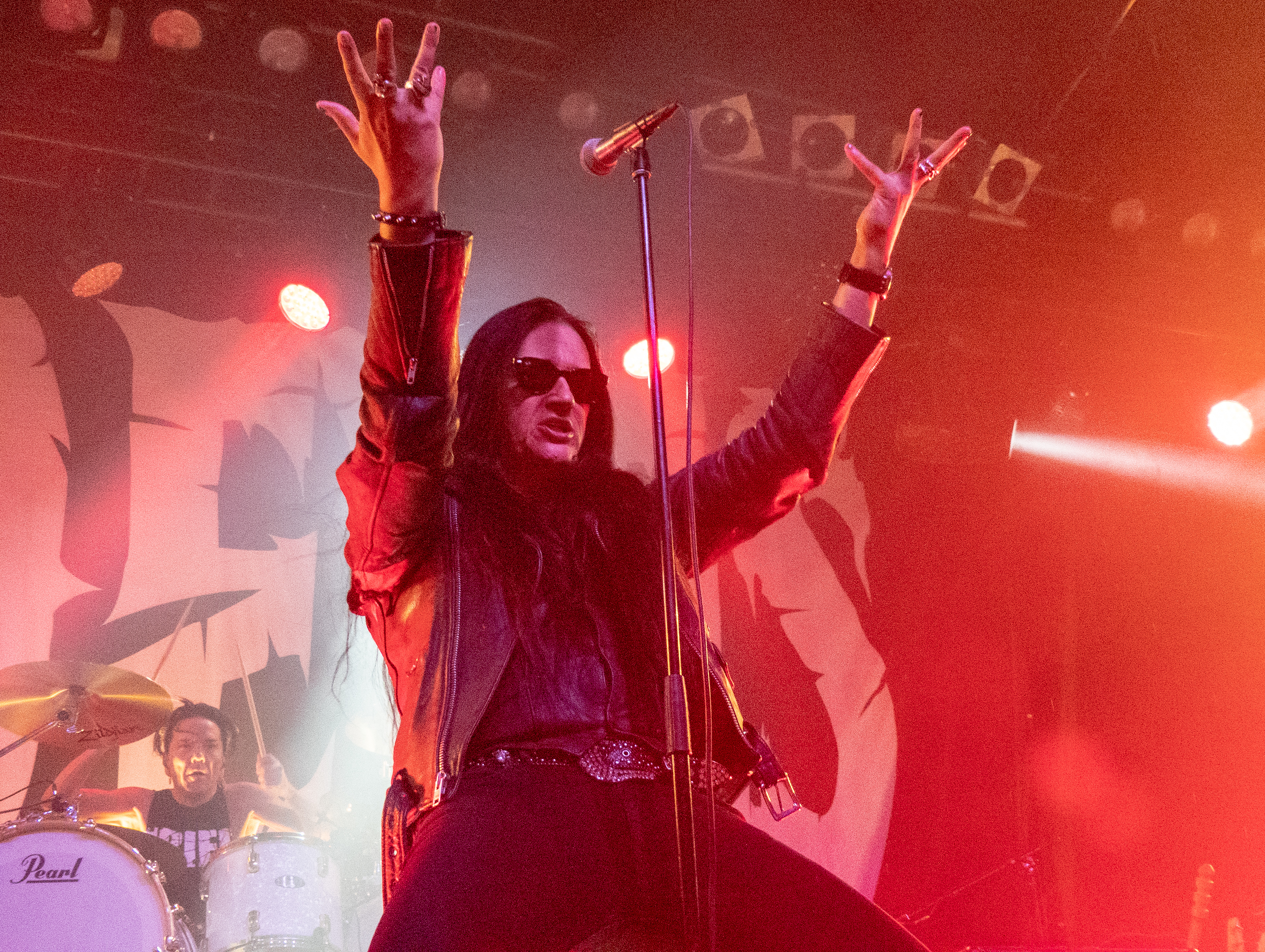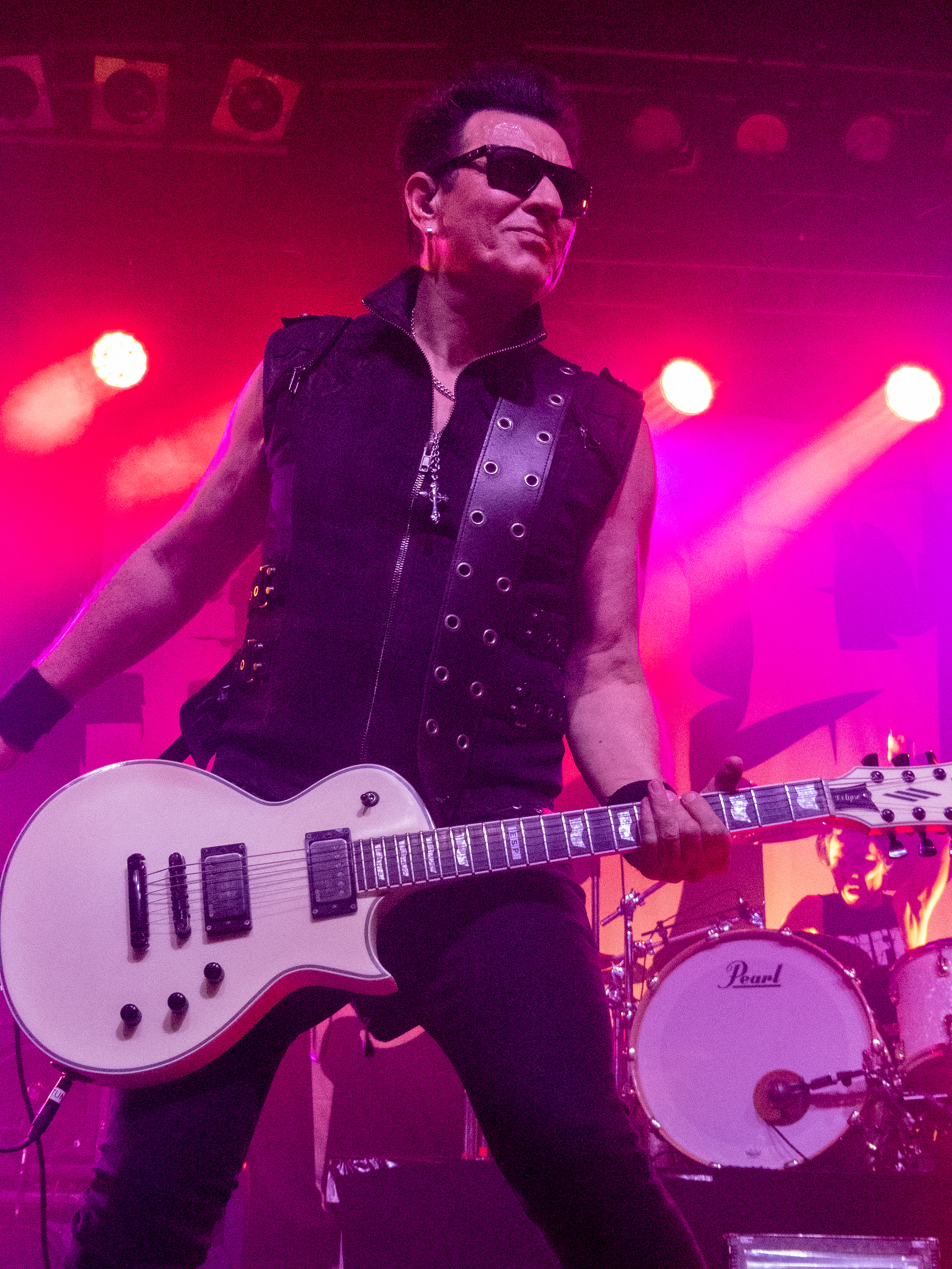 Um 20 Uhr war es schließlich soweit: pünktlich wie die Maurer betraten die Helsinki Vampires die Bühne und gaben mit „Devils“ als Opener direkt ordentlich Gas. Es folgten „Don´t Turn Your Back On Fear“, „Feel Berlin“ und das BOYCOTT-Cover „Gotta Rock“, bevor Sänger Jyrki sich das erste Mal ans Publikum wandte und die Menge begrüßte. Offenbar stand die Band im Rahmen der Doppel-Headliner-Tour etwas unter Zeitdruck was ihr Set anging, denn die Ansagen und Überleitungen waren diesmal ungewohnt spärlich und kurz gehalten – vermutlich, um die zur Verfügung stehende Zeit maximal musikalisch ausnutzen zu können. Dessen ungeachtet strotzte die Band vor Energie, das Set war garniert mit Klassikern wie „The Chair“, „Betty Blue“, „Never Say Die“ und „Gothic Girl“ und der Schwerpunkt lag eindeutig auf ebenso bewährten wie beliebten Live-Hits, was das Publikum sichtlich zu schätzen wusste. Ausflüge in jüngere musikalische Gefilde waren eher die Ausnahme, einzig „Death of Darkness“ und „Drive“ waren jüngeren Datums und stammten vom aktuellen, gleichnamigen Album „Death Of Darkness“. Die Stimmung bei Publikum und Band war gut und aufgrund der Auswahl der Setlist wehte ein Hauch von Nostalgie durch die Live Music Hall, der auch Jyrki 69 nicht verborgen blieb: „Wow, feels like it´s 2009 again!“ Zwar waren die Finnen seitdem durchaus in Köln zu Gast gewesen, allerdings, wie Jyrki hervorhob, sicher gute 15 Jahre lang nicht mehr in der Live Music Hall. „This city means a lot to us. Thank you all for coming, there´s so many old friends here. And if you´re here to see us for the first time: thank you, too, welcome! Maybe I´ll buy you a drink later on!” Ob diese Ankündigung später auch in die Tat umgesetzt wurde, bleibt offen, aber auch ohne Bestechung überzeugte die Band mit Spielfreude und guter Laune. Leider war der Sound nicht ganz rund und die Keyboards blieben im Gesamtklang etwas auf der Strecke, was aber nicht so gravierend war, dass es das Gesamterlebnis ernsthaft belastet hätte. Der eine oder andere keyboardgetragene Melodiebogen, beispielsweise beim Ur-Klassiker „Wasting The Dawn“ (Jyrki: „Please don´t cry now, this is such a sad song!“), ging dadurch jedoch leider ein wenig unter. Spaß machte das Lied trotzdem, kleine geistige Zeitreise inklusive. Drummer Jussi 69 spielte sich wie üblich einen Wolf -- der Mann trommelt wahrscheinlich auch noch im Schlaf – und bekam seinen traditionellen Kurzauftritt am Mikrofon bei „Brandon Lee“, mit dem das reguläre Set schloss und das vom Publikum standesgemäß gefeiert wurde. Die Zugabe ließ nicht lange auf sich warten, flugs standen die Goth´n´Roller wieder auf der Bühne und legten mit „Framed In Blood“ vom damals hocherfolgreichen Album „Blessed Be“ nach, gefolgt von „Dance D´Amour“, ebenfalls ein inzwischen unsterblicher Bandklassiker. Apropos unsterblich: man könne beruhigt auch weiterhin auf die 69 Eyes bauen, „because Vampires never die!“, so Jyrki 69. Und um diesen Anspruch zu untermauern folgte der inzwischen traditionelle Rausschmeißer in Form von „Lost Boys“, der dem Publikum nochmal ordentlich einheizte, bevor die Finnen unter reichlich Dankesbekundungen und in die Menge geworfenen Plektren zu den Klängen von „Paint It Black“ von den Rolling Stones nach einer Spielzeit von 75 Minuten endgültig abgingen. Sie hätten durchaus gerne noch etwas länger bleiben dürfen, zumal sich die Umbaupause bis zu D-A-D eine Dreiviertelstunde hinziehen sollte.