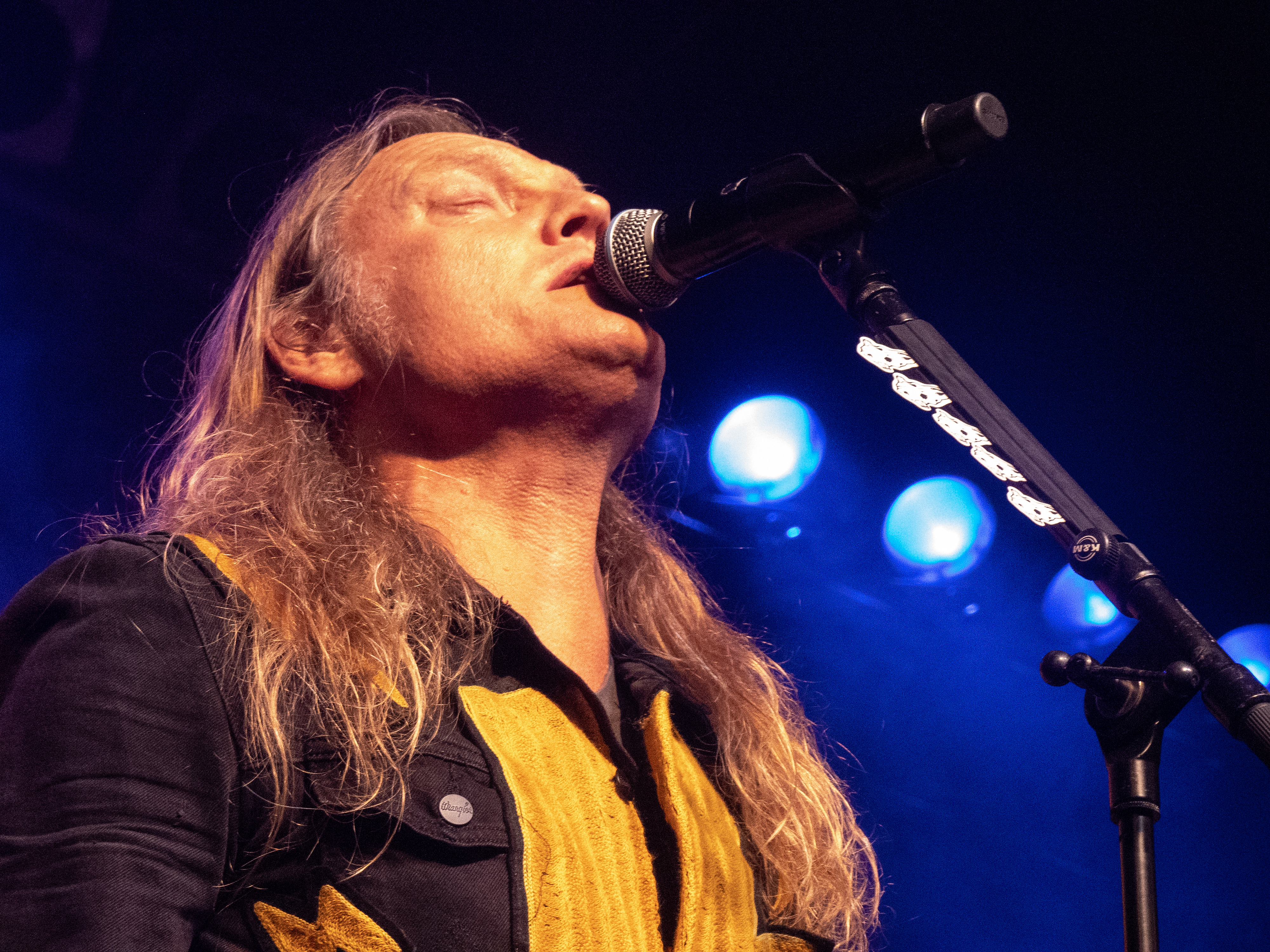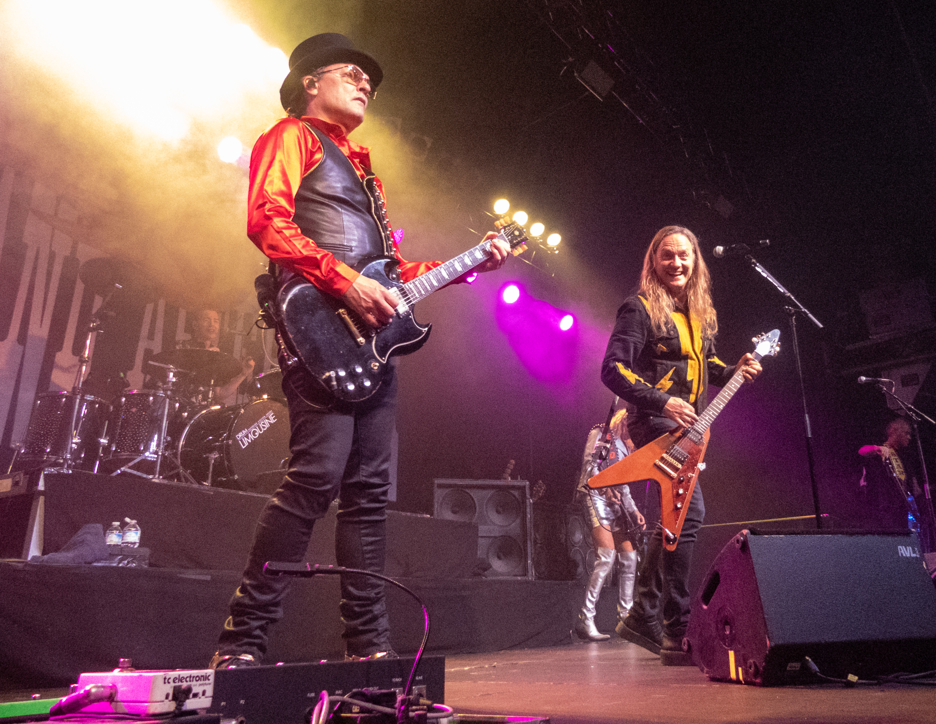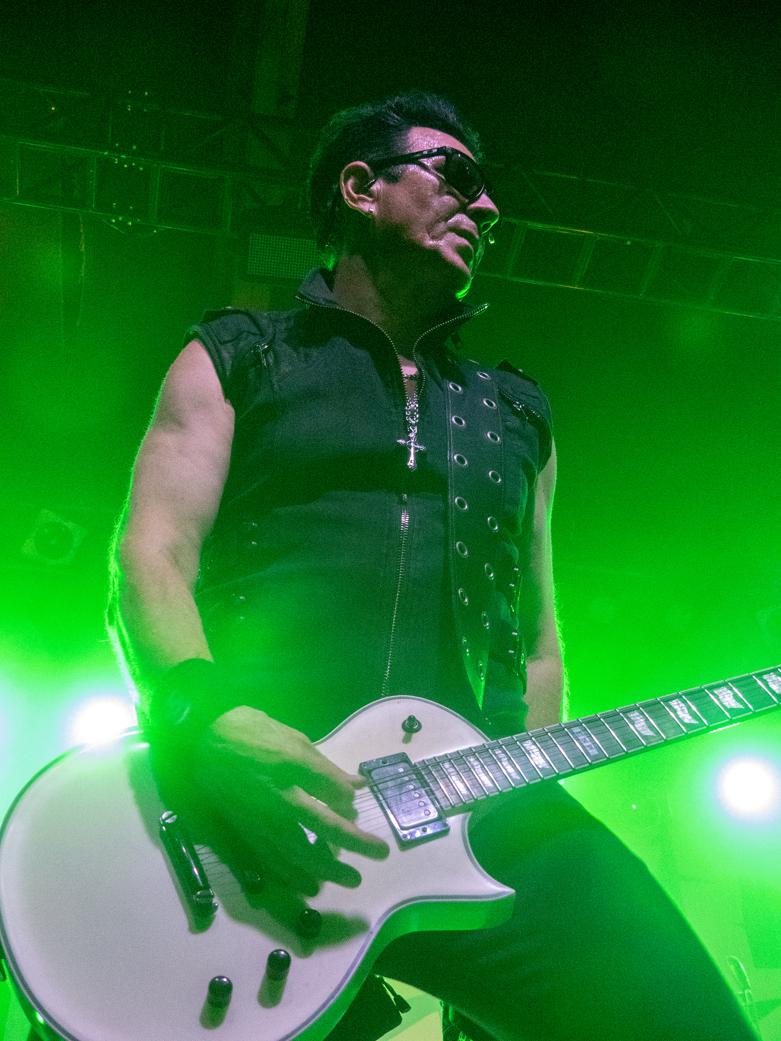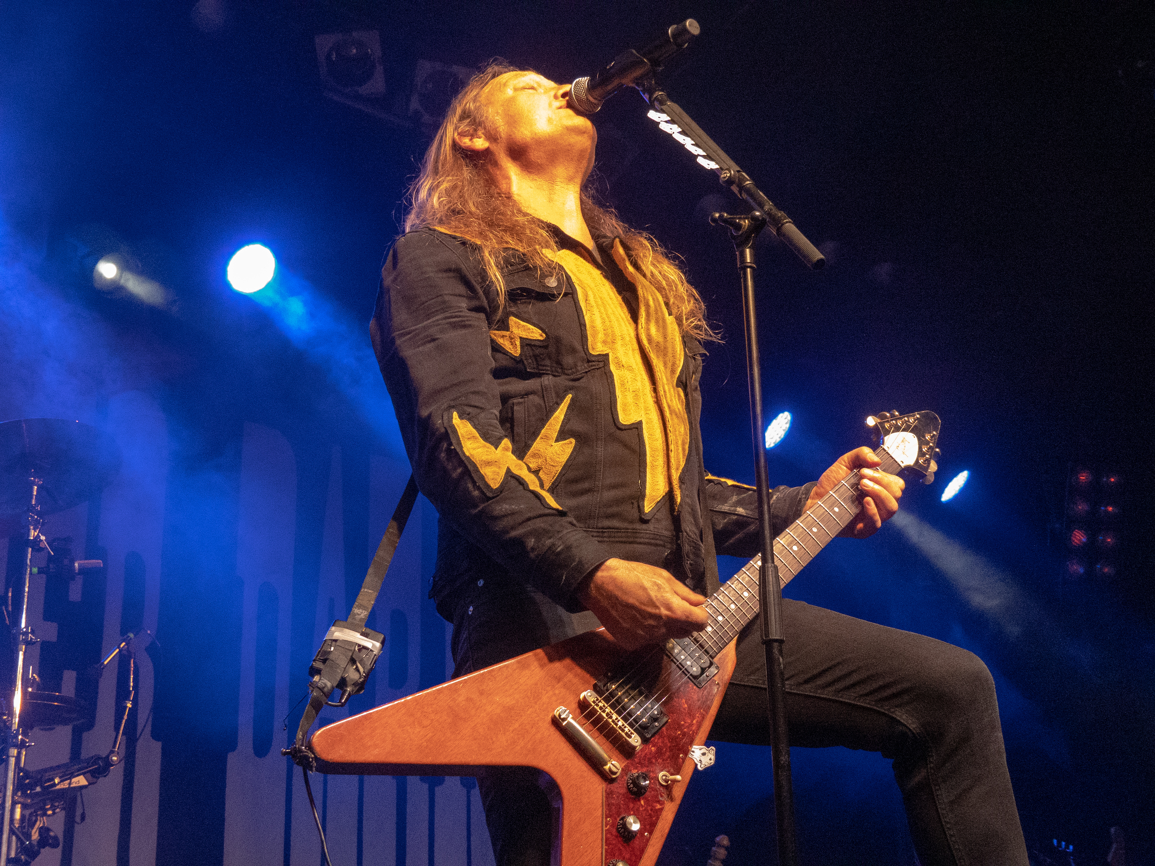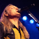 Um 20 Uhr war es schließlich soweit: pünktlich wie die Maurer betraten die Helsinki Vampires die Bühne und gaben mit „Devils“ als Opener direkt ordentlich Gas. Es folgten „Don´t Turn Your Back On Fear“, „Feel Berlin“ und das BOYCOTT-Cover „Gotta Rock“, bevor Sänger Jyrki sich das erste Mal ans Publikum wandte und die Menge begrüßte. Offenbar stand die Band im Rahmen der Doppel-Headliner-Tour etwas unter Zeitdruck was ihr Set anging, denn die Ansagen und Überleitungen waren diesmal ungewohnt spärlich und kurz gehalten – vermutlich, um die zur Verfügung stehende Zeit maximal musikalisch ausnutzen zu können. Dessen ungeachtet strotzte die Band vor Energie, das Set war garniert mit Klassikern wie „The Chair“, „Betty Blue“, „Never Say Die“ und „Gothic Girl“ und der Schwerpunkt lag eindeutig auf ebenso bewährten wie beliebten Live-Hits, was das Publikum sichtlich zu schätzen wusste. Ausflüge in jüngere musikalische Gefilde waren eher die Ausnahme, einzig „Death of Darkness“ und „Drive“ waren jüngeren Datums und stammten vom aktuellen, gleichnamigen Album „Death Of Darkness“. Die Stimmung bei Publikum und Band war gut und aufgrund der Auswahl der Setlist wehte ein Hauch von Nostalgie durch die Live Music Hall, der auch Jyrki 69 nicht verborgen blieb: „Wow, feels like it´s 2009 again!“ Zwar waren die Finnen seitdem durchaus in Köln zu Gast gewesen, allerdings, wie Jyrki hervorhob, sicher gute 15 Jahre lang nicht mehr in der Live Music Hall. „This city means a lot to us. Thank you all for coming, there´s so many old friends here. And if you´re here to see us for the first time: thank you, too, welcome! Maybe I´ll buy you a drink later on!” Ob diese Ankündigung später auch in die Tat umgesetzt wurde, bleibt offen, aber auch ohne Bestechung überzeugte die Band mit Spielfreude und guter Laune. Leider war der Sound nicht ganz rund und die Keyboards blieben im Gesamtklang etwas auf der Strecke, was aber nicht so gravierend war, dass es das Gesamterlebnis ernsthaft belastet hätte. Der eine oder andere keyboardgetragene Melodiebogen, beispielsweise beim Ur-Klassiker „Wasting The Dawn“ (Jyrki: „Please don´t cry now, this is such a sad song!“), ging dadurch jedoch leider ein wenig unter. Spaß machte das Lied trotzdem, kleine geistige Zeitreise inklusive. Drummer Jussi 69 spielte sich wie üblich einen Wolf -- der Mann trommelt wahrscheinlich auch noch im Schlaf – und bekam seinen traditionellen Kurzauftritt am Mikrofon bei „Brandon Lee“, mit dem das reguläre Set schloss und das vom Publikum standesgemäß gefeiert wurde. Die Zugabe ließ nicht lange auf sich warten, flugs standen die Goth´n´Roller wieder auf der Bühne und legten mit „Framed In Blood“ vom damals hocherfolgreichen Album „Blessed Be“ nach, gefolgt von „Dance D´Amour“, ebenfalls ein inzwischen unsterblicher Bandklassiker. Apropos unsterblich: man könne beruhigt auch weiterhin auf die 69 Eyes bauen, „because Vampires never die!“, so Jyrki 69. Und um diesen Anspruch zu untermauern folgte der inzwischen traditionelle Rausschmeißer in Form von „Lost Boys“, der dem Publikum nochmal ordentlich einheizte, bevor die Finnen unter reichlich Dankesbekundungen und in die Menge geworfenen Plektren zu den Klängen von „Paint It Black“ von den Rolling Stones nach einer Spielzeit von 75 Minuten endgültig abgingen. Sie hätten durchaus gerne noch etwas länger bleiben dürfen, zumal sich die Umbaupause bis zu D-A-D eine Dreiviertelstunde hinziehen sollte.