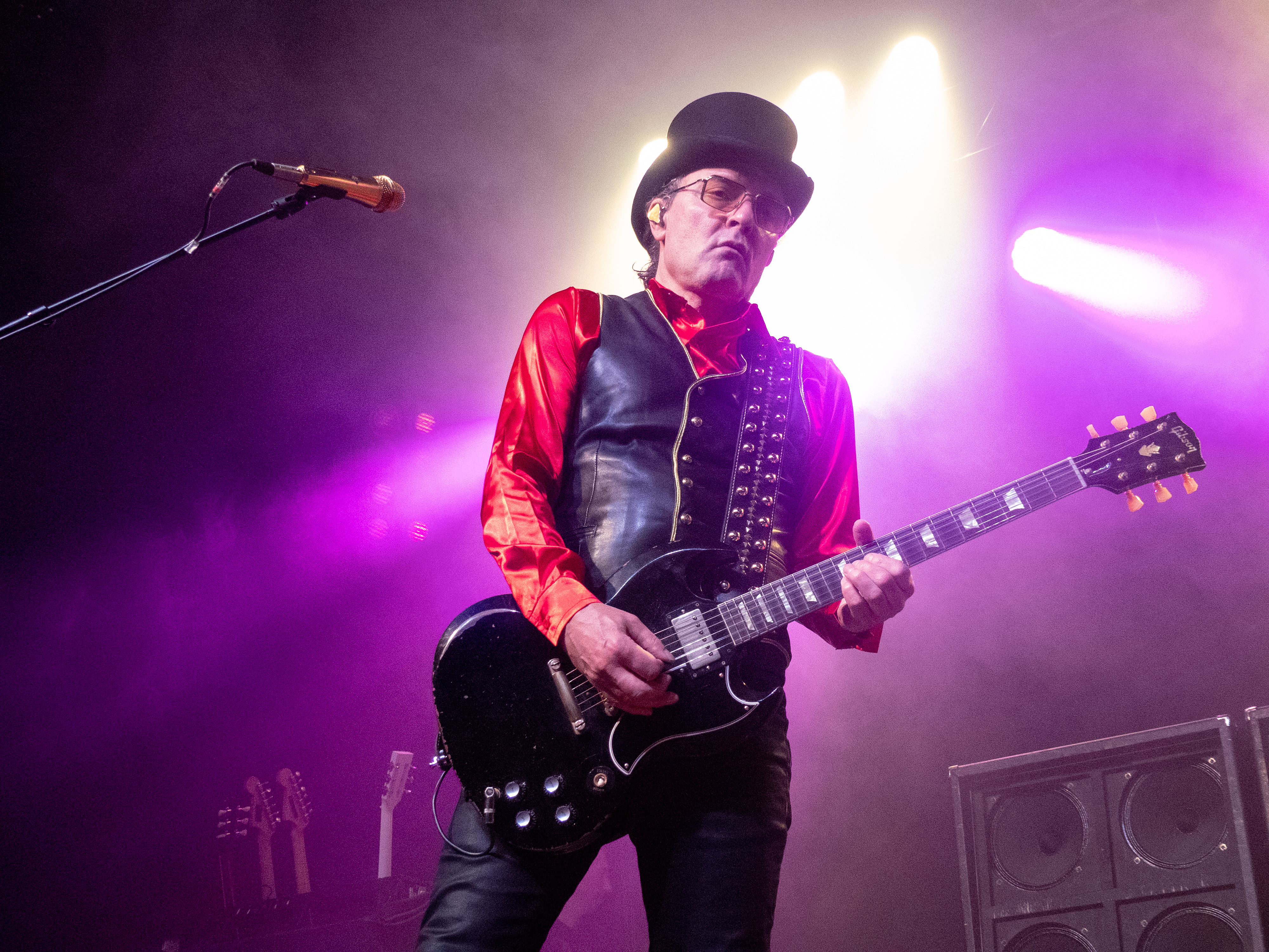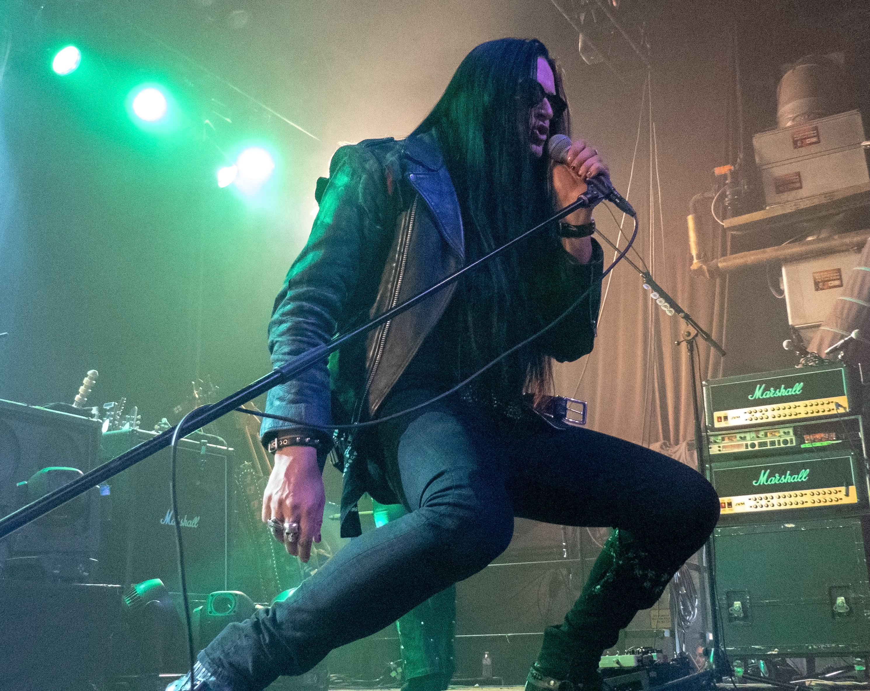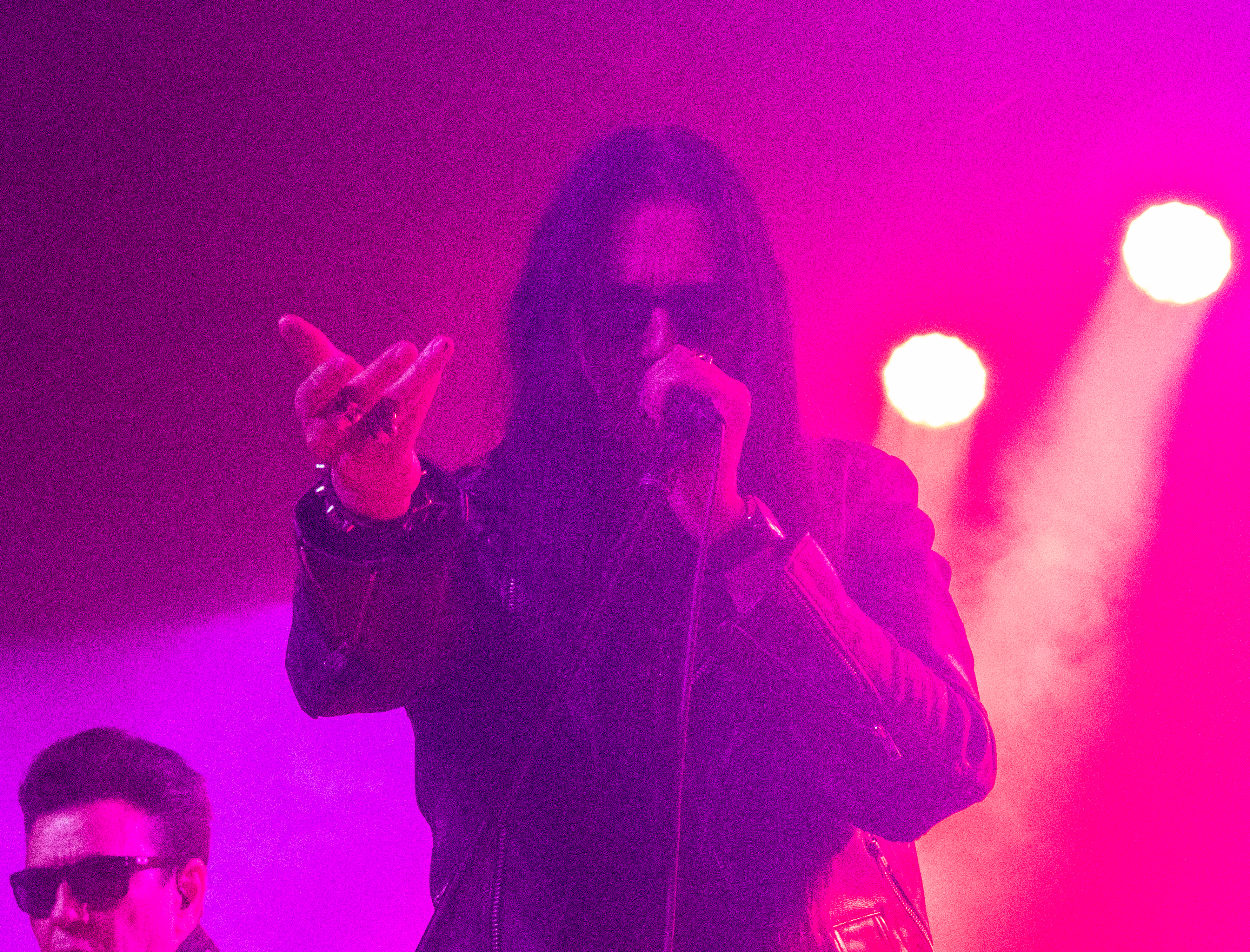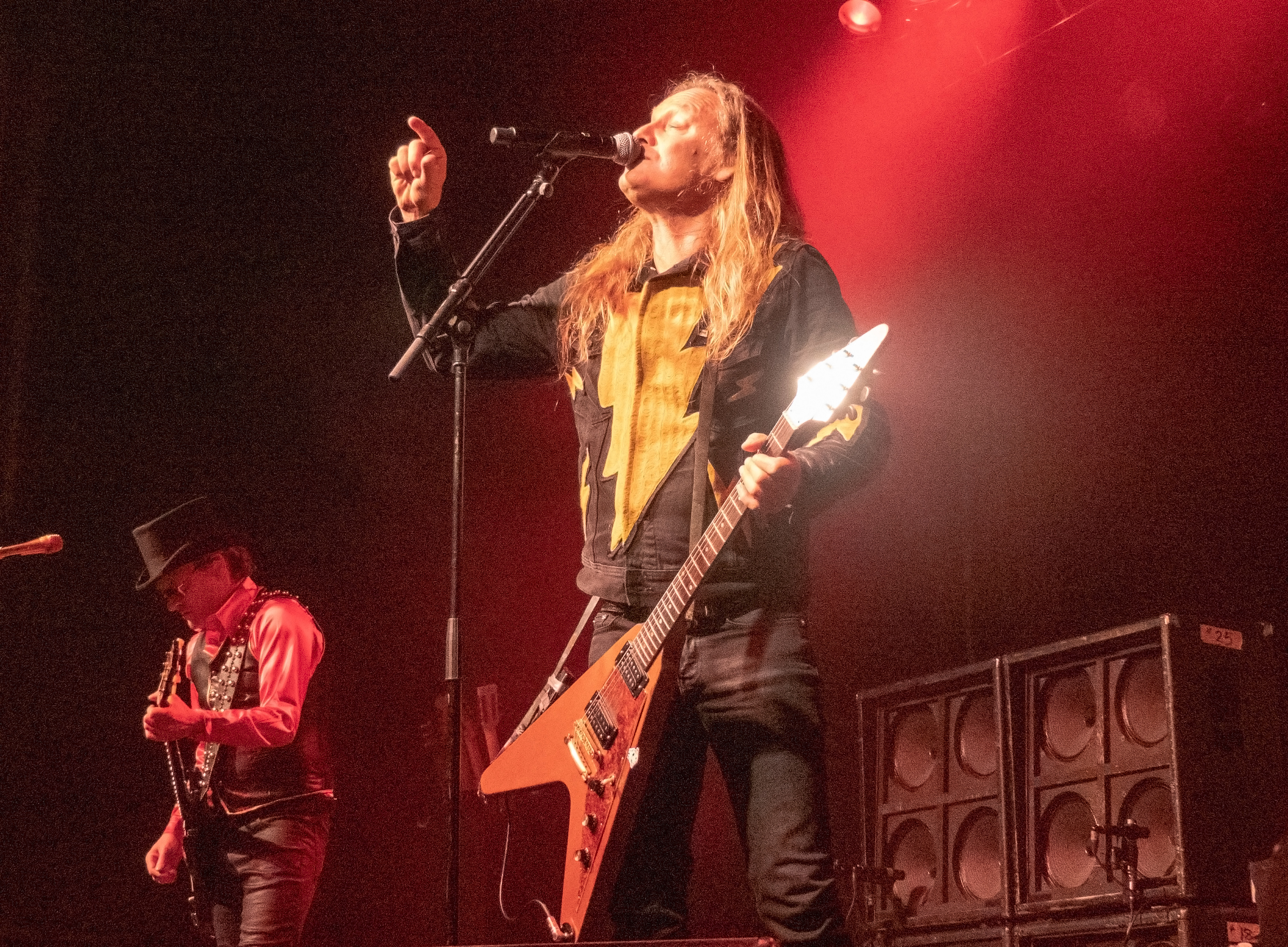 Um 20 Uhr war es schließlich soweit: pünktlich wie die Maurer betraten die Helsinki Vampires die Bühne und gaben mit „Devils“ als Opener direkt ordentlich Gas. Es folgten „Don´t Turn Your Back On Fear“, „Feel Berlin“ und das BOYCOTT-Cover „Gotta Rock“, bevor Sänger Jyrki sich das erste Mal ans Publikum wandte und die Menge begrüßte. Offenbar stand die Band im Rahmen der Doppel-Headliner-Tour etwas unter Zeitdruck was ihr Set anging, denn die Ansagen und Überleitungen waren diesmal ungewohnt spärlich und kurz gehalten – vermutlich, um die zur Verfügung stehende Zeit maximal musikalisch ausnutzen zu können. Dessen ungeachtet strotzte die Band vor Energie, das Set war garniert mit Klassikern wie „The Chair“, „Betty Blue“, „Never Say Die“ und „Gothic Girl“ und der Schwerpunkt lag eindeutig auf ebenso bewährten wie beliebten Live-Hits, was das Publikum sichtlich zu schätzen wusste. Ausflüge in jüngere musikalische Gefilde waren eher die Ausnahme, einzig „Death of Darkness“ und „Drive“ waren jüngeren Datums und stammten vom aktuellen, gleichnamigen Album „Death Of Darkness“. Die Stimmung bei Publikum und Band war gut und aufgrund der Auswahl der Setlist wehte ein Hauch von Nostalgie durch die Live Music Hall, der auch Jyrki 69 nicht verborgen blieb: „Wow, feels like it´s 2009 again!“ Zwar waren die Finnen seitdem durchaus in Köln zu Gast gewesen, allerdings, wie Jyrki hervorhob, sicher gute 15 Jahre lang nicht mehr in der Live Music Hall. „This city means a lot to us. Thank you all for coming, there´s so many old friends here. And if you´re here to see us for the first time: thank you, too, welcome! Maybe I´ll buy you a drink later on!” Ob diese Ankündigung später auch in die Tat umgesetzt wurde, bleibt offen, aber auch ohne Bestechung überzeugte die Band mit Spielfreude und guter Laune. Leider war der Sound nicht ganz rund und die Keyboards blieben im Gesamtklang etwas auf der Strecke, was aber nicht so gravierend war, dass es das Gesamterlebnis ernsthaft belastet hätte. Der eine oder andere keyboardgetragene Melodiebogen, beispielsweise beim Ur-Klassiker „Wasting The Dawn“ (Jyrki: „Please don´t cry now, this is such a sad song!“), ging dadurch jedoch leider ein wenig unter. Spaß machte das Lied trotzdem, kleine geistige Zeitreise inklusive. Drummer Jussi 69 spielte sich wie üblich einen Wolf -- der Mann trommelt wahrscheinlich auch noch im Schlaf – und bekam seinen traditionellen Kurzauftritt am Mikrofon bei „Brandon Lee“, mit dem das reguläre Set schloss und das vom Publikum standesgemäß gefeiert wurde. Die Zugabe ließ nicht lange auf sich warten, flugs standen die Goth´n´Roller wieder auf der Bühne und legten mit „Framed In Blood“ vom damals hocherfolgreichen Album „Blessed Be“ nach, gefolgt von „Dance D´Amour“, ebenfalls ein inzwischen unsterblicher Bandklassiker. Apropos unsterblich: man könne beruhigt auch weiterhin auf die 69 Eyes bauen, „because Vampires never die!“, so Jyrki 69. Und um diesen Anspruch zu untermauern folgte der inzwischen traditionelle Rausschmeißer in Form von „Lost Boys“, der dem Publikum nochmal ordentlich einheizte, bevor die Finnen unter reichlich Dankesbekundungen und in die Menge geworfenen Plektren zu den Klängen von „Paint It Black“ von den Rolling Stones nach einer Spielzeit von 75 Minuten endgültig abgingen. Sie hätten durchaus gerne noch etwas länger bleiben dürfen, zumal sich die Umbaupause bis zu D-A-D eine Dreiviertelstunde hinziehen sollte.