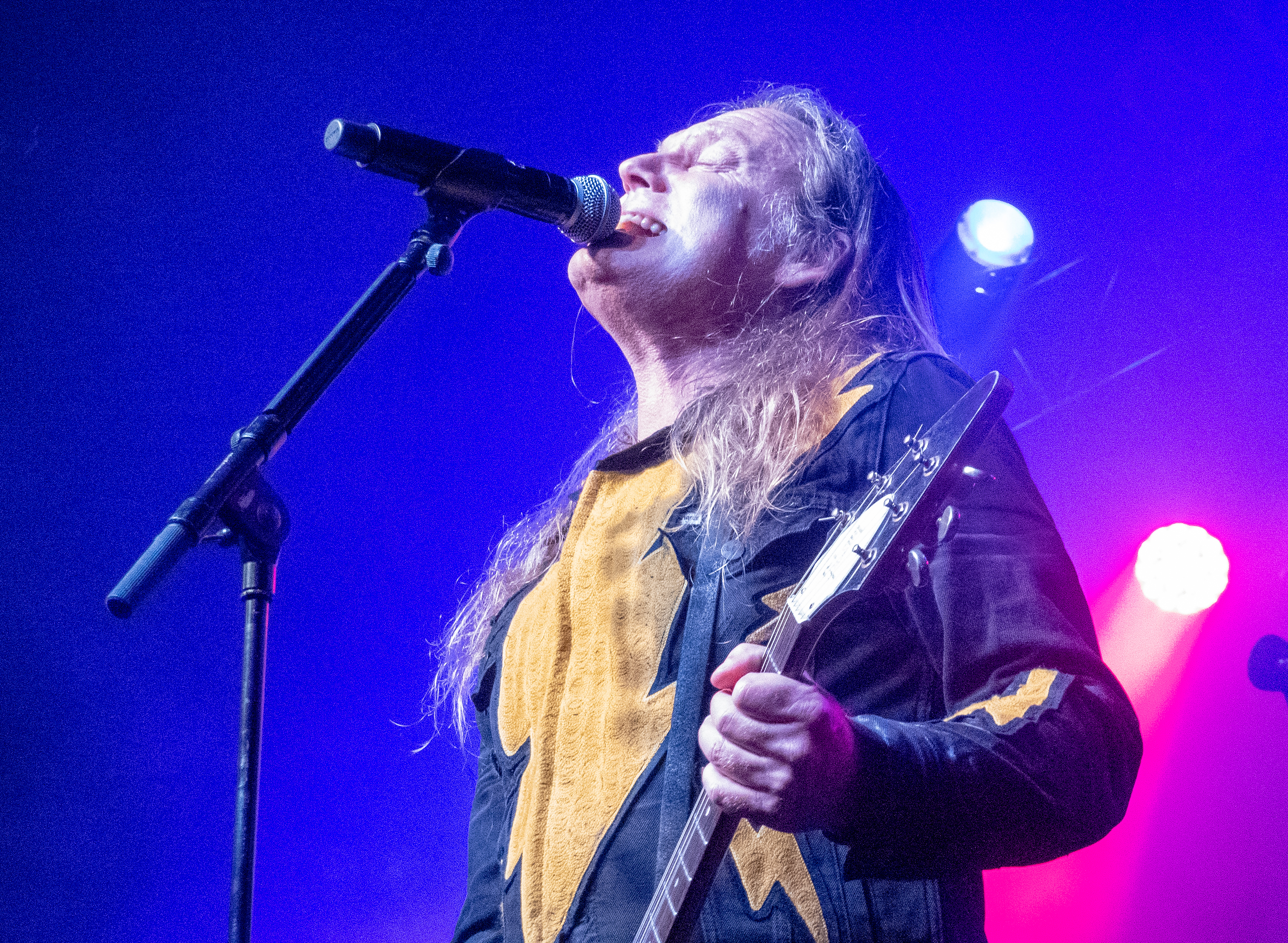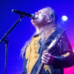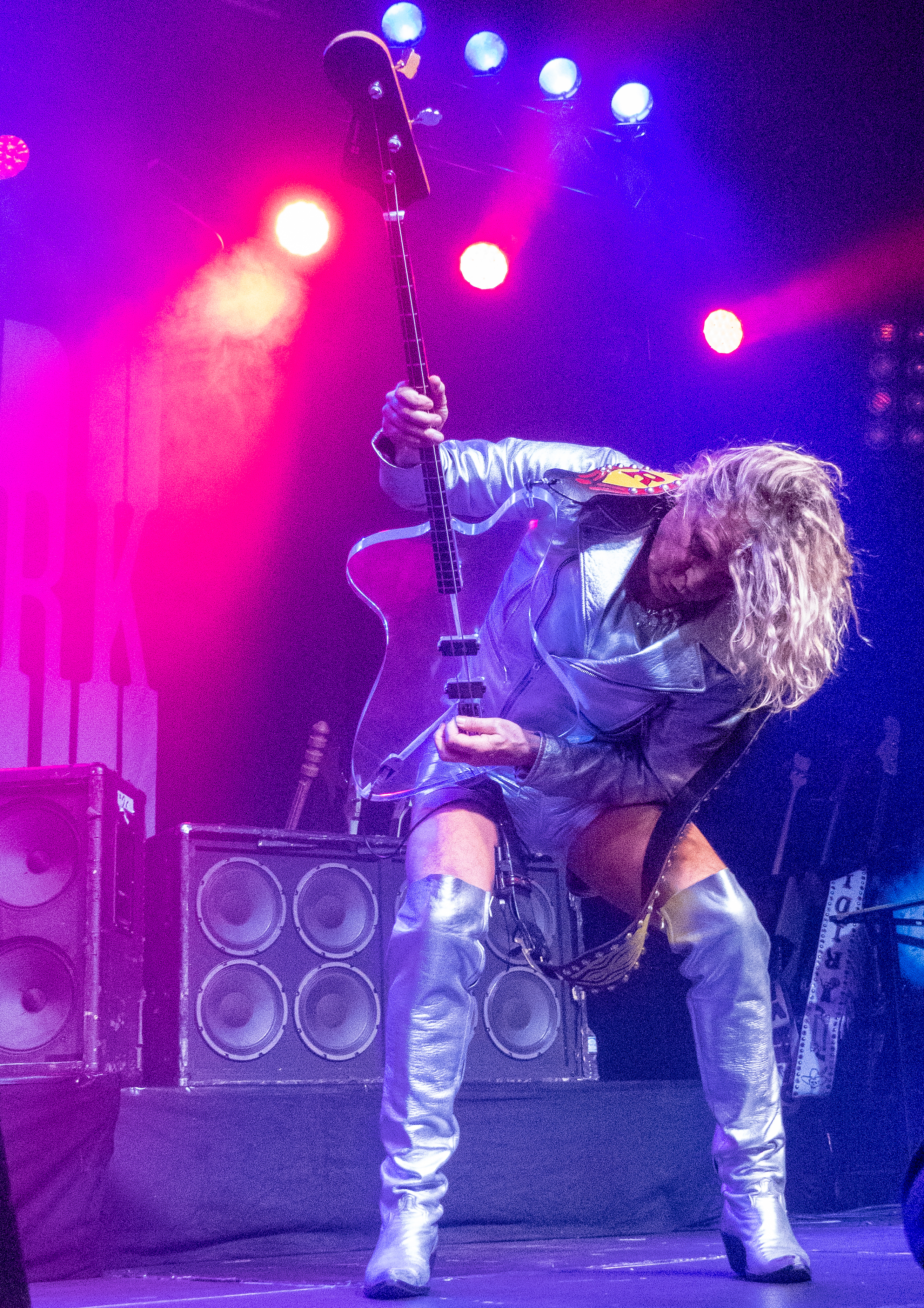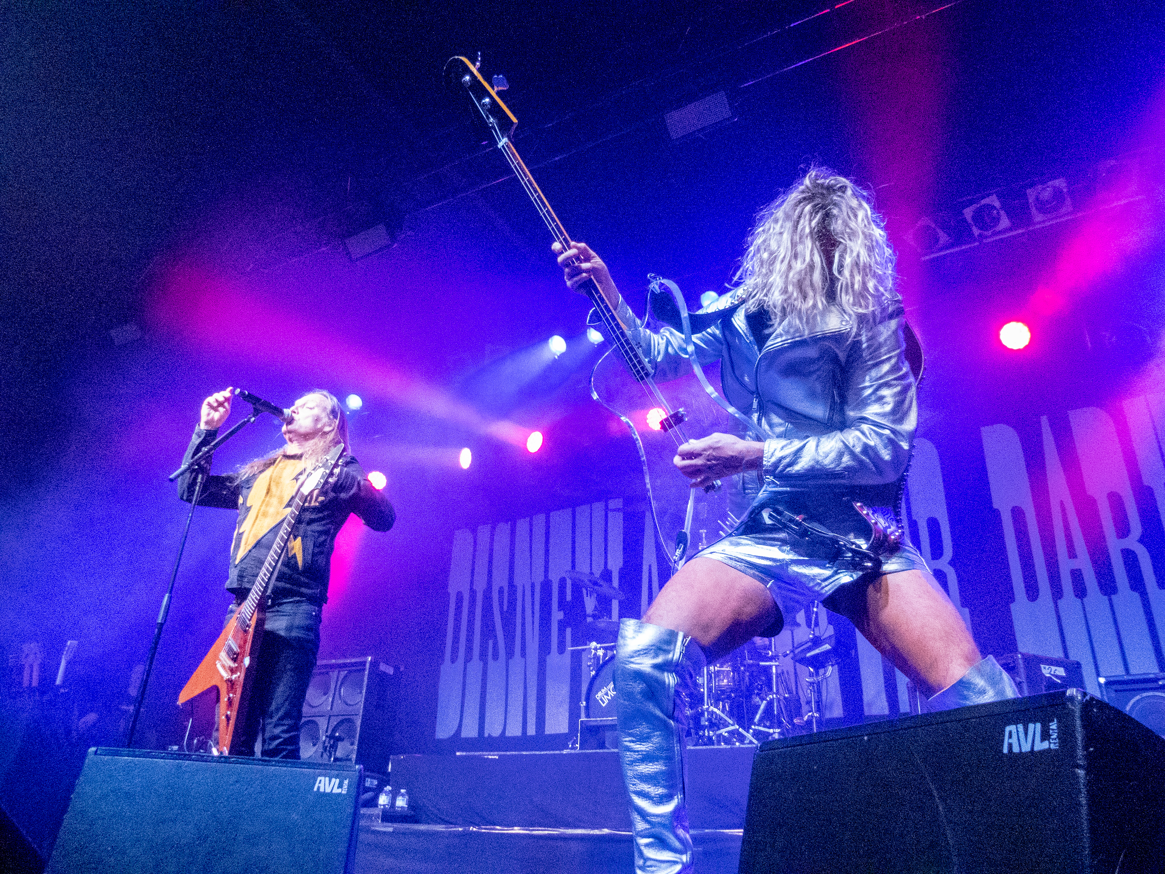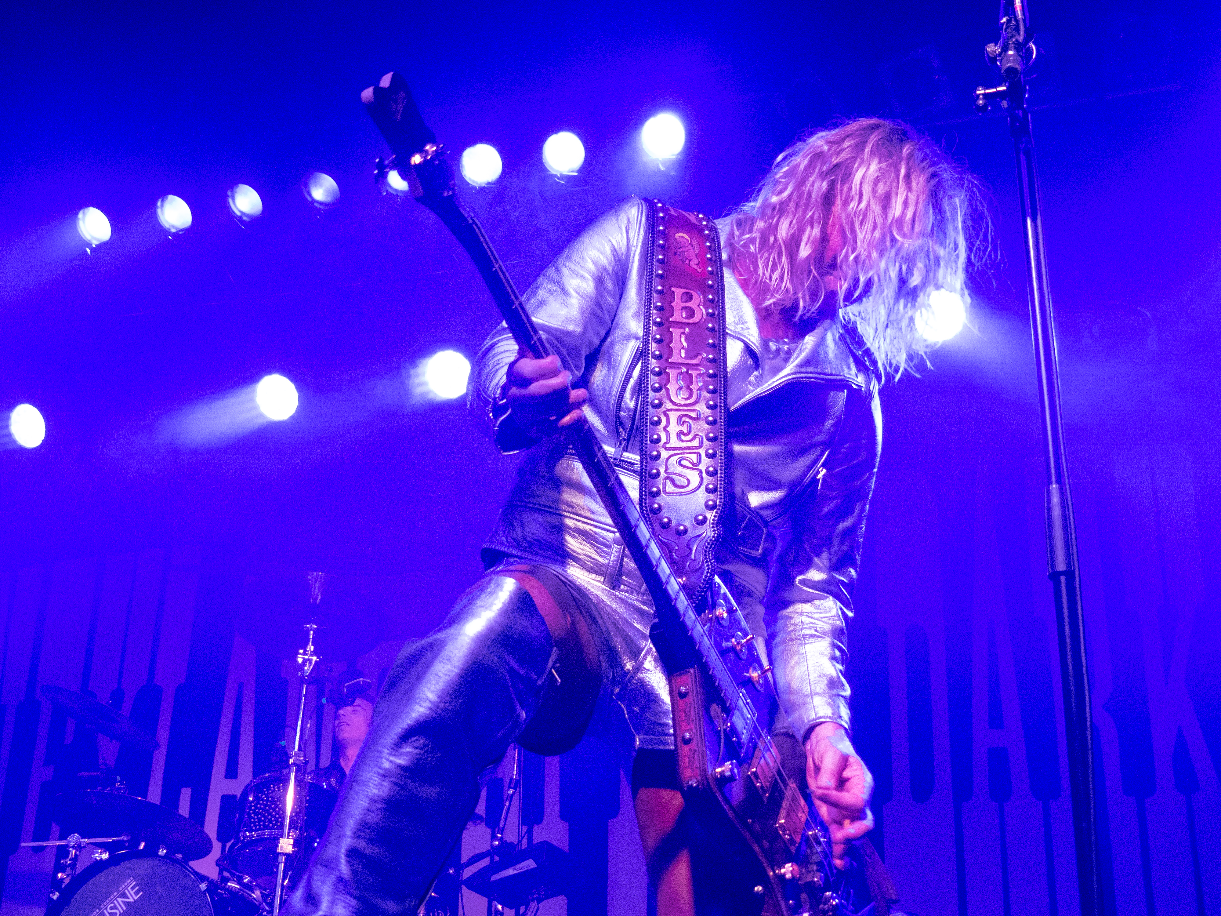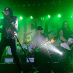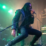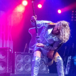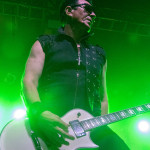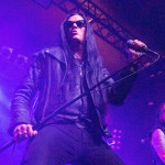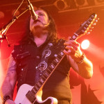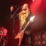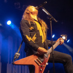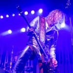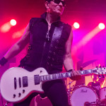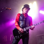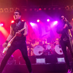 Während in der Umbaupause Instrumente und das Banner an der Bühnenrückseite getauscht wurden, nutze das Publikum die Gelegenheit, sich neu mit Getränken zu versorgen, kurz frische Luft zu schnappen und sich insgesamt neu zu sortieren. Tendenziell wanderte der gothic-lastigere Teil der Menge weiter nach hinten, um das weitere Geschehen von dort entspannt verfolgen zu können und überließ die vorderen Plätze den Metalheads unter den Anwesenden. Um 22 Uhr fiel erneut der Startschuss und mit D-A-D betraten die zweiten Headliner des Abends die Bühne. Zwar sind THE 69 EYES in punkto Bühnenerfahrung weiß Gott schon alte Hasen, die Kollegen von D-A-D können aber nochmal eine Schippe drauflegen: seit 1982 treiben die Dänen mittlerweile ihr musikalisches Unwesen. Weise mögen sie in dieser Zeit vielleicht geworden sein, leise aber jedenfalls ganz sicher nicht und auch die schrillen Outfits von Stig Pedersen sind unverändert mit am Start - diesmal zu bewundern in Form eines silbernen Metallic-Outfit samt knappem Höschen und Overknee-Stiefeln, stimmig kombiniert mit den abenteuerlichsten Bässen, die die Zunft der Instrumentenbauer hergibt. Los ging es mit „Jihad", gefolgt von „1rst, 2nd & 3dr" vom aktuellen Album „Speed Of Darkness“. Sänger Jesper Binzer war rührend bemüht, seine Ansagen weitestgehend auf Deutsch zu bestreiten, auch wenn er dazu mitunter nach Worten suchen und zwischendrin dann doch fluchend ins Englische wechseln musste, um sich zu behelfen – das Publikum honorierte seine Bemühungen jedoch angemessen und belohnte jede Nachfrage, ob man ihn denn verstünde mit donnerndem Applaus, zumal der Däne dabei wirklich sympathisch rüberkam. Bassist Stig Pedersen spielte sowieso in seiner eigenen Welt, mit Instrumenten, die mitunter schon eher Designobjekten als Bässen glichen und die er naturgemäß entsprechend in Szene zu setzen wusste, wobei er immer wieder wie eingefroren in einzelnen Posen erstarrte, wenn er nicht gerade auf den Verstärkern oder am Schlagzeug herumturnte. Die Form der Bässe reichte vom Rinderschädel über ein durchsichtiges Modell mit Beleuchtung bis hin zum Eisernen Kreuz mit Flugzeugkopfstück. Mit Songs wie „Rim Of Hell“, „The Ghost“ und „Grow Or Pay” stampfte man sich gut gelaunt durchs Programm, zwischendrin sorgte das balladeske „Something Good“ mit ausgedehntem, getragenem Gitarrensolo für ruhigere Momente. Bei „Monster Philosophy“ musste das Publikum ran und skadieren: „Los, zeigt mir euer rhythmisches Talent hier in Köln! Ich weiß ihr könnt so einen Rhythmus halten!“. „Everthing Glows“ hingegen wurde genutzt, um das Publikum eine Hymne auf Drummer Laust Sonne singen zu lassen: „Laust, du bist so jung und schön! Laust, wir lieben dich!“ Am Ende des regulären Sets, vor Beginn der Zugabe, gingen die Zuneigungsbekundungen dann in die andere Richtung und ein sichtlich gerührter Jesper Binzer bedankte sich aufrichtig, nachdem die Menge vor der Bühne „Bad Craziness“ mit tosendem Applaus belohnt hatte: „Ganz perfekt, ihr Lieblinge, Köln! Danke! Danke, danke!“ Nach „Sleeping My Day Away“ und „It´s After Dark” fand dann auch der zweite Teil des Abends ein gelungenes Ende und entließ Musiker wie Konzertbesucher zufrieden in die Nacht.