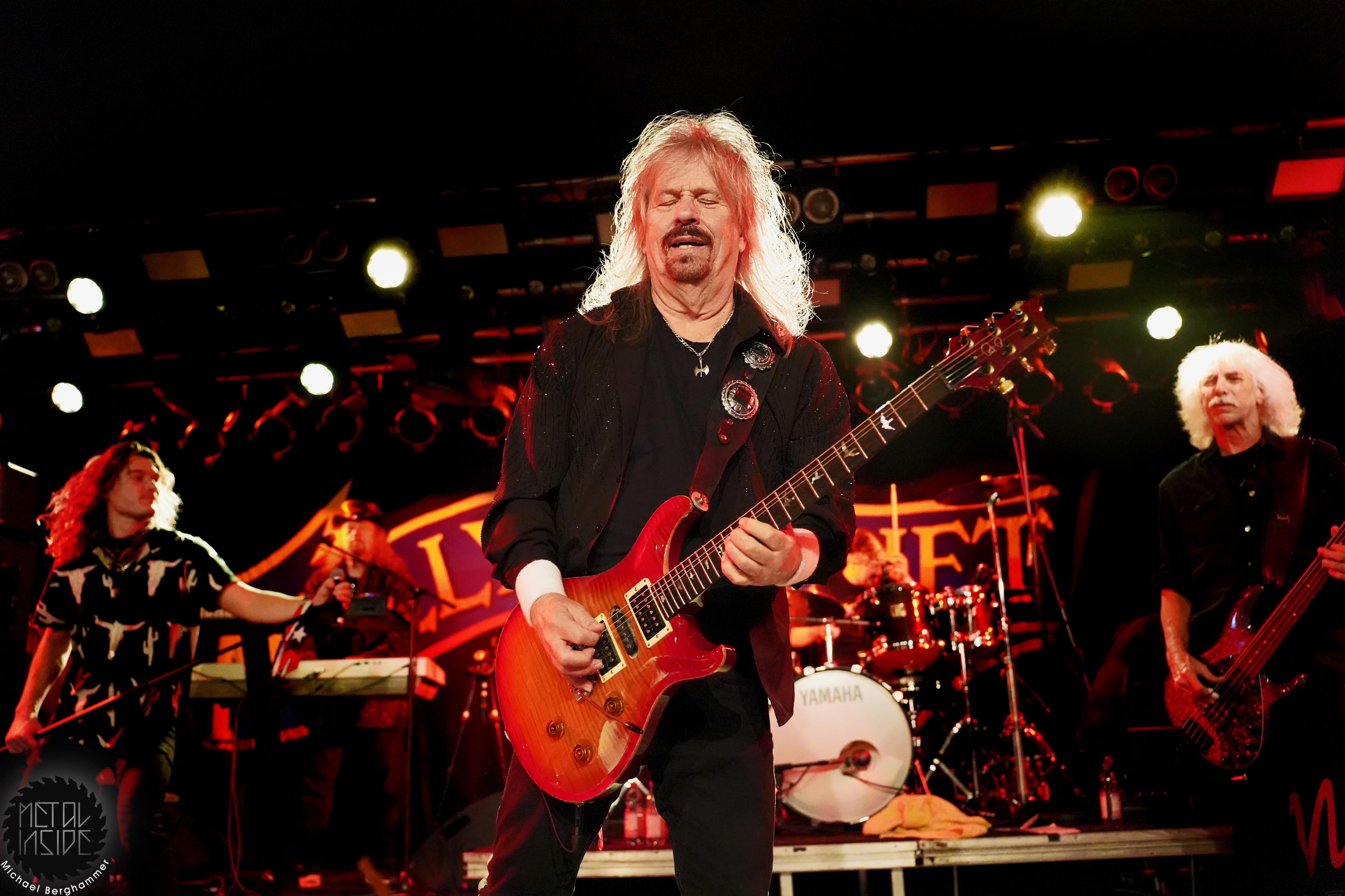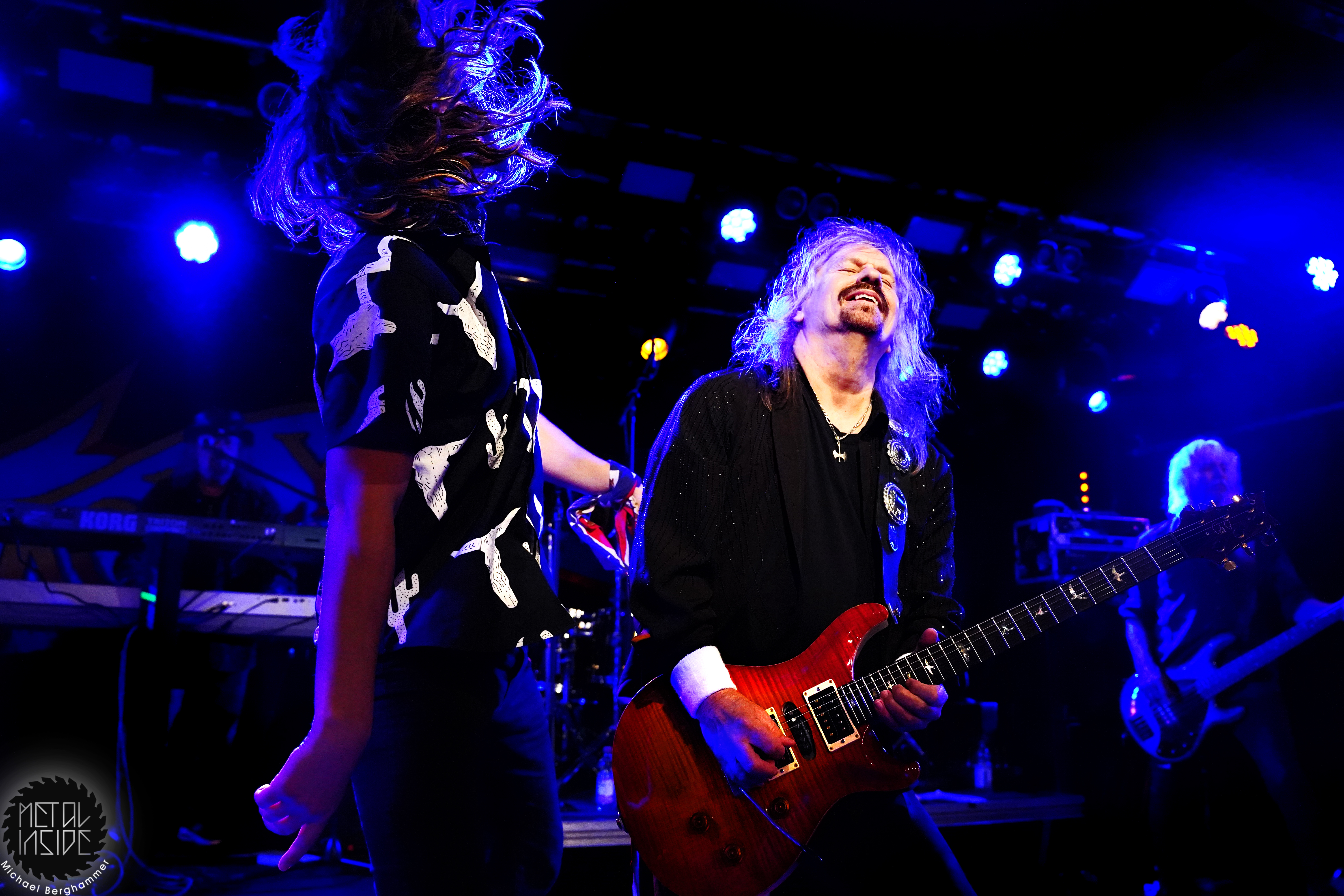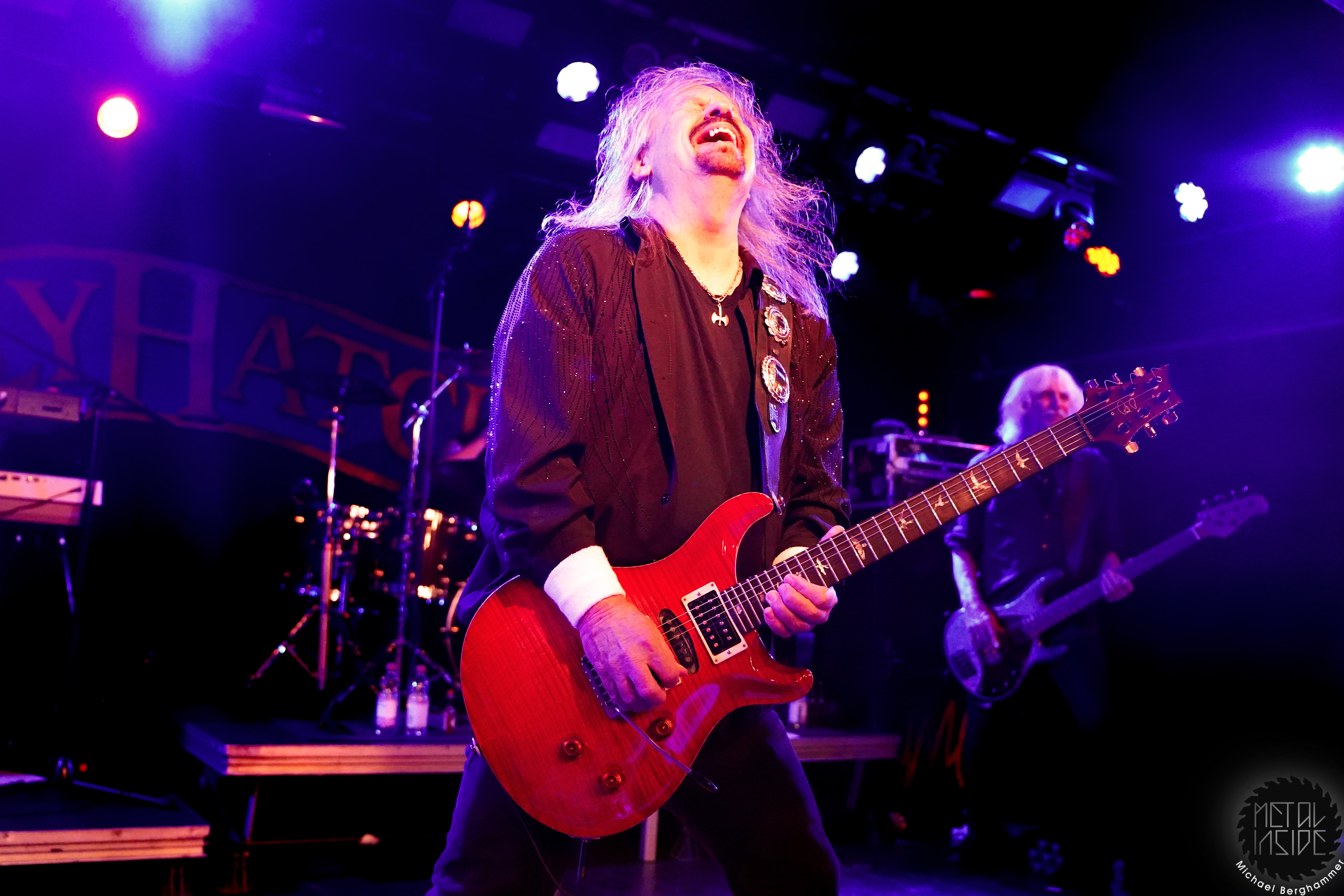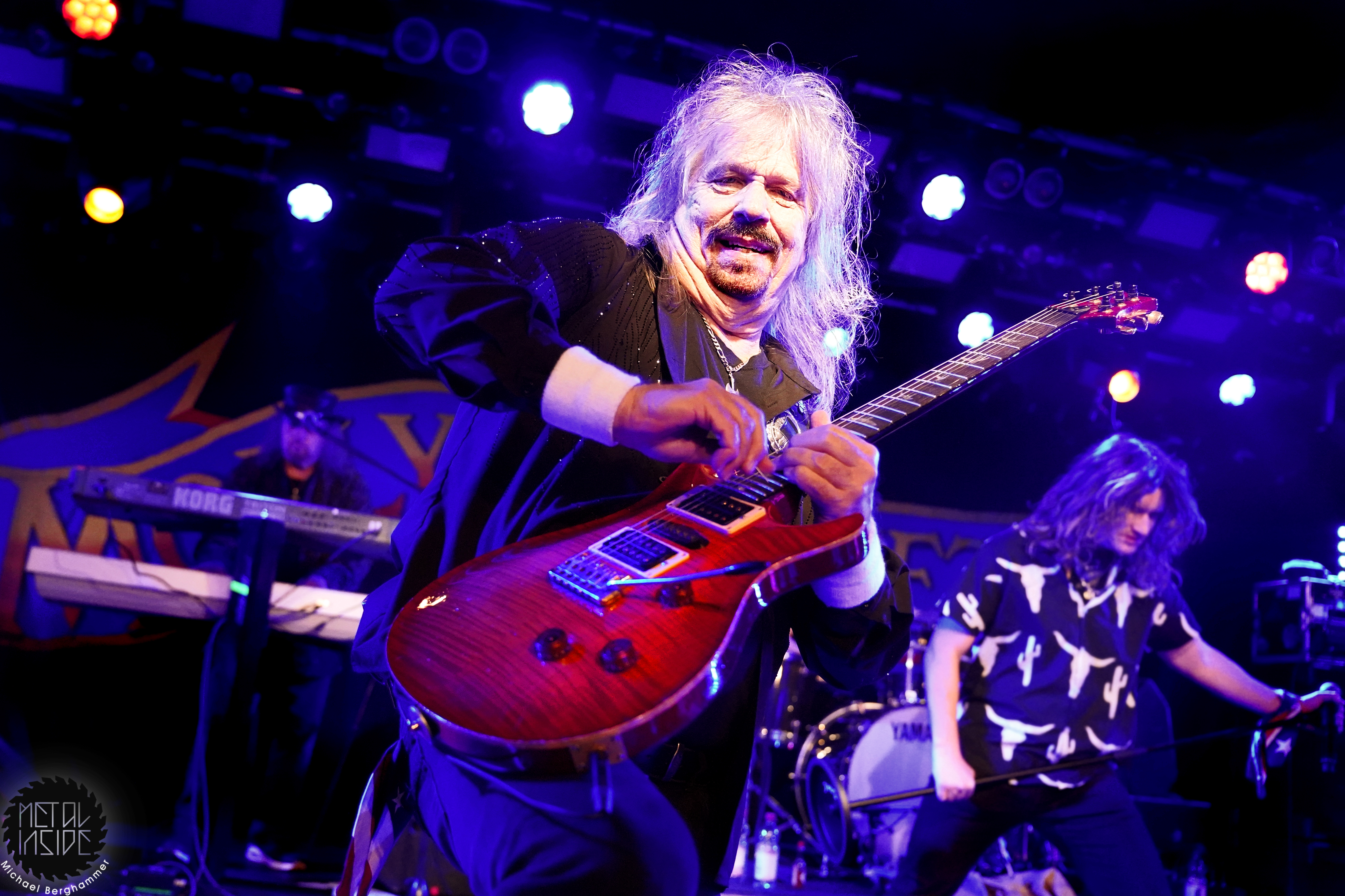 Bei der amerikanischen Southern Rock Legende MOLLY HATCHET hat das große Backdrop durchaus seine Berechtigung. Der Gig beginnt mit irritierenden Soundjustierungen an der Gitarre von Bobby Ingram, mit der Band bereits auf der Bühne, dazu ein Roadie, den wir immer mal wieder auf der Bühne “bewundern“ dürfen. Problem behoben, los geht’s mit “Whiskey Man“. Der Sound passt jetzt, bis auf den Gesang, und Bobby strahlt und spielt sich wahrlich den kompletten Gig lang seinen Allerwertesten ab. Aber, und hier kommt der Recherche-Punkt, Bobby ist die einzige Gitarre - Southern Rock mit nur einer Gitarre, ist das überhaupt erlaubt? Waren MOLLY HATCHET nicht einst gestartet mit drei? Hier hätte geholfen, sich das zugegeben klasse Live-Album von 2019 “Battleground“ nochmal vorzunehmen, denn auch hier agiert Bobby größtenteils allein an den sechs Saiten. Schlimmer wiegt aber Sänger Parker Lee, immerhin schon seit 2023 bei MOLLY HATCHET, der junge, übermotivierte, etwas hampelige und in die Riege dieser alter Haudegen nicht im Ansatz passende Frontman. Weder gesanglich noch visuell kann der Amerikaner punkten, auch seine zum Teil deplatziert wirkenden Ansagen stören eher als dass sie Bindung schaffen. Und so wird das Colos-Saal zunehmend leerer. Dazu gesellt sich der von Beginn an schon bekannte Bühnenarbeiter, mal mit leuchtendem Handy, mal einfach nur so, und sorgt für weitere nachdenkliche Momente.