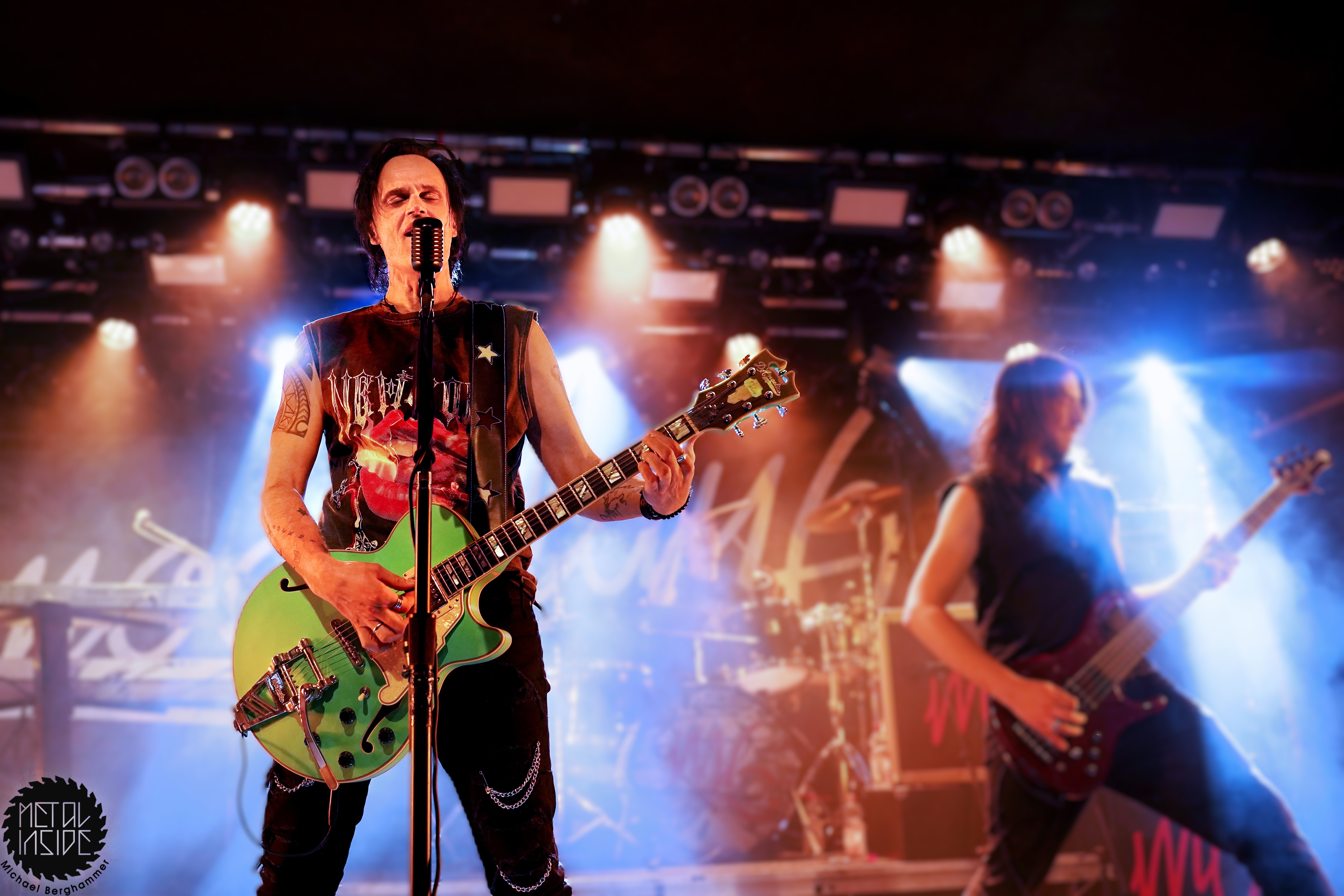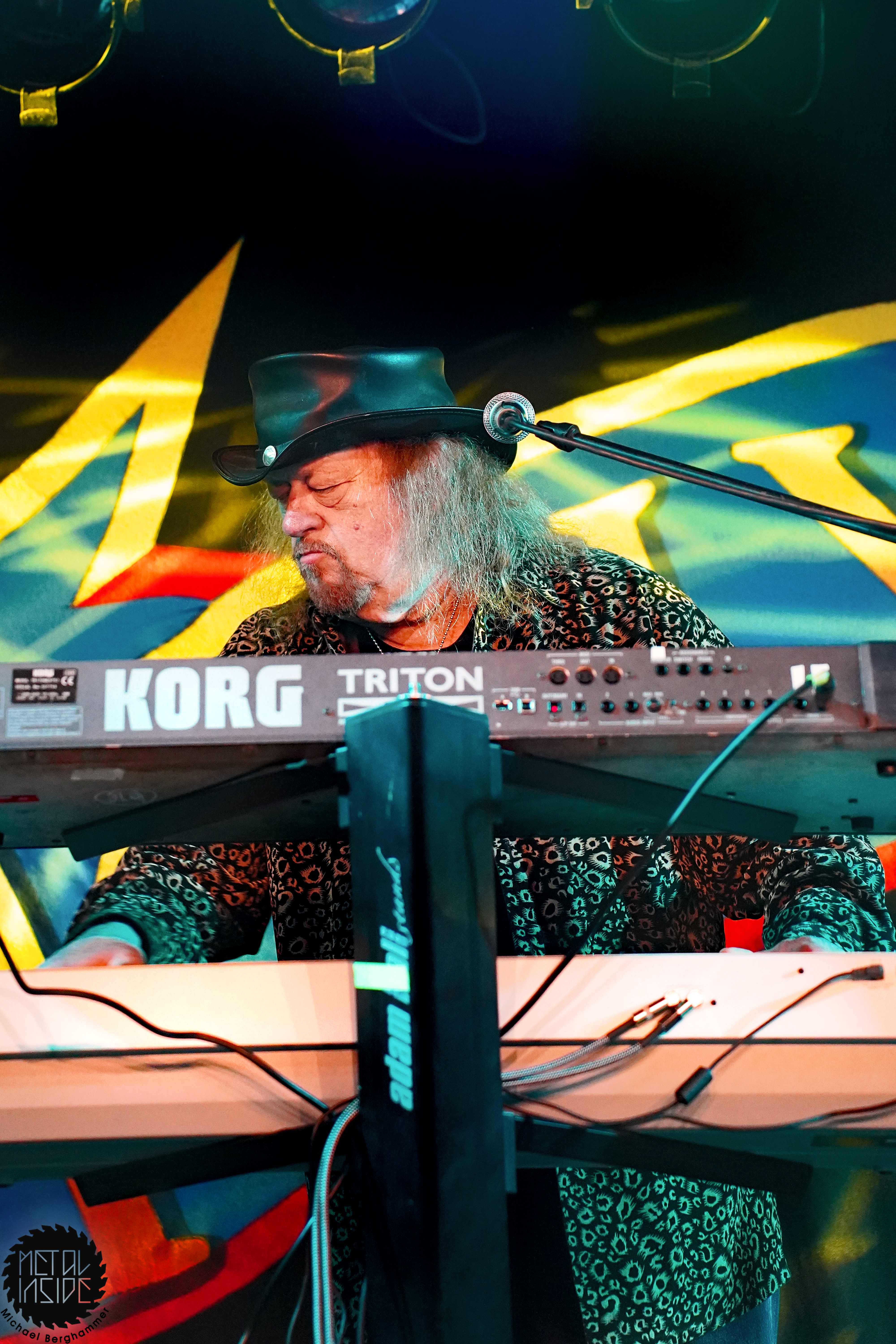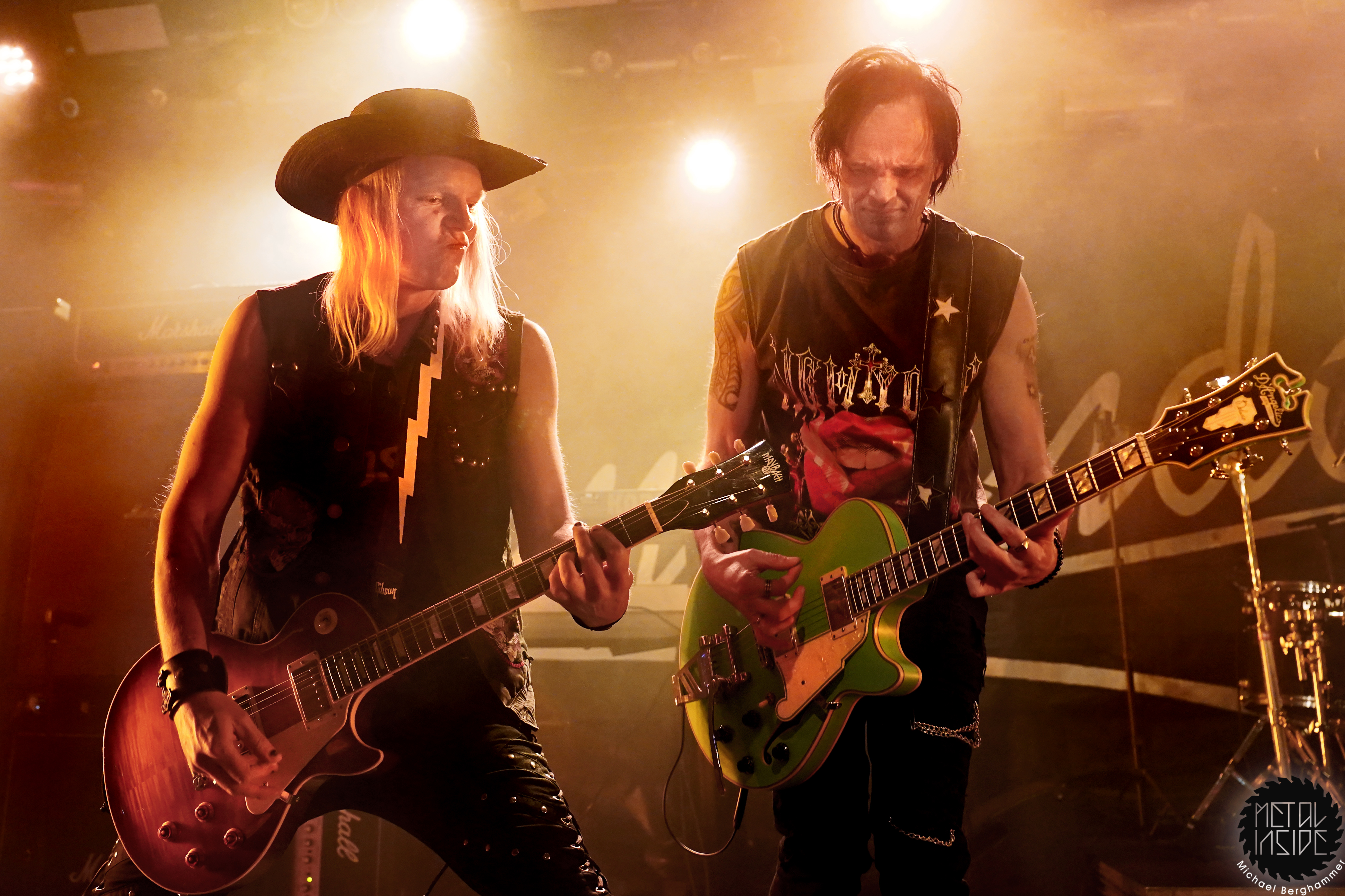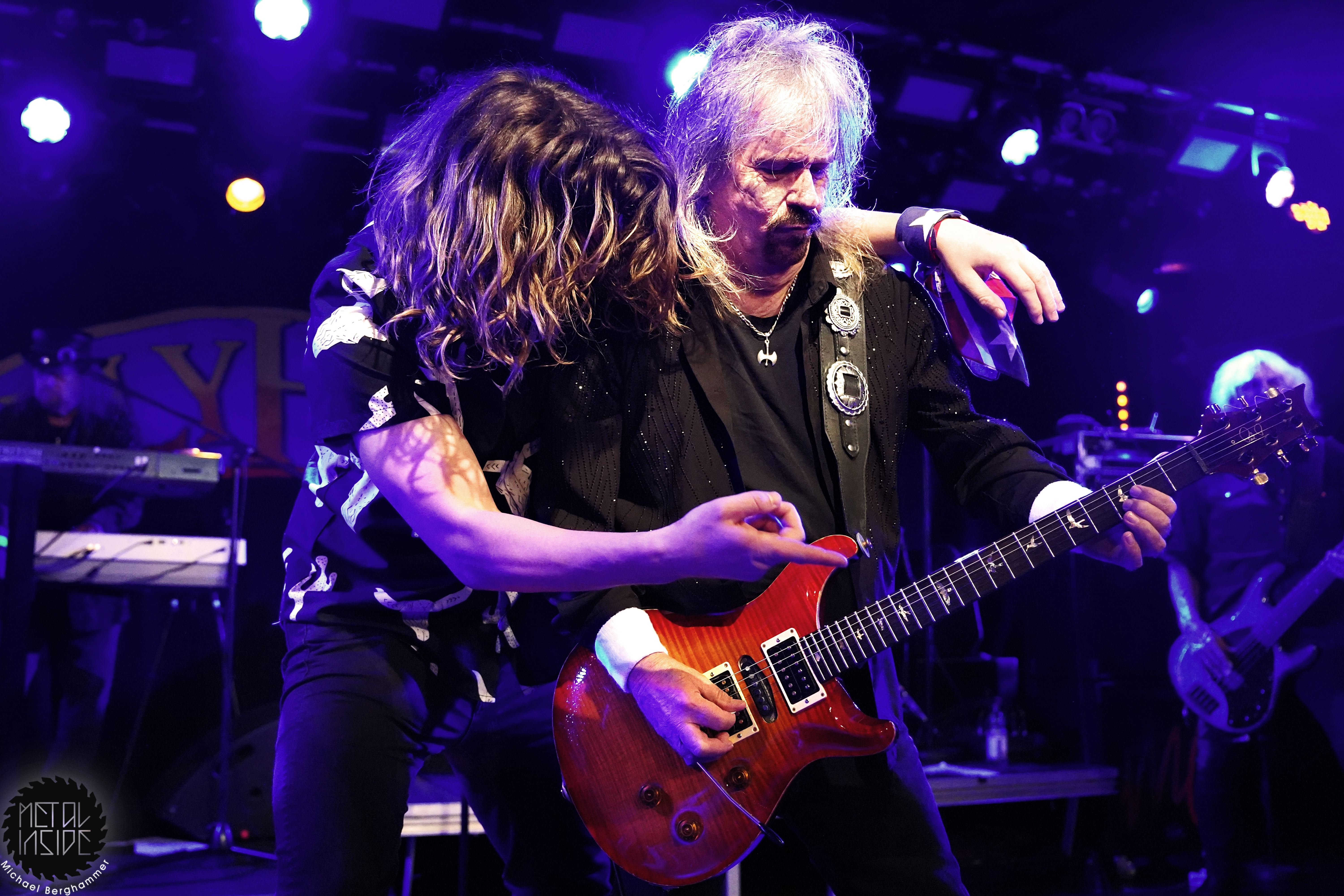 Bei der amerikanischen Southern Rock Legende MOLLY HATCHET hat das große Backdrop durchaus seine Berechtigung. Der Gig beginnt mit irritierenden Soundjustierungen an der Gitarre von Bobby Ingram, mit der Band bereits auf der Bühne, dazu ein Roadie, den wir immer mal wieder auf der Bühne “bewundern“ dürfen. Problem behoben, los geht’s mit “Whiskey Man“. Der Sound passt jetzt, bis auf den Gesang, und Bobby strahlt und spielt sich wahrlich den kompletten Gig lang seinen Allerwertesten ab. Aber, und hier kommt der Recherche-Punkt, Bobby ist die einzige Gitarre - Southern Rock mit nur einer Gitarre, ist das überhaupt erlaubt? Waren MOLLY HATCHET nicht einst gestartet mit drei? Hier hätte geholfen, sich das zugegeben klasse Live-Album von 2019 “Battleground“ nochmal vorzunehmen, denn auch hier agiert Bobby größtenteils allein an den sechs Saiten. Schlimmer wiegt aber Sänger Parker Lee, immerhin schon seit 2023 bei MOLLY HATCHET, der junge, übermotivierte, etwas hampelige und in die Riege dieser alter Haudegen nicht im Ansatz passende Frontman. Weder gesanglich noch visuell kann der Amerikaner punkten, auch seine zum Teil deplatziert wirkenden Ansagen stören eher als dass sie Bindung schaffen. Und so wird das Colos-Saal zunehmend leerer. Dazu gesellt sich der von Beginn an schon bekannte Bühnenarbeiter, mal mit leuchtendem Handy, mal einfach nur so, und sorgt für weitere nachdenkliche Momente.