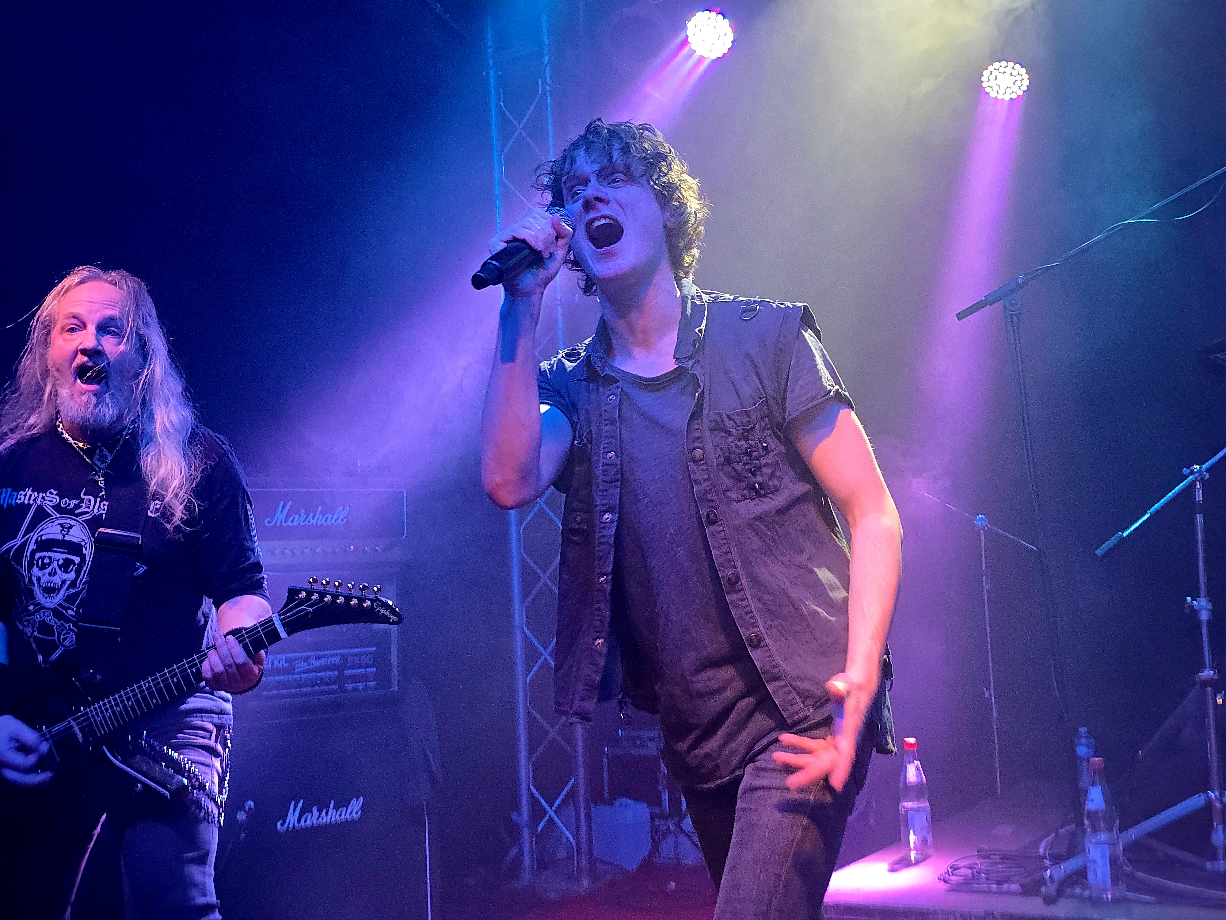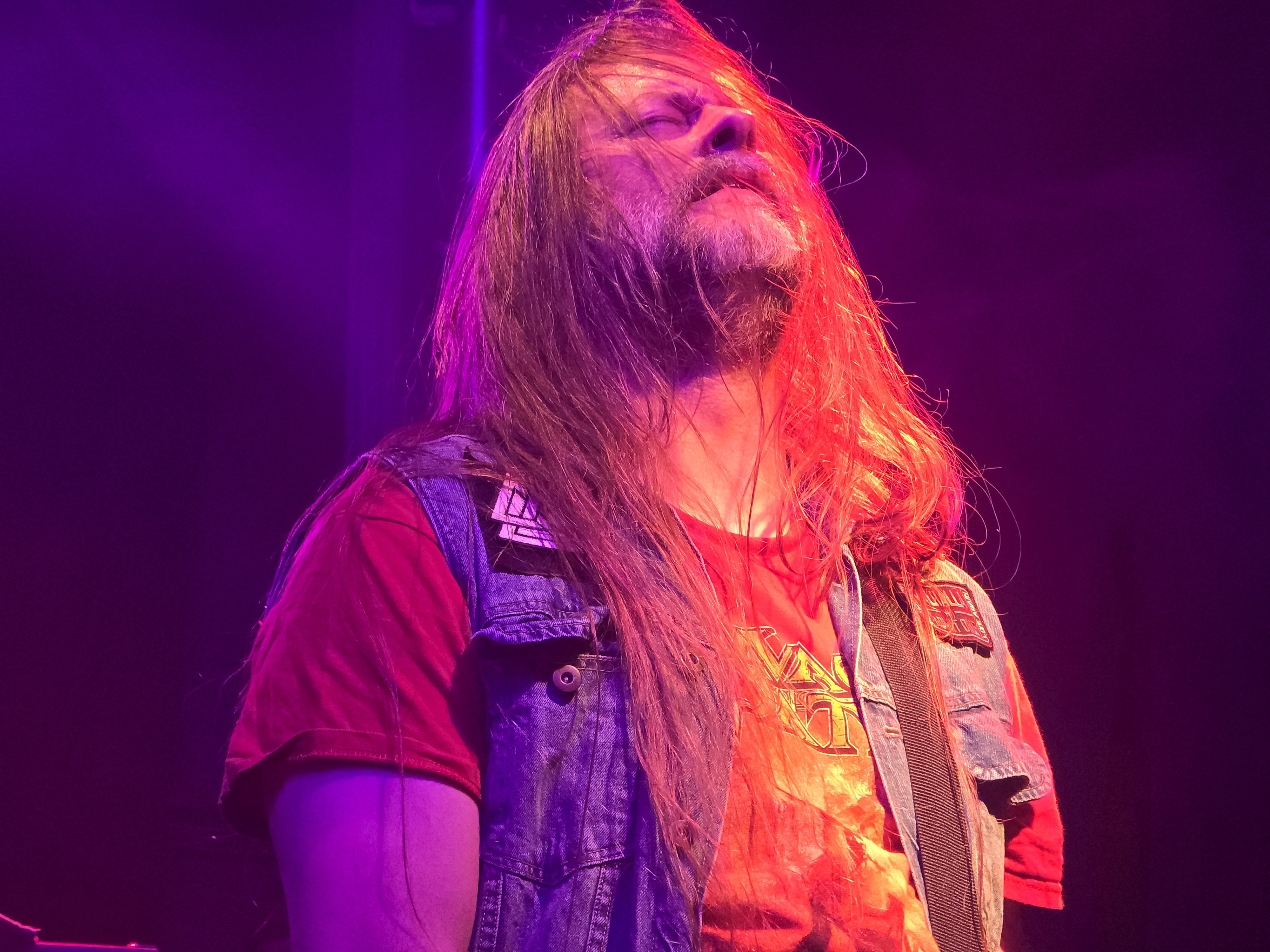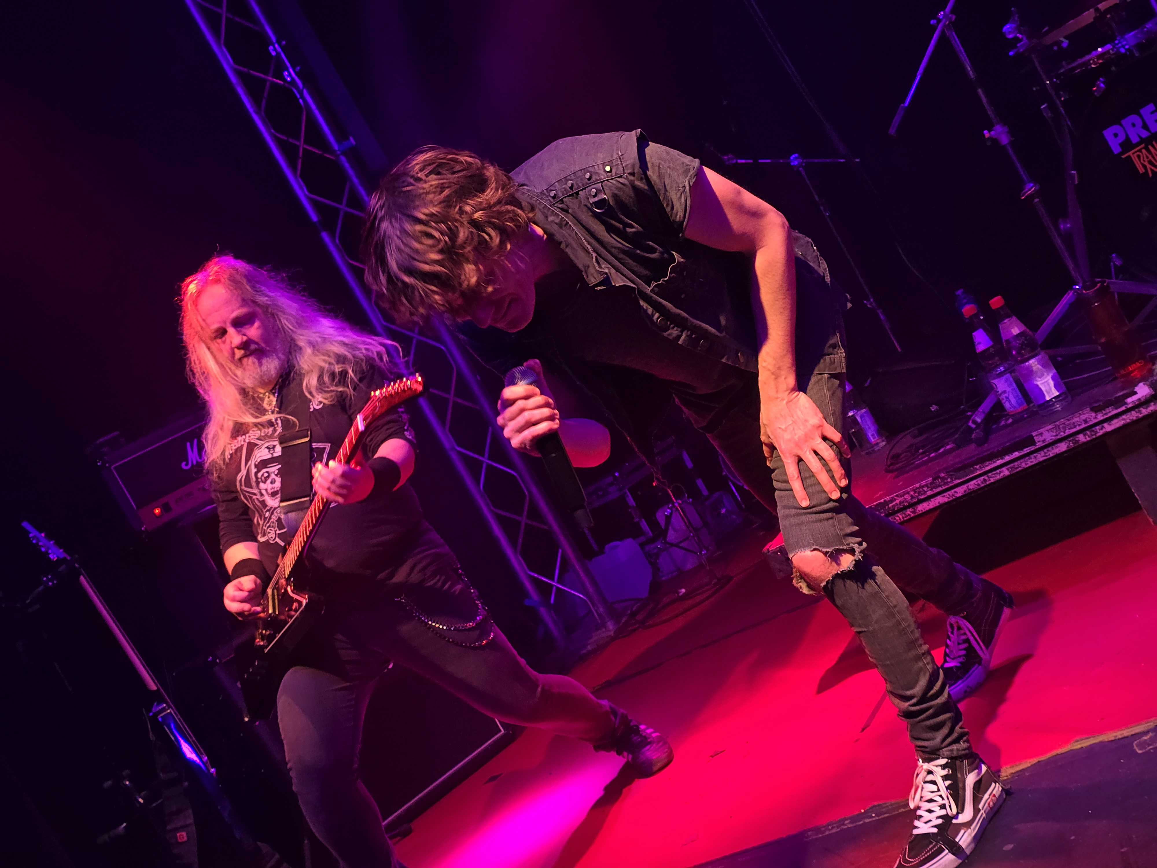 Durch SAINT’S ANGER kräftig aufgewärmt werden TRANCE lauthals empfangen. TRANCE haben es aktuell nicht gerade leicht. Denn nicht nur Gitarrist Markus Berger wird auf Grund von Krankheit von Wolfgang Buchinger ersetzt, sondern auch Sänger Alexx Stahl hütet das Lazarett und wird von seinem extra aus Holland angereisten Vorgänger Nick Hollemann vertreten. Man macht jedoch aus der Not eine Tugend und insbesondere Hollemann liefert eine Show der Extraklasse und es wirkt, als sei er nie weg gewesen. Der Mann ist ein Naturereignis und vereint eine energische aber immer hochsympathische Bühnenshow mit Champions League würdigem Gesang zu einer gnadenlos guten Performance. Dass der Monitor von Gitarrist Kalli den Dienst verweigert, wird vom Mann hinterm Mischpult so geregelt, als dass er alles andere einfach bis zum Anschlag aufreißt. Das ist dann gegen Ende schon grenzwertig. Aber die Band gibt hier nicht auf und rockt auch im Blindflug munter drauf los. Auf die Frage an den Soundmenschen, ob man das nicht irgendwie in den Griff bekommen könne, kommt die launige Antwort „TRANCE sollten einfach mal einen Song spielen“. Genau mein Humor. Und wie SAINT’S ANGER setzen auch TRANCE bis auf wenige Ausnahmen vornehmlich auf ihre Klassiker: „Heavy Metal Queen“, „Confession“, „We Are The Revolution“, „Rockstar“ oder das vielumjubelte epische „Loser“ sind Zeugnisse einer Band, die Anfang der 80er ganz vorne mit dabei war, es dann eben doch nicht in letzter Konsequenz geschafft haben, während die Mitbewerber dieser Zeit ACCEPT, SINNER oder auch die SCORPIONS gnadenlos davonzogen. Aber fast 45 Jahre später ist das völlig egal und man feiert die Songs als das, was sie sind: Underground Klassiker, die einer kleinen, aber feinen Fanschar viel bedeuten. Und so geht mit „Live & Heavy“ ein illustrer und sehr unterhaltsamer Abend im Zeichen des Heavy Metal zu Ende.