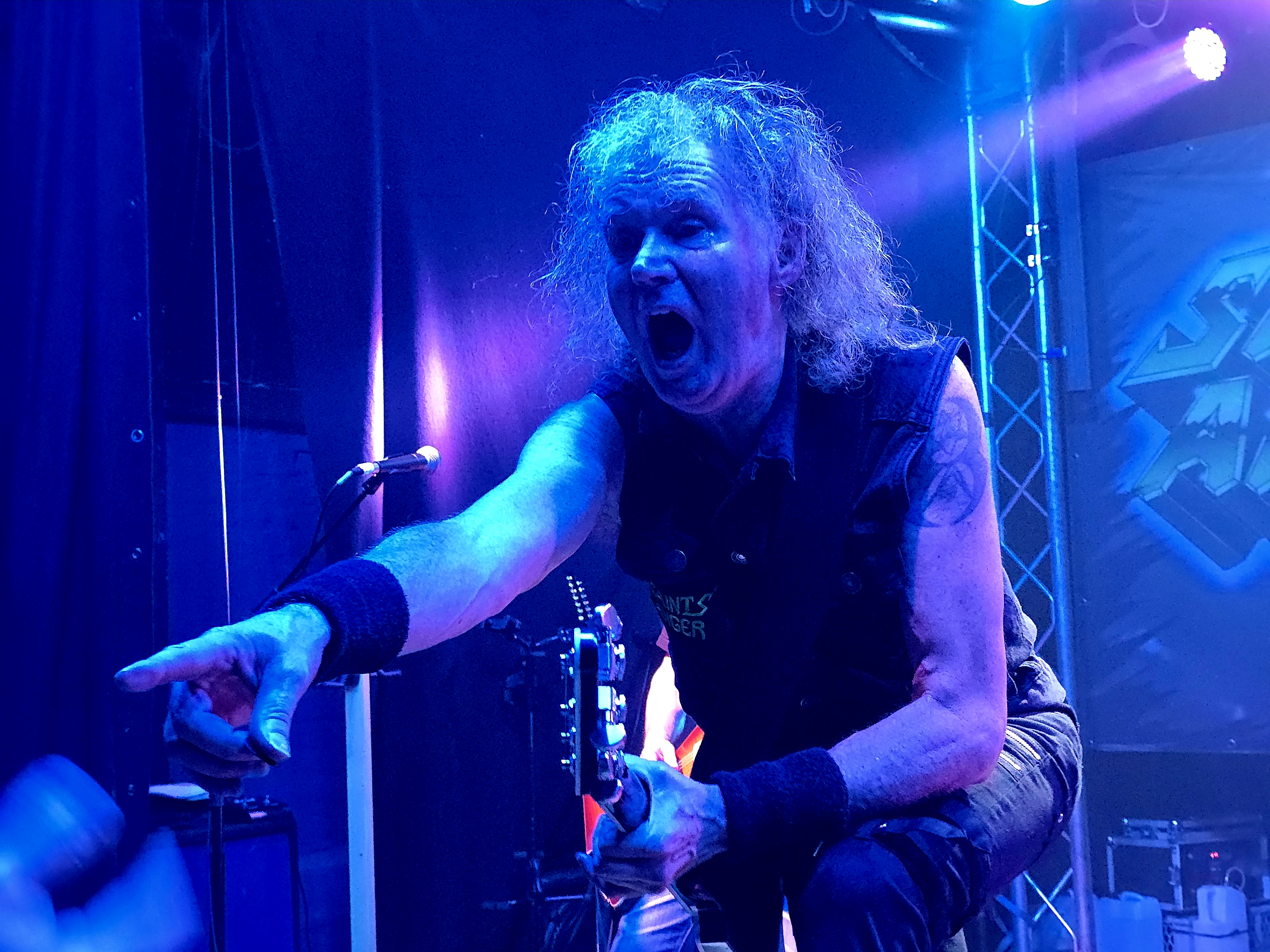 SAINT’S ANGER starten mit dem flotten „The Bullet“ und sofort fühlt man den Enthusiasmus und die Aufbruchstimmung, die Mitte der 80er in der deutschen Metalszene geherrscht haben muss. Frontmann Harald Piller klingt immer noch wie ein etwas melodischerer Udo oder erinnert an Reent Fröhlich, als der noch bei FACT das Mikro schwang. Die eingängigen und im besten Wortsinn naiven Metalhymnen verfehlen ihre Wirkung nicht und das erfreulicherweise recht angenehm gefüllte Rund geht begeistert mit. Mit „Danger Metal“, „Crashing On Steel“ oder „Hero“ wird weiter der kurzen Geschichte von SAINT’S ANGER gedacht. Man war zwar unter dem Namen PALACE viele Jahre musikalisch nicht untätig, aber heute geht es um die Roots und die werden dankbar aufgenommen. Sowohl von alten Hasen, die „damals schon dabei waren“, als auch von kuttentragendem Jungvolk, welches sich als erstaunlich textsicher erweist. Mein Respekt geht an Gitarrist Jürgen Knief, welcher augenscheinlich im Laufe des Sets massive Schmerzen an seiner linken Hand bekommt, die Show aber dennoch bis zum Ende durchzieht.