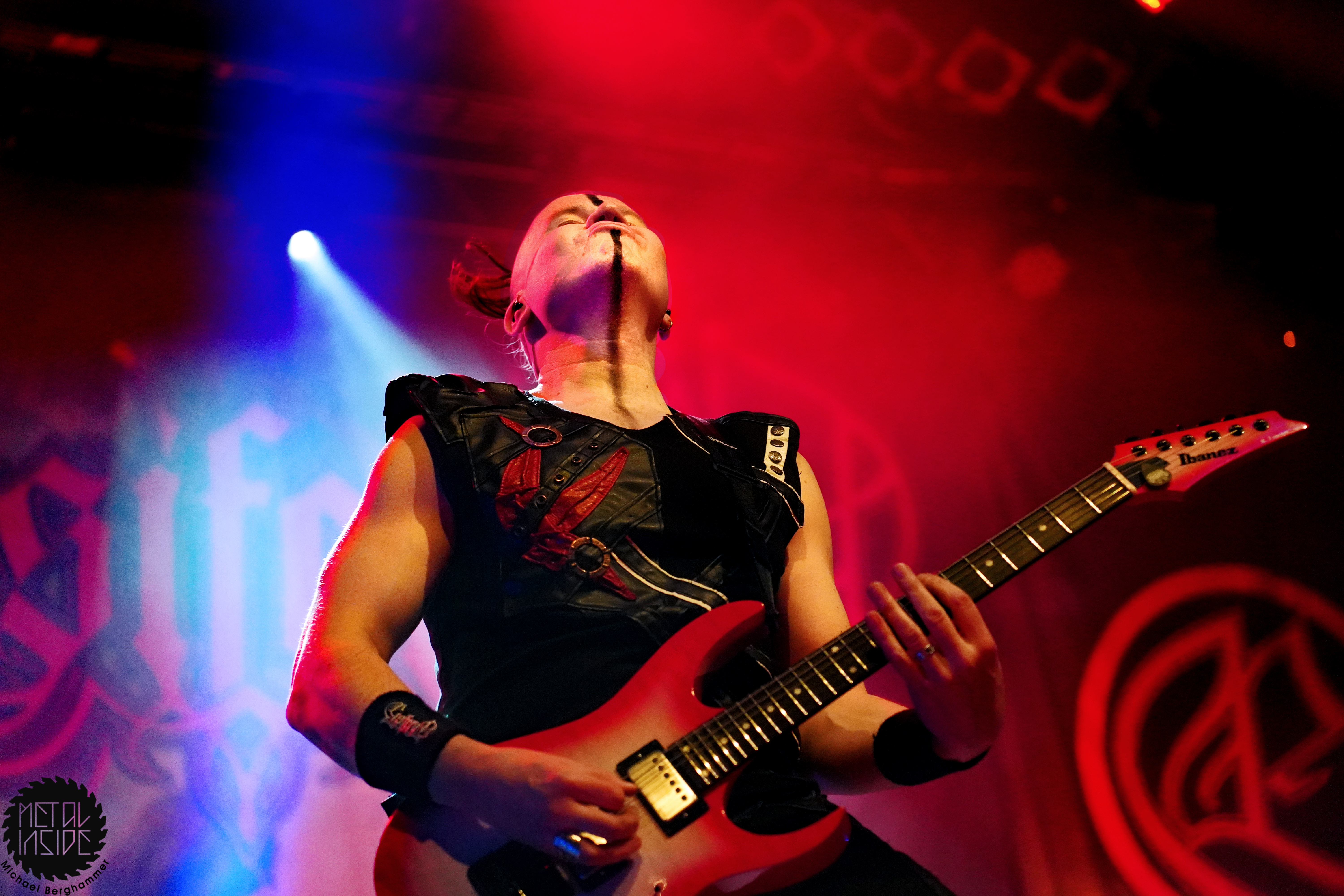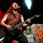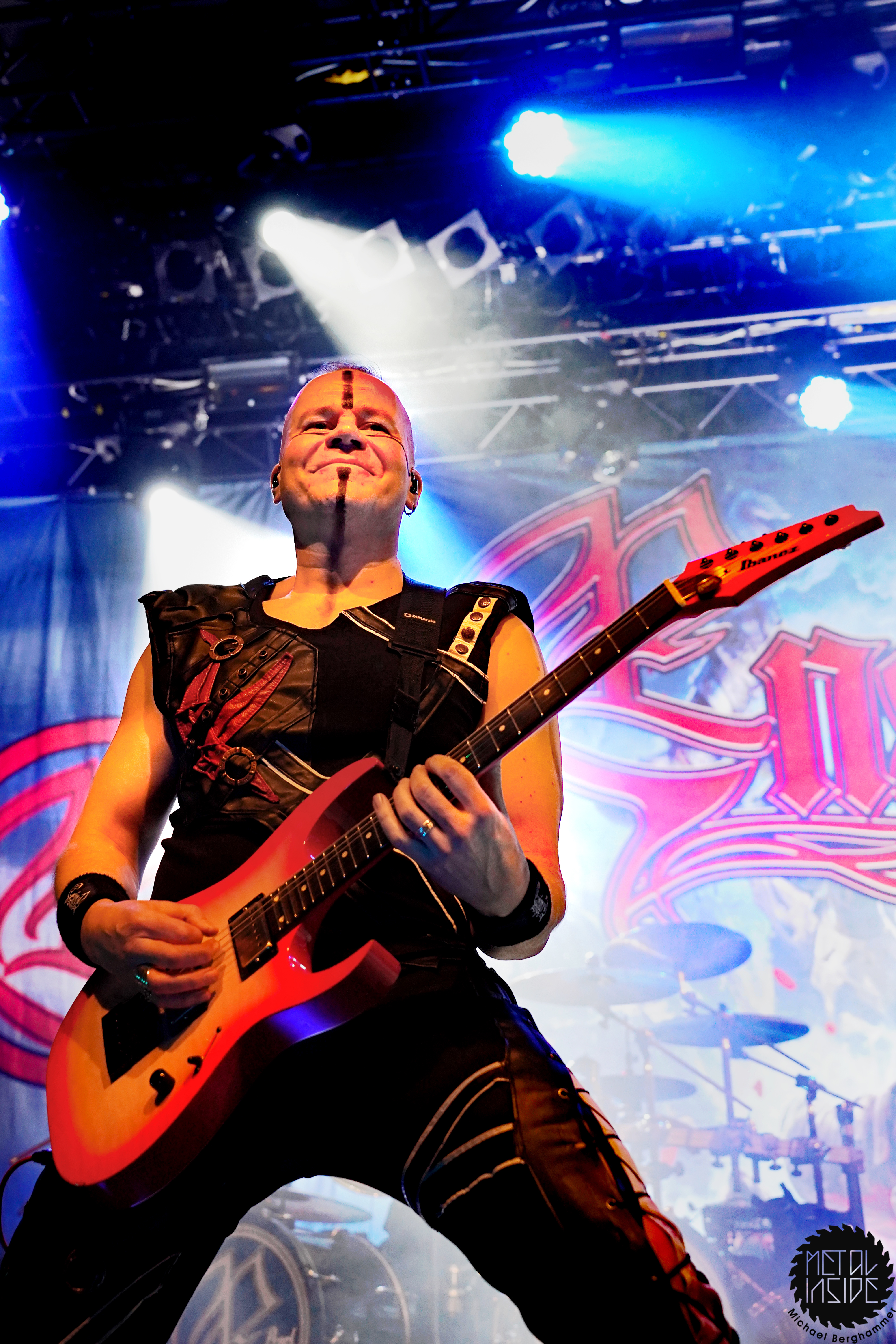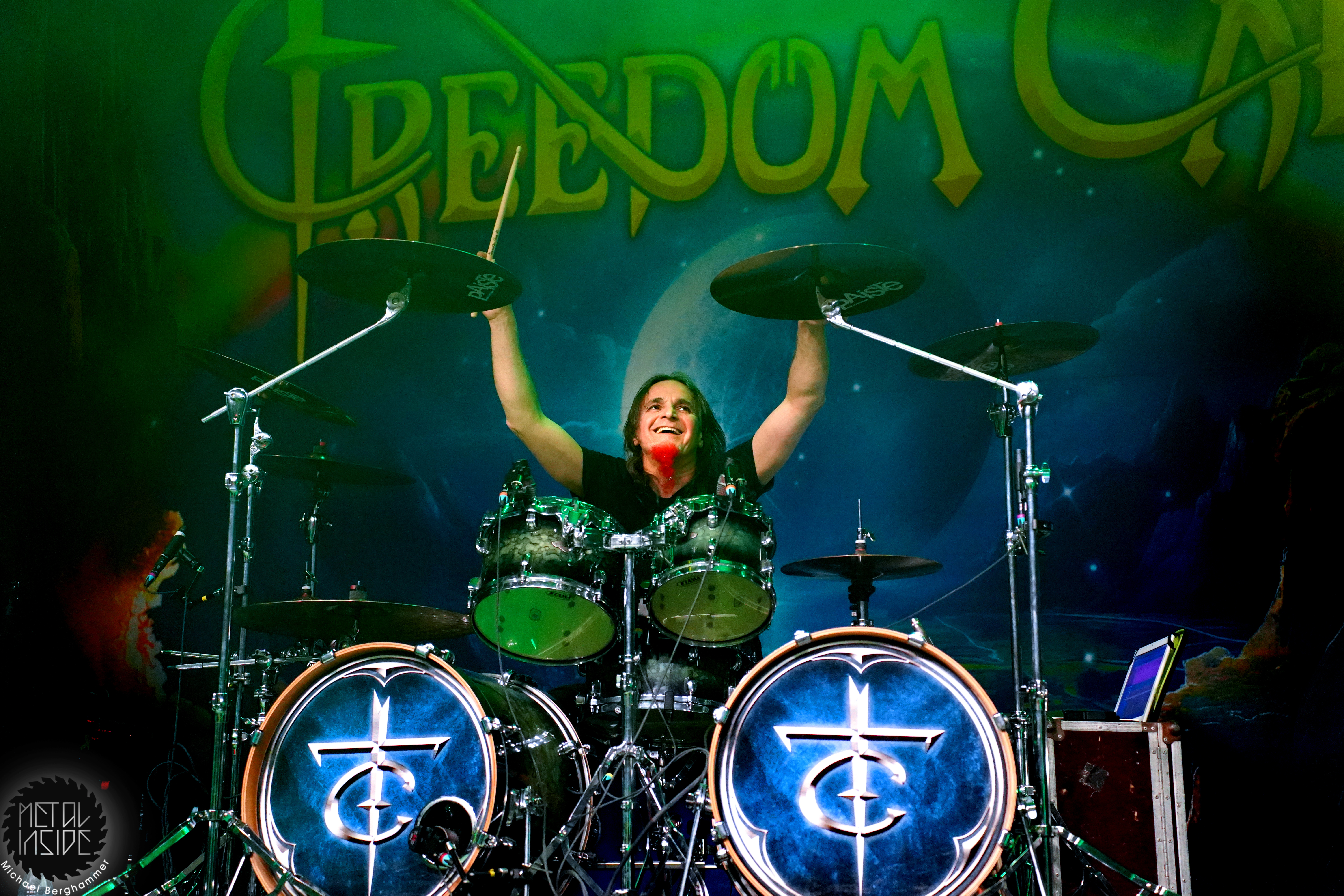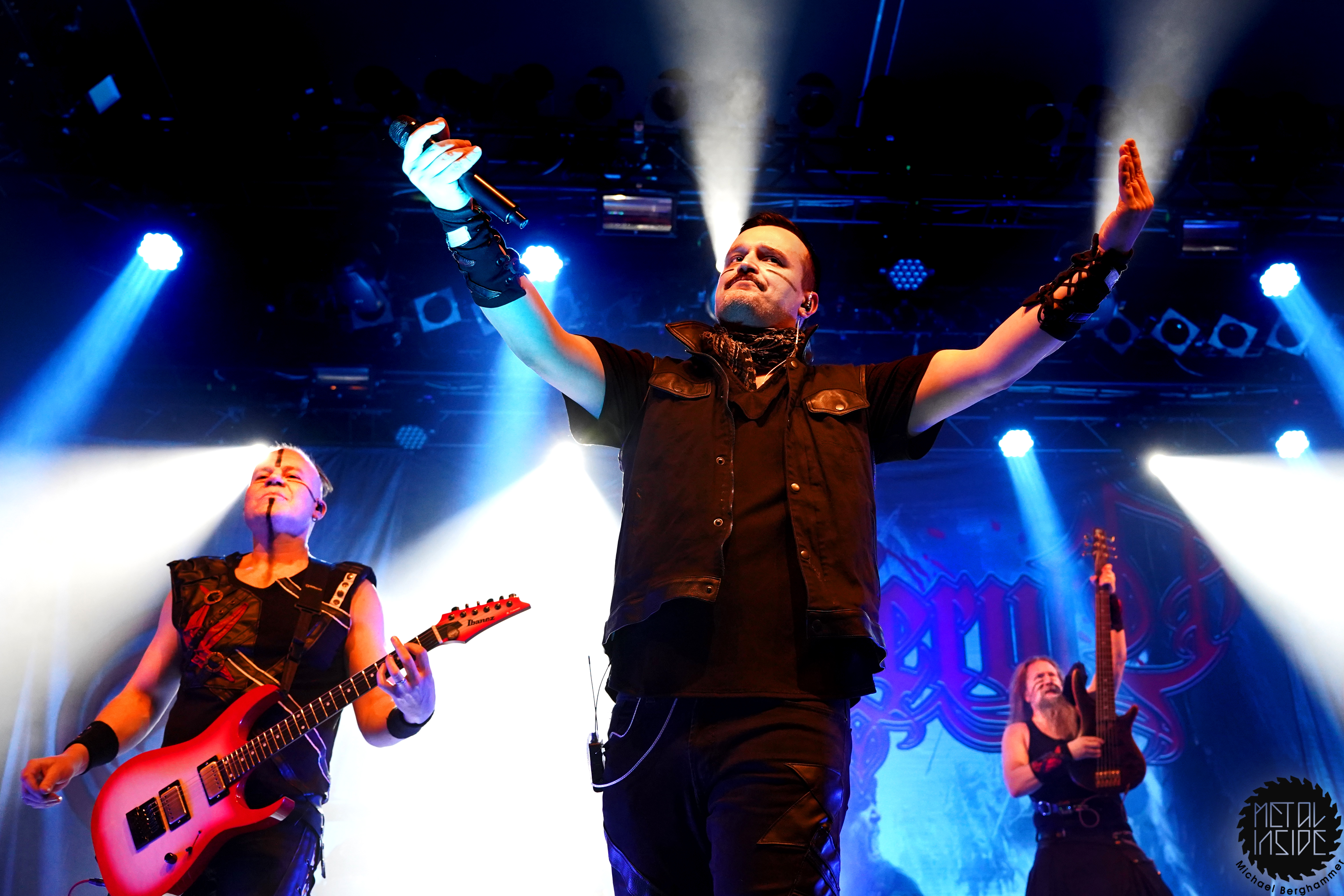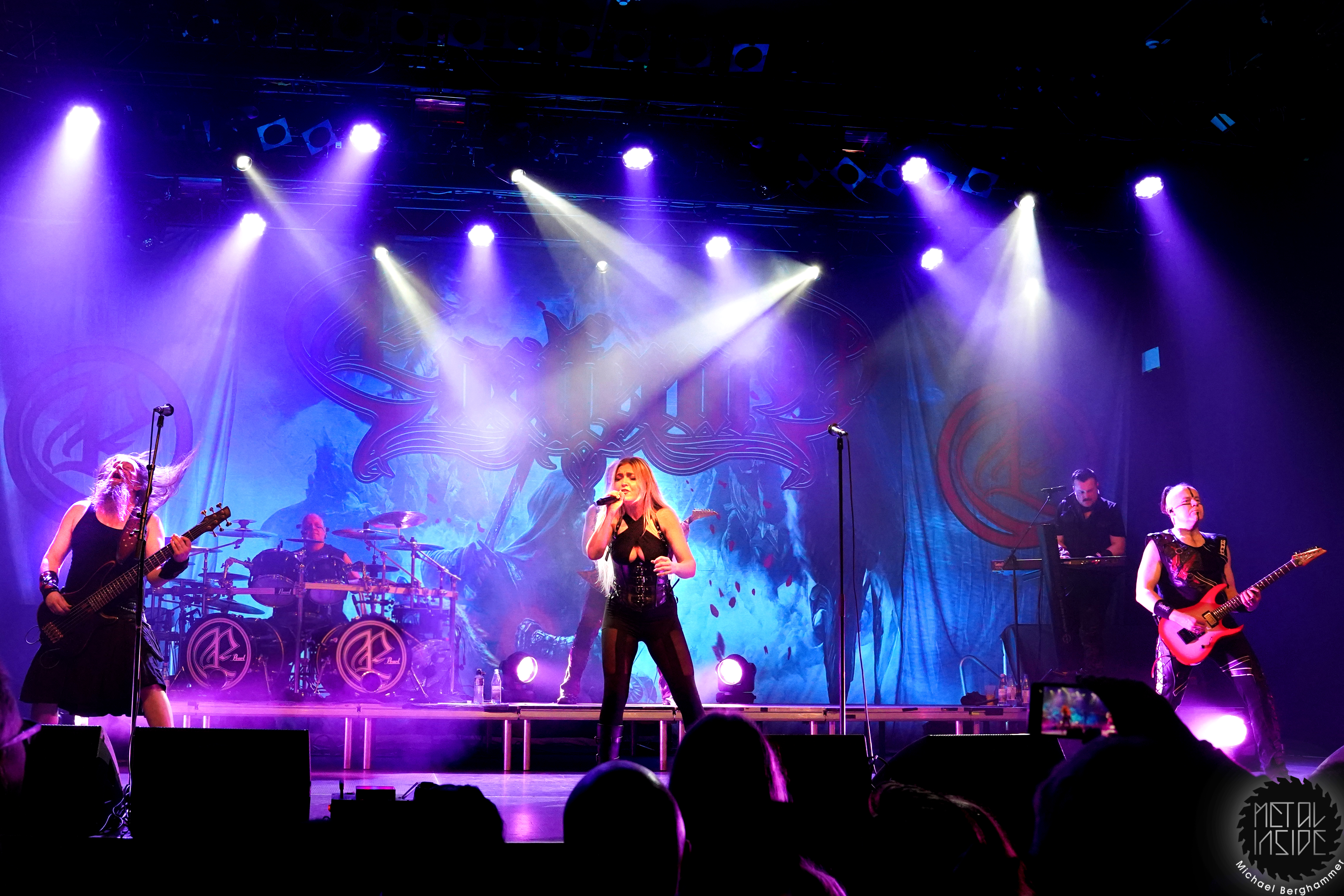 Stichwort FREEDOM CALL: Die Franken gibt es nun auch schon über ein Vierteljahrhundert und man hat den Begriff „Happy Metal“ geprägt wie keine andere Band. Auch heute betritt man mit einem breiten Grinsen die Bühne und lässt als erstes den „Hammer Of The Gods“ darnieder sausen. Es macht mir immer wieder eine immense Freude, Drummer Ramy Ali bei der Arbeit zuzusehen. Sollte es je eine Muppets Realverfilmung geben (ja, dass das keinen Sinn macht, ist mir bewusst), dann wäre er für die Rolle des „Tier“ die perfekte Wahl. Frontmann Chris Bay führt mit seinem, ihm ganz eigenen, Dauergrinsen souverän durch das Programm und verkündet stolz, dass man von einem amerikanischen Magazin zur „Happiest Band Of The World“ gewählt wurde. Diese Auszeichnung lieferte die Inspiration zur neuen Single „Heavy Metal Happycore“. So eine Nummer dürfte sich außer FREEDOM CALL niemand leisten, aber hier passt es und so schallt der Chorus lauthals durch die Batschkapp. Dass bei der Single Petri Lindroos vom heutigen Headliner ENSIFERUM mitwirkt, spricht für die gute Stimmung der Bands untereinander. Das finale Songtriple „Warriors“, „Metal Is For Everyone“ und natürlich „Land Of The Light“ sorgt für viel Gehüpfe, Gesinge und gute Laune. FREEDOM CALL sind und bleiben die Glücksbärchis des Heavy Metal. Dies aber absolut stimmig und authentisch. Mir macht’s immer wieder Spaß.