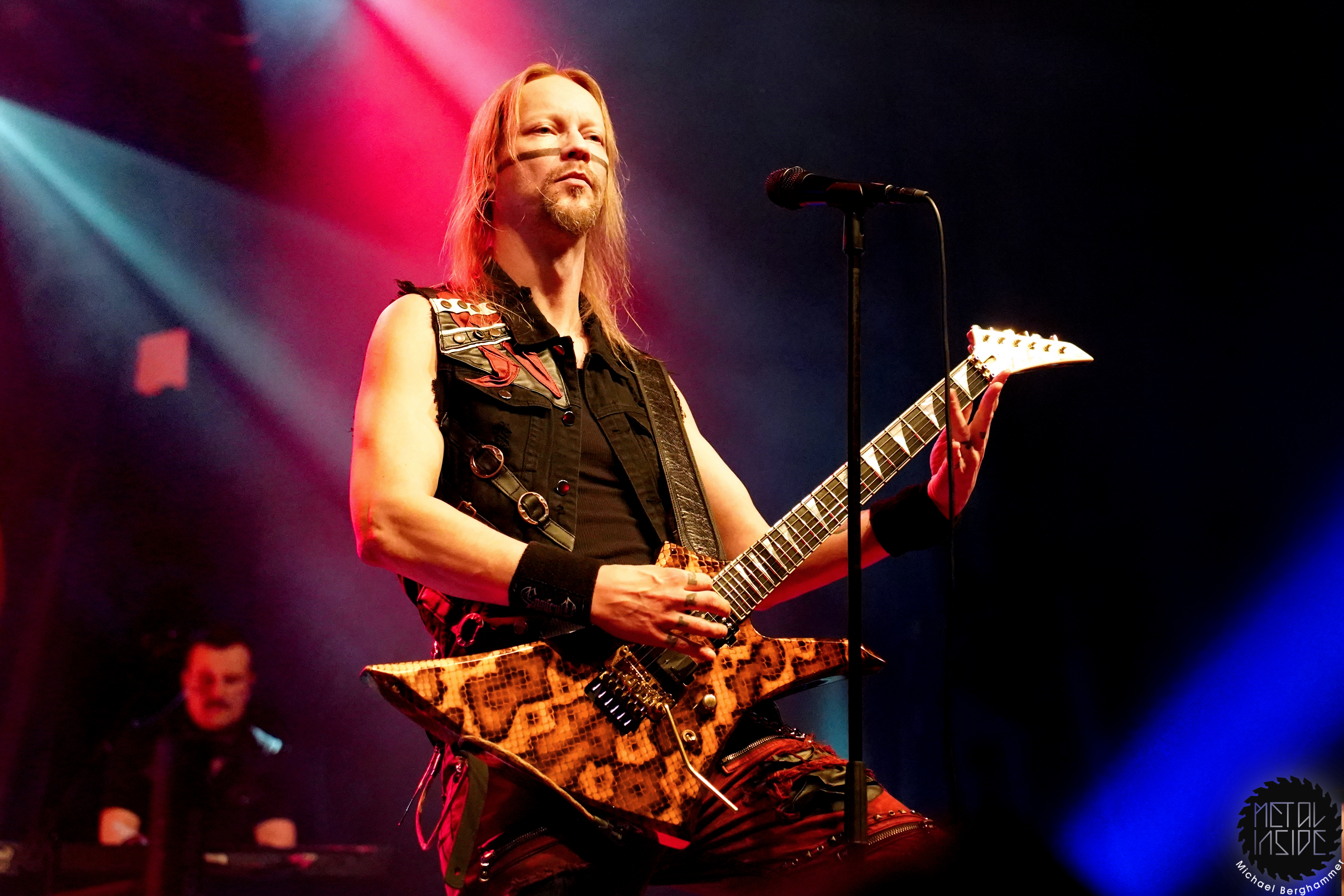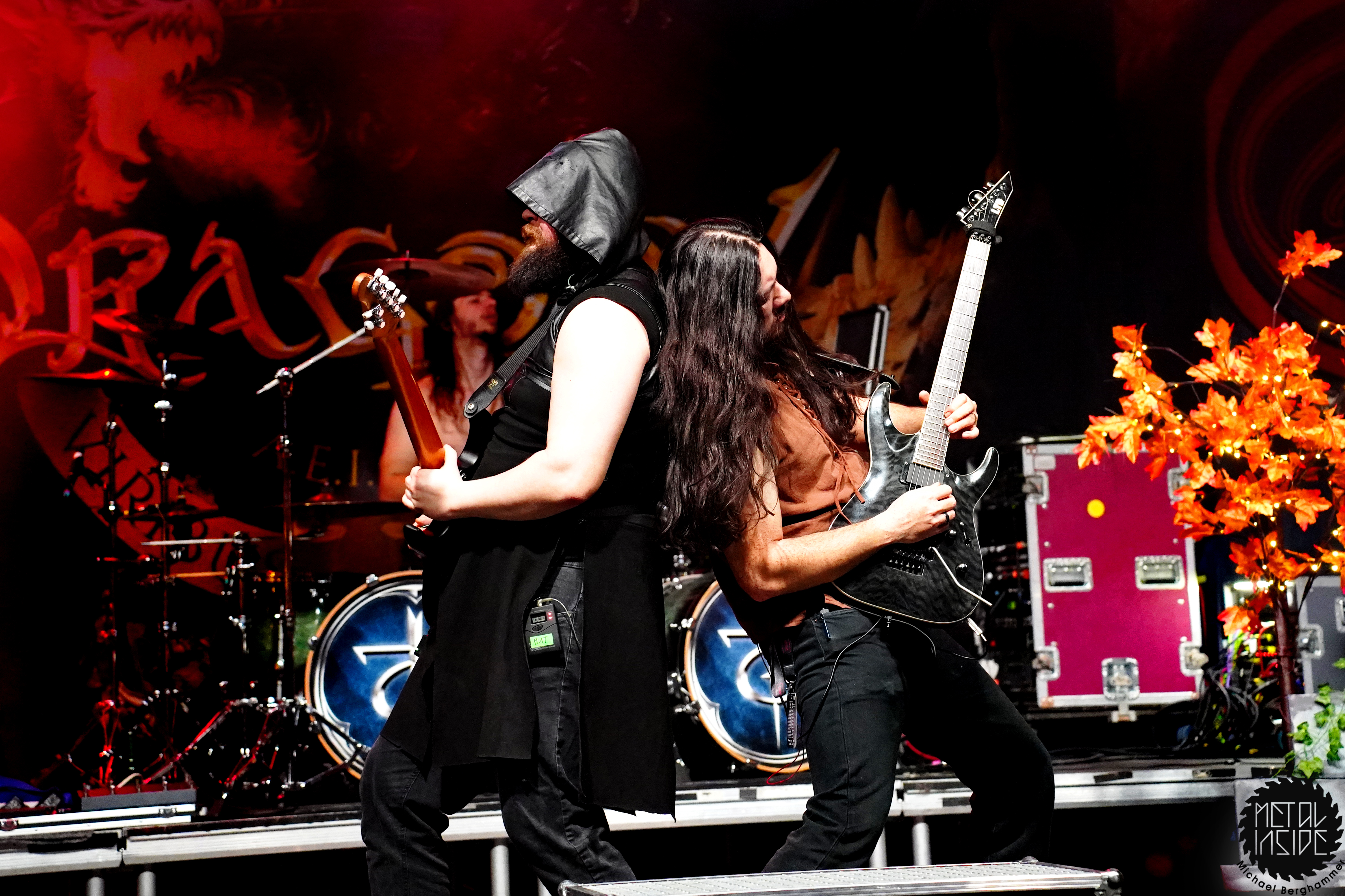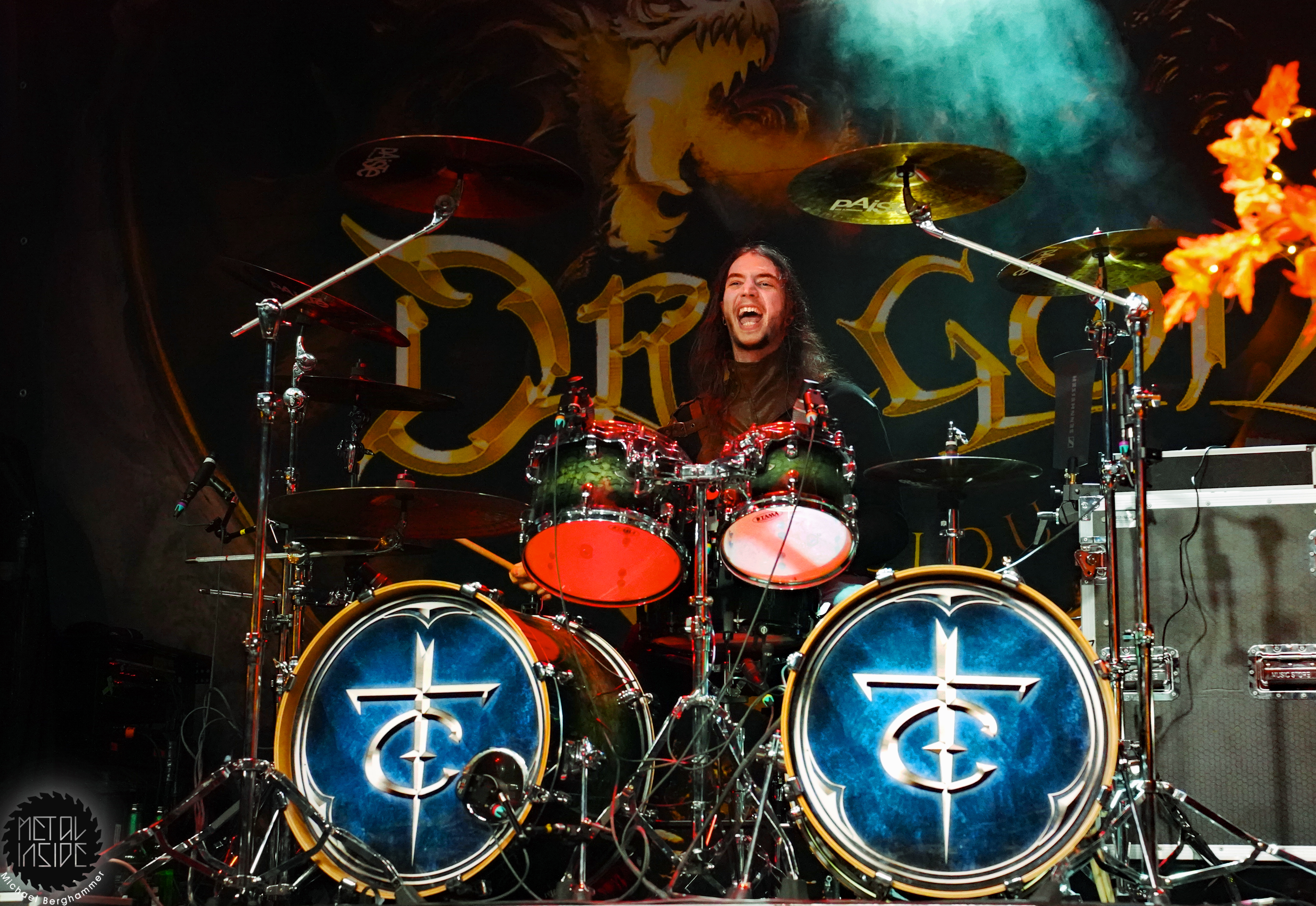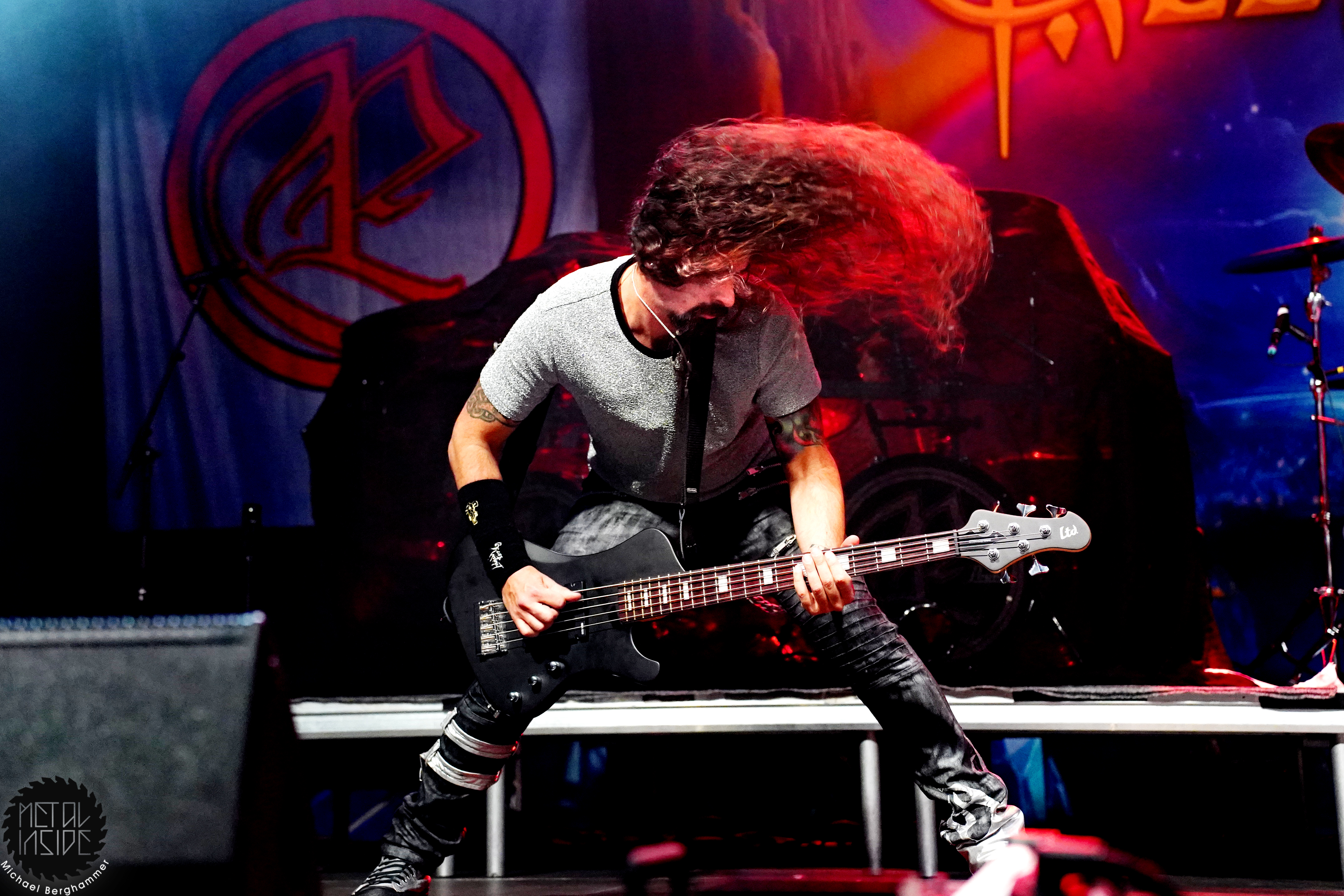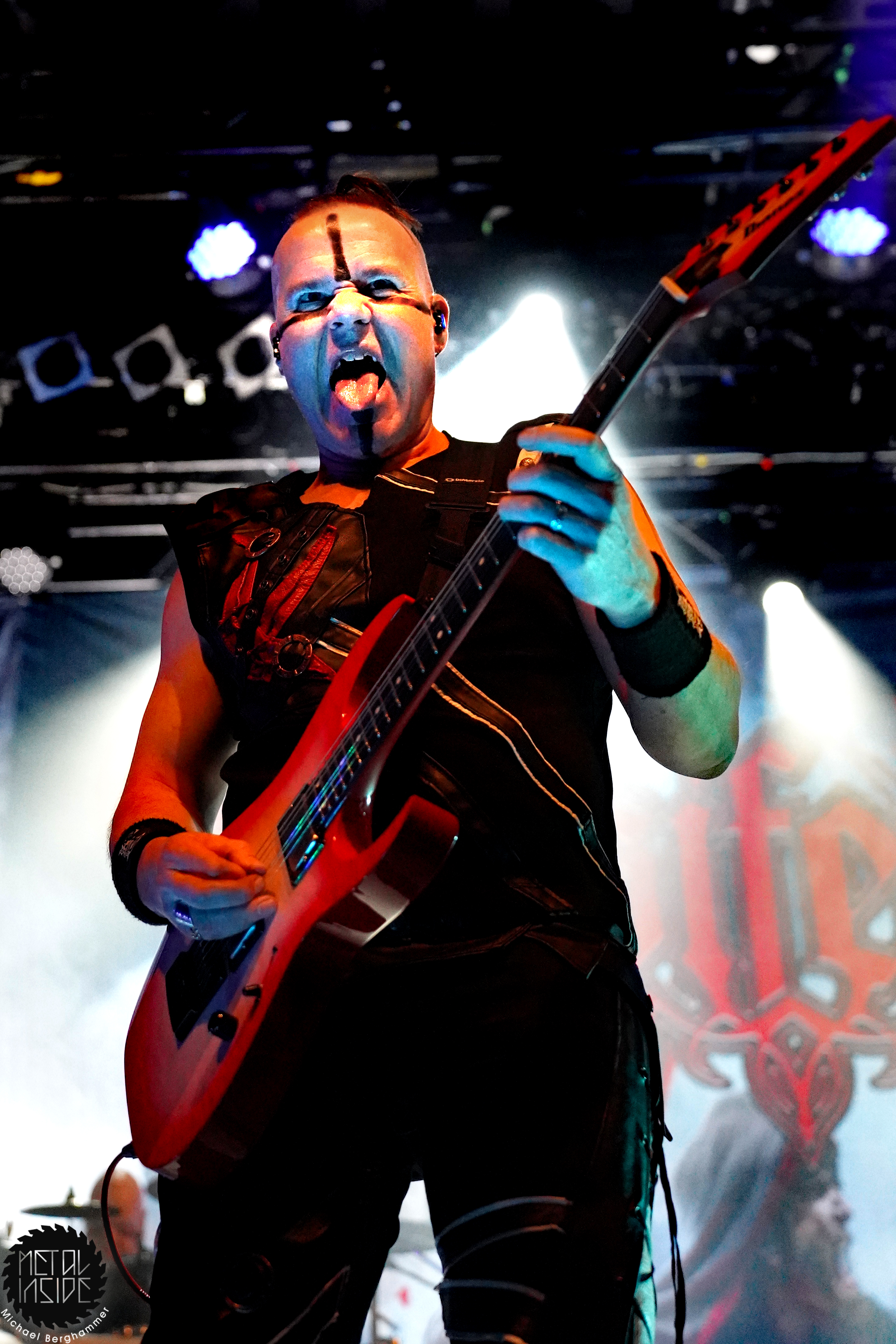 Stichwort FREEDOM CALL: Die Franken gibt es nun auch schon über ein Vierteljahrhundert und man hat den Begriff „Happy Metal“ geprägt wie keine andere Band. Auch heute betritt man mit einem breiten Grinsen die Bühne und lässt als erstes den „Hammer Of The Gods“ darnieder sausen. Es macht mir immer wieder eine immense Freude, Drummer Ramy Ali bei der Arbeit zuzusehen. Sollte es je eine Muppets Realverfilmung geben (ja, dass das keinen Sinn macht, ist mir bewusst), dann wäre er für die Rolle des „Tier“ die perfekte Wahl. Frontmann Chris Bay führt mit seinem, ihm ganz eigenen, Dauergrinsen souverän durch das Programm und verkündet stolz, dass man von einem amerikanischen Magazin zur „Happiest Band Of The World“ gewählt wurde. Diese Auszeichnung lieferte die Inspiration zur neuen Single „Heavy Metal Happycore“. So eine Nummer dürfte sich außer FREEDOM CALL niemand leisten, aber hier passt es und so schallt der Chorus lauthals durch die Batschkapp. Dass bei der Single Petri Lindroos vom heutigen Headliner ENSIFERUM mitwirkt, spricht für die gute Stimmung der Bands untereinander. Das finale Songtriple „Warriors“, „Metal Is For Everyone“ und natürlich „Land Of The Light“ sorgt für viel Gehüpfe, Gesinge und gute Laune. FREEDOM CALL sind und bleiben die Glücksbärchis des Heavy Metal. Dies aber absolut stimmig und authentisch. Mir macht’s immer wieder Spaß.