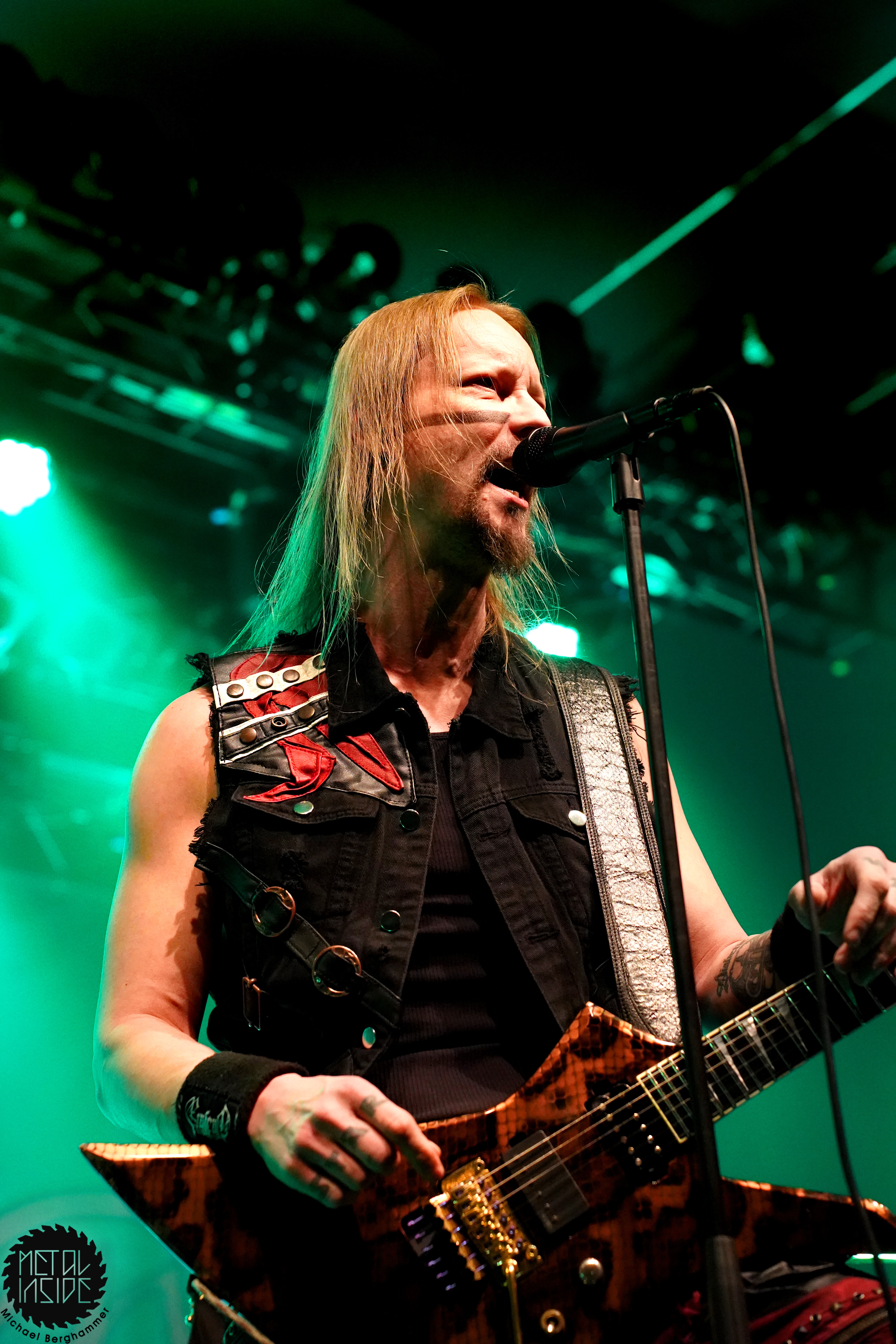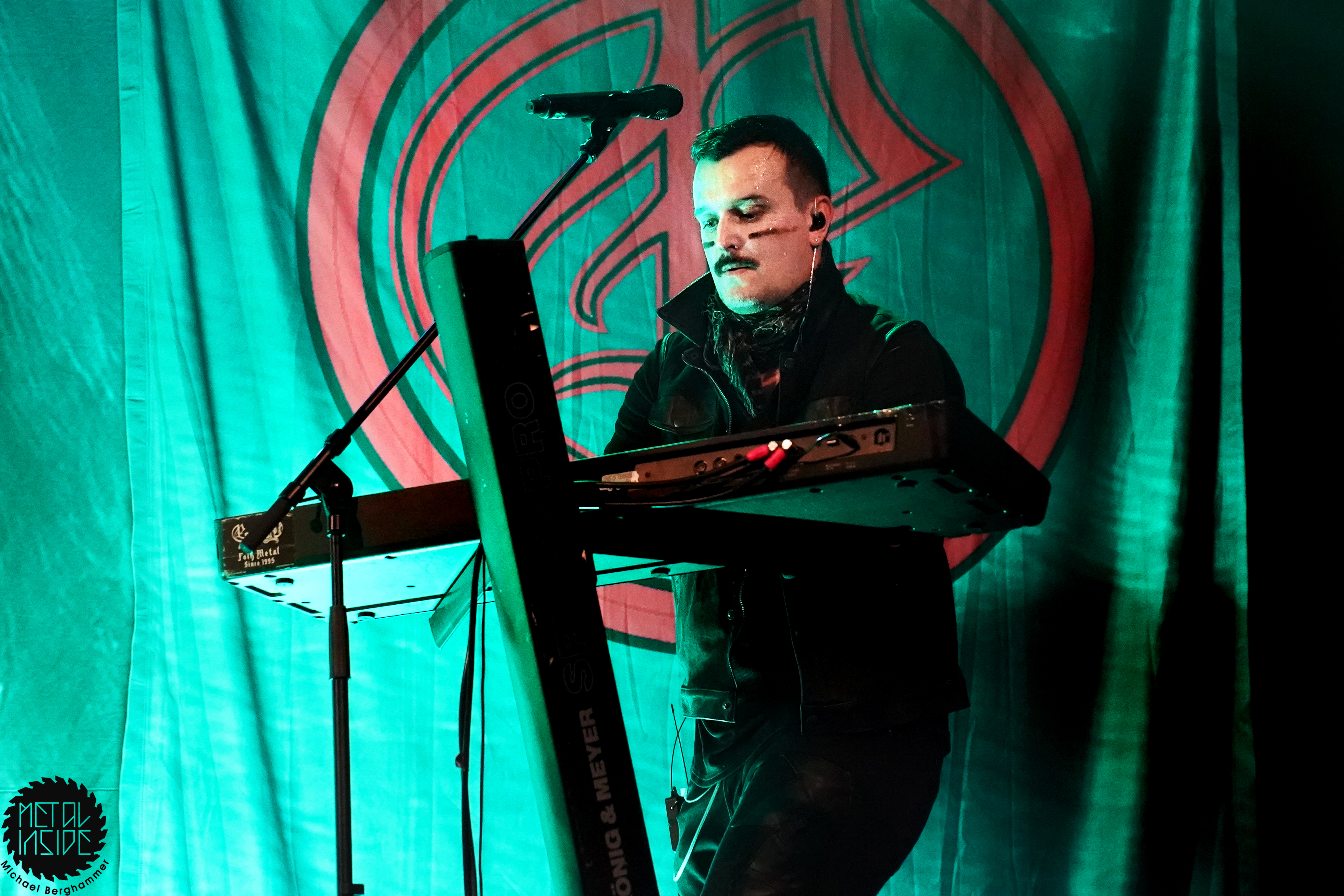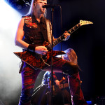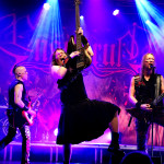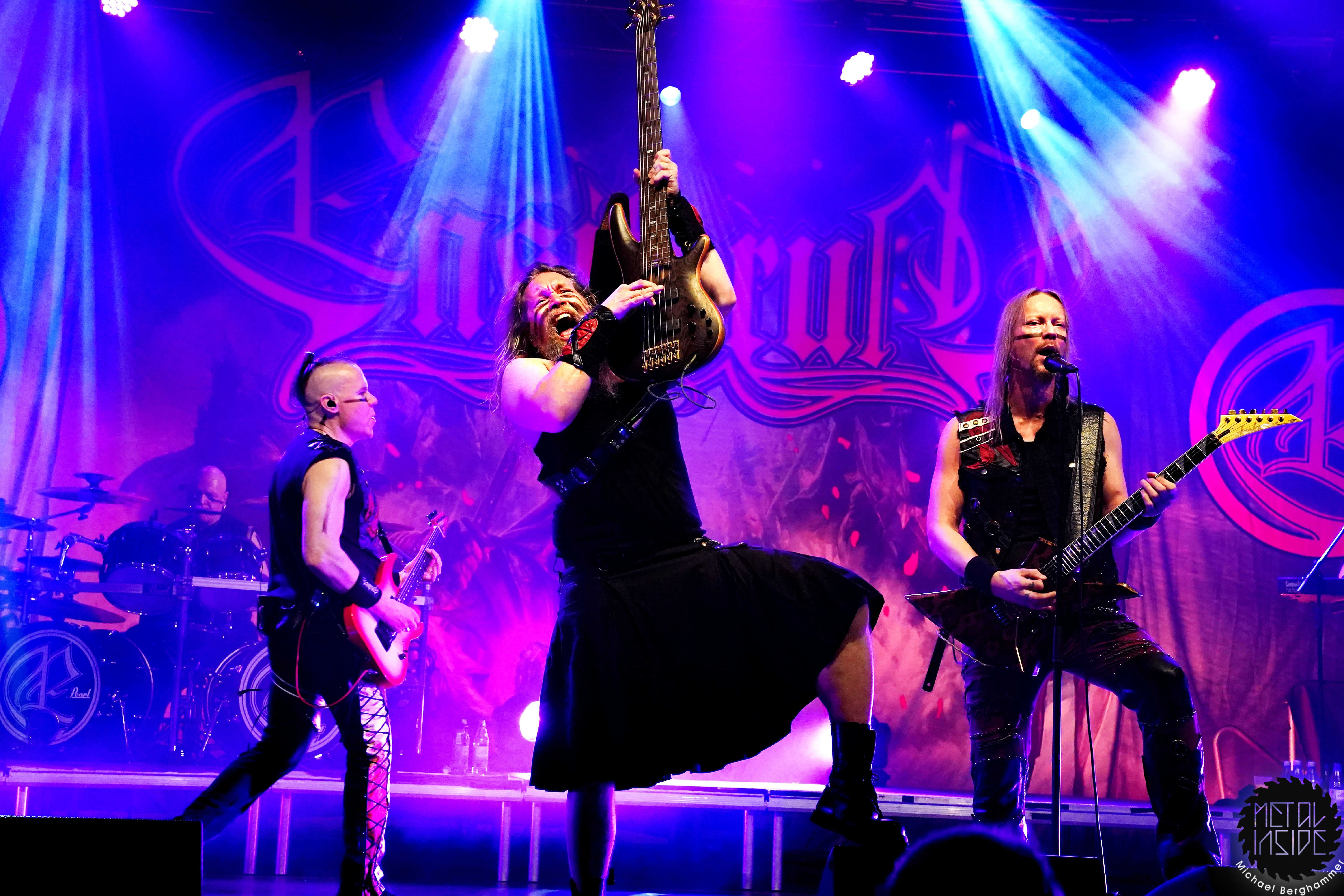 ENSIFERUM legen mit „Winter Storm Vigilantes“ gleich ordentlich los und so dauert es nicht lange, bis sich ein erster Circle Pit bildet und sich wildfremde Menschen mit viel Freude hin und her schubsen. Frontmann Petri Lindroos ist einfach eine coole Socke. Als das Publikum nach mehr Lautstärke verlangt, gibt es erst eine Ansage auf Finnisch in Richtung Mischpult und dann mit einem leichten Grinsen ein „Should be loud enough now“ ans Publikum gerichtet. In der Tat wird der Sound danach merklich besser und besonders die nicht gerade unwichtigen Gitarren treten mehr in der Vordergrund. Bassist Sami Minka ist das genaue Gegenteil zu Petri und zieht eine Grimasse nach der anderen, ist ständig von einer Bühnenseite zur anderen unterwegs und feuert die Fans unablässig an. Keyboarder Pekka Montin verlässt sein Instrument immer wieder in Richtung Bühnenrand und sorgt mit klassischen Metalvocals für Abwechlsung zu Petris heiserem Gekrächze. Das aktuelle Werk „Winter Storm“ steht im Mittelpunkt des heutigen Abends. ENSIFERUM vergessen ihre langjährigen Fans dennoch nicht und so kommen auch Debütkracher wie „Guardians Of Fate“ oder das vielumjubelte „Token Of Time“ zum Zug. Im Laufe des Abends werden fast alle Alben mit mindestens einem Song bedacht. Nach schlanken 70 Minuten fällt allerdings schon zum ersten Mal der Vorhang, doch bevor die Enttäuschung zu groß wird, entern ENSIFERUM erneut die Bühne und präsentieren mit „Axe Of Judgement“, „In My Sword I Trust“ und „Two Of Spades“ noch einen recht opulenten Zugabeblock, so dass man am Ende doch auf eine vernünftige Spielzeit kommt. Auch wenn der Abend gerne ein paar Zuschauer mehr verdient hätte, können ihn die beteiligten Acts als Erfolg verbuchen und beweisen, dass auch stilistisch recht unterschiedliche Pakete funktionieren.