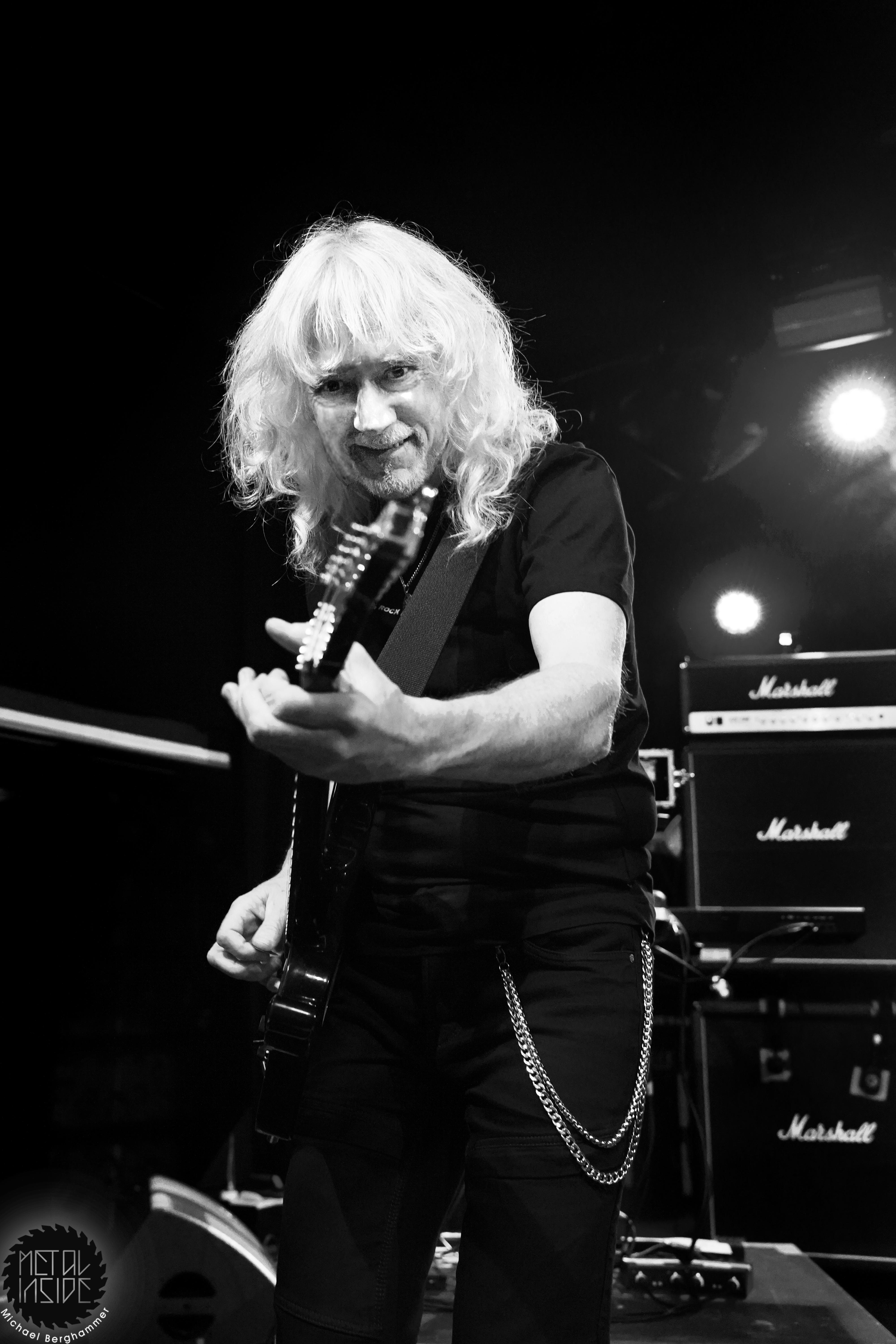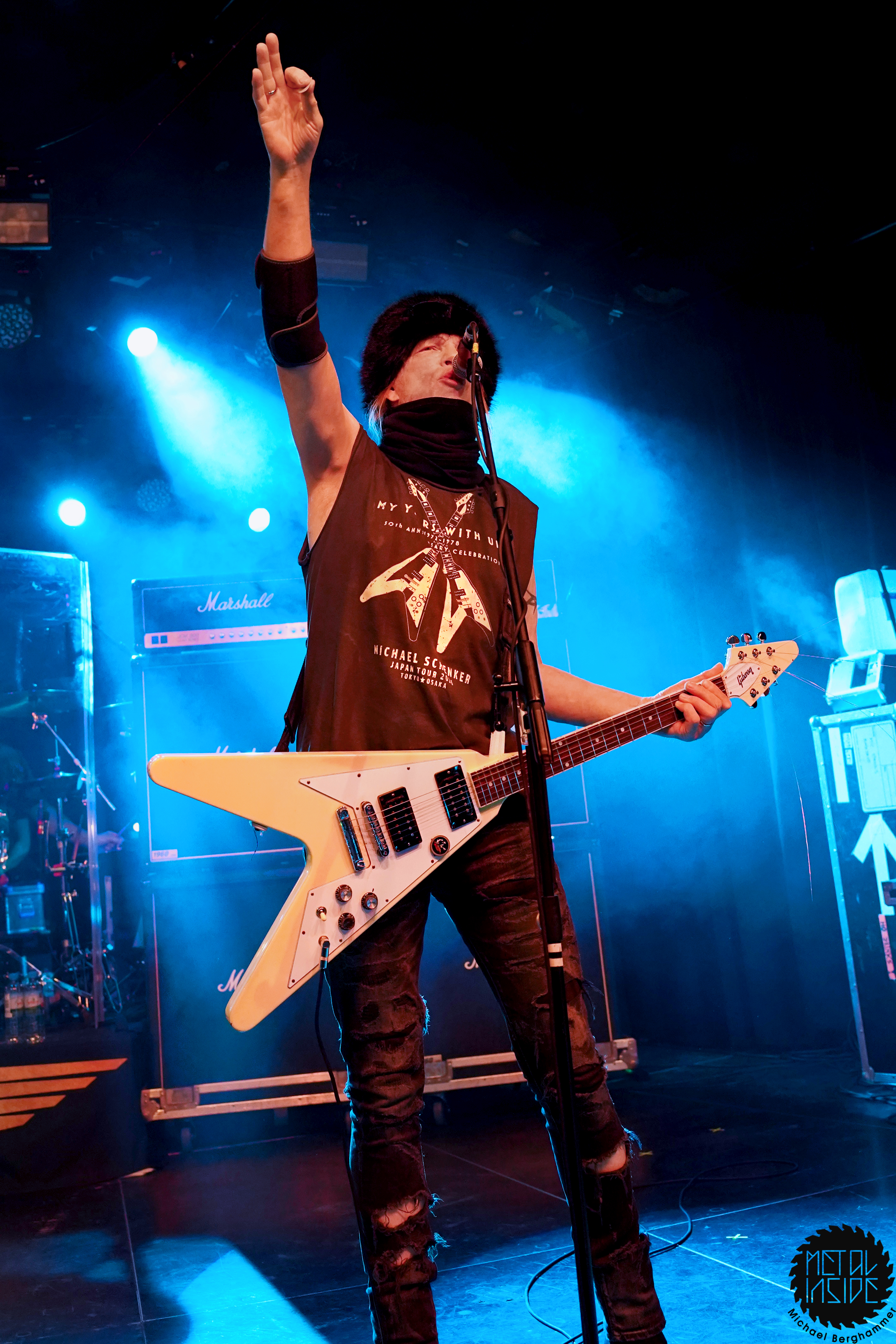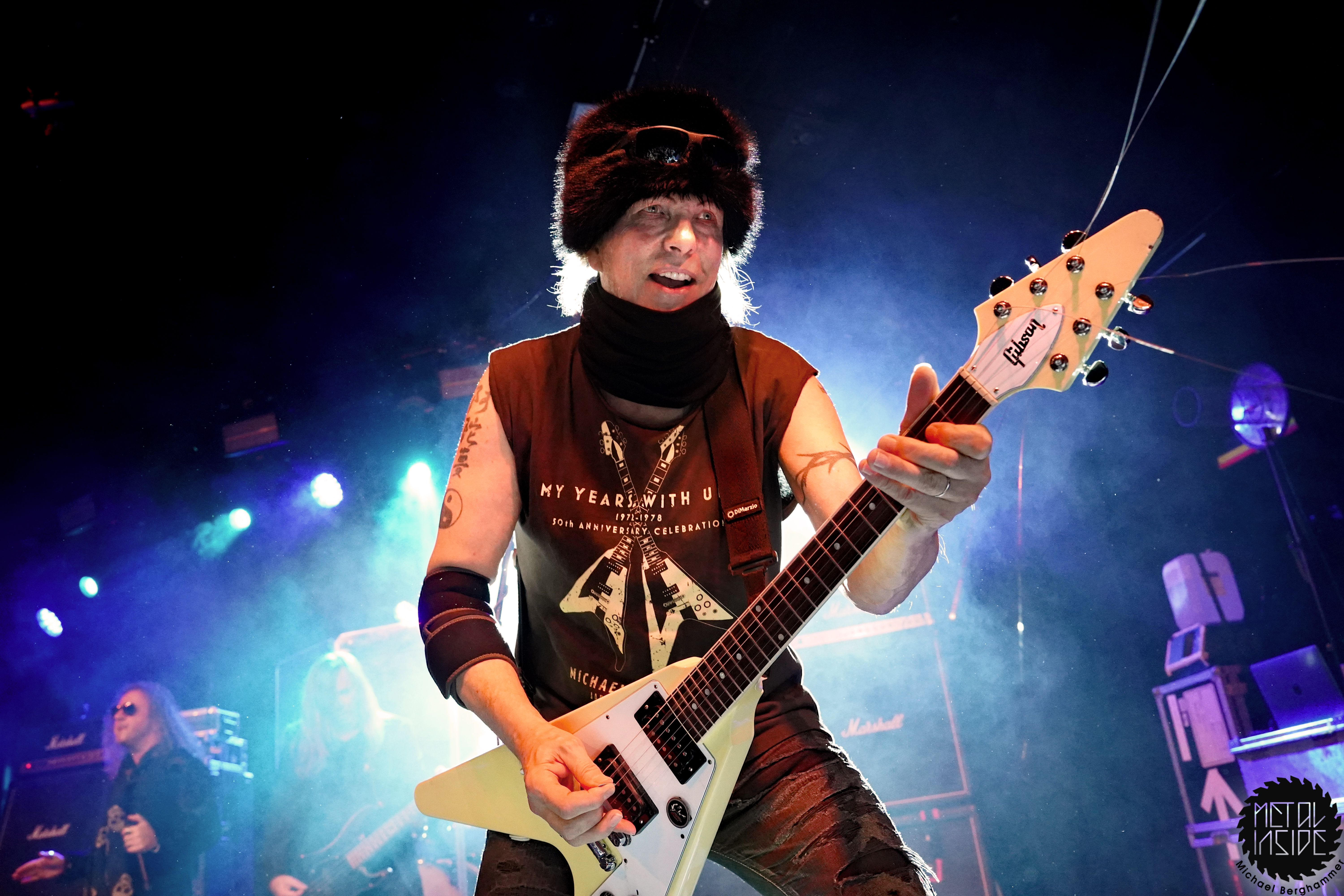 Michaels Spiel ist flitzeflink, dabei unfassbar präzise, und der Klang seiner Flying V hat etwas von Homers Sirenen, dem man sich nicht erwehren kann. „Doctor Doctor“, sanft und atmosphärisch eingeleitet, verzückt das Frankfurter Publikum und wird wie nahezu alle Nummern frenetisch mitgesungen. Das danach platzierte Bass-Solo ist überraschend kurzweilig, das einige Nummern später kommende Schlagzeug-Solo hätte ich indes nicht gebraucht. Nach dem Medley aus „Lipstick Traces“, „Between the Wall“ und „Belladona“ kommt mit „Love to Love“ ein weiterer Höhepunkt. Ein Song, der es mit jeder Gänsehaut-Bombast-Ballade aus den 70ern aufnehmen kann. Ab hier wird quasi dann langsam der Schlussspurt eingeleitet. „Rock Bottom“, „Shoot Shoot“ und „Too Hot to Handle“ machen den Sack zu, ohne Zugaberufe und dem ganzen Prozedere, was ich als angenehm und ehrlich empfinde.
