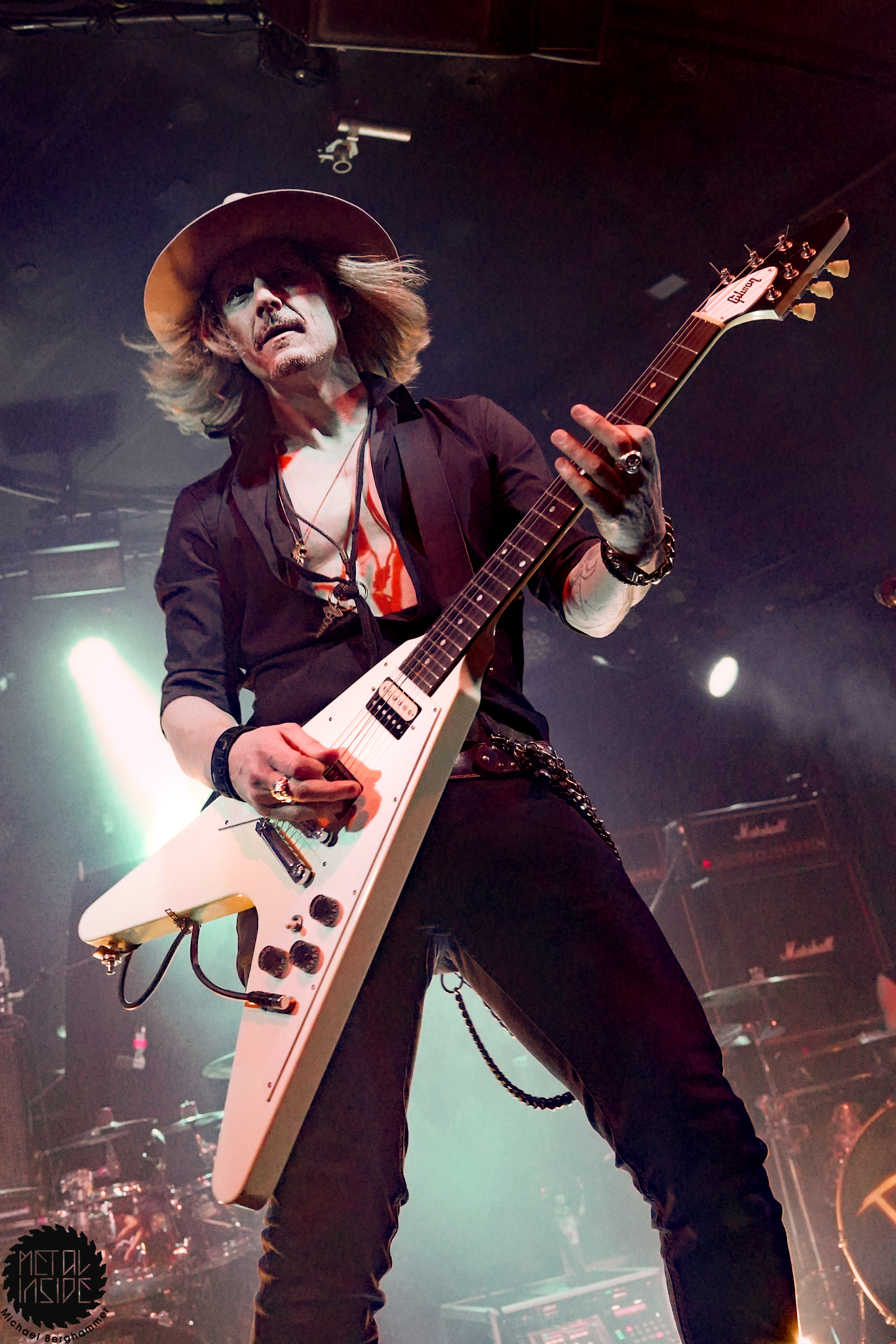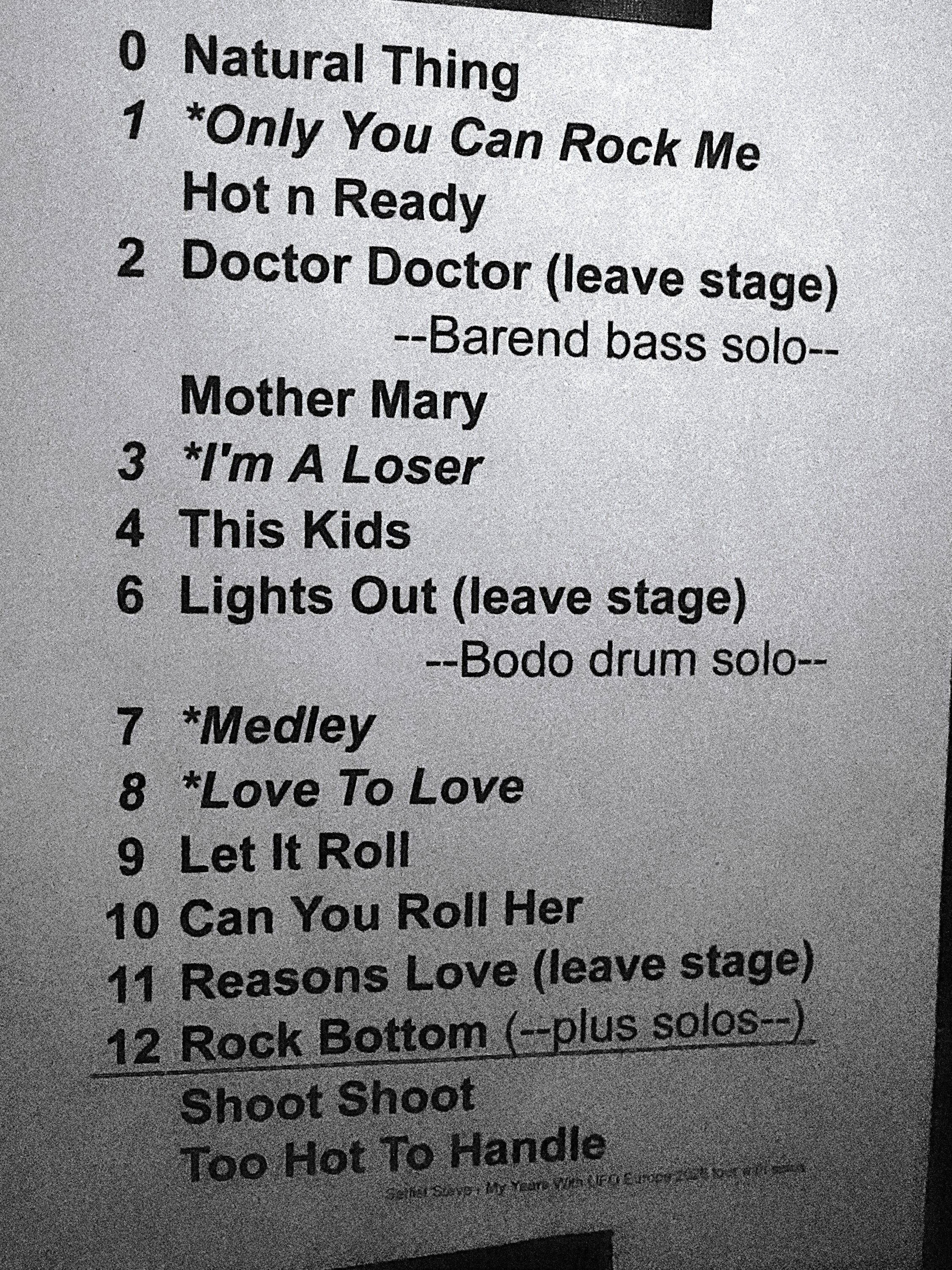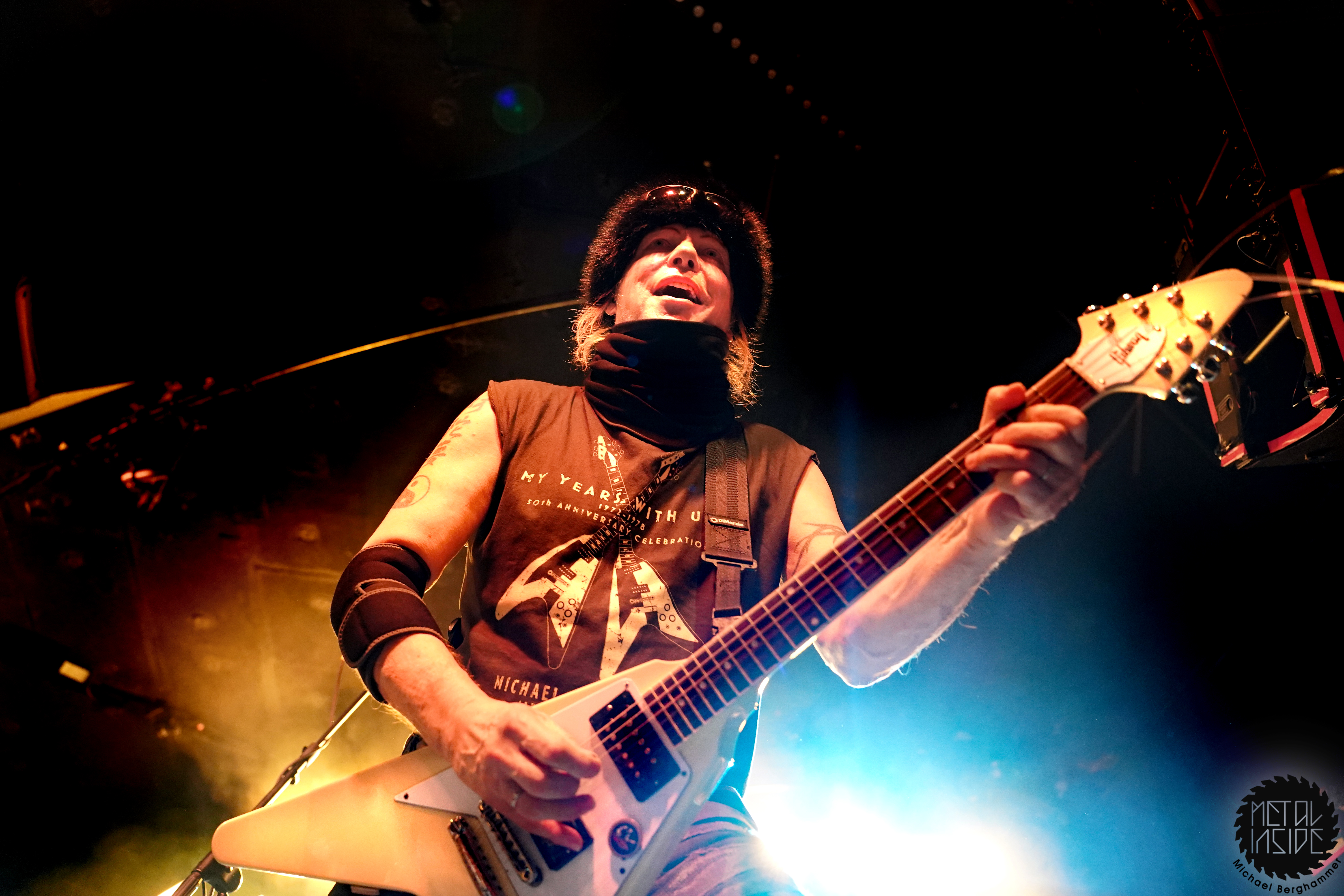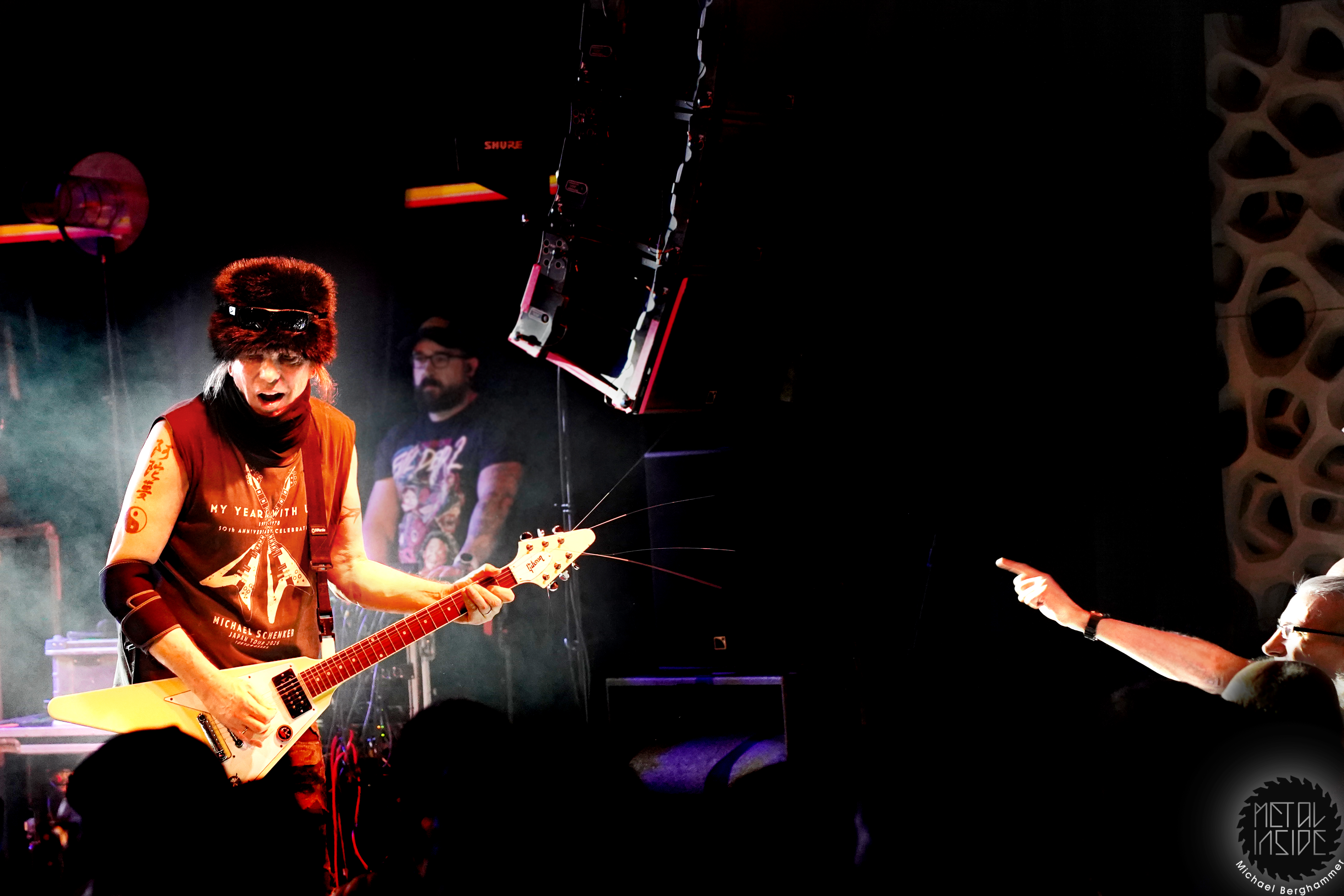 Michaels Spiel ist flitzeflink, dabei unfassbar präzise, und der Klang seiner Flying V hat etwas von Homers Sirenen, dem man sich nicht erwehren kann. „Doctor Doctor“, sanft und atmosphärisch eingeleitet, verzückt das Frankfurter Publikum und wird wie nahezu alle Nummern frenetisch mitgesungen. Das danach platzierte Bass-Solo ist überraschend kurzweilig, das einige Nummern später kommende Schlagzeug-Solo hätte ich indes nicht gebraucht. Nach dem Medley aus „Lipstick Traces“, „Between the Wall“ und „Belladona“ kommt mit „Love to Love“ ein weiterer Höhepunkt. Ein Song, der es mit jeder Gänsehaut-Bombast-Ballade aus den 70ern aufnehmen kann. Ab hier wird quasi dann langsam der Schlussspurt eingeleitet. „Rock Bottom“, „Shoot Shoot“ und „Too Hot to Handle“ machen den Sack zu, ohne Zugaberufe und dem ganzen Prozedere, was ich als angenehm und ehrlich empfinde.
