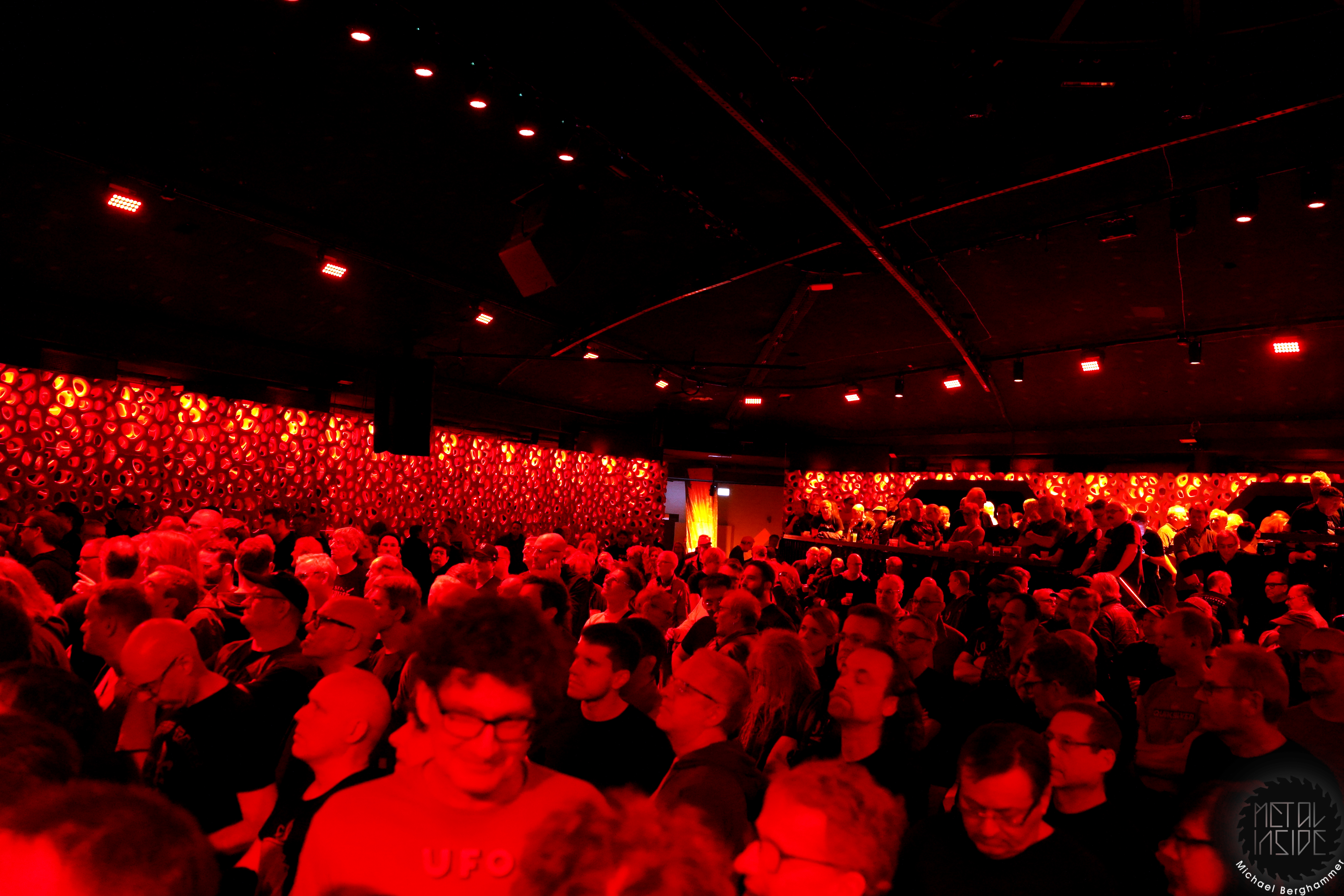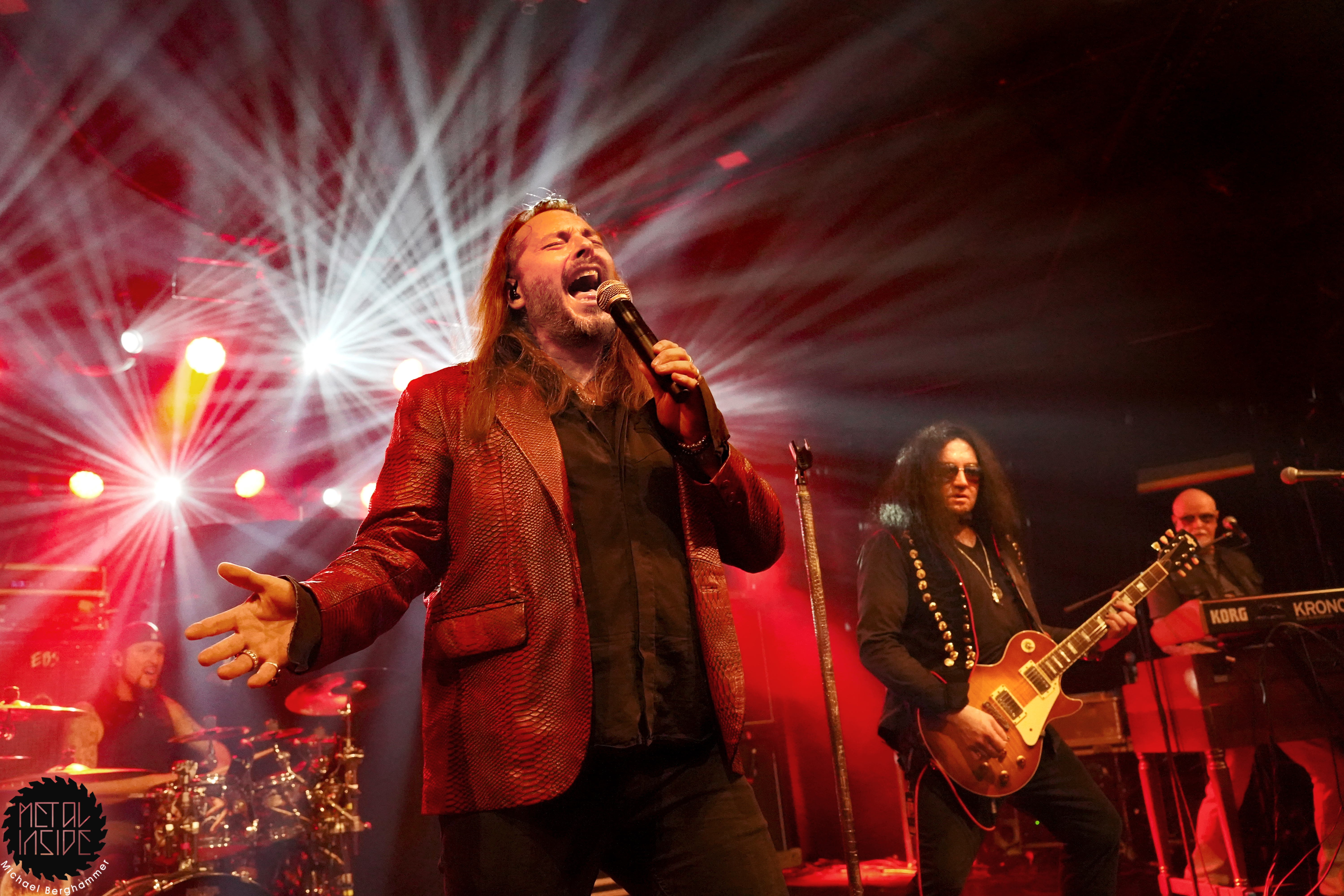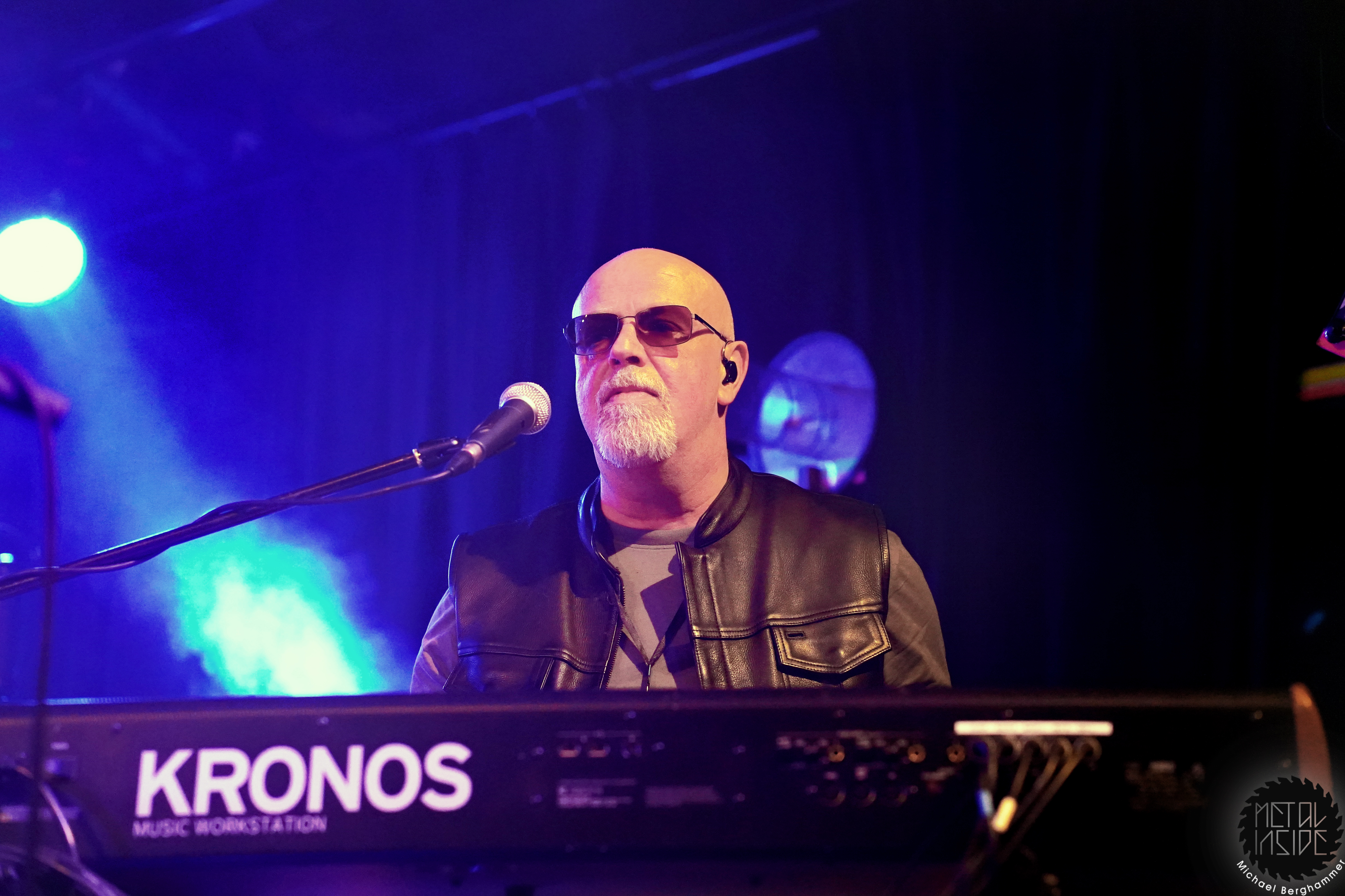 Gegen 21 Uhr darf dann der Meister auf die Bühne. Nach kurzem Intro öffnet „Natural Thing“ den Gig. Die Band hat eine mittelgroße Bühne zur Verfügung, die geradeso ausreichend für einen Hauptakt ist. Die Beleuchtung ist atmosphärisch, der Sound klar und makellos. Michael ist sicher kein ganz einfacher Künstler, so darf man sich über seine Optik - große Mütze und Halskrause - wundern, wobei die Bewunderung seiner Kunst mehr Sinn und Anlass gibt. Sänger R.D. Liapakis macht einen tollen Job, aber die Fußstapfen von PHIL MOGG sind eine Nummer zu groß. Es ist nicht die Technik oder das Vermögen, nein, es ist die Stimmfärbung an sich. Phils Stimme hat diese schneidende Brillanz und einen unverwechselbaren Charakter.