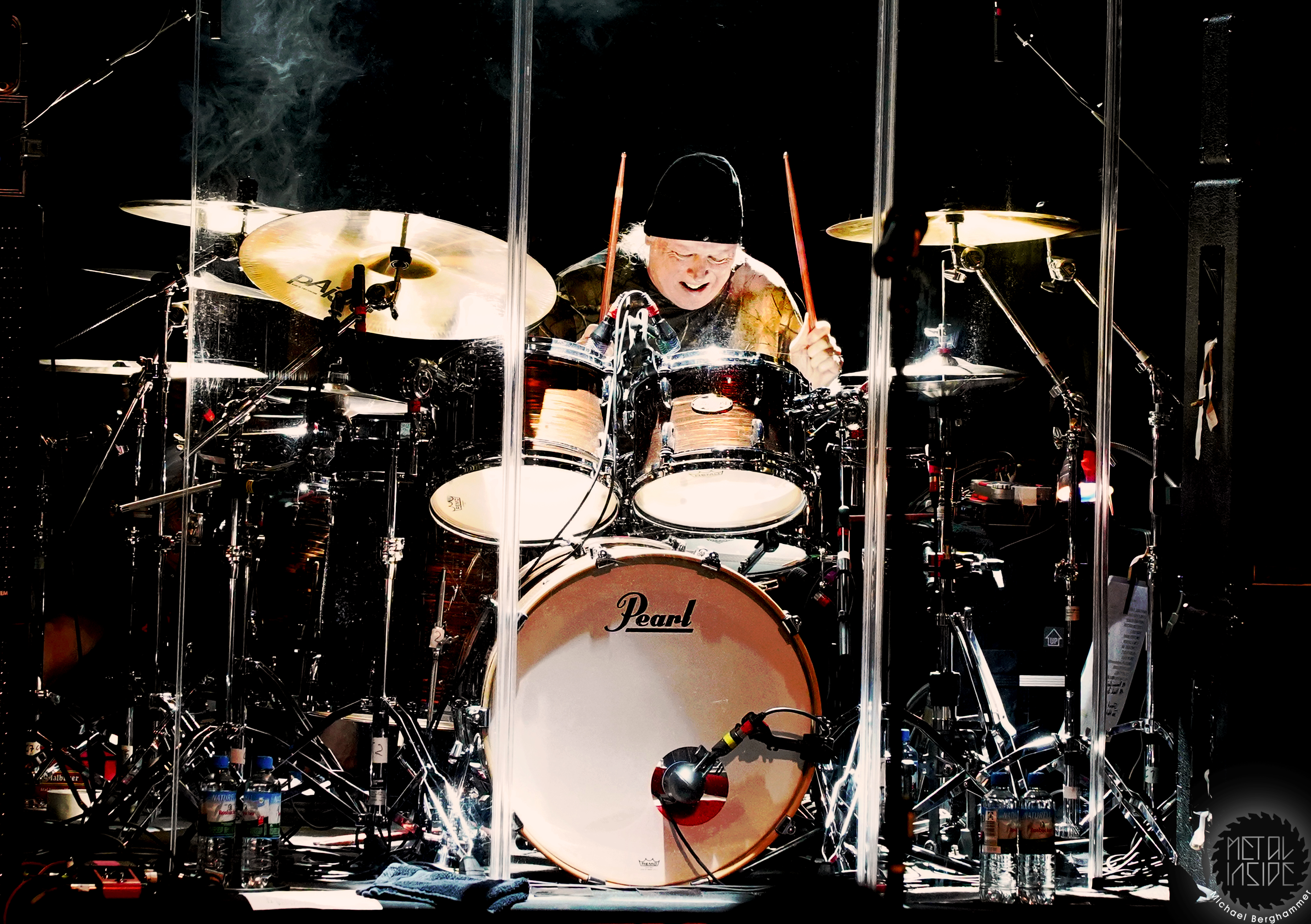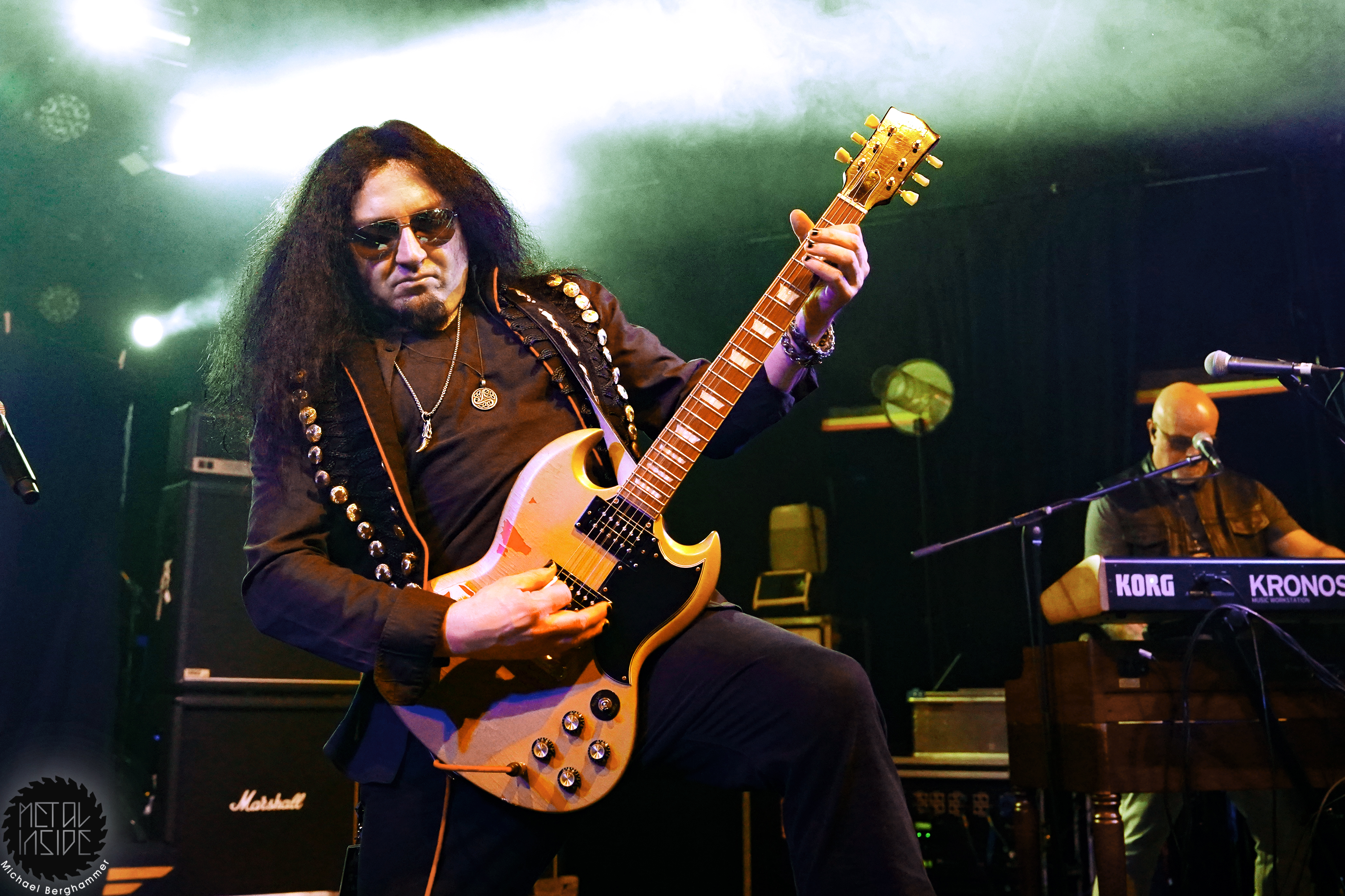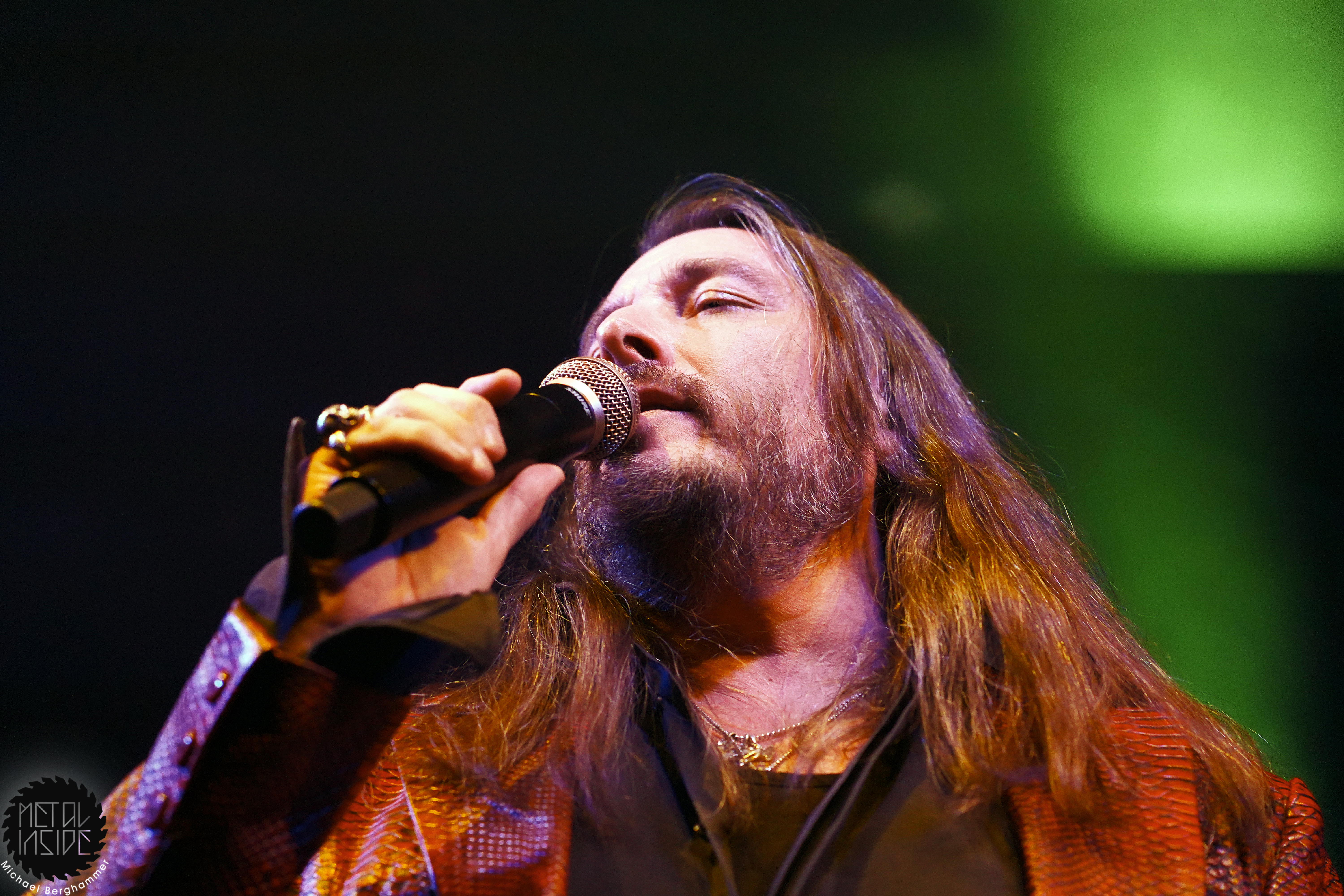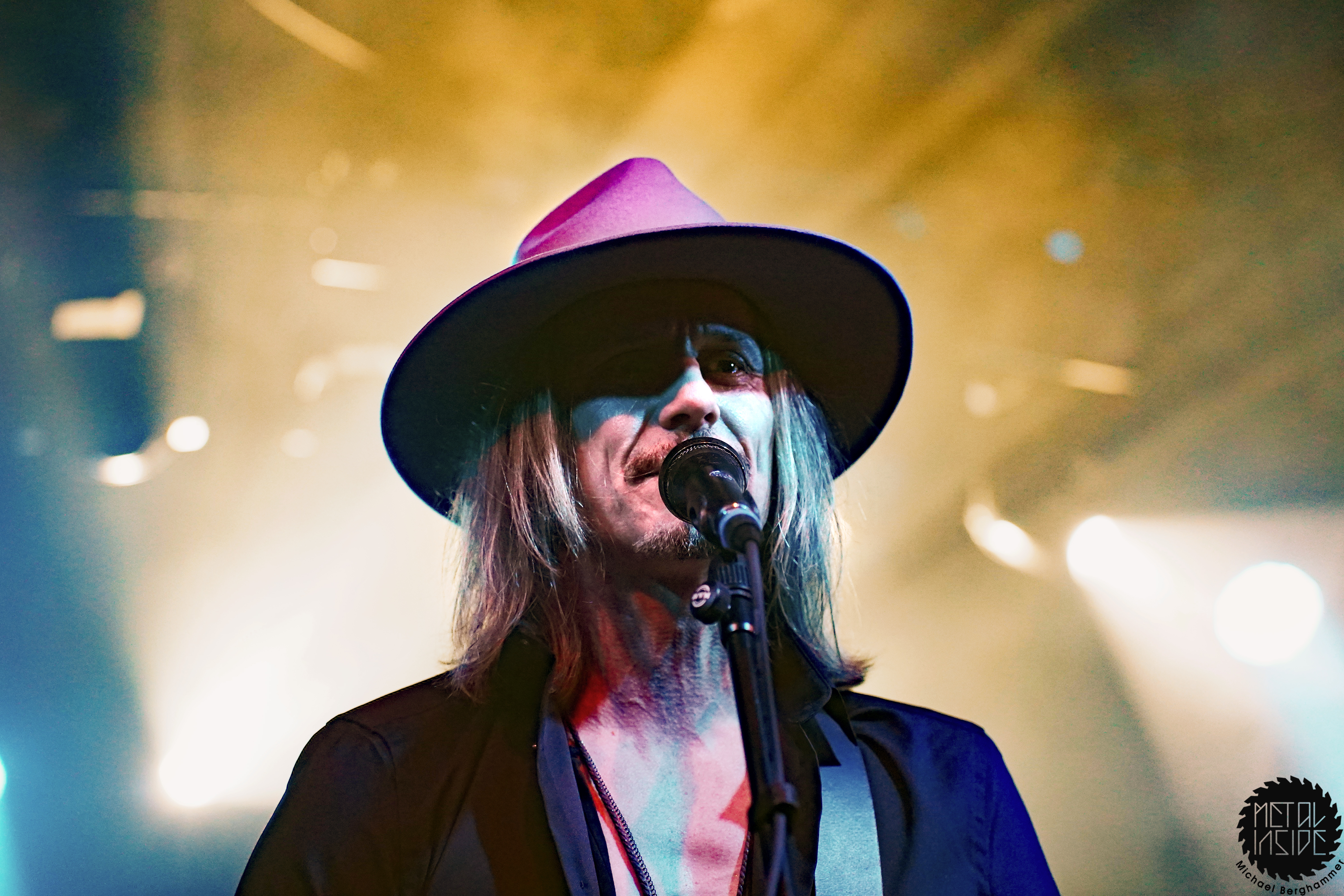 Gegen 21 Uhr darf dann der Meister auf die Bühne. Nach kurzem Intro öffnet „Natural Thing“ den Gig. Die Band hat eine mittelgroße Bühne zur Verfügung, die geradeso ausreichend für einen Hauptakt ist. Die Beleuchtung ist atmosphärisch, der Sound klar und makellos. Michael ist sicher kein ganz einfacher Künstler, so darf man sich über seine Optik - große Mütze und Halskrause - wundern, wobei die Bewunderung seiner Kunst mehr Sinn und Anlass gibt. Sänger R.D. Liapakis macht einen tollen Job, aber die Fußstapfen von PHIL MOGG sind eine Nummer zu groß. Es ist nicht die Technik oder das Vermögen, nein, es ist die Stimmfärbung an sich. Phils Stimme hat diese schneidende Brillanz und einen unverwechselbaren Charakter.