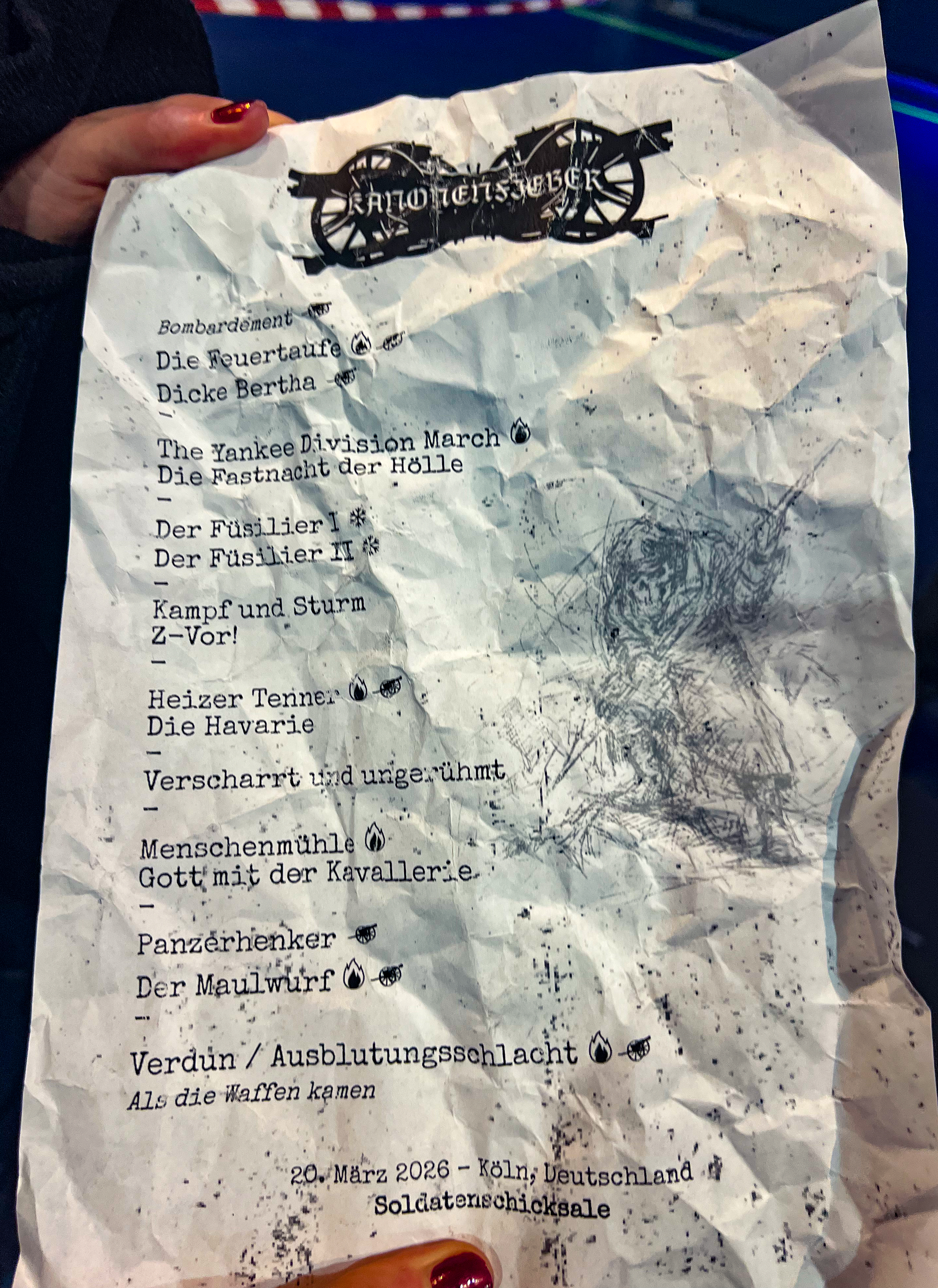 Musikalisch bewegt sich die Band in einer melodischen Variante von Black- und Death Metal, die im Vergleich zugenretypischen Vertretern deutlich eingängiger ist, ohne an Wucht zu verlieren. Den Support übernehmen MENTAL CRUELTY, stilistisch geht das eher in Richtung Deathcore mit Stimmakrobatik und orchestralen Klängen. Der KANONENFIEBER-Auftritt wird eröffnet mit einerArt Blendgranaten-Effekt: ein Moment, der besonders Fotografen kurzzeitig außer Gefecht setzt, bevor sich die maskierten Protagonisten im historischen Gewand im Nebel abzeichnen. Sänger Noise überzeugt dabei nicht nur stimmlich, sondern auch durch eine fast schon schauspielerische Performance: erzählerisch, mit mahnender Gestik und intensiver Bühnenpräsenz. Die Songs schlagen ein wie Granaten im Niemandsland der Ostfront! Songs wie „Kampf und Sturm“ oder „Z-Vor!“ kommen enorm druckvoll daher, während „Der Füsilier“ sich gut mitsingen lässt. „Die Havarie“ überzeugt durch Dynamik (Ahoi!), während „Verscharrt und Ungerühmt“ mit akustischer Gitarre eine beklemmende Ruhe erzeugt, die sich deutlich vom restlichen Set abhebt. Die Musik bietet einem ständigen Wechsel zwischen rasenden und getragenen Passagen und die Bühne wird zur Frontlinie, das Publikum zur tobenden Masse dazwischen. Die wechselnden Uniformen passen sich der Szenerie der Alben und EPs an. Hervorzuheben ist auch die szenische Umsetzung einzelner Stücke: „Heizer Tenner“ wird beinahe wie ein kurzes Theaterstück, wodurch die Geschichten der einfachen Soldaten unter Deck greifbar werden. Es entstehtstellenweise der Eindruck eines düsteren, brutalen Kriegs-Musicals. Auch „Der Maulwurf“ entwickelt sich zum Publikumsfavoriten.