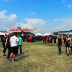 Dunkel war´s / Der Mond schien helle / Als gar finstere Gestalten/ Einfielen nach Hildesheim… Oder doch nicht? Pünktlich zum Auftakt des alljährlichen Gipfeltreffens der Schwarzen Szene auf dem M´era Luna besann sich das Wetter nach einigen Tagen der Rebellion wieder auf seine guten Manieren und statt dem erwähnten Mond lachte die Sonne vom Himmel. Ebenfalls lachen konnten all jene, die das Glück einer kurzen sowie zeitlich flexiblen Anreise genossen und obendrein mitbekommen hatten, dass Campingplatz und Bändchenausgabe bereits zweieinhalb Stunden früher öffneten als geplant. Wehe dagegen dem armen Sünder, der im naiven Glauben an die Richtigkeit der ursprünglich angekündigten Zeit erst zu eben dieser oder gar – noch schlimmer – deutlich später nichts Böses ahnend am Hildesheimer Flugplatz eintraf und sich daraufhin mit einem Meer aus Zelten und Pavillons konfrontiert sah, zwischen denen ein freier Platz für das eigene Zelt nur noch unter größten Mühen zu finden war. War dieses Kunststück jedoch erst einmal vollbracht, stand der abendlichen Einstimmung auf die kommenden Tage nichts mehr im Wege, schließlich hatten sowohl der Festival-Merchandising Stand als auch der Mittelaltermarkt samt Bühne auf dem Campingplatz bereits geöffnet. Später am Abend gesellte sich auch die neue Disco dazu und wummerte – getreu dem Motto „Des einen Freud´, des anderen Leid“ – die halbe Nacht durch, dass es nur so eine Pracht war. Entsprechend wirkte der eine oder andere Festivalbesucher am nächsten Morgen schon vor Beginn der eigentlichen Veranstaltung reichlich zerknautscht, doch alle nächtlichen Strapazen waren bald vergessen, als pünktlich um 11 Uhr das Festivalgelände seine Pforten öffnete.