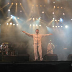 OOMPH machten einen relativ großen Fehler, denn man wollte anscheinend die Spannung hoch halten aber der Schuß ging eher nach hinten los. Denn - alles wartete quasi schon ab dem zweiten Song auf "Augen auf" aber den Track behielt man sich unverständlicherweise fast bis zum Schluß auf. Die Stimmung wollte einfach nicht so recht in Gang kommen, da halfen auch die fast verzweifelten Aufmunterungen von Bandleader Till Lindemann nur zeitweise. Und ständig diese nervige Einstimmung mit "1, 2, 3" und schon hüpfte zwar der Sänger wie ein Wilder über die Bretter, das Publikum blieb trotzdem eher reserviert. Besser wurde es aber der Hälfte des Sets, als bekannte Hits wie "Brennende Liebe", "Sex hat keine Macht" und natürlich der Hammer "Das weisse Licht" die Menge erreichten. Optisch recht überzeugend mit den schnieken Zwangsjacken bot die Restband (normalerweise ja nur zu Dritt waren Live noch drei weitere Musiker dabei) musikalisch einen nicht so computermäßig betonten Sound wie auf CD und insgesamt eine solide Mischung aus den aktuellen Singles und älteren Tracks - und gegen Ende dann noch das kultige "Gekreuzigt". Dennoch wurde der Auftritt zwiespältig aufgenommen.