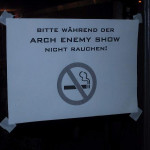 ARCH ENEMY sollen kommen. Letztes Mal hat das ja icht geklappt, und damit das nicht wieder passiert, bittet ein Schild am Eingang darum, Rauchen möglichst zu unterlassen. Schöner hatte ich gefunden, wenn’s Erklärungen für das Ausbleiben der auf den Plakaten angekündigten Dark Tranquility gegeben hätte - oder eine halbwegs gleichwertige Ersatz-Band. Bei den gesalzenen Eintrittspreisen von mehr als 20 Euro sicherlich keine Unverschämtheit - im Gegensatz zu den T-Shirt-Preisen. 25 Euro für ein T-Hemd sind’s sicherlich. Aber - wie gesagt - zur Freude der nicht wenigen Fans in der gut gefüllten Markthalle gab sich ARCH ENEMY die Ehre, kein Bluthusten, keine abgebrochenen Fingernägel, alle gesund an Bord.