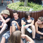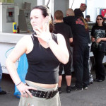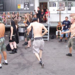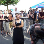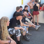 Arg zu kämpfen hatten die Besucher mit der fiesen Sonne. Baseball-Caps, Stroh-Hüte, Tücher, alles mögliche wurde irgendwie als Sonnenschutz genutzt. HARMONY DIES-Shouter Chris nutzte eine Wasser-Pump-Gun und bespritzte die Fans. Gerre gab Bier in die ersten Reihen. Ein paar Grüppchen rückte Tische umher - immer dem Schatten nach. Nur gab es irgendwann keinen mehr, so dass andere Heilmittel gesucht wurden. Da war zum einen der Duschschlauch, den die Veranstalter freundlicherweise laufen ließen, andere fuhren kurz zum Allersee, um abzukühlen.
