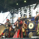 Ein krasser Gegensatz dazu waren die folgenden Corvus Corax, die ein riesen Aufgebot an mittelalterlichem Instrumentarium an den Start gingen. Man fühlte sich glatt auf einen Mittelaltermarkt versetzt. Es gab Sackpfeifen, Pauken und verschiedenes anderes Gebläse und Tam-Tam-Gedöns, welches CORVUS CORAX auch vorzüglichst beherrschten. Gesang spielte dabei eine eher untergeordnete Rolle, vielmehr trommelte und trötete man sich ins kollektive Nirvana. Auch die farbenfrohe Kostümierung der Spielleute machte ordentlich was her und unterstützte den auditiven Eindruck vortrefflich. Nach ein wenig Anlaufzeit freundete sich auch das Publikum mit den mittelalterlichen Relikten an und ließ sich einfach mitreißen.