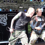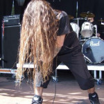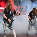 SINISTER standen als Co-Headliner für den Freitag auf den Programm und würden es schwer haben, gegen die drei vorherigen Bands anzukommen. Rachel ist ja bekanntlich nicht mehr an Bord, dafür hat Drummer Aad den Sangesposten übernommen ? und machte seinen Job an diesem Abend sehr gut. Aber irgendwie wollte die Show bei mir nicht wirken, das klang alles zu bieder und dank fehlender zweiter Gitarre oftmals zu drucklos. Die neueren Songs haben zudem nicht die Klasse alter Klassiker (von denen SINISTER einige spielten), so dass die meiste Zeit gepflegte Langeweile angesagt war. Das Publikum war ähnlich gespalten, während ein großer Haufen vor der Bühne feierte, stand der weitaus größere Teil der noch Anwesenden unbewegt weiter hinten und liess SINISTER über sich ergehen. In dieser Form sind SINISTER nur noch ein Schatten ihrer früheren Tage. Schade eigentlich.