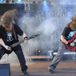 HARMONY DIES-Sänger Chris kam stilecht mit Kutte (und dezenter Plautze) auf die Bühne, begrüßte die Fans freundlich und legte dann mit seinen Berliner Kollegen los, um ihnen ein amtliches Death Metal-Brett vor die Rübe zu hauen. Die Band war fast so gut aufgelegt wie ihre Vorgänger JACK SLATER und konnte die ersten Reihen zum bangen motivieren, besonders als Chris mit seinem Mikro auf den Fotograben ging (der war mit einer Rampe ausgestattet, so dass die Fotografen höher standen als das Publikum) und seine wütenden Growls den begeisterten Fans von Angesicht zu Angesicht hinbrüllen konnte. HARMONY DIES mussten zwar in Sachen Grinsefaktor JACK SLATER den Sieg überlassen, wußten dafür aber mit fettem Death Metal zu punkten, der wie gemacht für einen Festival-Abend ist. Eingängig, brutal und groovig - sehr cool!