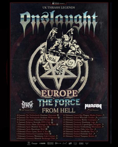 Die Thrash-Metal-Legenden Onslaught sind stolz darauf, die vollständige Besetzung der Support-Bands für die bevorstehende Force From Hell Tour 2026 bekannt zu geben! Mit dabei in ganz Europa sind zwei aufstrebende Kräfte der neuen Thrash-Generation – Tortured Demon (Großbritannien) und Persecutor (Dänemark).