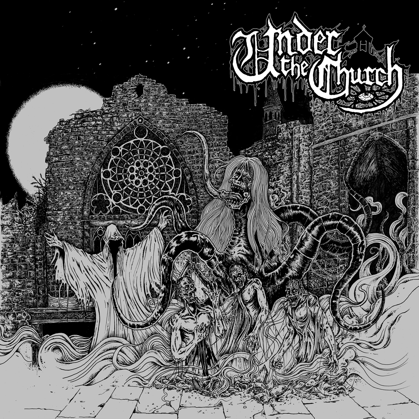 UNDRER THE CHURCH zeigen mit ihrem Debütwerk gleich wo der Hammer schlägt: „Under The Church“ lässt sich als typisches Death Metal-Album bezeichnen. In Skandinavien beheimatet haftet den Schweden ein ähnlicher Klang wie UNLEASHED, GRAVE oder den Finnen NECROPSY an: Harter, räudiger, stampfender Death Metal, der auch vor schnelleren Stücken (Titeltrack) oder groovenden Parts (“Macabre Cadaver” und “Digging in the Dirt”) nicht scheut. Bei einer durchschnittlichen Songlänge von drei Minuten und einer Gesamtspielzeit von gerade einmal 20 Minuten die perfekte Dröhnung Tod und Verderb für Zwischendurch. Veredelt wurde das ganze durch den spanischen Horror-Artwork-Künstler Cesar Valladares, der schon unter anderem für GRAVEYARD gezeichnet hat.