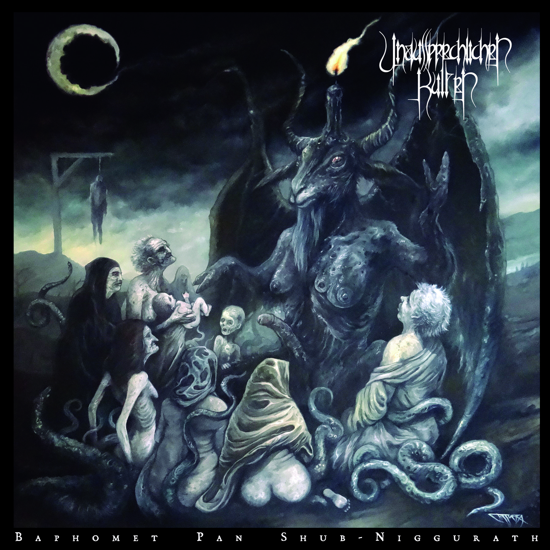 Dass der Cthulhu-Mythos mit all seiner kranken Grausamkeit und seiner wahnsinnigen Komplexität eine häufig genutzte Inspirationsquelle für viele Metal-Bands ist, ist nichts Neues. Man denke da an die offensichtlichen Verehrer CTHULHU und CTULU und an die etwas unoffensichtlicheren wie NECRONOMICON, HASTUR, ARKHAM oder eben auch UNAUSSPRECHLICHEN KULTEN – eine Extreme Metal Band aus Chile. „Baphomet Pan Shub-Niggurath“ ist nunmehr die dritte Full-Length Scheibe der Lovecraft-Metaller und nach diversen Split‘s, Demos, EP’s und einer Kompilation die erste Veröffentlichung ganzer Länge seit 2008. Natürlich wurde der „Kult“ die ganzen Jahre über nicht aus den Augen gelassen und so wundert es nicht weiter, dass der Fruchtbarkeitsgott Shub-Niggurath (oder auch: „Die schwarze Ziege der Wälder mit den tausend Jungen“) der UNAUSPRÄCHLICHEN KULTEN neustes Vermächtnis ziert. Auf musikalischer Ebene bietet das Quartett eine bestialische Mischung aus Black und Brutal Death Metal. Es gibt Lieder gnadenloser Geschwindigkeit wie „The Hooded Baphomet Bleated“ und „Yogge-Sothothe“, aber auch durchaus schaurige und melodische Einspielungen wie in „La Recta Provincia“ und „Kadath In The Cold Waste“. Einwandfrei meistern UNAUSPRÄCHLICHEN KULTEN dabei selbst technische Finessen in tiefster Konsequenz des Machbaren. So setzt „Baphomet Pan Shub-Niggurath“ die bisherige Diskographie der Chilenen gebührend fort ohne einen fortgeschrittenen Reifeprozess missen zu lassen, welcher sich nicht nur im musikalischen Geschick sondern auch in der lyrischen Tiefe (in Bezug auf den Cthulhu-Mythos) äußert.
