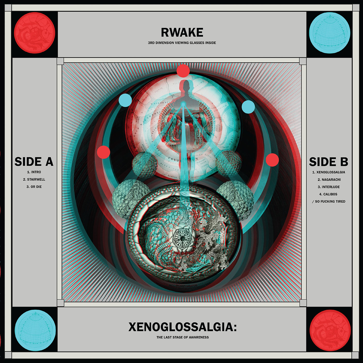 Vor knapp vier Jahren brachten RWAKE mit "Rest" ihr bis dato letztes Werk raus: Sperriger, schwerzugänglicher Sludge-/Doom Metal mit etwas Death, etwas Core und etwas Space wurde hier geboten. Tatsächlich geht die Reise 2015 weiter, RWAKE sind wieder erwacht und "Xenoglossalgia: The Last Stage Of Awareness" steht auf dem Plan. Zunächst unterscheidet sich das Werk optisch mit seinen klaren Linien sehr von den Vorgängern. Und auch das Intro lässt mit seiner zart-mlodischen Vertracktheit noch nicht wirklich erkennen, in welche Richtung es hier gehen soll - bis die dumpfe Sludge-Walze in "Stairwell" allmählich lospoltert. Bald wird klar dass RWAKE hier keinen neuen Weg einschlagen, sondern sich ganz und gar an ihr altes Konzept klammern: Sludge, Doom, ein wenig Death, ein wenig Atmosphäre - Akkustik, sanftes Vogelgezwitscher und dreckige Science Fiction Samples. Noch mehr Sprach-Samples, noch mehr Elektronik-Samples und noch mehr Vertracktheit: Das sind RWAKE 2015. So ist "Xenoglossalgia: The Last Stage of Awareness" mit einer atem(be)raubenden Länge von 01:11:11 wohl der post-apokalyptische Gipfel alles Extremen. Wo "Stairwell" oder auch "Nargarachi" noch einigermaßen stringent wirken und der Titeltrack mit einer hübschen Melodie einen klaren Break zieht, frage ich mich tatsächlich wie man sich "Calibos/ So Fucking Tired" komplett und am Stück anhören kann. Wer das schafft hat meinen größten Respekt! So haben die Amerikaner auch hier kein leichtes Album geschaffen. Für eingefleischte Fans dürfte die LP mit beiliegender 3D-Brille jedoch ein Pflichtkauf sein.