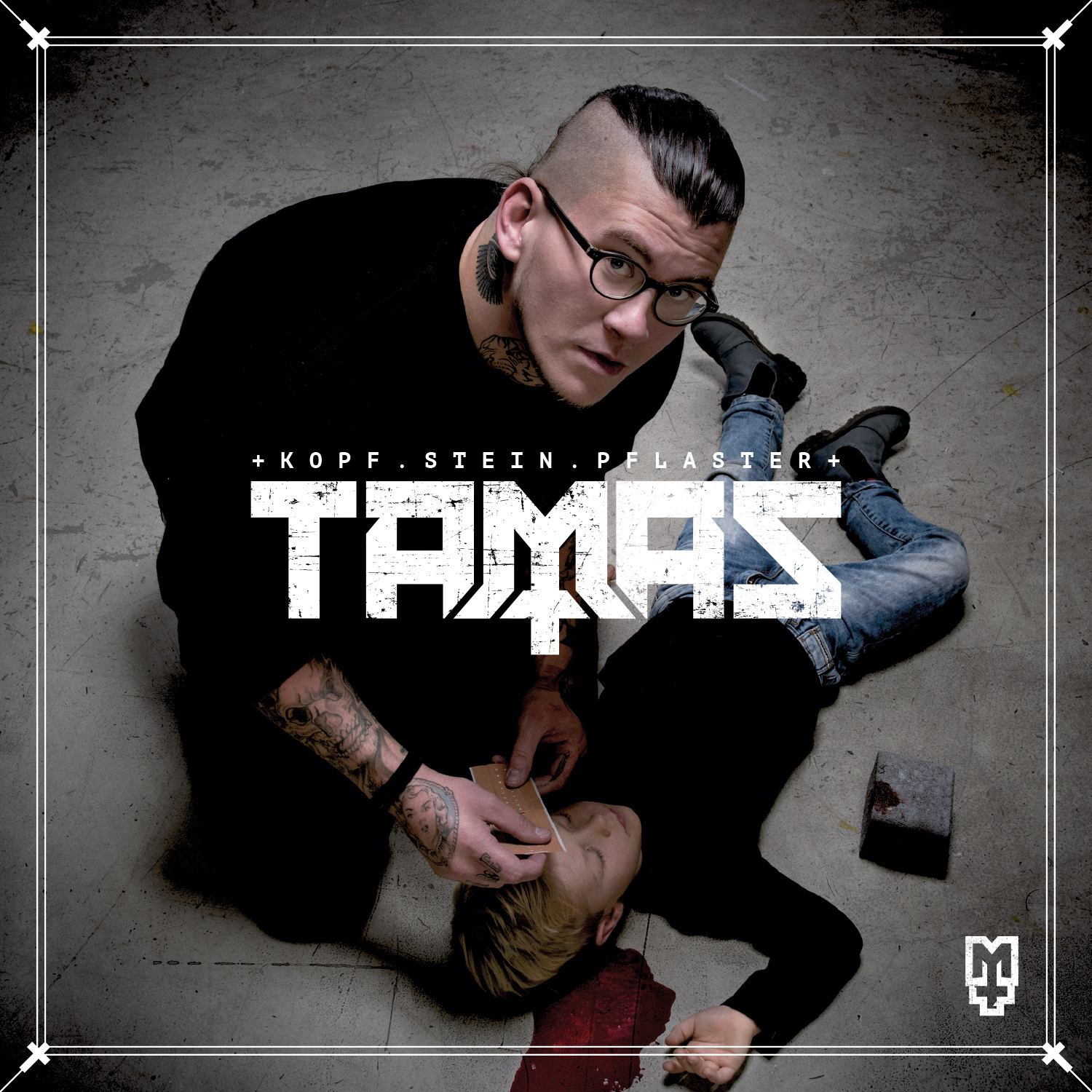 Deutsch-Hip-Hop bei Metalinside? „Kopf.Stein.Pflaster“ heißt die neuste Publikation des Berliner Künstlers TAMAS, der seine Stilrichtung selbst als Metal/Metalcore/Hardcore angibt. Das Cover zeigt einen blutemden (Kinder-)Kopf, einen Stein und ein Pflaster. Kreativ. Bereits nach dem Titelsong, der hier zugleich als Opener fungiert und gerade einmal vierundfünfzig Minuten Spielzeit aufweist, weiß man, dass man hier irgendwie falsch ist. Was TAMAS allerdings von anderen Hip Hop-Künstlern unterscheidet ist dass er seine Musik mit (Metal-) Instrumenten untermalt. (Sehr schön: „Jesus schießt“). Tatsächlich könnte „Kopf.Stein.Pflaster“ rein instrumental ein halbwegs gutes Album sein, doch leider macht eine Metal-Instrumentierung noch kein Metal-Album aus, weswegen TAMAS meiner Meinung nach auf Metalinside (und auch bei EMP und MetalHammer) nichts verloren haben. Haben CALLEJON den Musikern auf der gemeinsamen Wintertour nicht gezeigt, wie das mit dem Gesang geht?