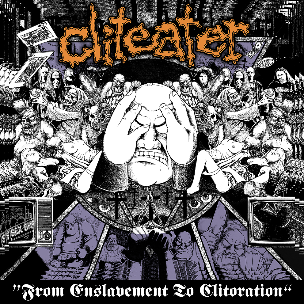 CLITEATER die Sechste: das holländische Grind-Kommando macht exakt dort weiter, wo es vor drei Jahren mit "Cliteaten Back To Life" aufgehört hat; und eigentlich macht das Quintett mit jedem Album immer genau dort weiter, wo es mit dem vorherigen aufgehört hat. Auch auf "From Enslavement To Cliteration", mit dessen Titel man dieses Mal dem allmächtigen Napalmtod huldigt, wird wieder gebolzt, geschreddert, gerüpelt und gegurgelt bis die Schwarte kracht. Songtitel wie "Tranny Mc Pee", "Human Idiot", "Tramp Stamp Stomping", "Full Body Tourette", "Freakopolis" oder "Clitnado" (!) machen sofort deutlich, dass die Truppe keinen Millimeter von ihrem Kurs abzuweichen gedenkt. Stilistisch gibt es wahlweise Vollgas oder flottes Midtempo, wobei Produzent Jörg Uken (der unter Anderem auch schon für OBSCENITY, EMBEDDED und GOD DETHRONED die Regler bediente) hier einen hervorragenden Job gemacht hat, denn "From Enslavement To Cliteration" donnert förmlich aus den Boxen und schafft den Spagat zwischen Rotz und Dampfhammer vorzüglich. Über die Genre-bedingte Eindimensionalität des Songmaterials sollte man jedoch einmal mehr genauso hinweg sehen können wie über die mangelnde Originalität, was "humorvolle" Einschübe betrifft (neben ein paar wenigen Samples in "Positive Aspects Of Collective Chaos" und erwähntem "Clitnado" sticht lediglich das abschließende "Total Clitoration" mit Banjo-Einsatz und der Geschichte des "Cliteaters" heraus). Fans werden hier ein weiteres Mal glücklich, der Rest wahrscheinlich auf ewig nicht mehr.